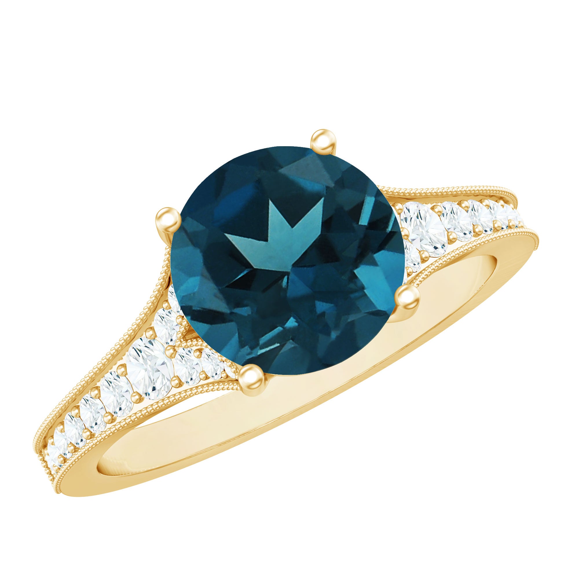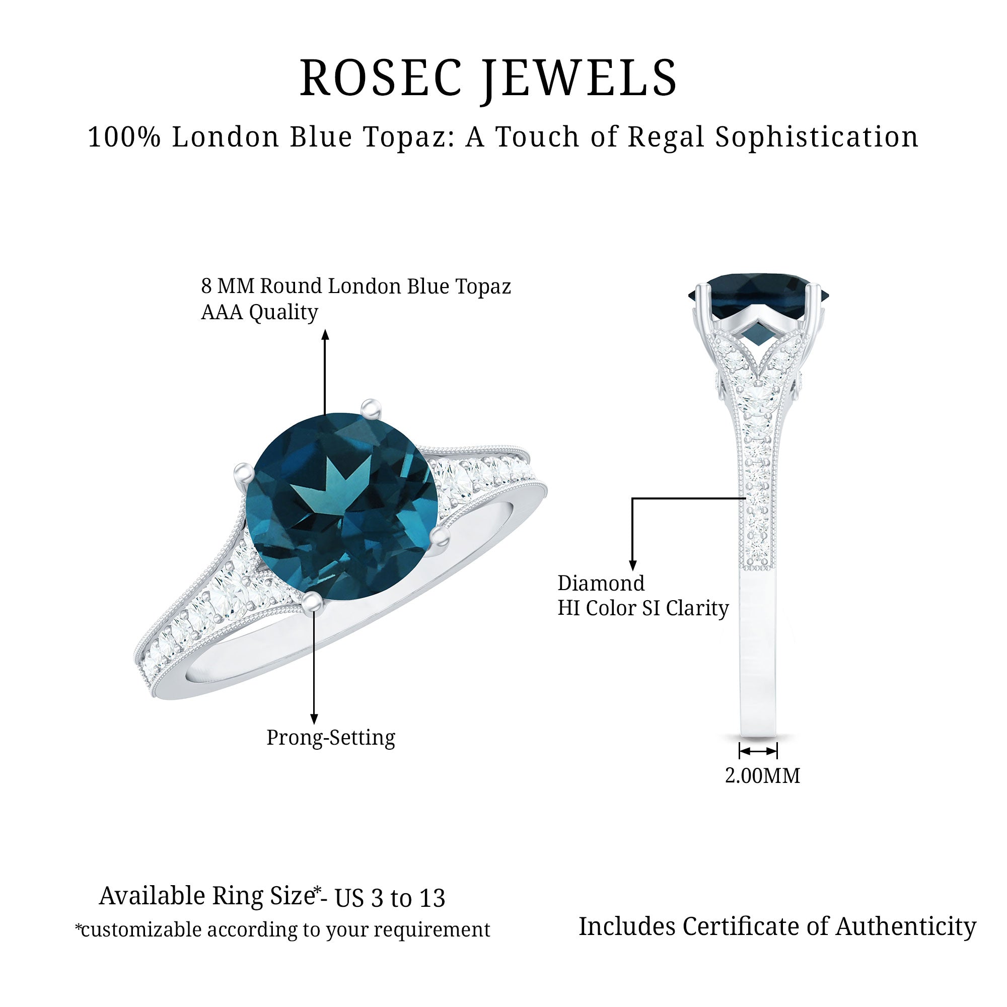 Turn heads with a ring that is made to shine. This London Blue Topaz Ring is all about elegance with a modern twist. At the center sits a sparkling 8 MM round cut London Blue Topaz, held securely in prong setting. The color and shine of the topaz make it the perfect standout piece for anyone who loves a bold yet timeless look. The designer band gives the Solitaire Engagement Ring a fresh and unique feel. It is lined with round diamonds that add just the right amount of sparkle without taking away from the main stone. And for a little extra magic, there is a tiny diamond tucked under the center stone in bezel setting, a sweet detail that adds charm and surprise. Crafted using AAA quality London Blue Topaz and HI-SI quality diamonds, this Round Engagement Ring is made to last and look amazing for years to come. It is designed to fit comfortably, whether you wear it every day or save it for special occasions. This London Blue Topaz and Diamond Ring is available in US sizes 3 to 13, so you can find the perfect fit. Whether it is for an engagement, anniversary, or just because, it is a beautiful way to show love, celebrate your story, or treat yourself. Simple, stunning, and full of meaning, this Designer Ring is the kind of piece you will treasure forever.