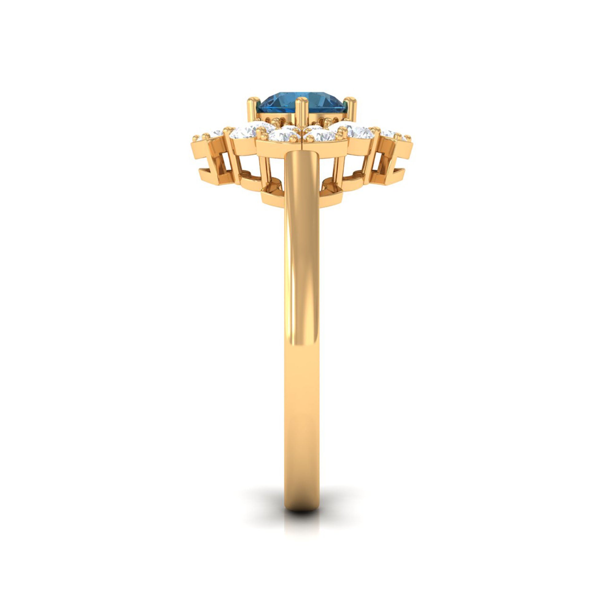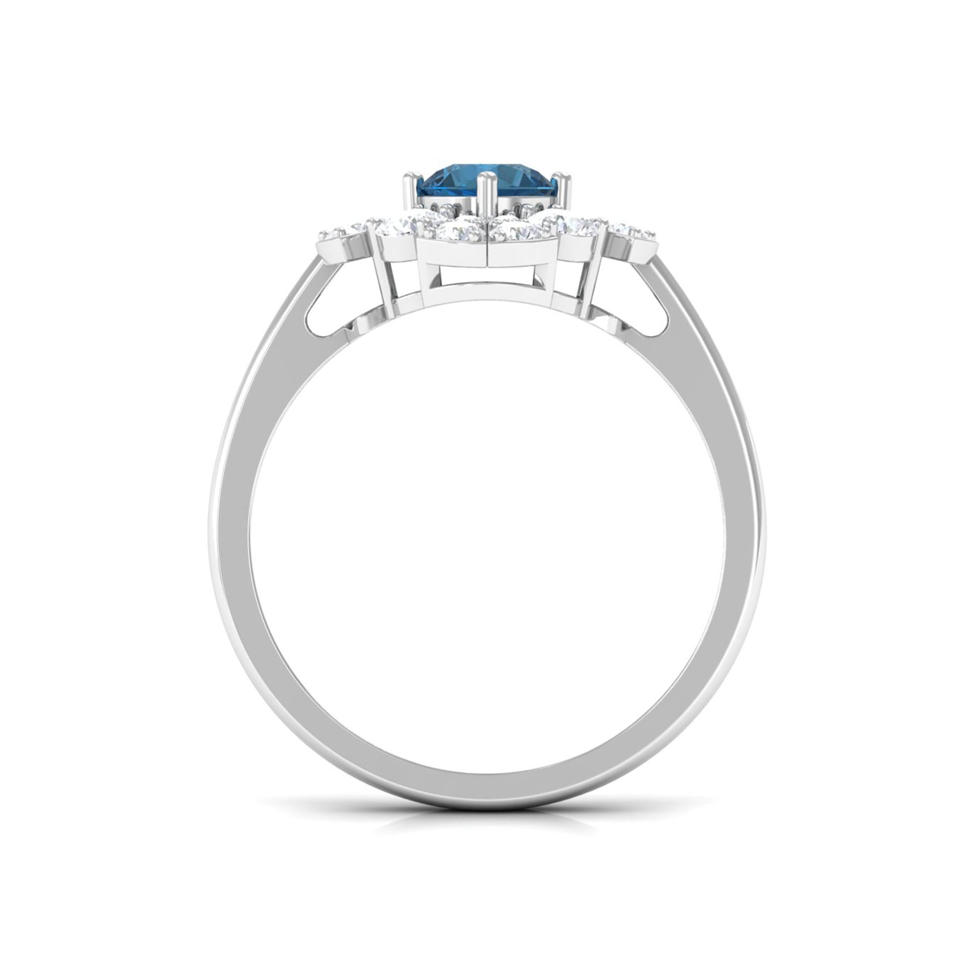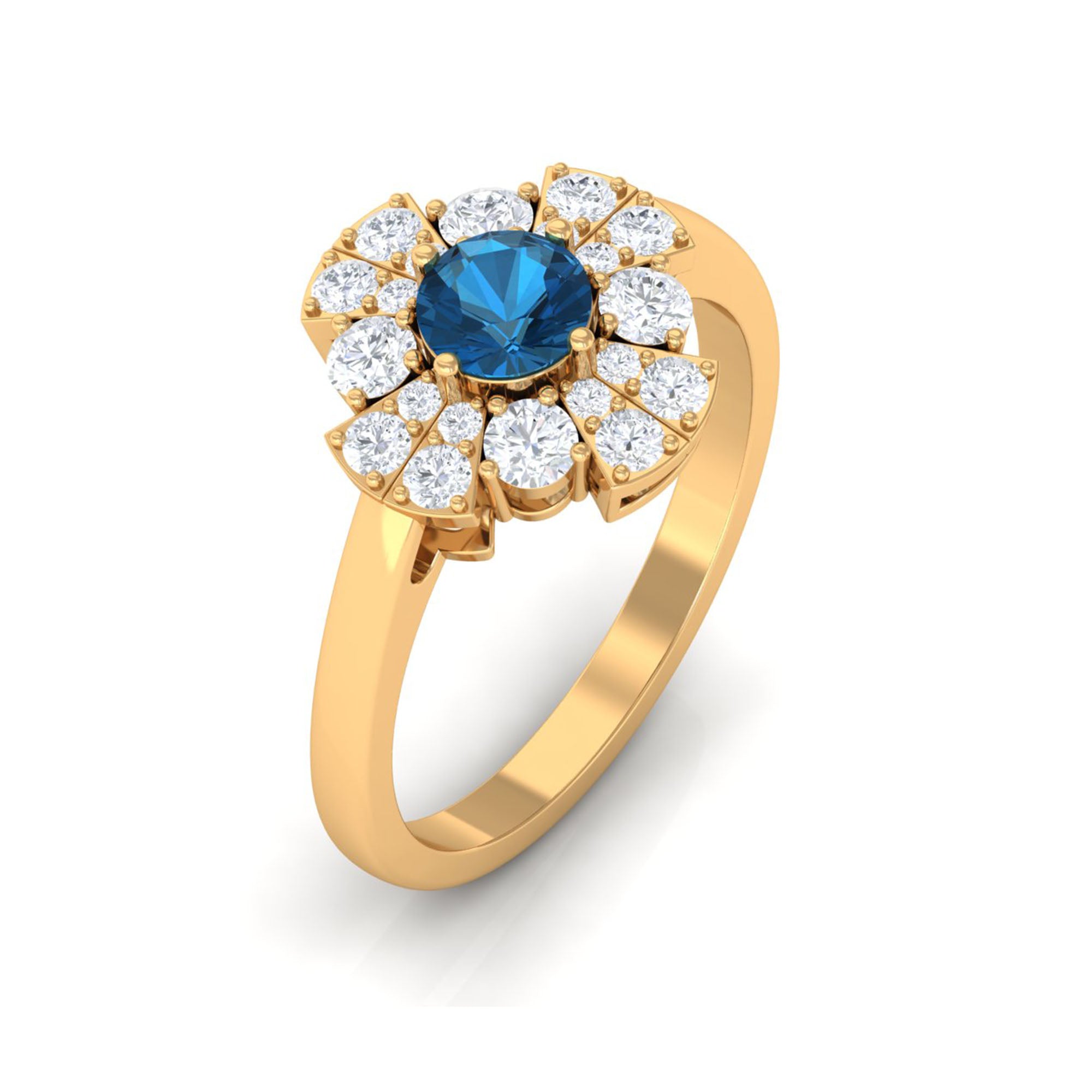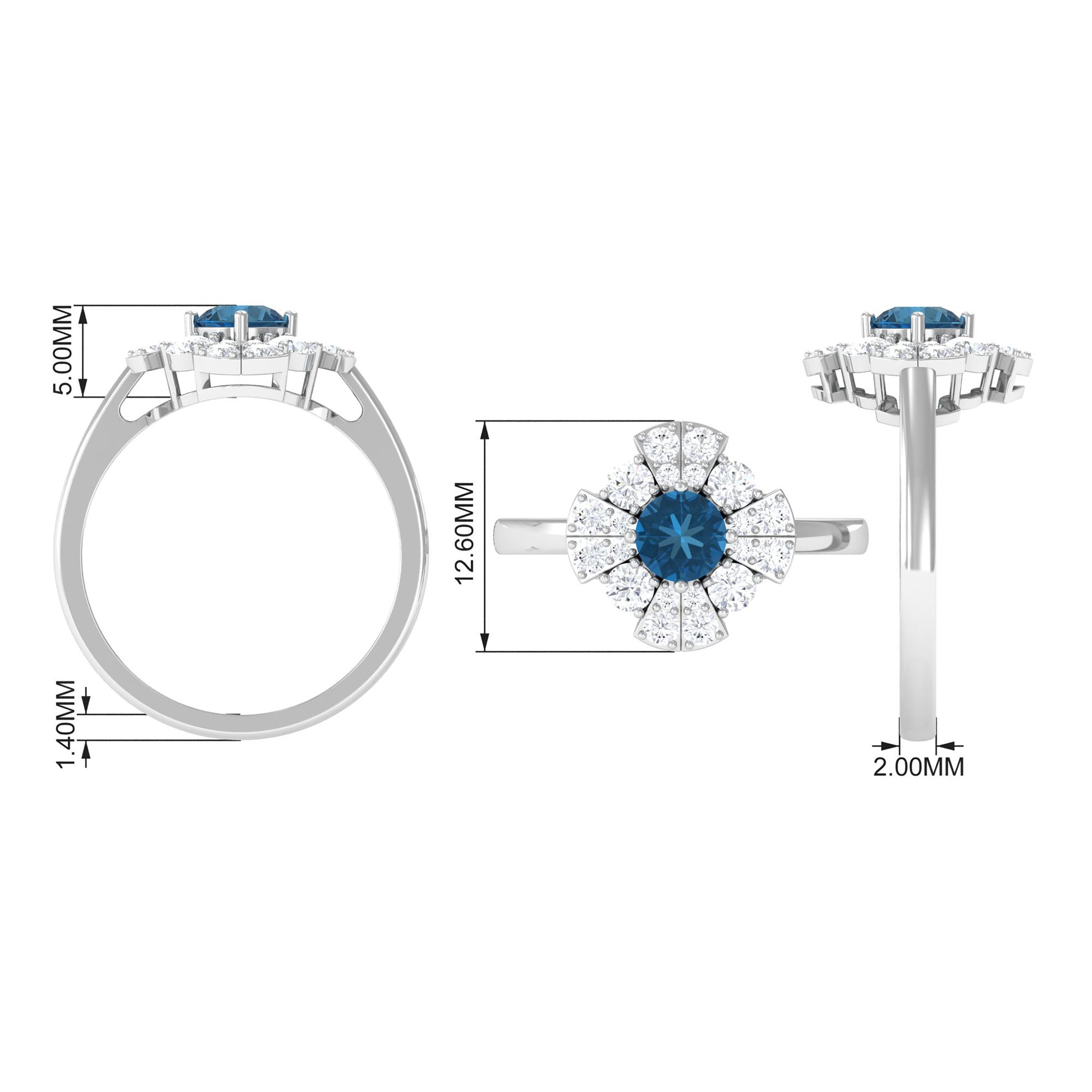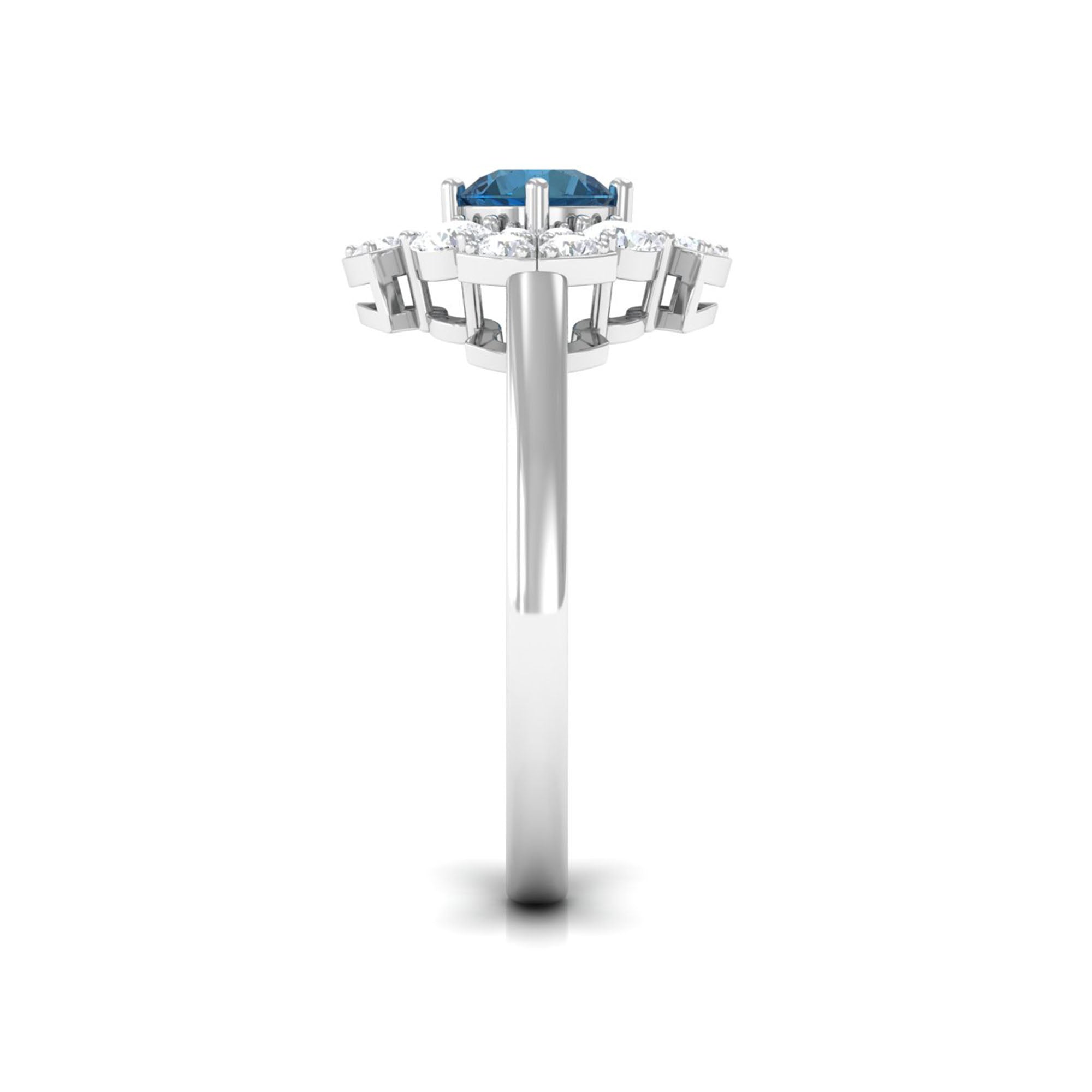 This Flower Engagement Ring is an exceptionally enchanting piece that embodies both romance and radiance. At its core lies a 5 MM round cut London Blue Topaz, set in a prong setting, exuding brilliance and fire, making it the ideal focal point for such a significant piece. Encircling the central stone is a floral-inspired halo of smaller round diamonds, arranged like delicate petals blossoming in perfect harmony. The design encapsulates the essence of natural beauty, evoking the image of a flower in full bloom—timeless, fresh, and vibrant. The sleek band gently narrows to support the floral centerpiece, providing the London Blue Topaz Engagement Ring with an elegant silhouette and allowing the halo to truly dazzle. Whether you are proposing, commemorating an anniversary, or indulging yourself with something special, this Blue Topaz Halo Ring presents an elegant yet playful aesthetic that is suitable for any memorable occasion. Crafted with attention to detail and comfort, the Flower Statement Ring is thoughtfully designed for everyday wear while still making a striking impression. The round cut london blue topaz at the center delivers classic sparkle, while the floral halo introduces a modern, feminine flair. It is the type of piece that feels as joyful and distinctive as the love it symbolizes—bright, beautiful, and eternally blooming.