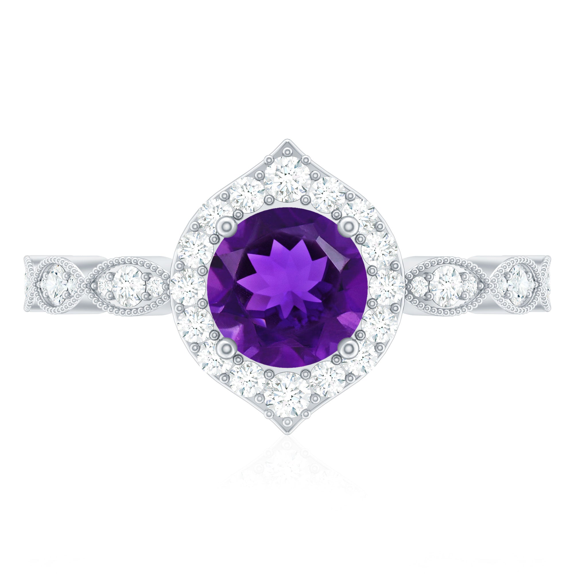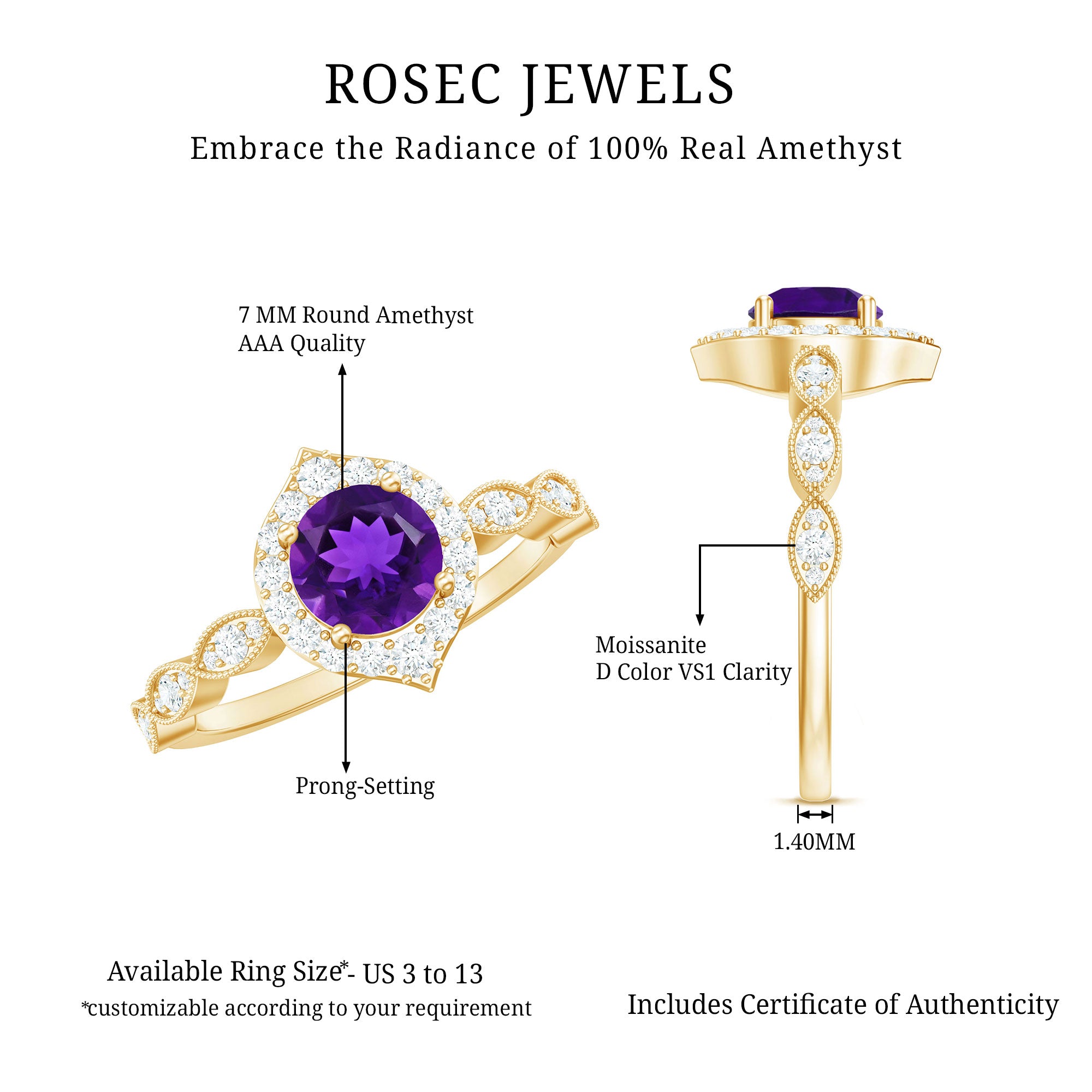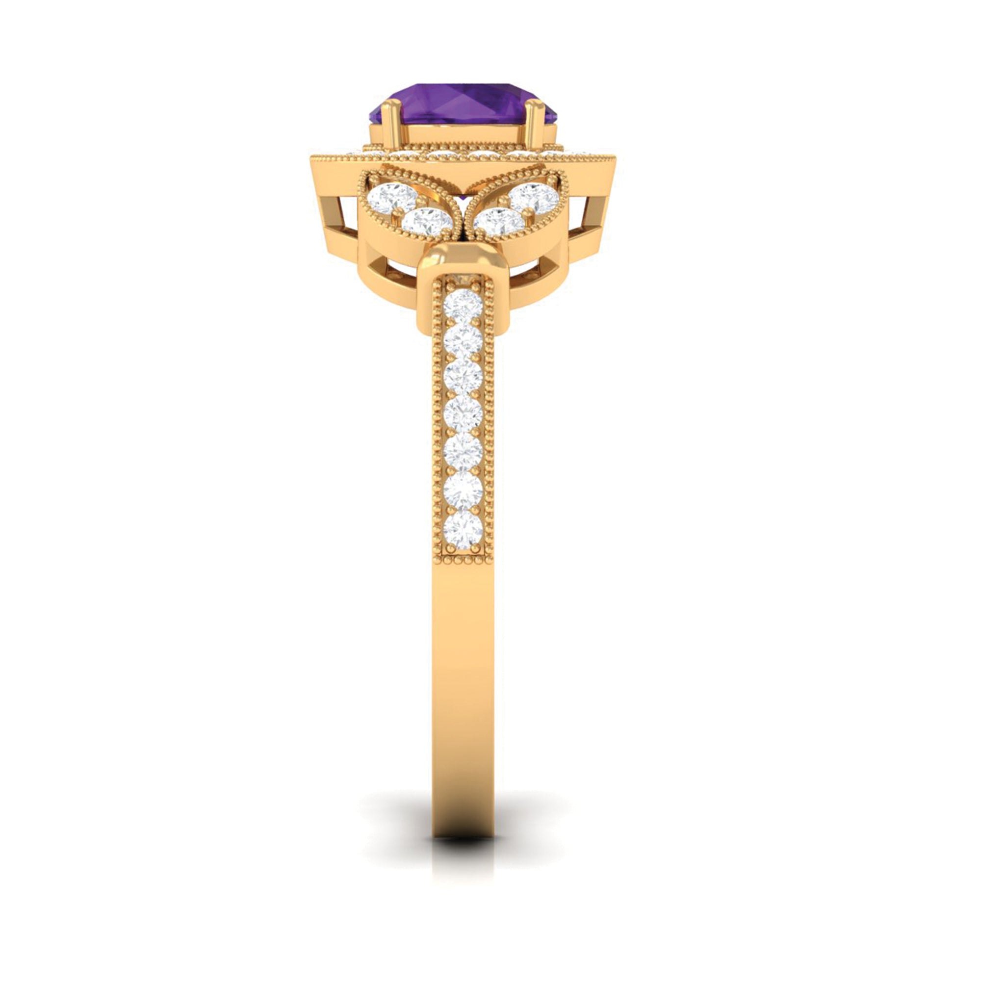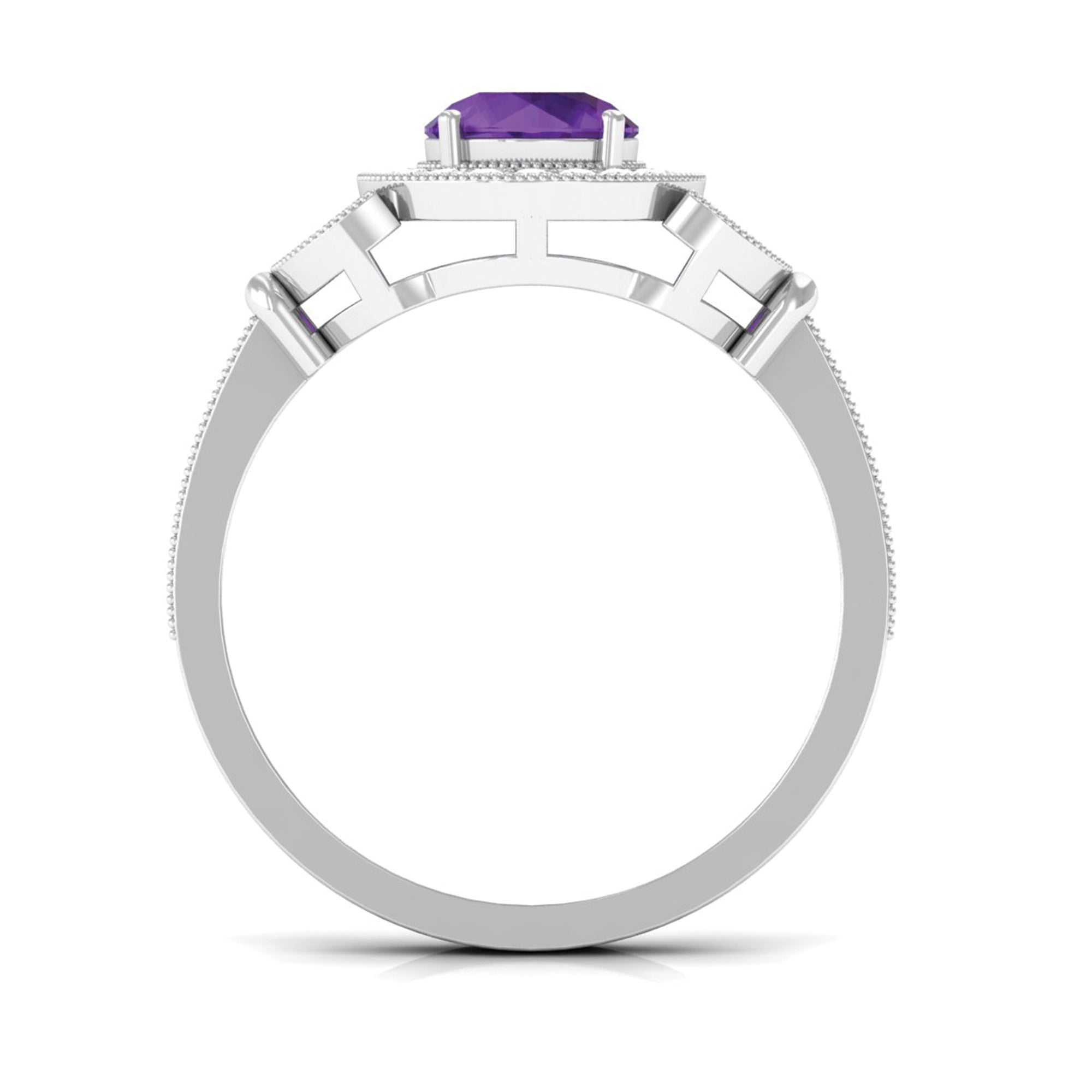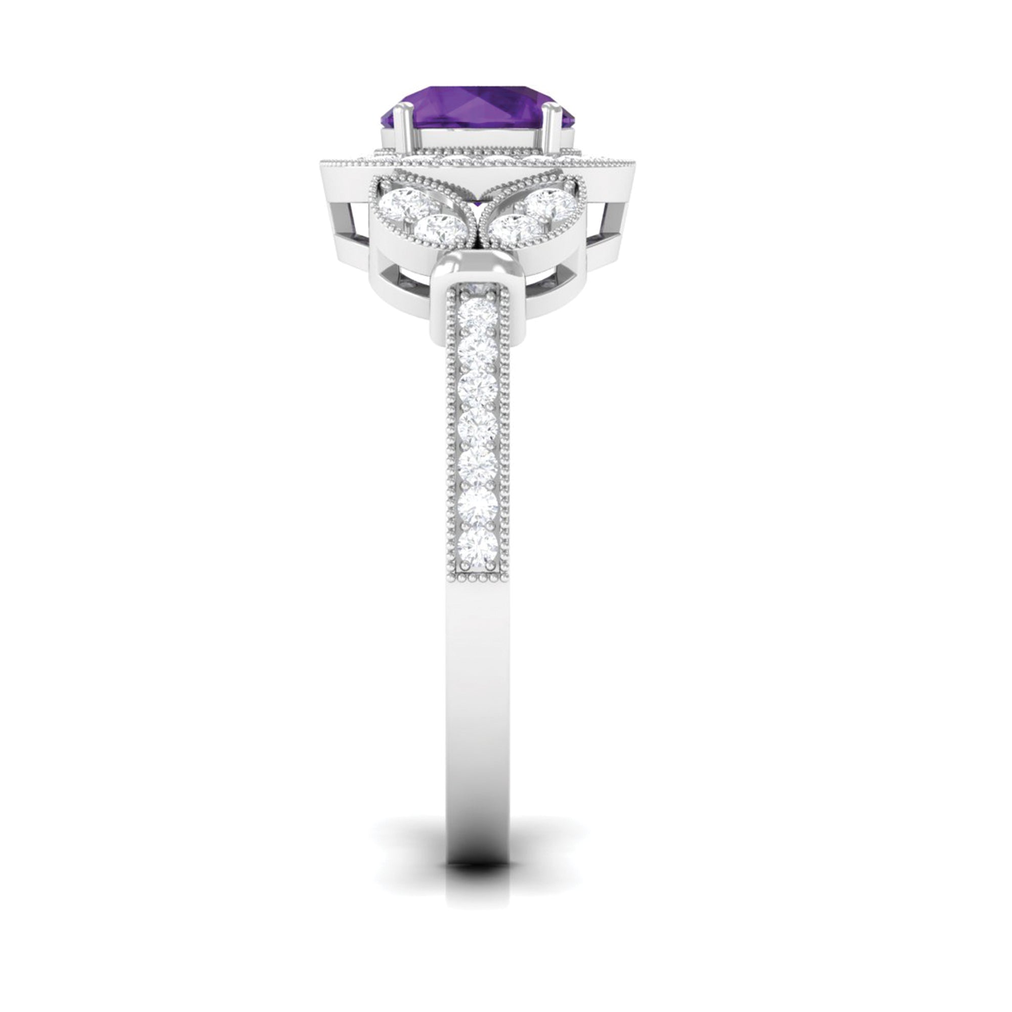 Halo is a setting of gemstone rings in which small accents of gemstone surround the center stone. Our amethyst halo rings are rings with center amethyst surrounded by small accents of diamonds and moissanites. Diamond and moissanites accents help in adding more brilliance to the amethyst rings. The benefit of the Halo designs is that the style is a blend of modern and classic styles and appears bigger as compared to solitaire.
