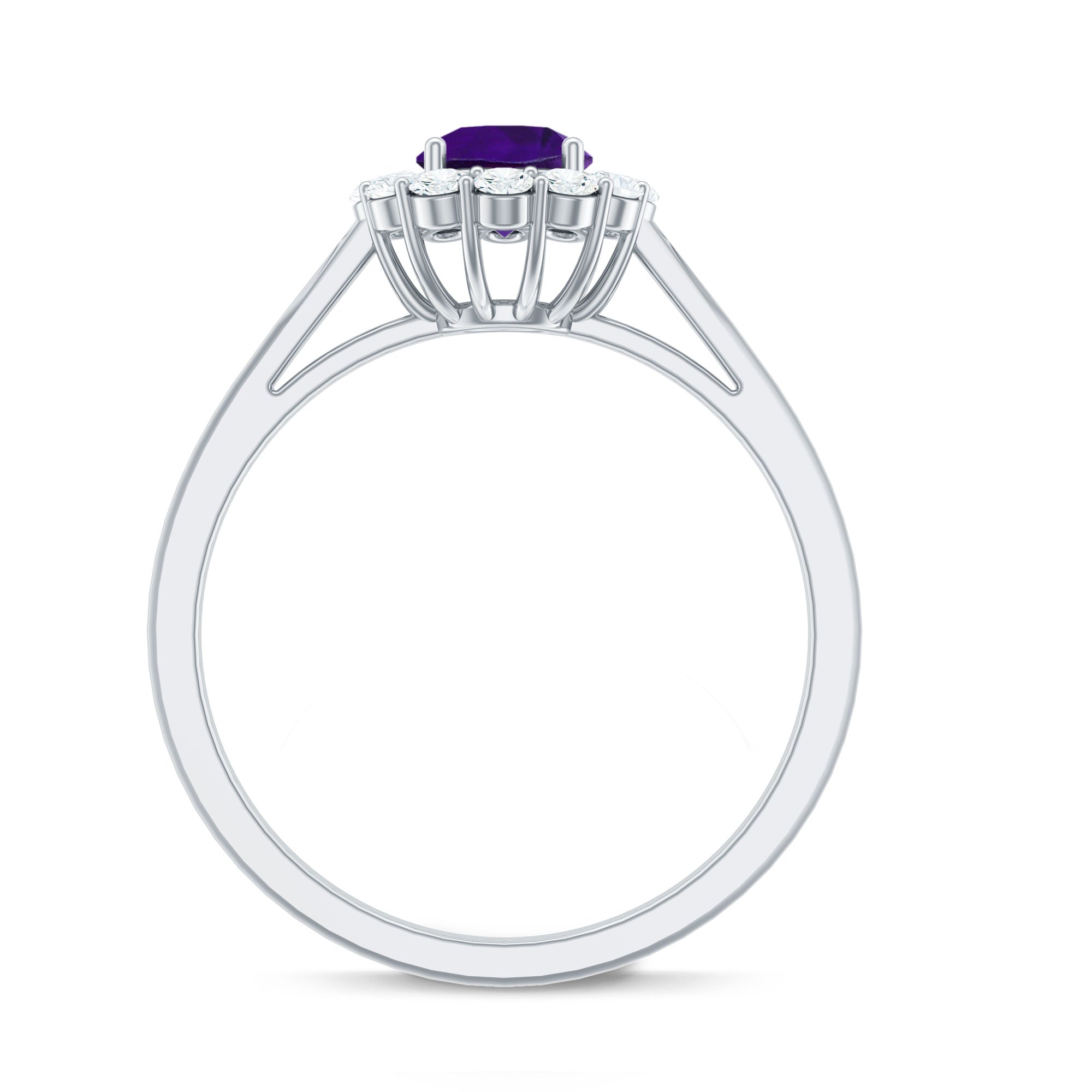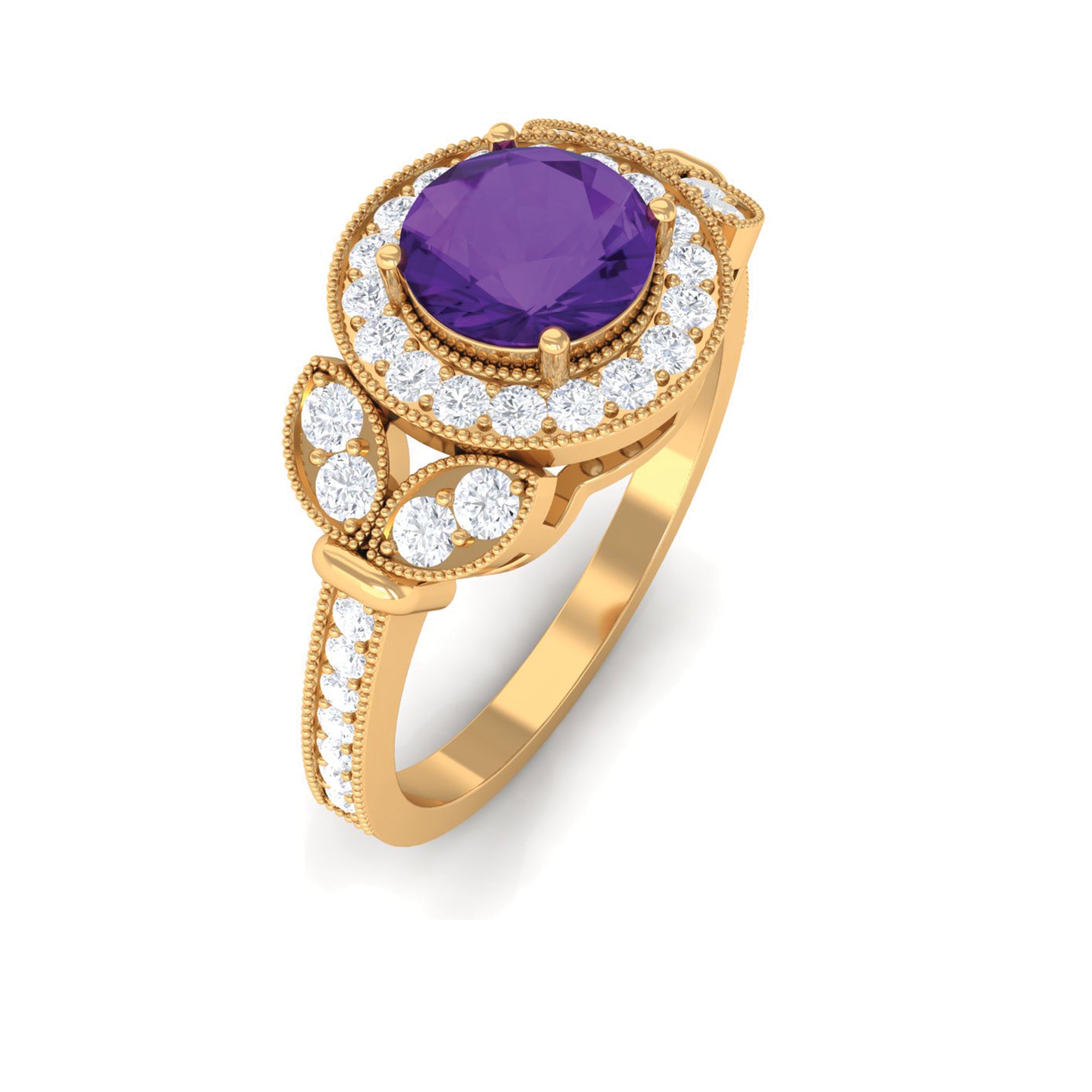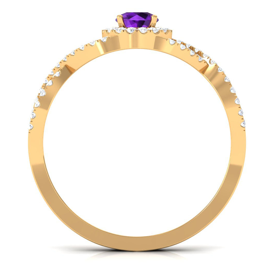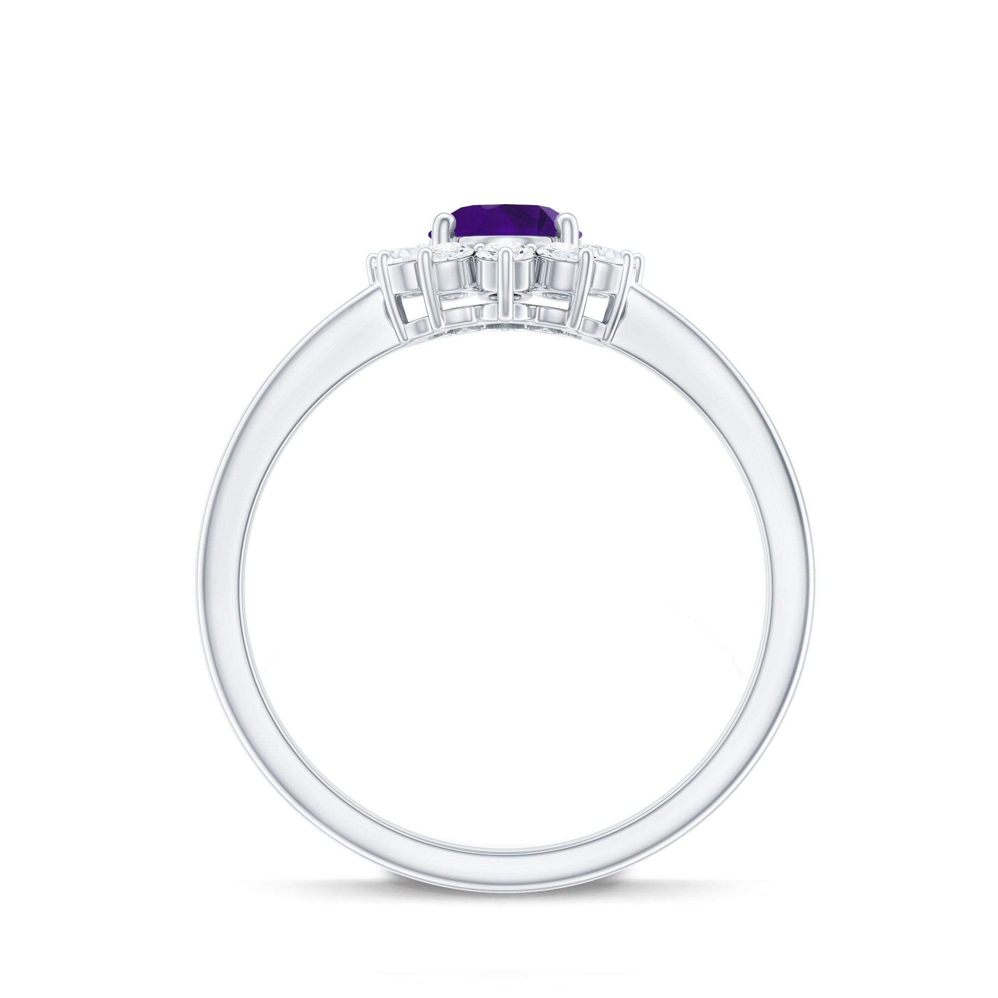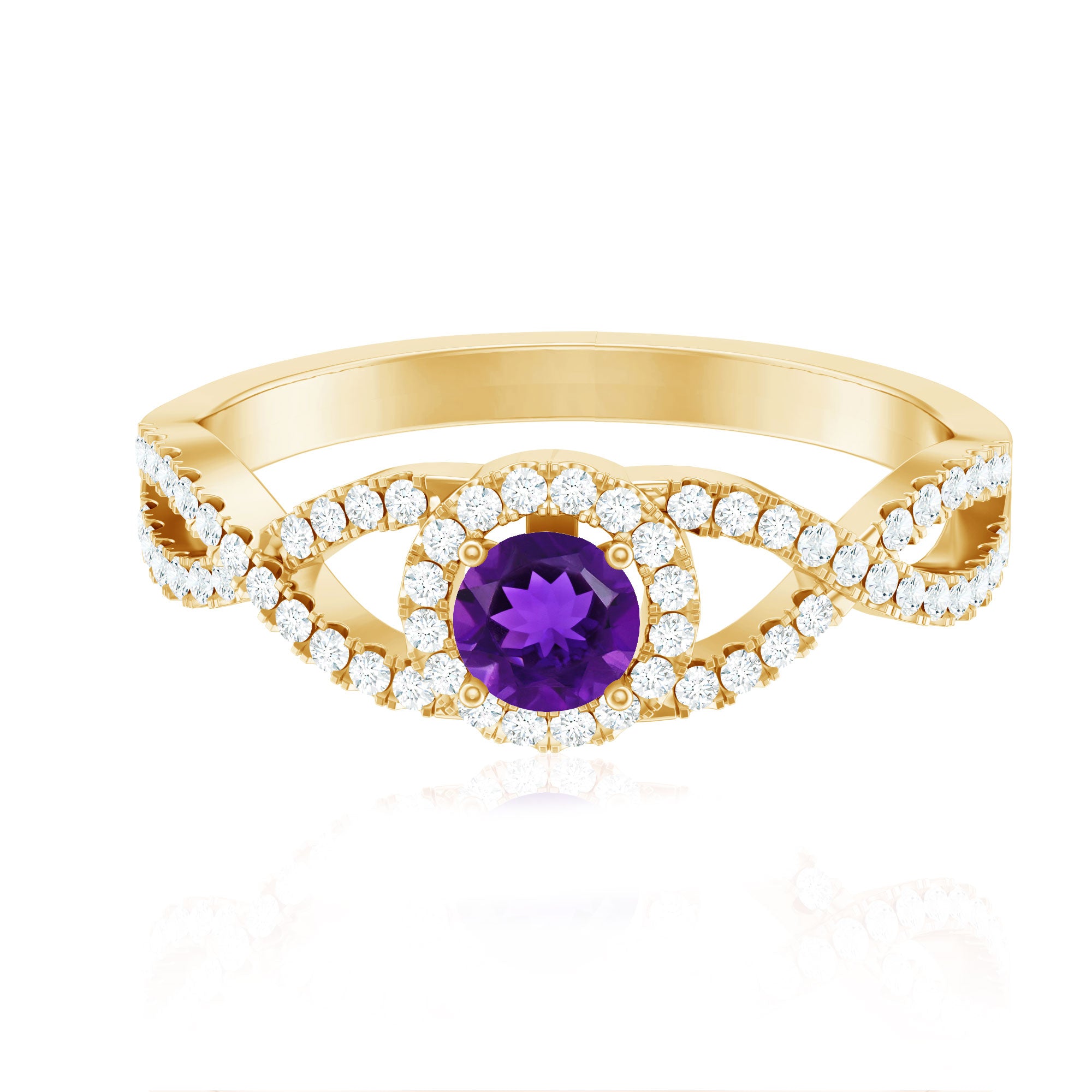 Halo is a setting of gemstone rings in which small accents of gemstone surround the center stone. Our amethyst halo rings are rings with center amethyst surrounded by small accents of diamonds and moissanites. Diamond and moissanites accents help in adding more brilliance to the amethyst rings. The benefit of the Halo designs is that the style is a blend of modern and classic styles and appears bigger as compared to solitaire.