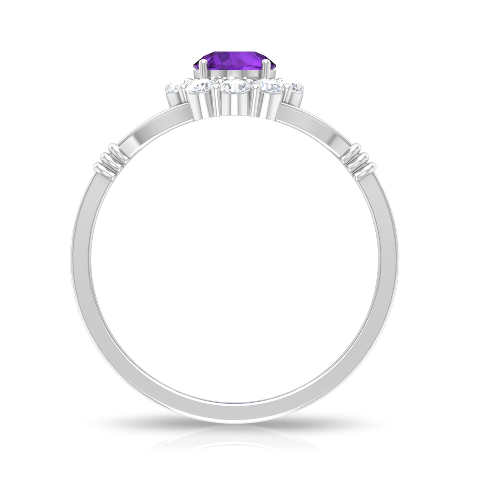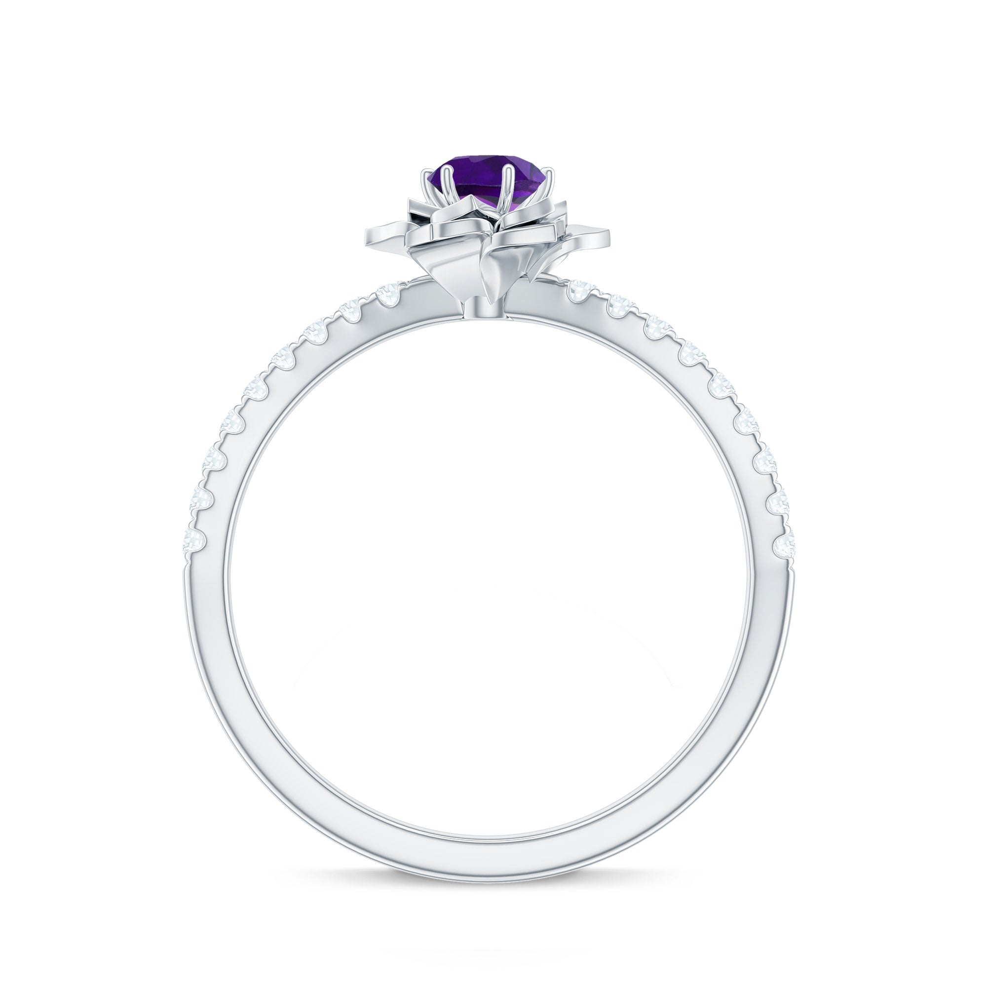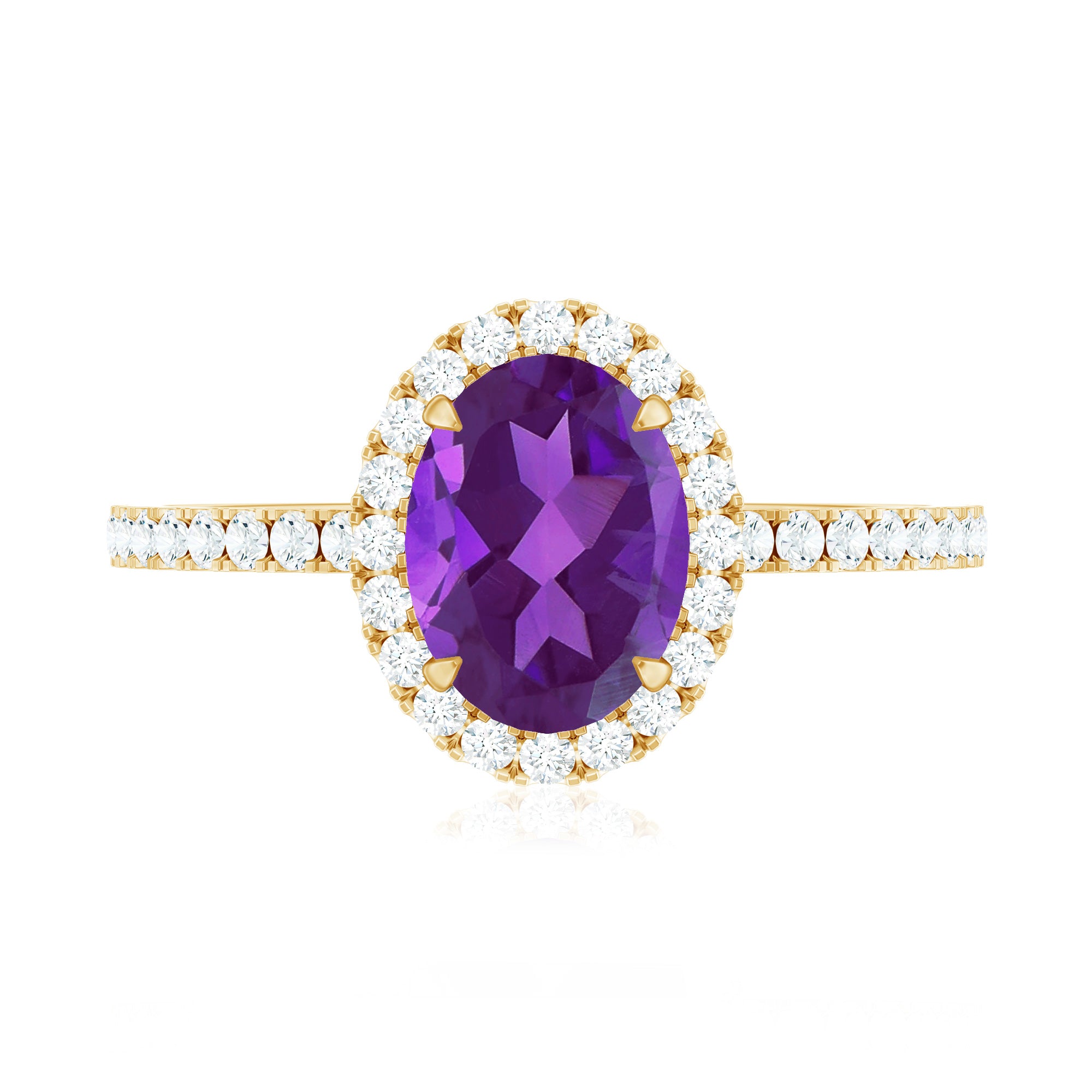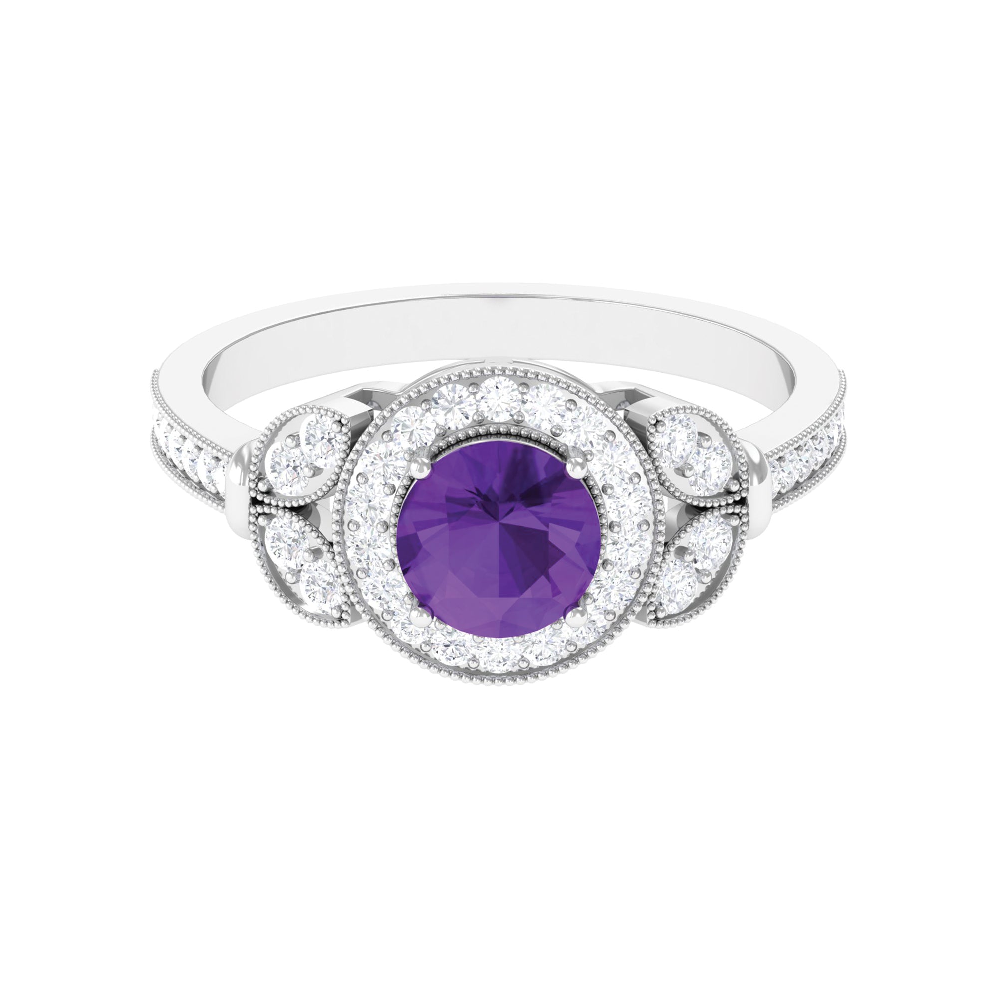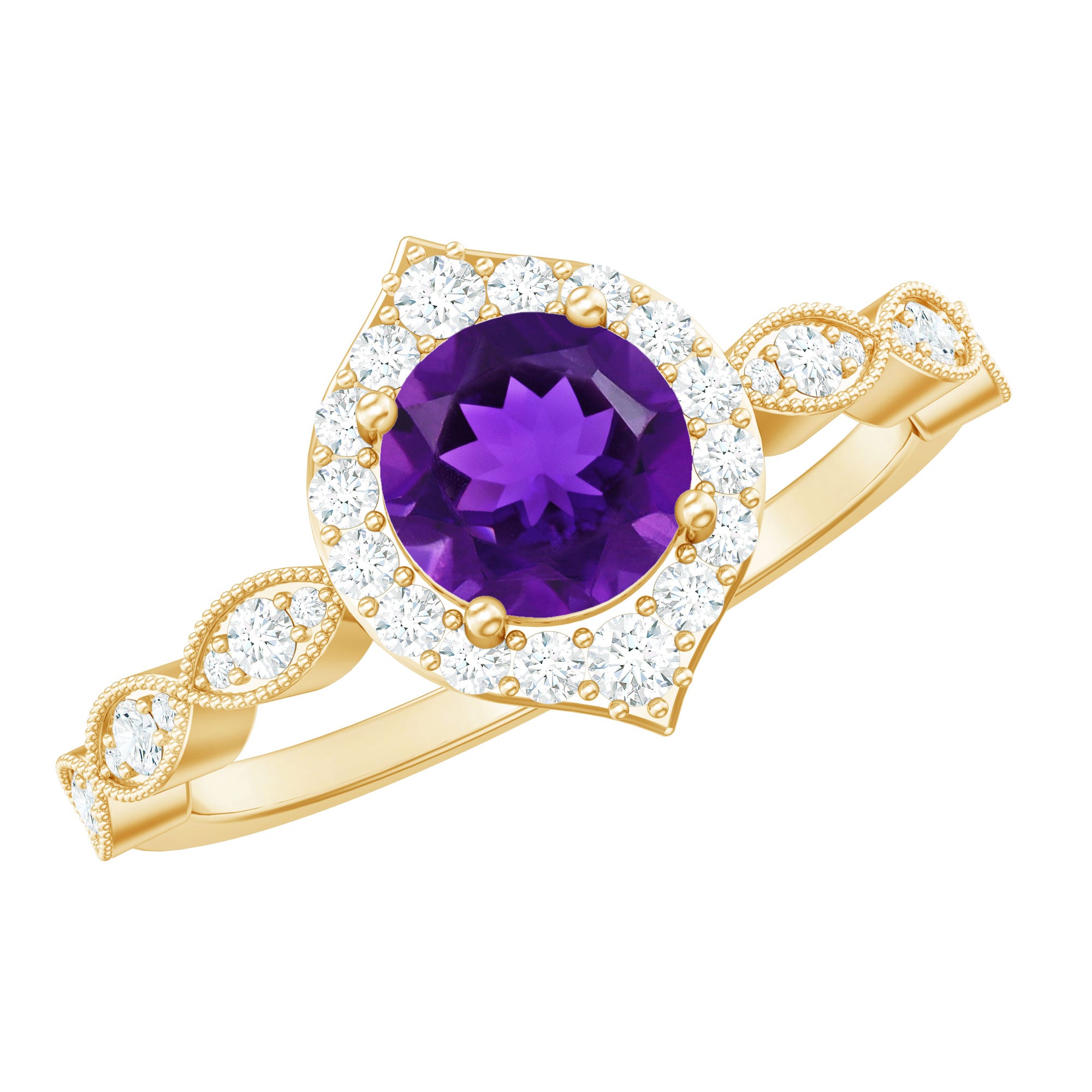 Halo is a setting of gemstone rings in which small accents of gemstone surround the center stone. Our amethyst halo rings are rings with center amethyst surrounded by small accents of diamonds and moissanites. Diamond and moissanites accents help in adding more brilliance to the amethyst rings. The benefit of the Halo designs is that the style is a blend of modern and classic styles and appears bigger as compared to solitaire.