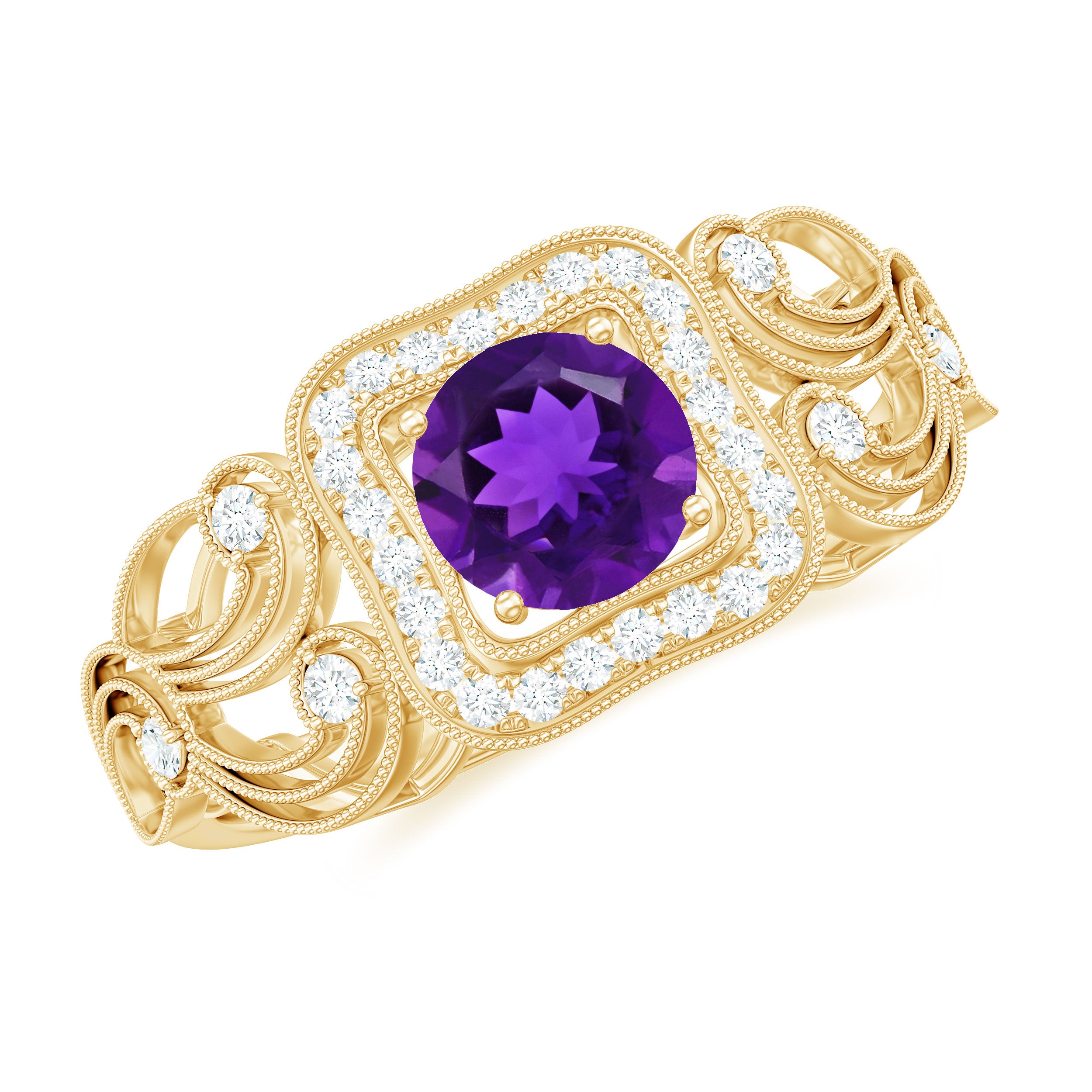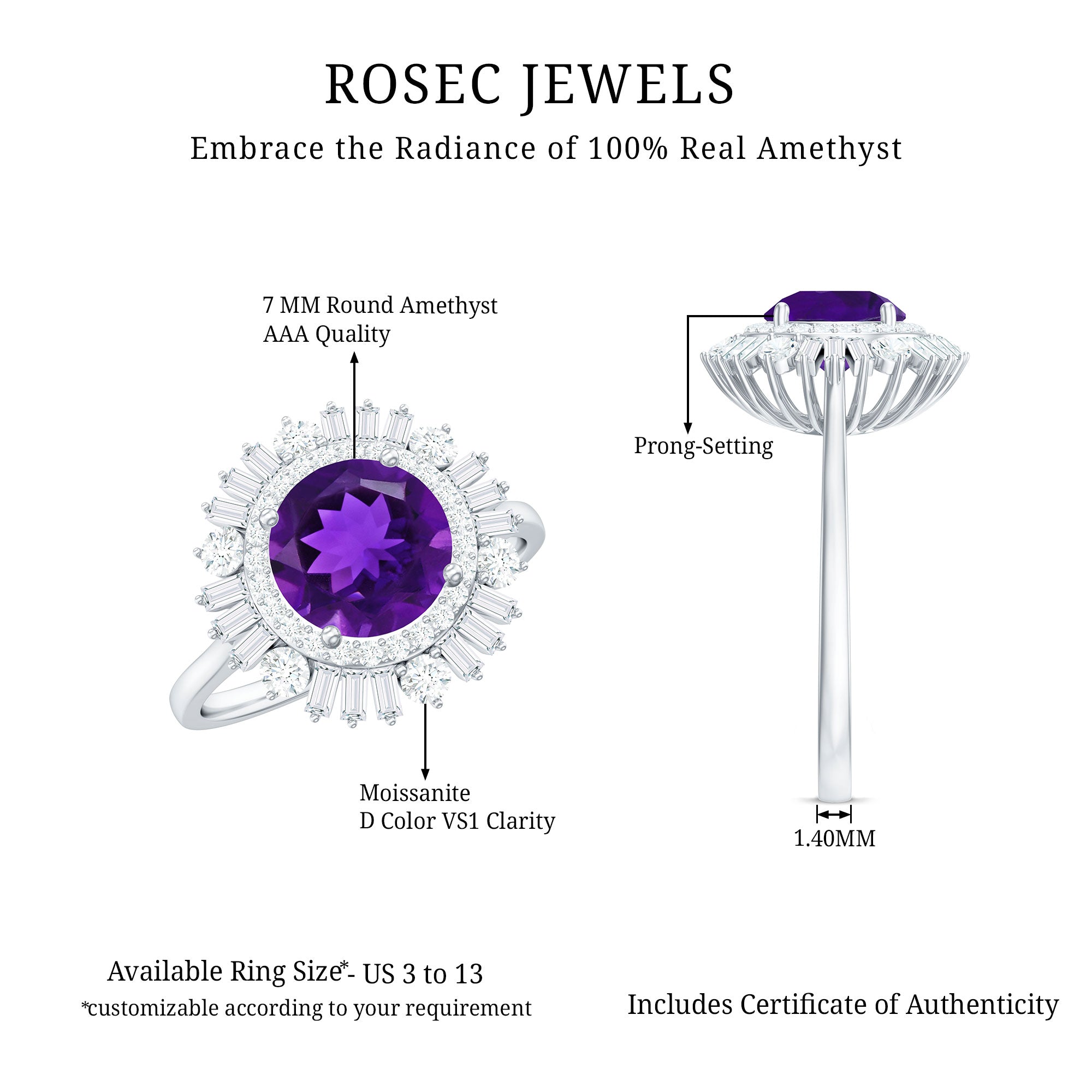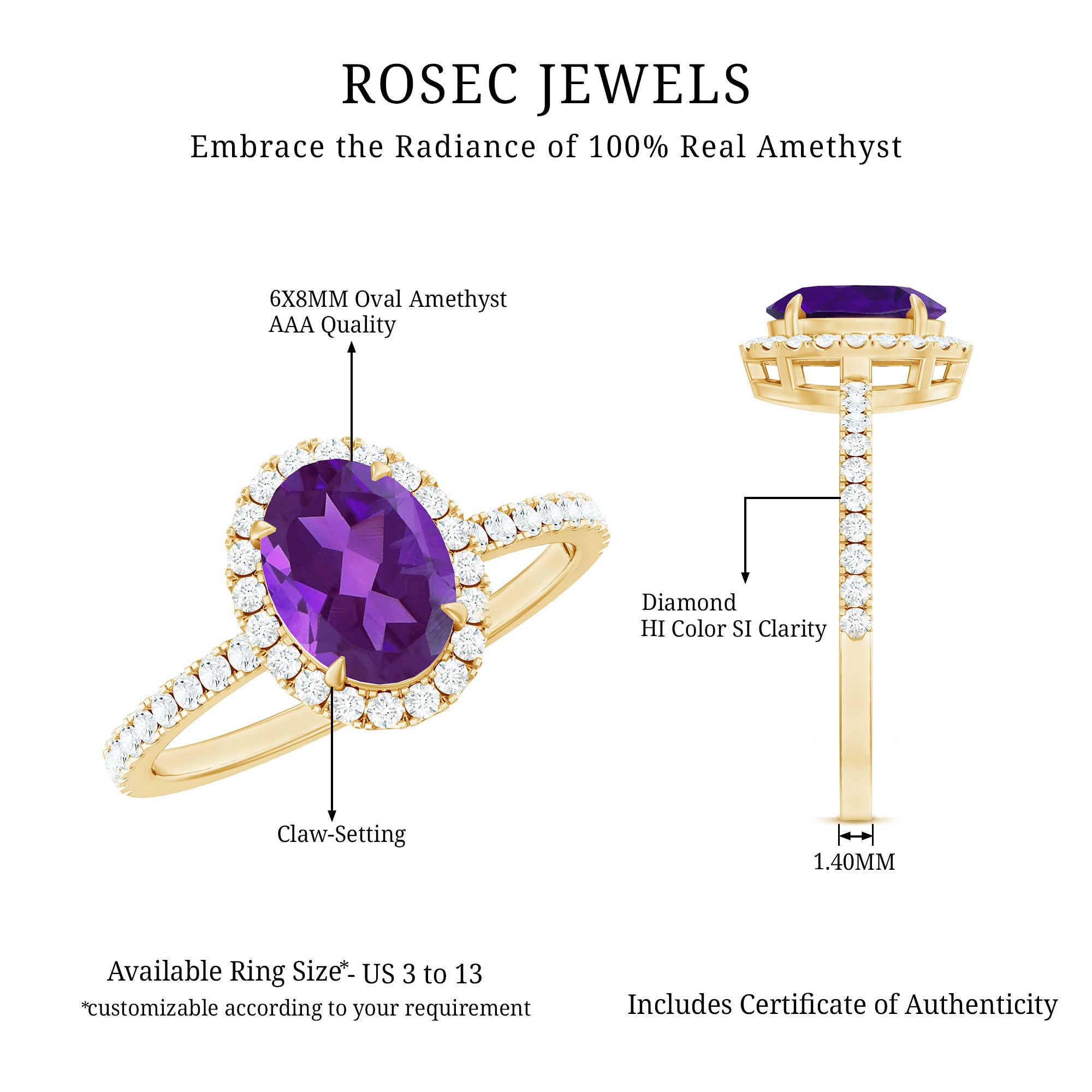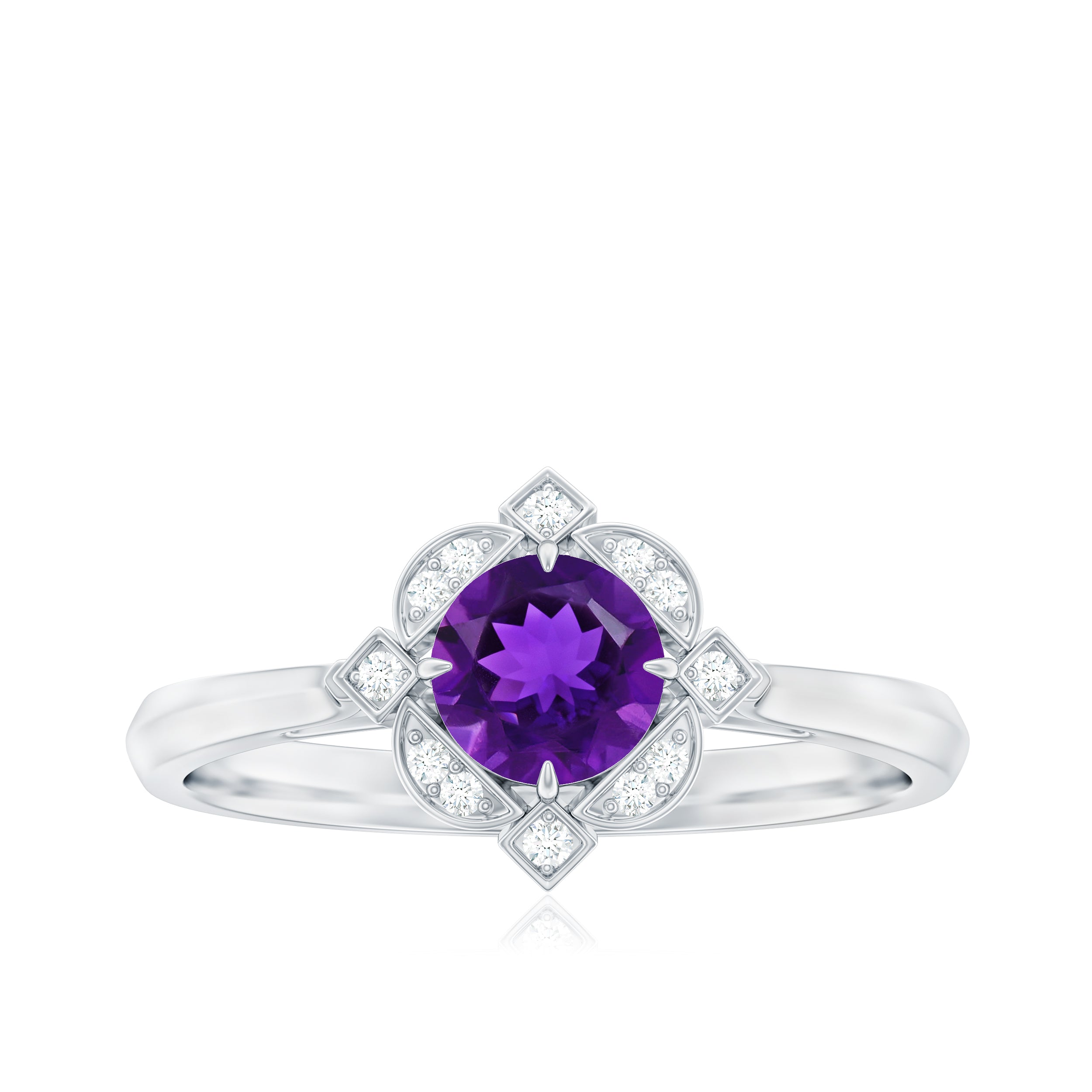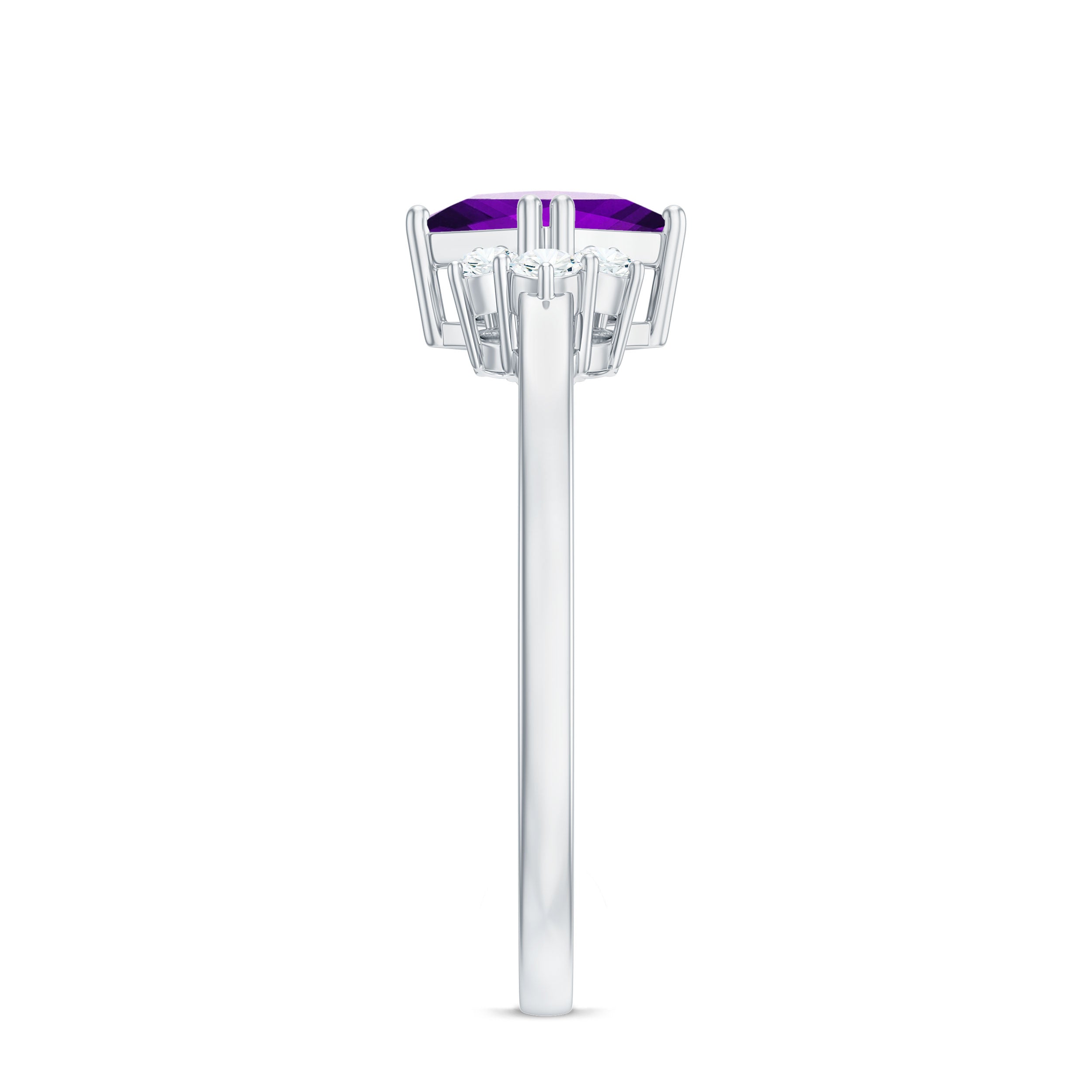 Halo is a setting of gemstone rings in which small accents of gemstone surround the center stone. Our amethyst halo rings are rings with center amethyst surrounded by small accents of diamonds and moissanites. Diamond and moissanites accents help in adding more brilliance to the amethyst rings. The benefit of the Halo designs is that the style is a blend of modern and classic styles and appears bigger as compared to solitaire.