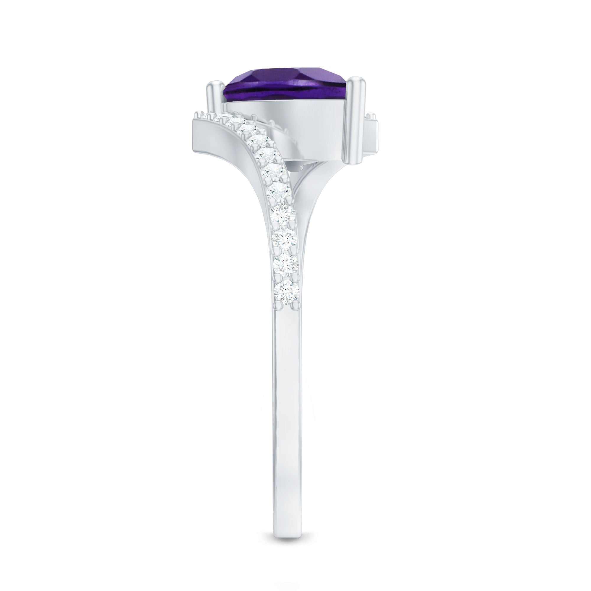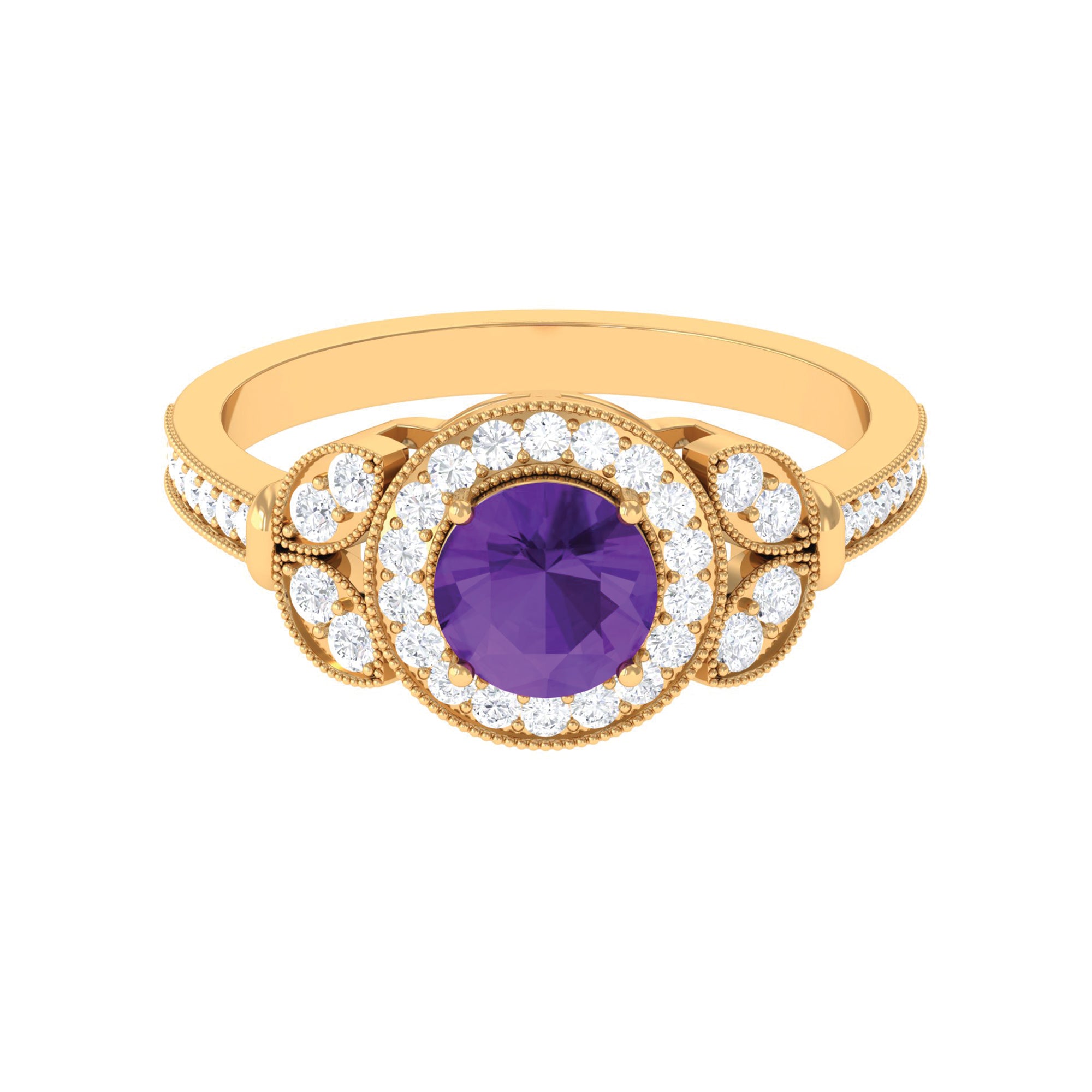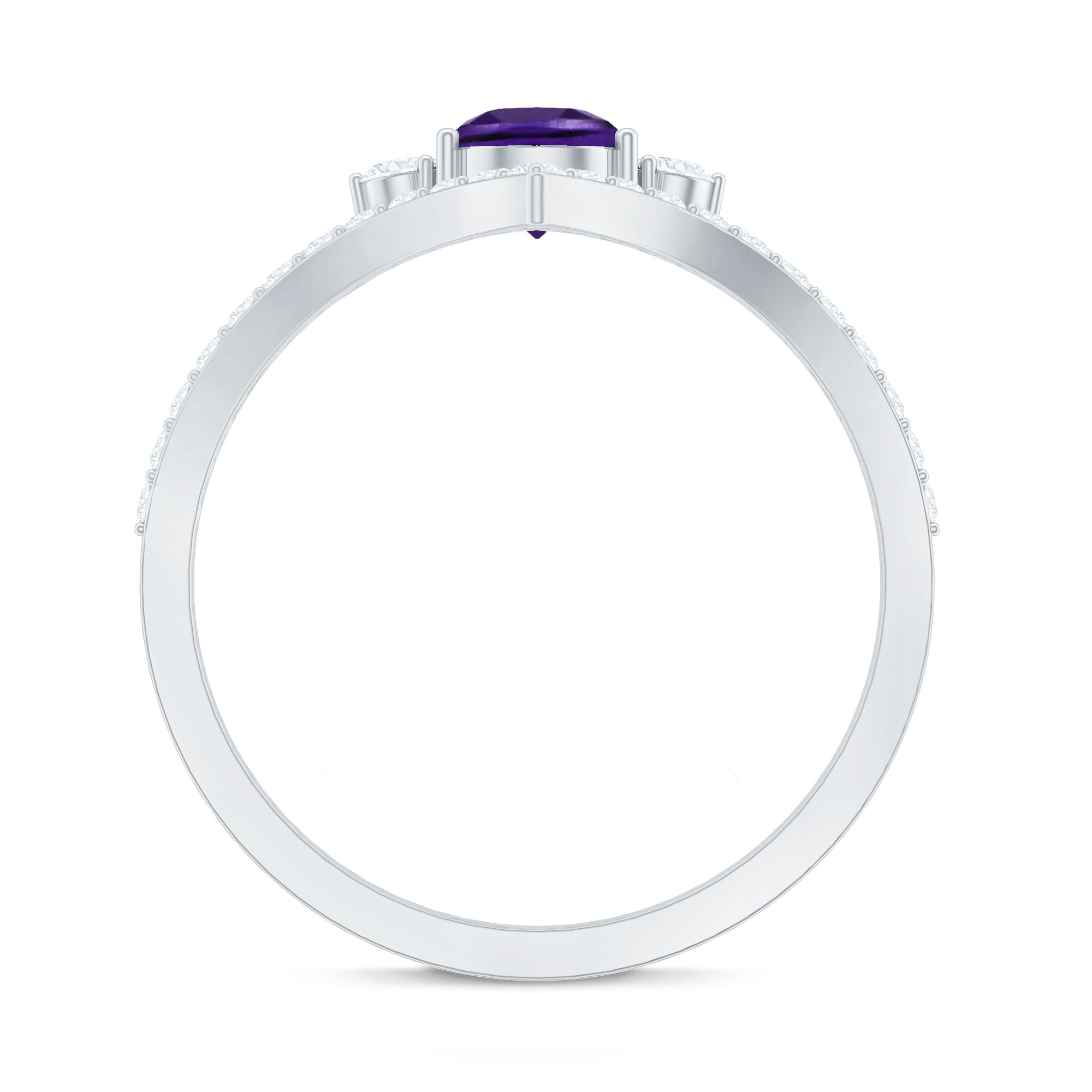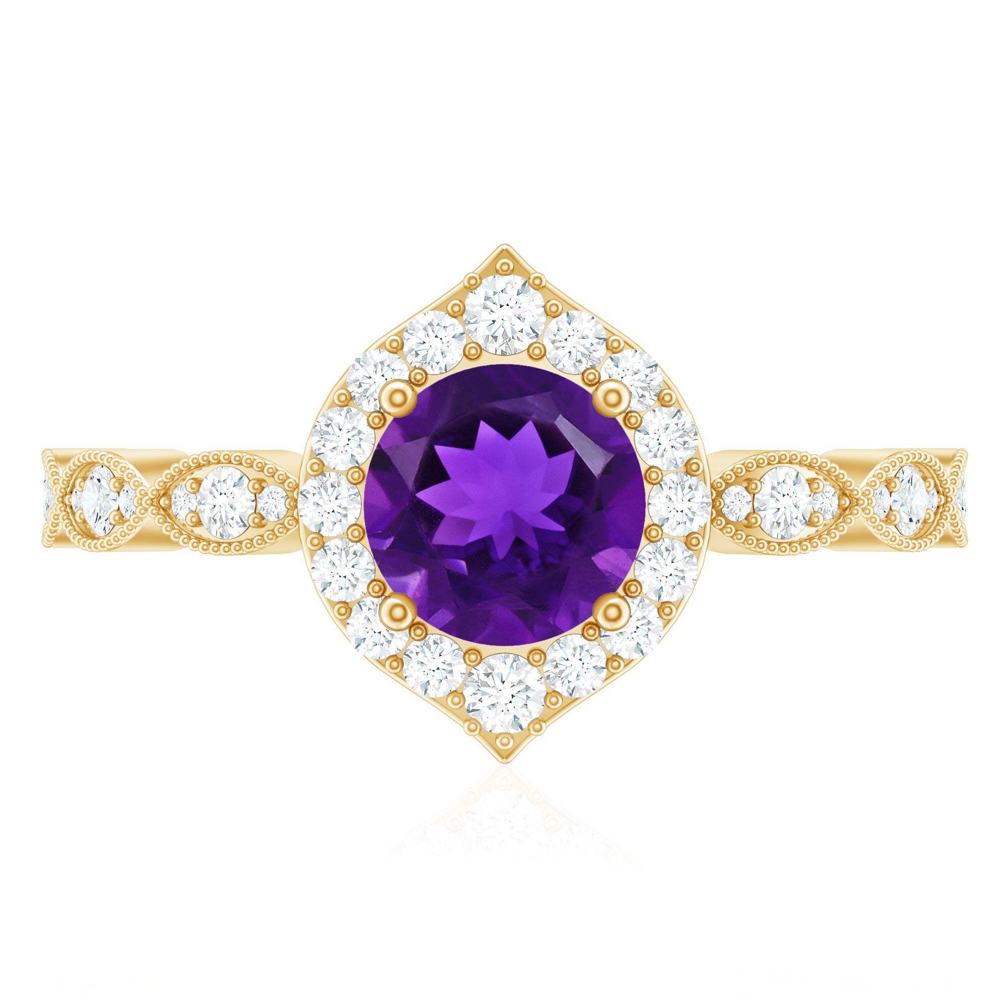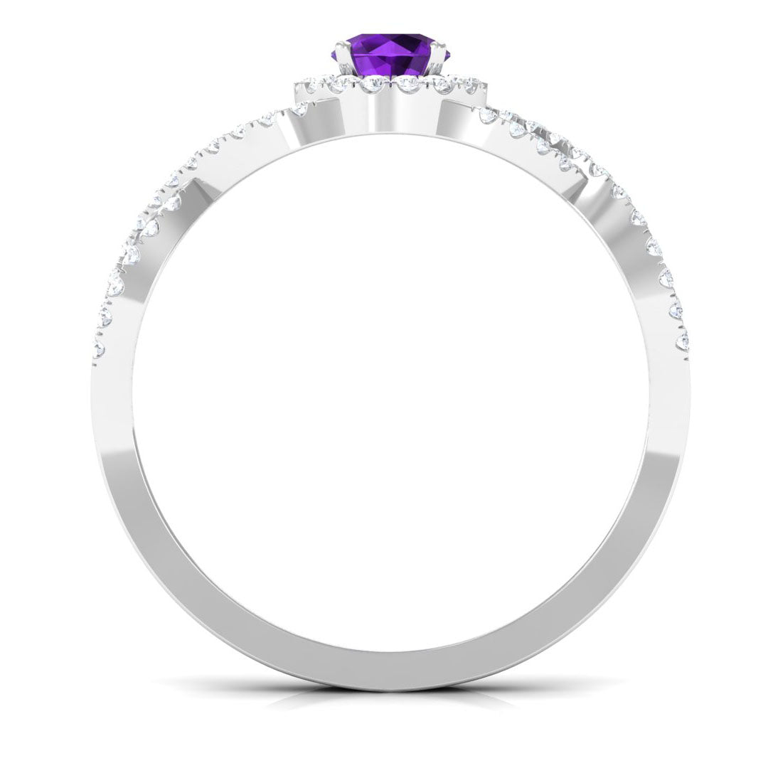 Halo is a setting of gemstone rings in which small accents of gemstone surround the center stone. Our amethyst halo rings are rings with center amethyst surrounded by small accents of diamonds and moissanites. Diamond and moissanites accents help in adding more brilliance to the amethyst rings. The benefit of the Halo designs is that the style is a blend of modern and classic styles and appears bigger as compared to solitaire.