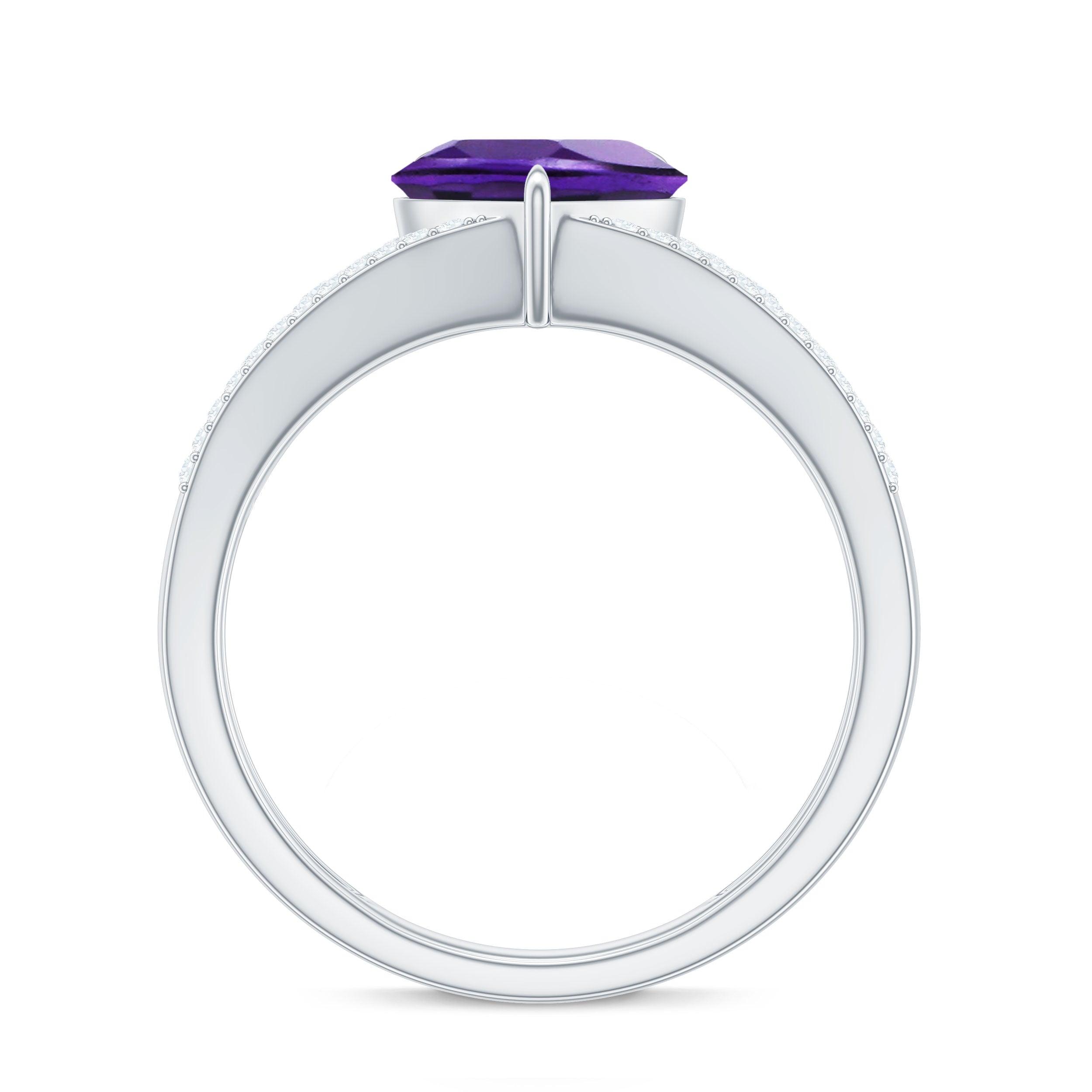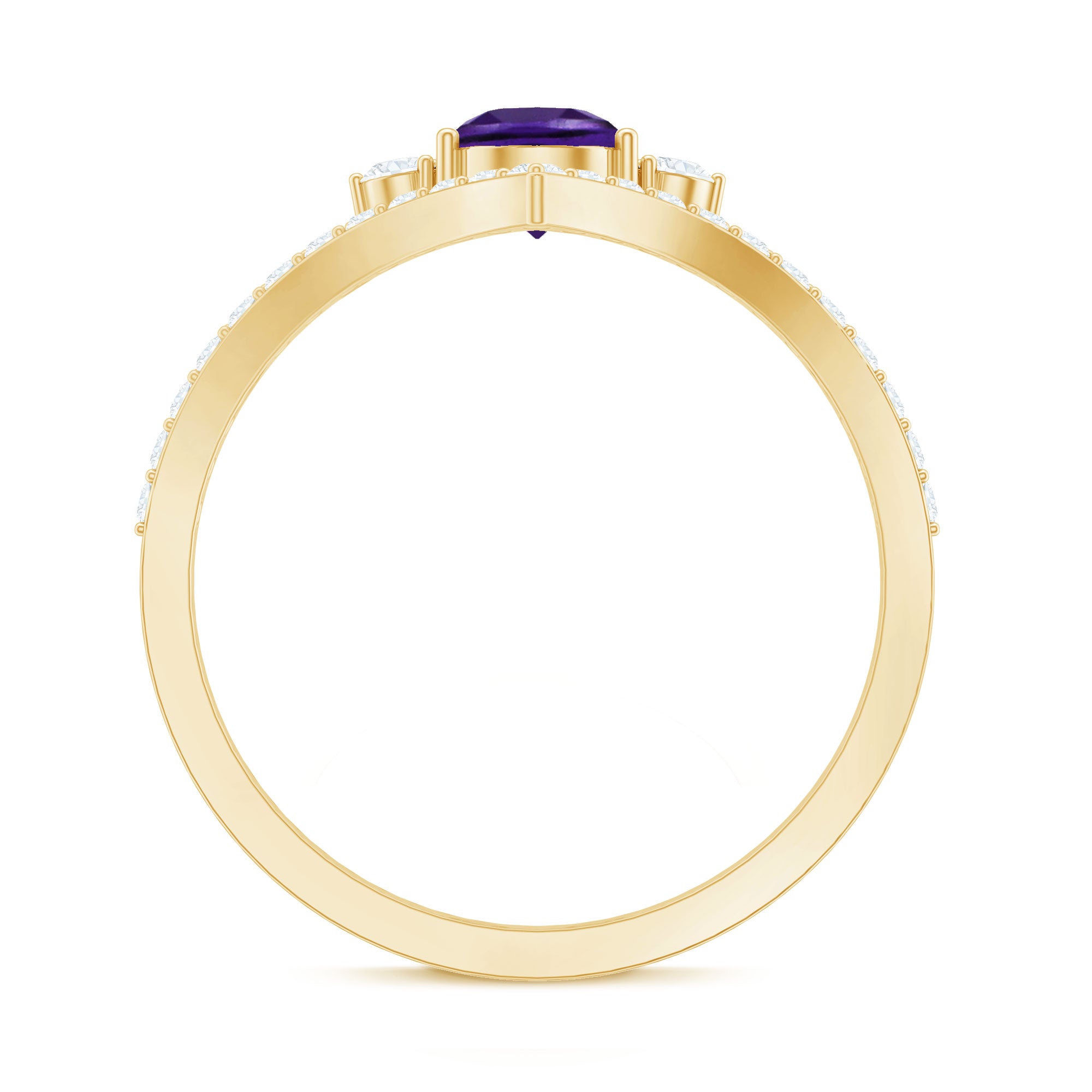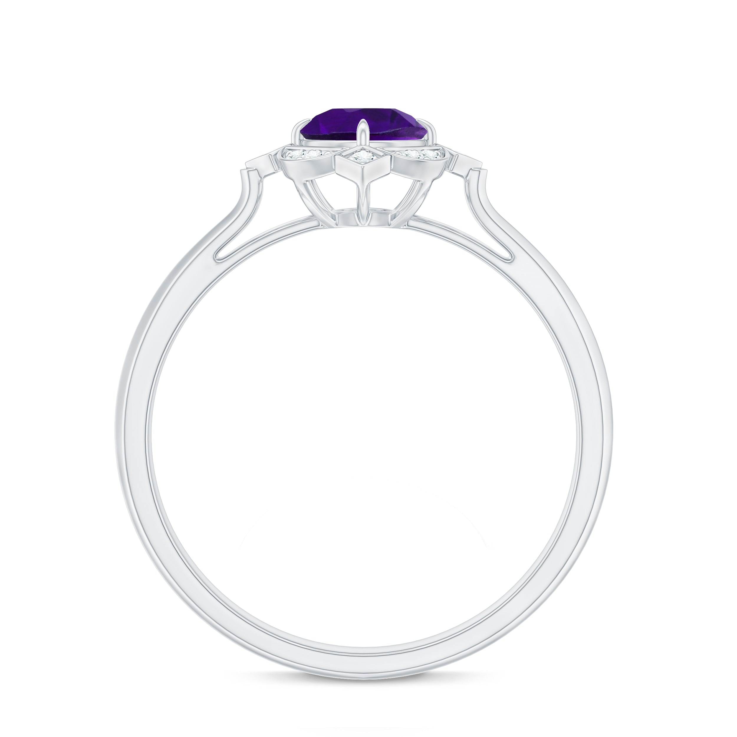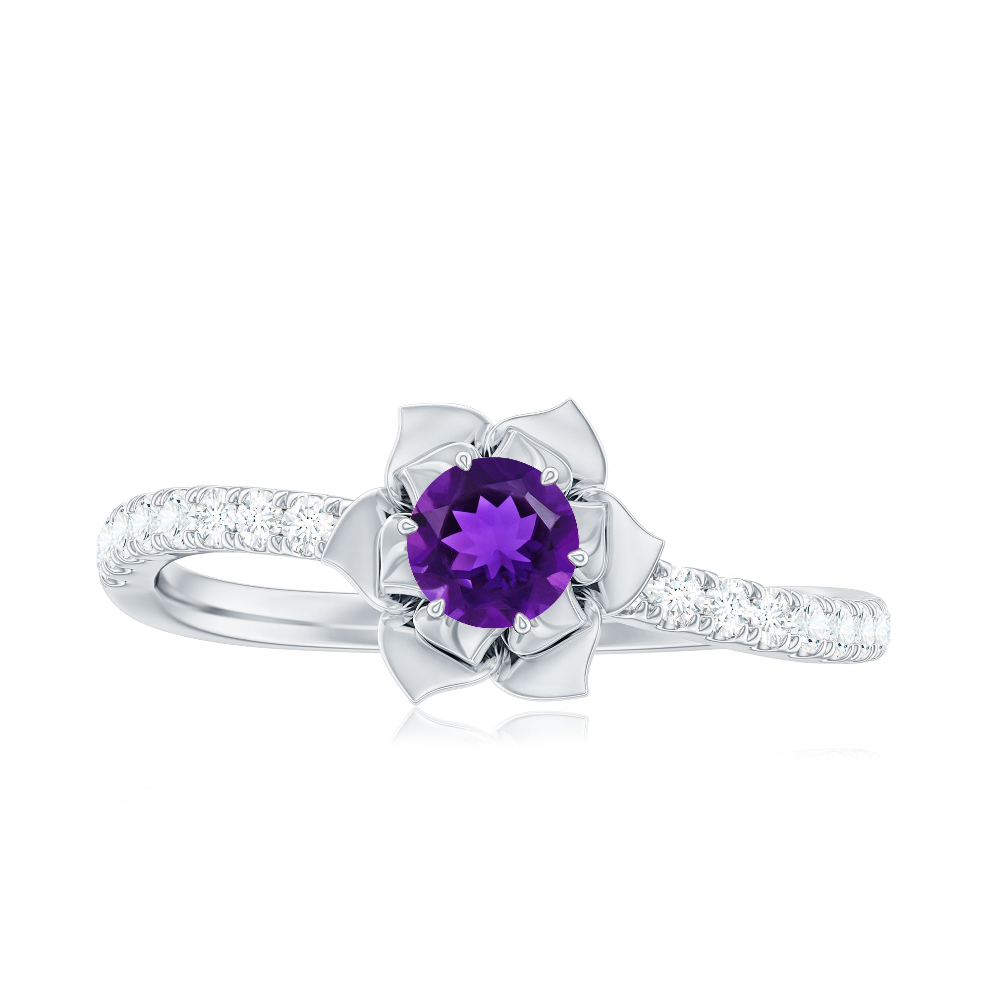 Halo is a setting of gemstone rings in which small accents of gemstone surround the center stone. Our amethyst halo rings are rings with center amethyst surrounded by small accents of diamonds and moissanites. Diamond and moissanites accents help in adding more brilliance to the amethyst rings. The benefit of the Halo designs is that the style is a blend of modern and classic styles and appears bigger as compared to solitaire.