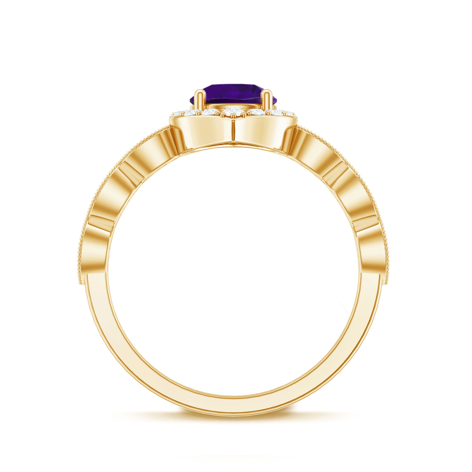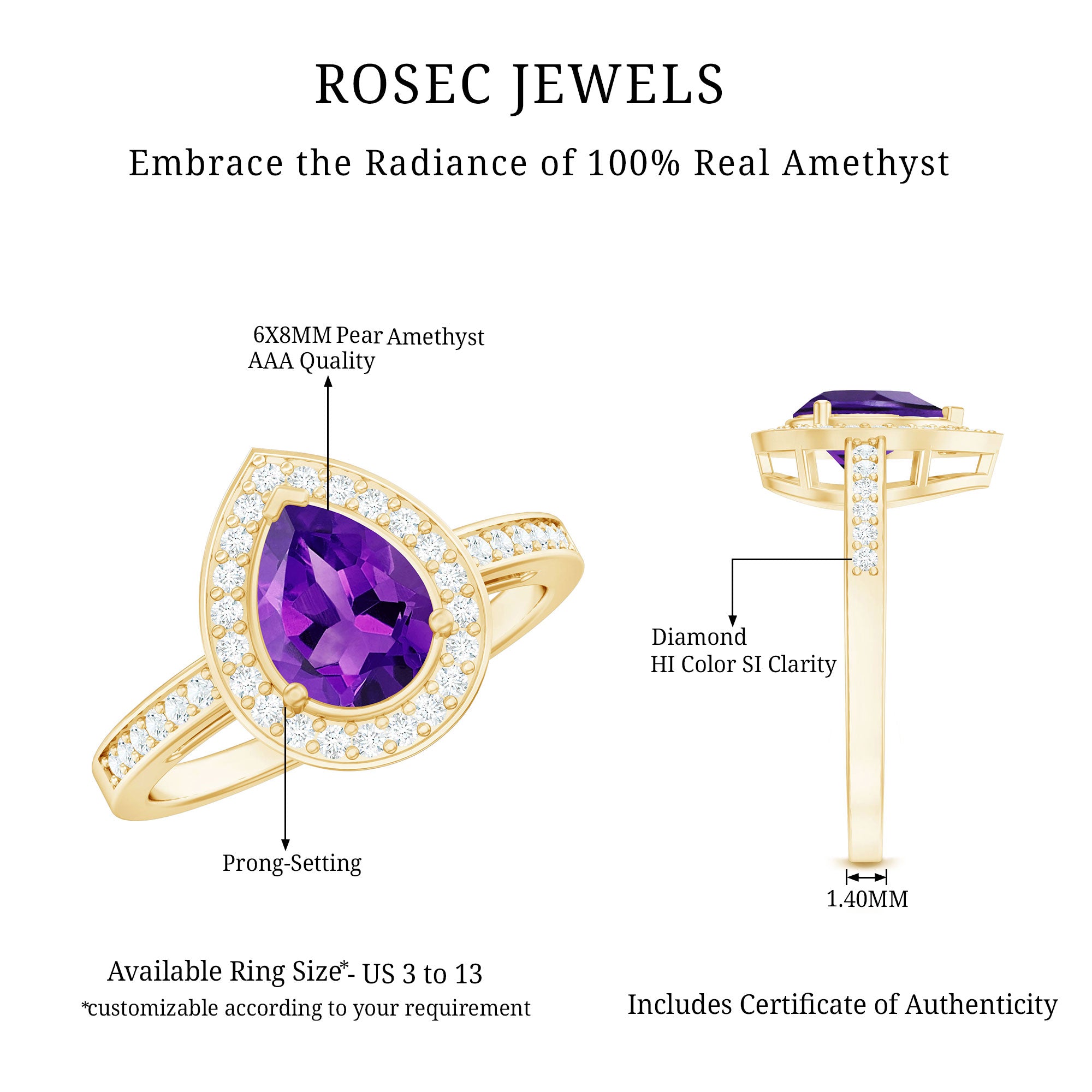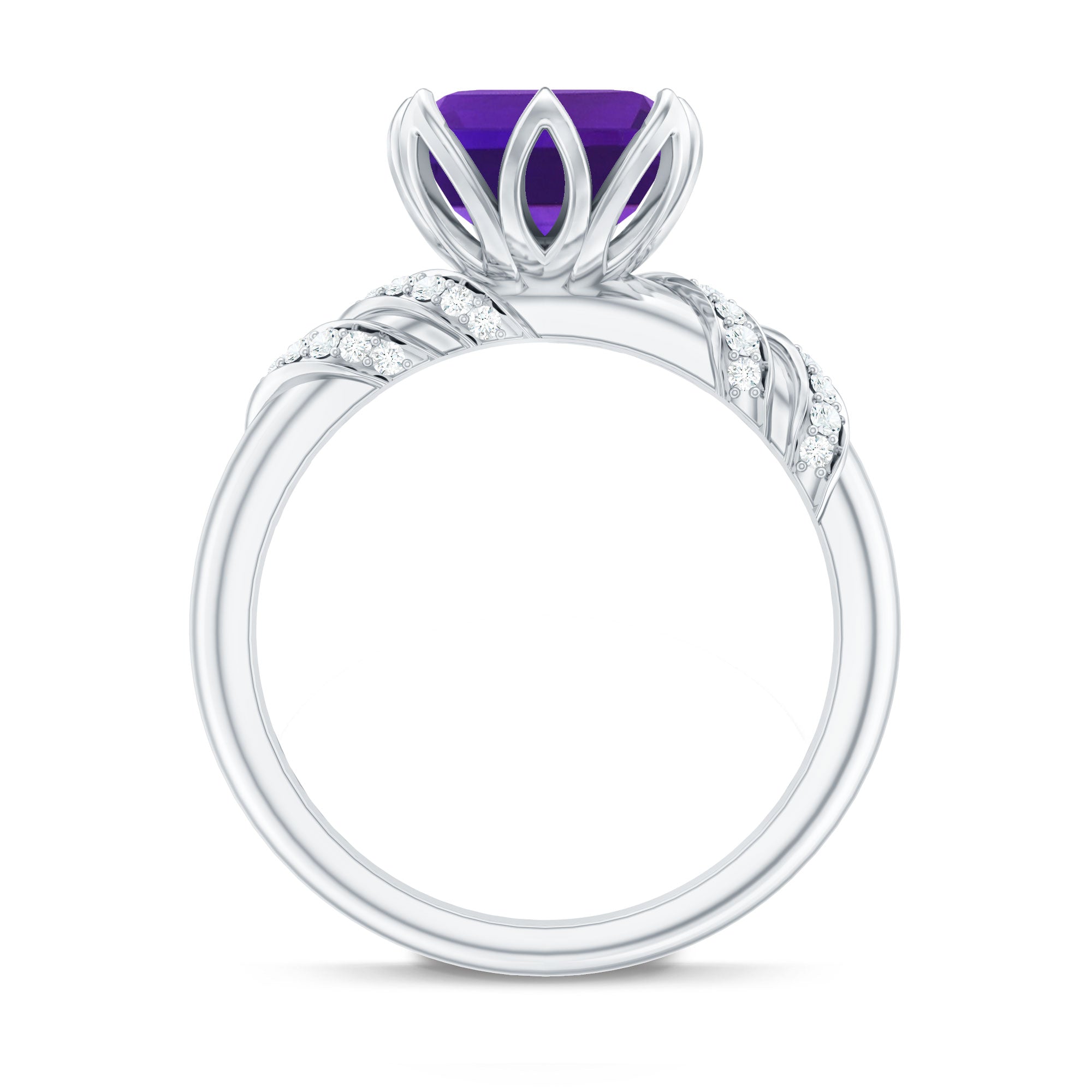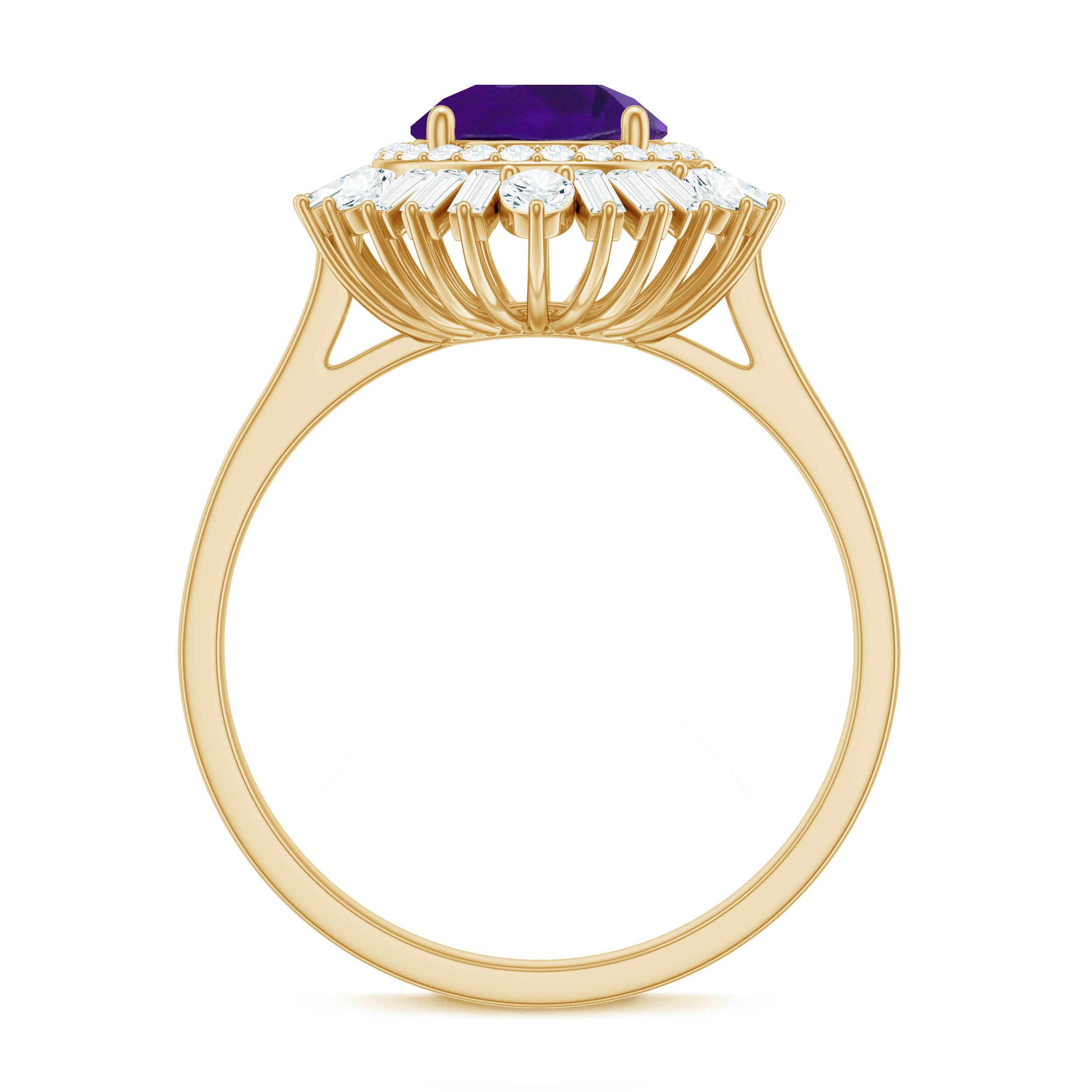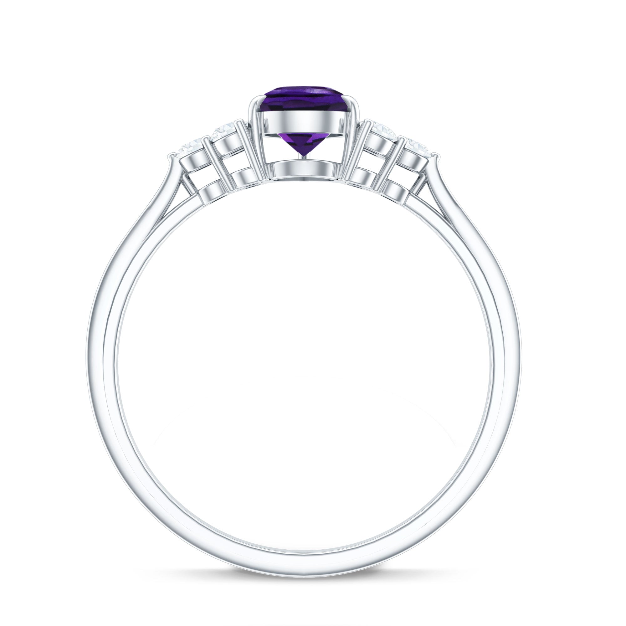Halo is a setting of gemstone rings in which small accents of gemstone surround the center stone. Our amethyst halo rings are rings with center amethyst surrounded by small accents of diamonds and moissanites. Diamond and moissanites accents help in adding more brilliance to the amethyst rings. The benefit of the Halo designs is that the style is a blend of modern and classic styles and appears bigger as compared to solitaire.