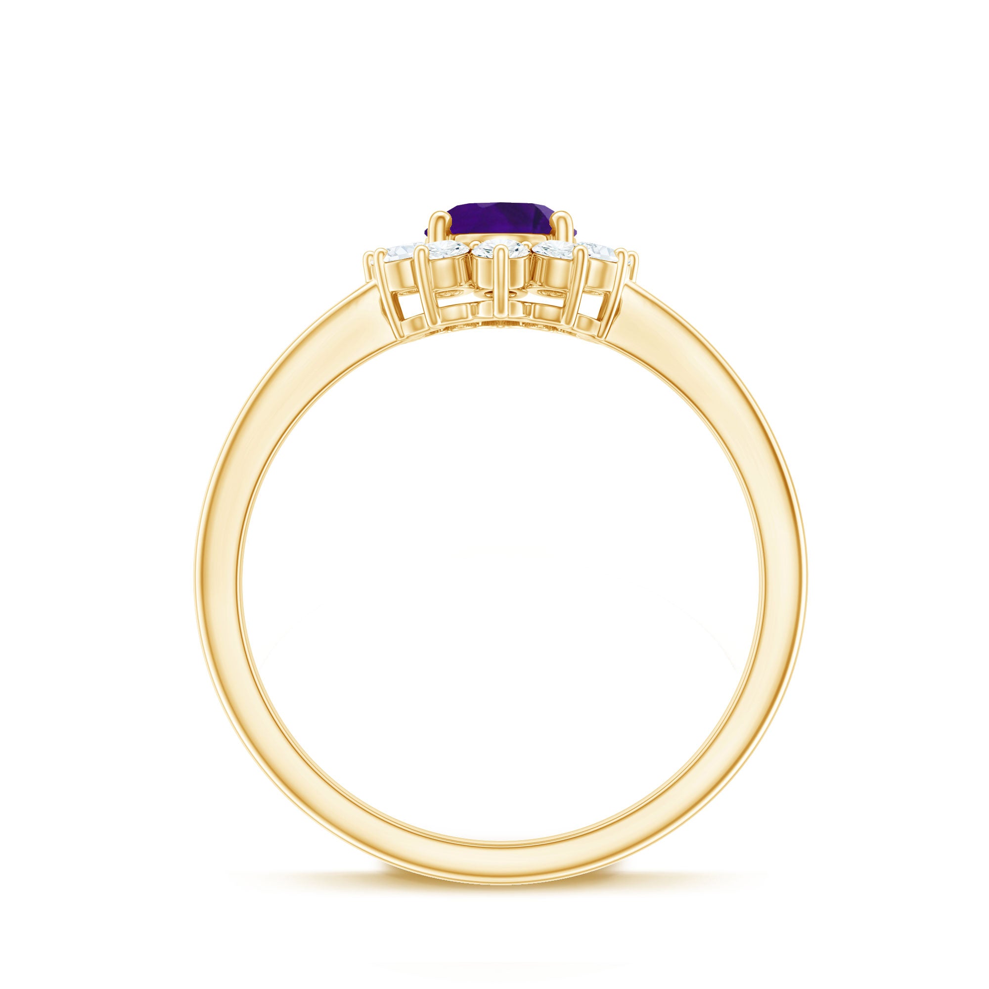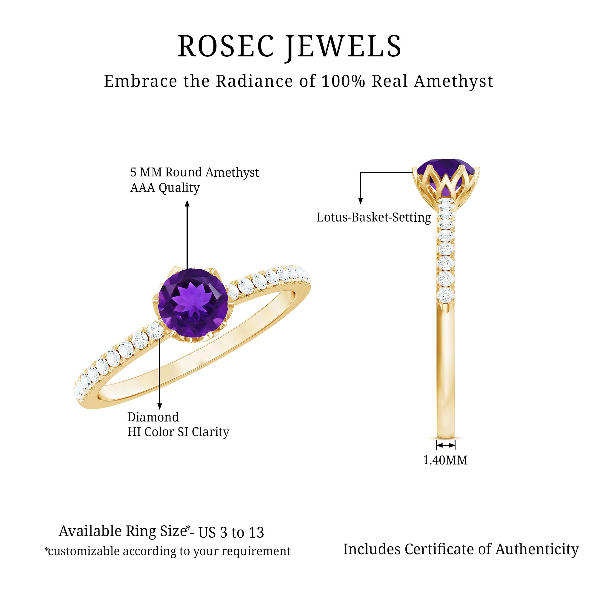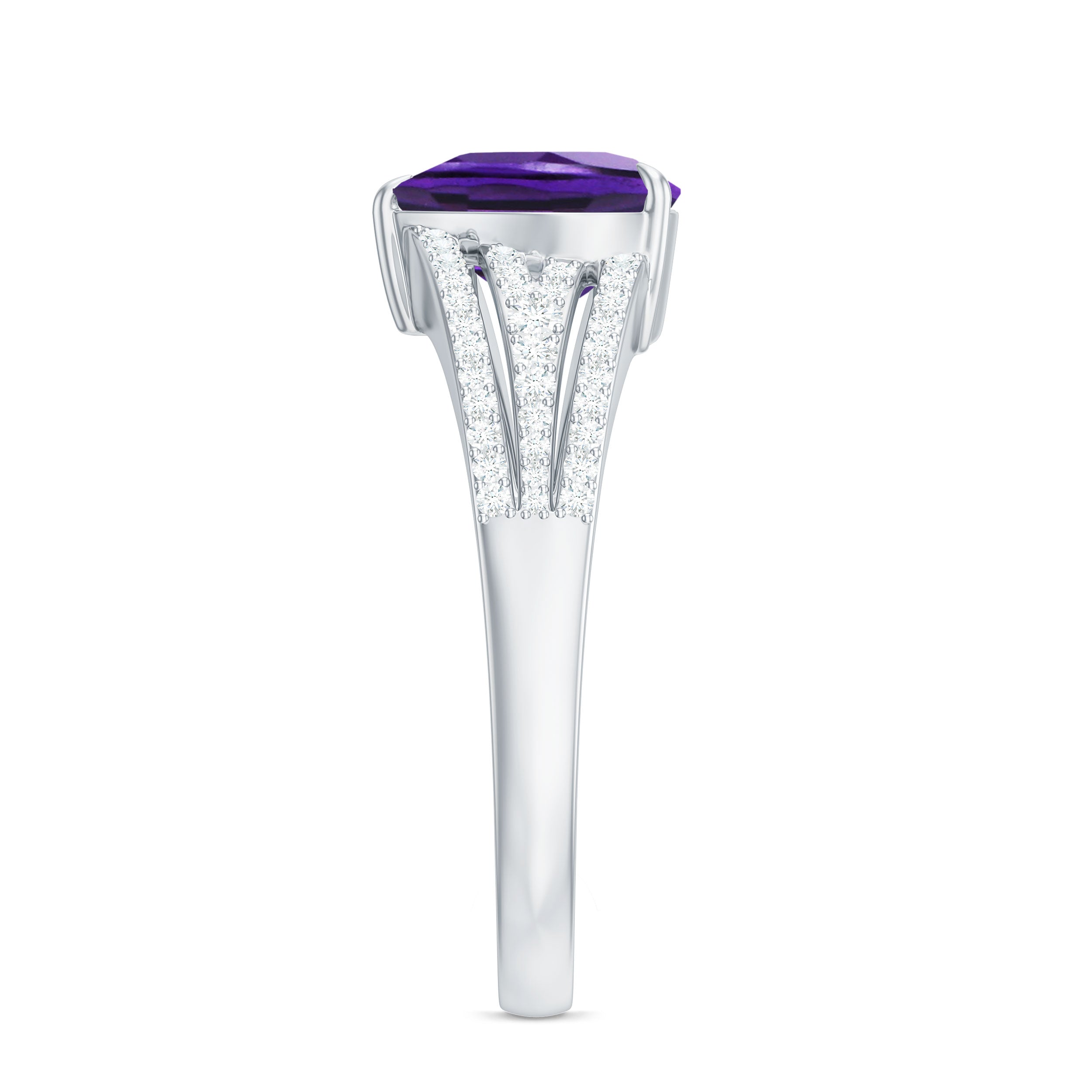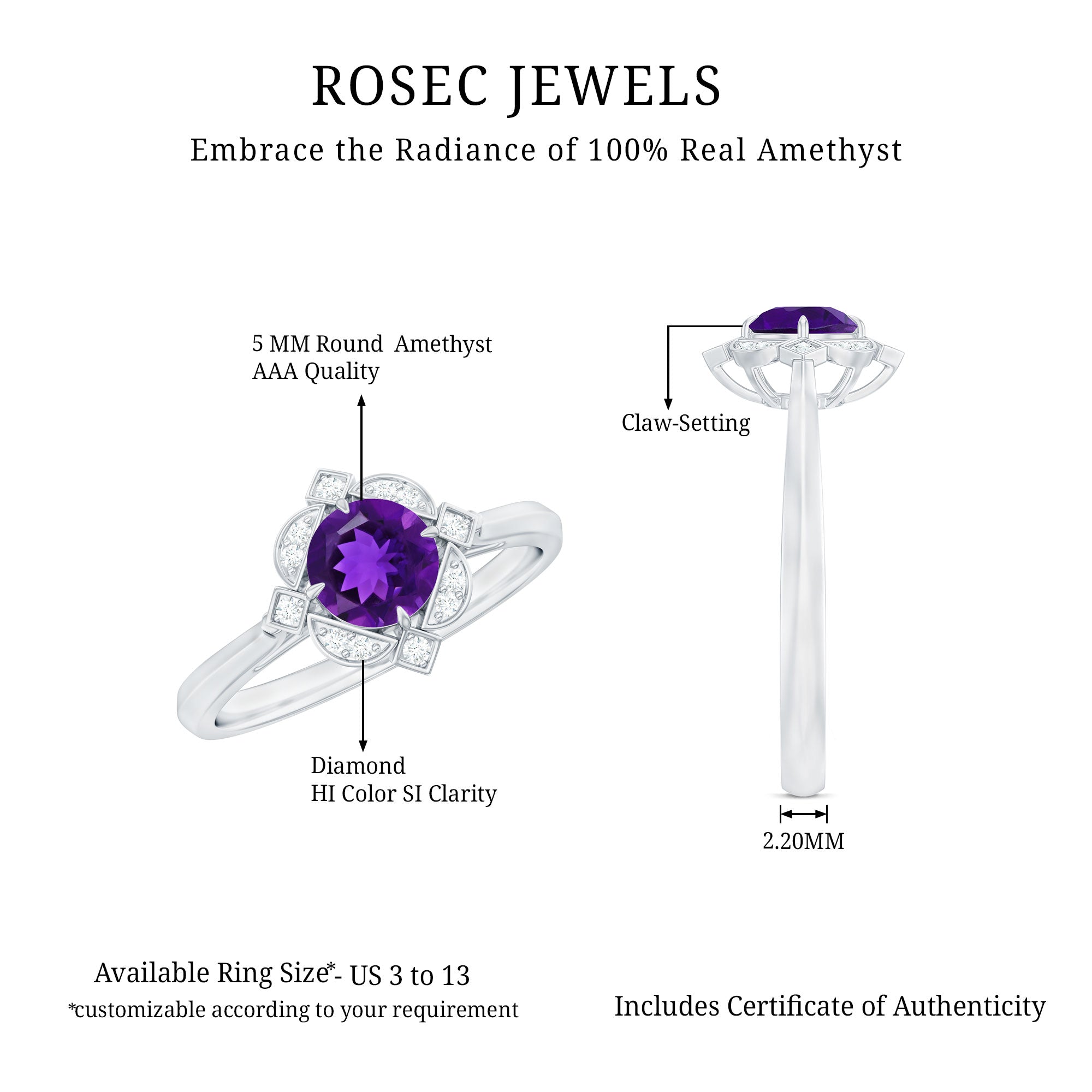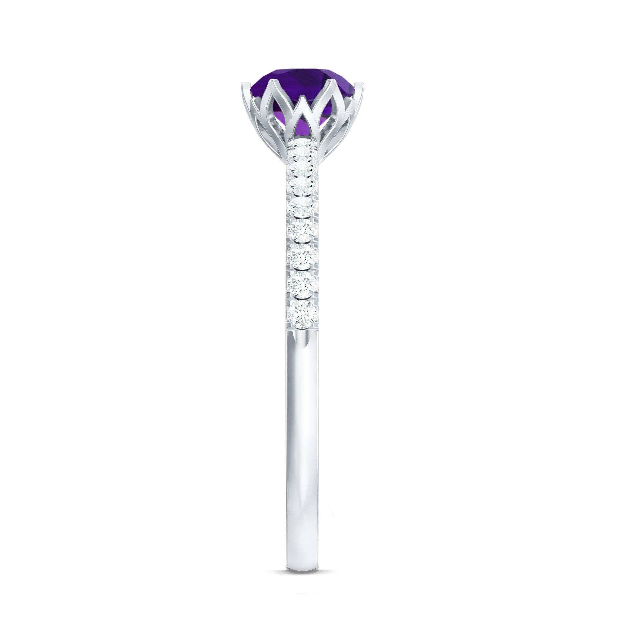 Halo is a setting of gemstone rings in which small accents of gemstone surround the center stone. Our amethyst halo rings are rings with center amethyst surrounded by small accents of diamonds and moissanites. Diamond and moissanites accents help in adding more brilliance to the amethyst rings. The benefit of the Halo designs is that the style is a blend of modern and classic styles and appears bigger as compared to solitaire.