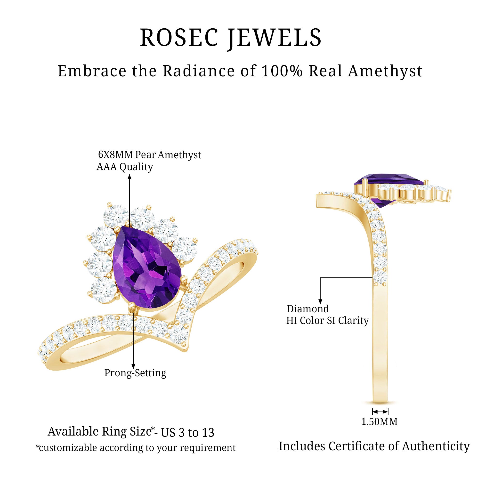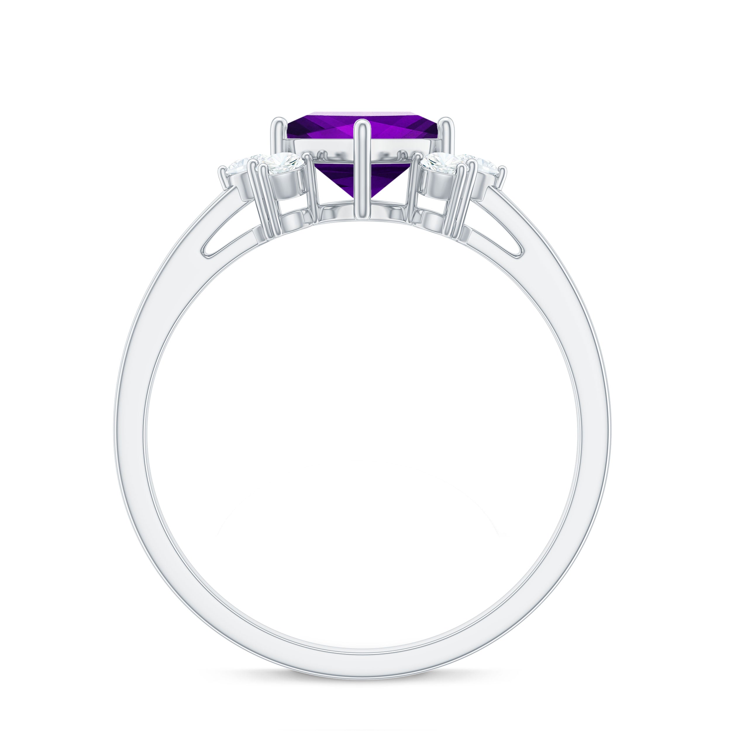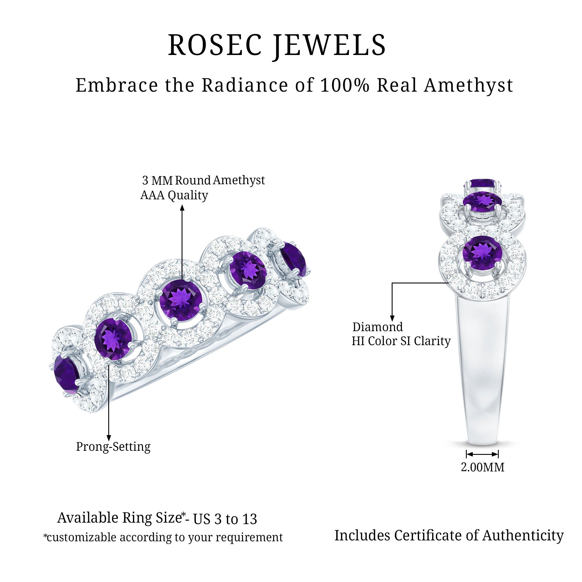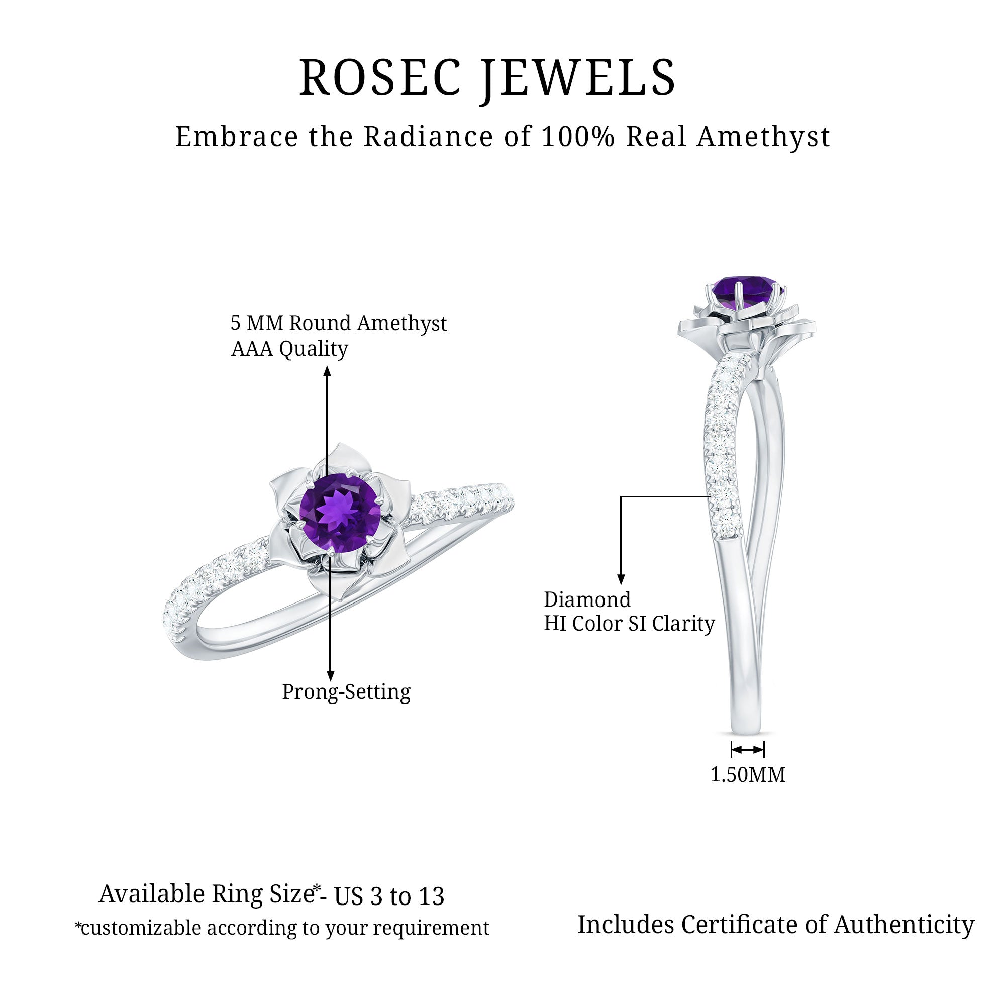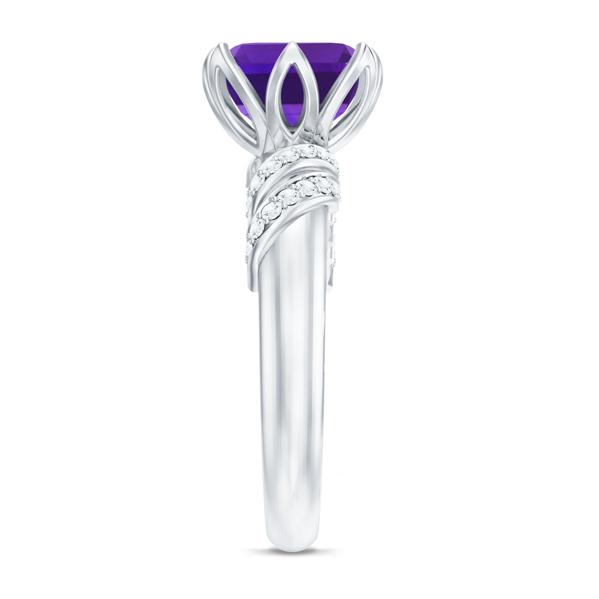 Halo is a setting of gemstone rings in which small accents of gemstone surround the center stone. Our amethyst halo rings are rings with center amethyst surrounded by small accents of diamonds and moissanites. Diamond and moissanites accents help in adding more brilliance to the amethyst rings. The benefit of the Halo designs is that the style is a blend of modern and classic styles and appears bigger as compared to solitaire.