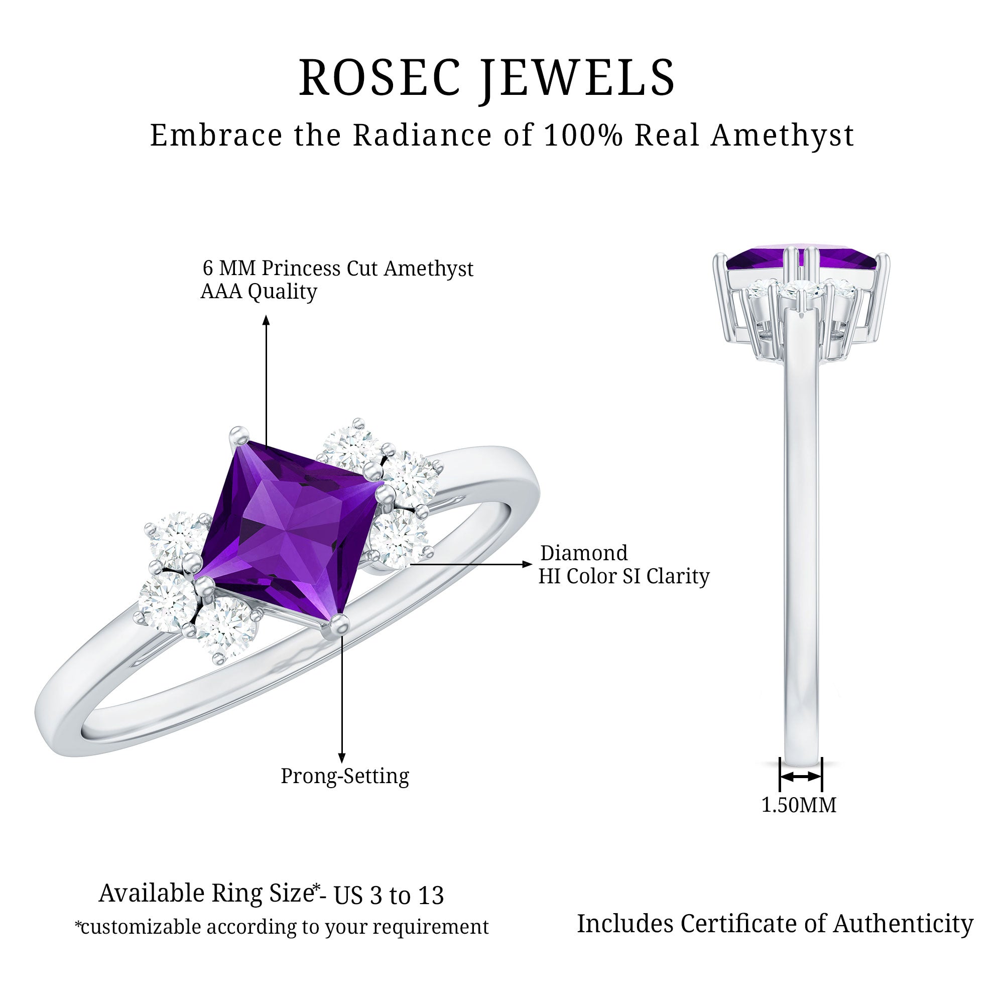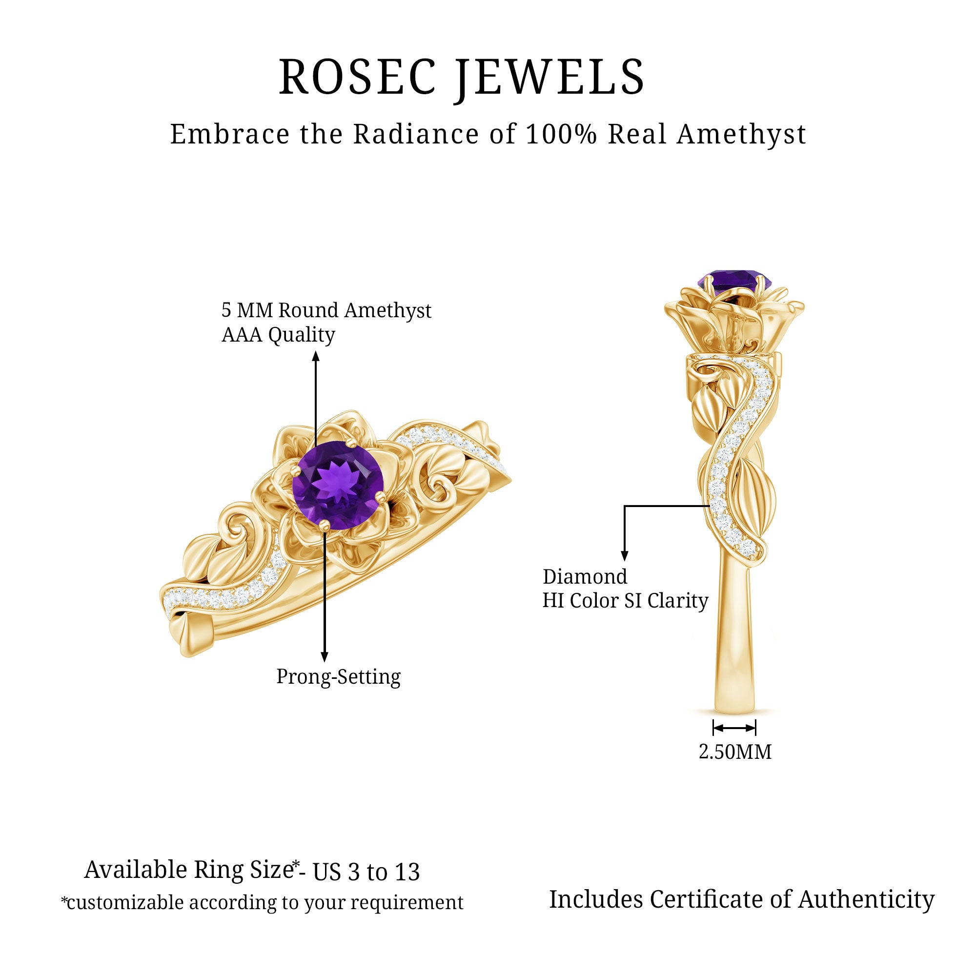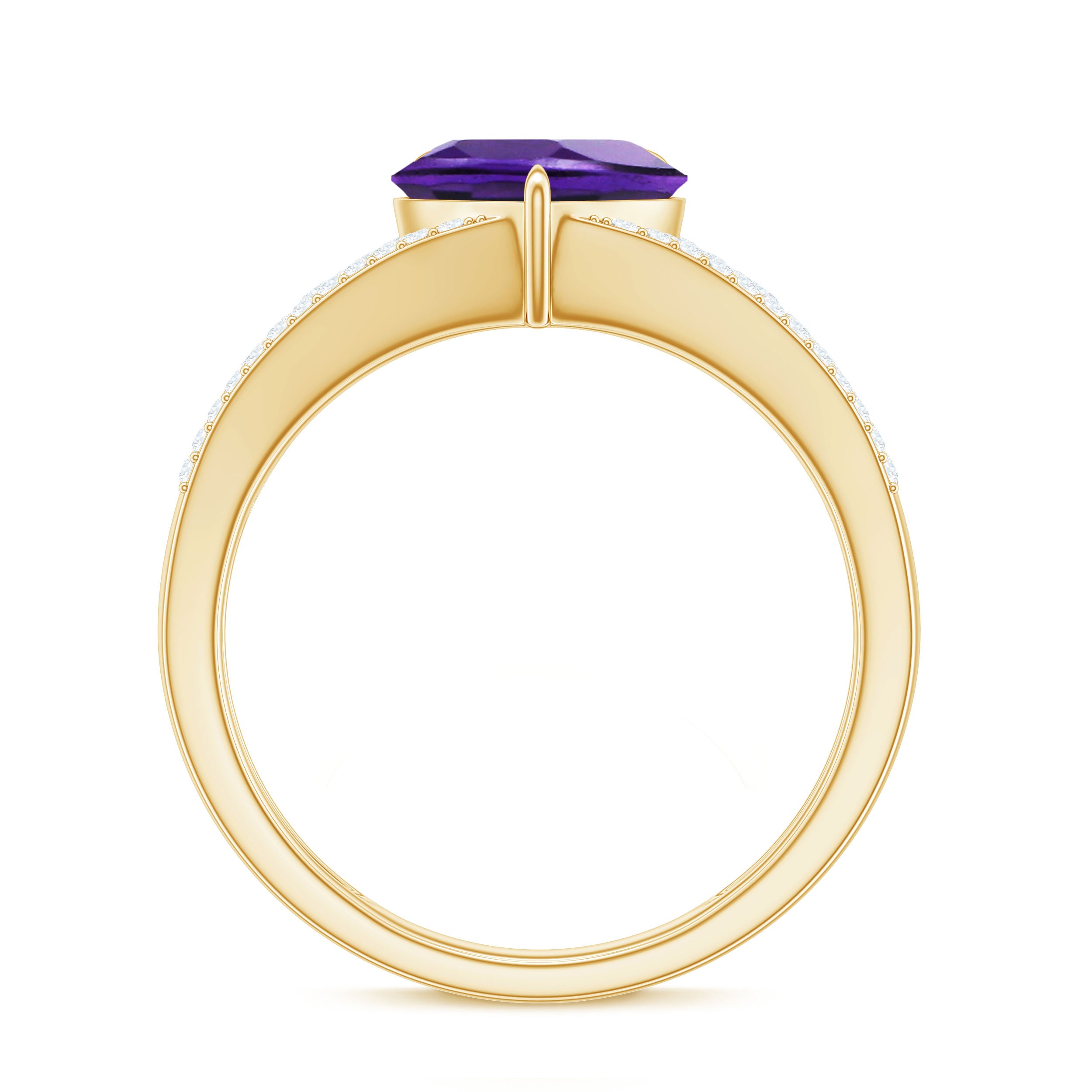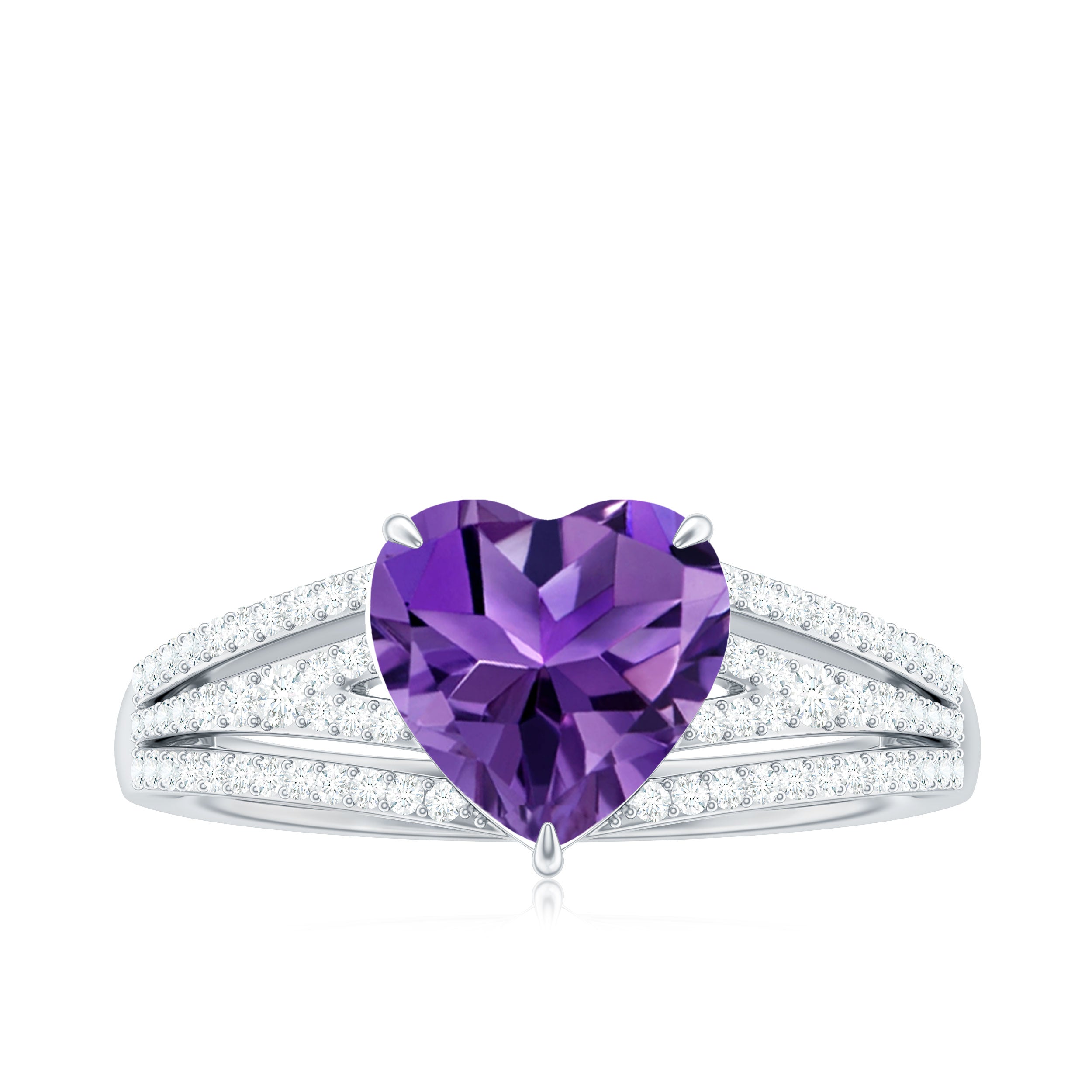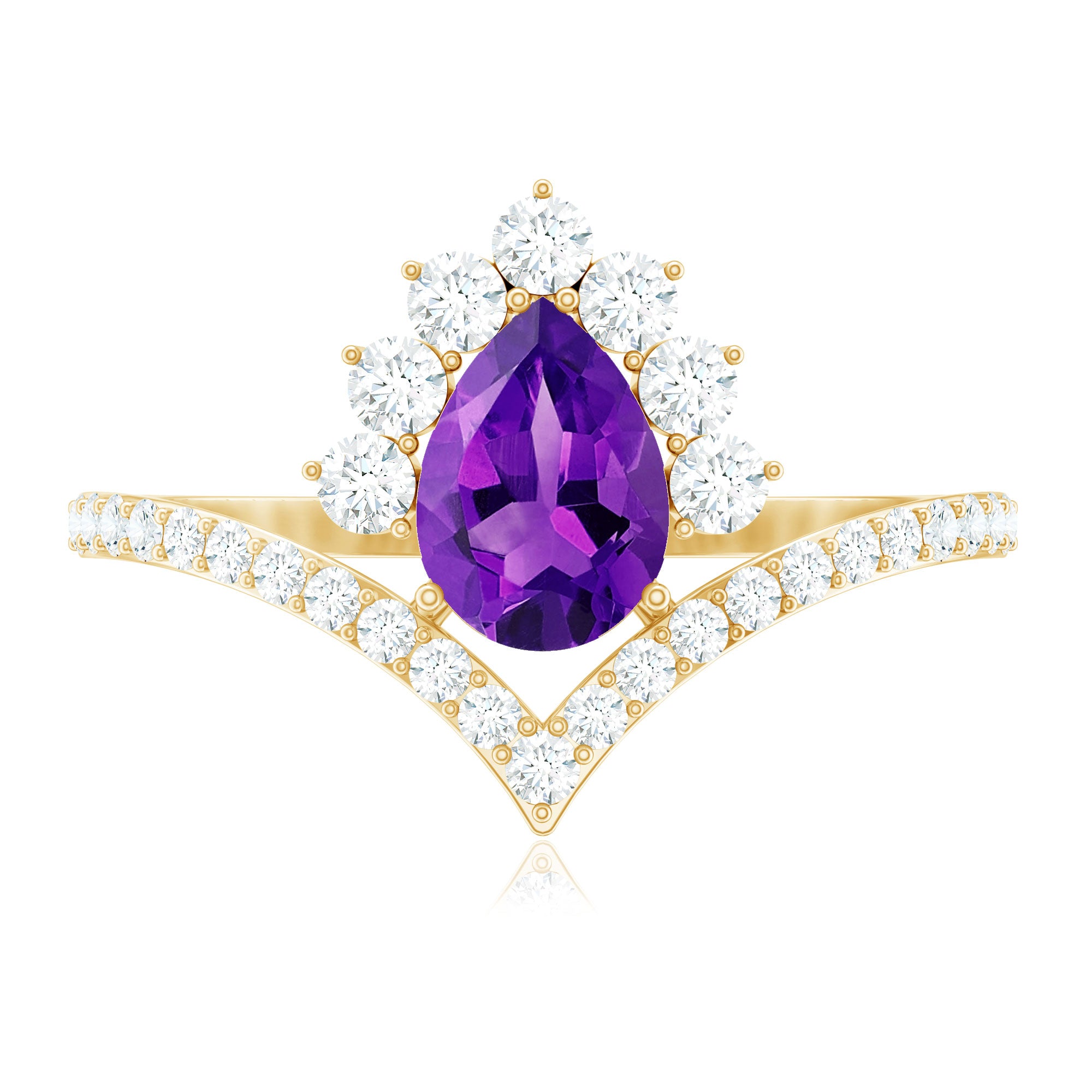 Halo is a setting of gemstone rings in which small accents of gemstone surround the center stone. Our amethyst halo rings are rings with center amethyst surrounded by small accents of diamonds and moissanites. Diamond and moissanites accents help in adding more brilliance to the amethyst rings. The benefit of the Halo designs is that the style is a blend of modern and classic styles and appears bigger as compared to solitaire.