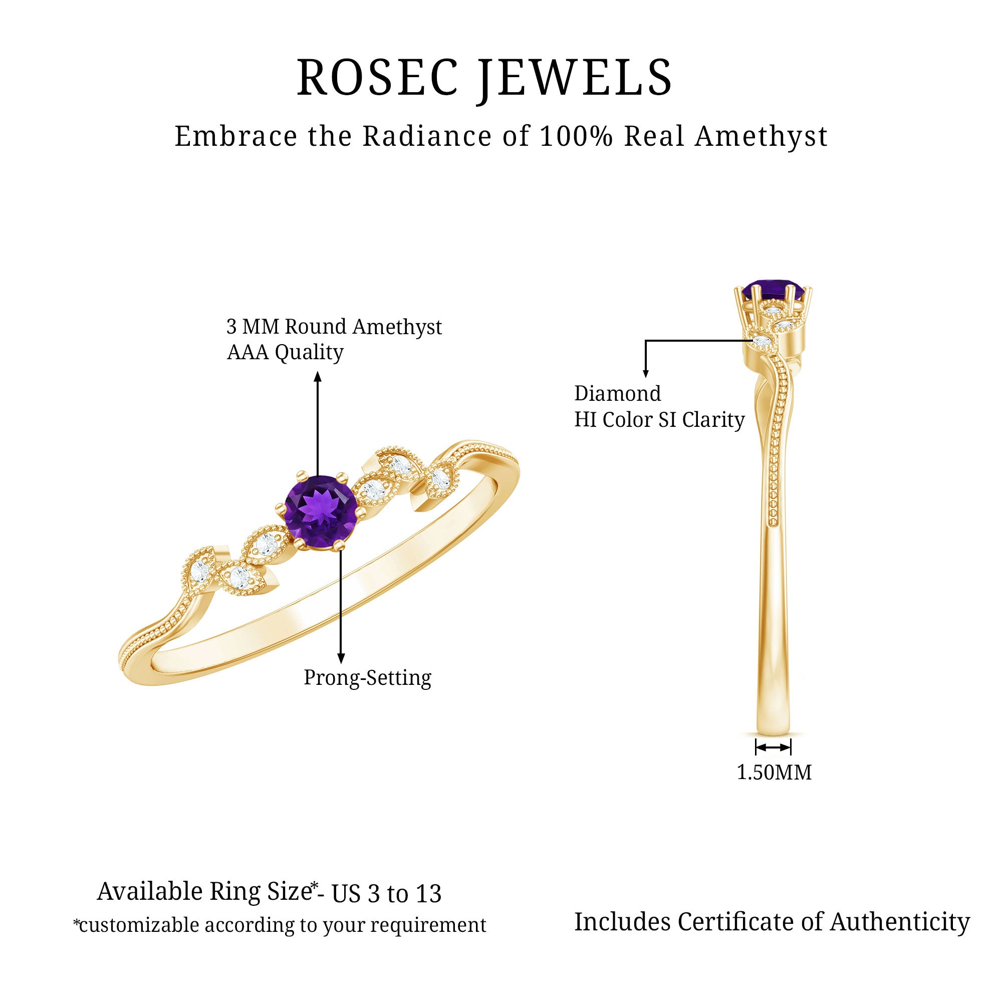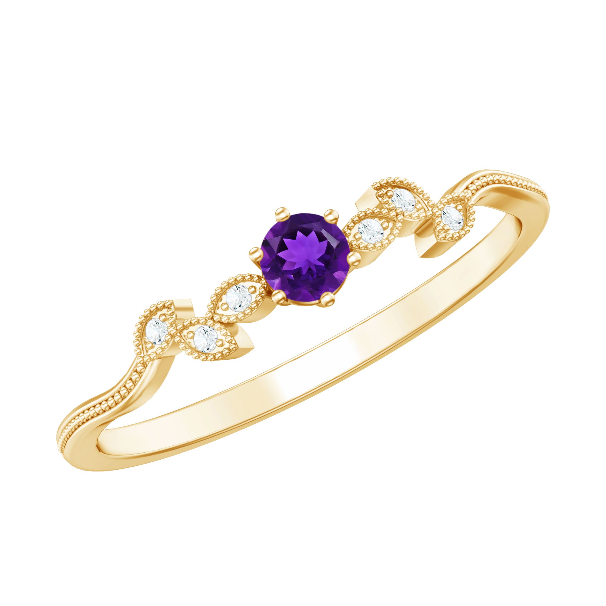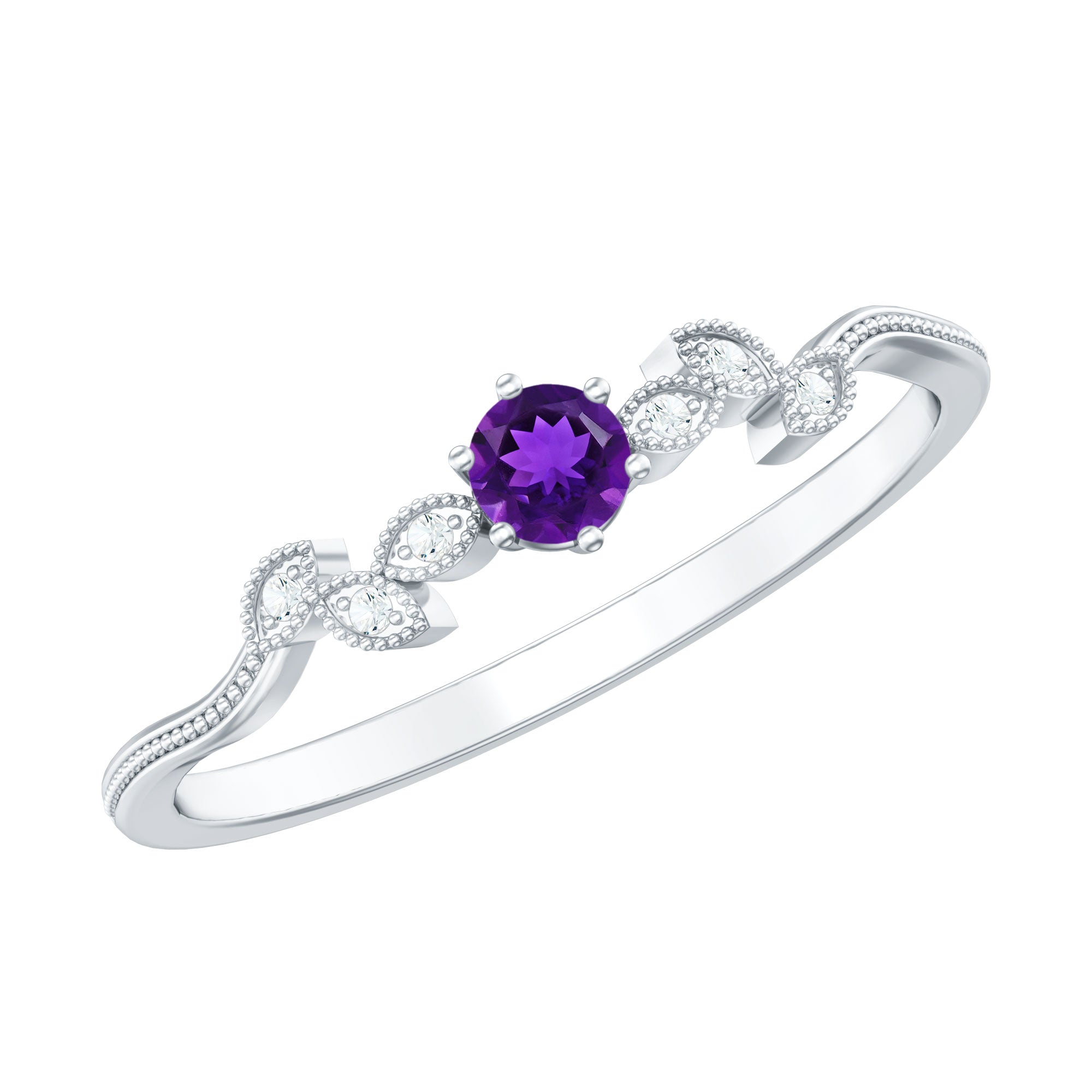 Amethyst as a center stone set in the filigree shank, cathedral, and miligrain shank is a vintage-inspired amethyst ring. Vintage style rings mix classic designs with modern technology, making them ideal for engagement and promises.
