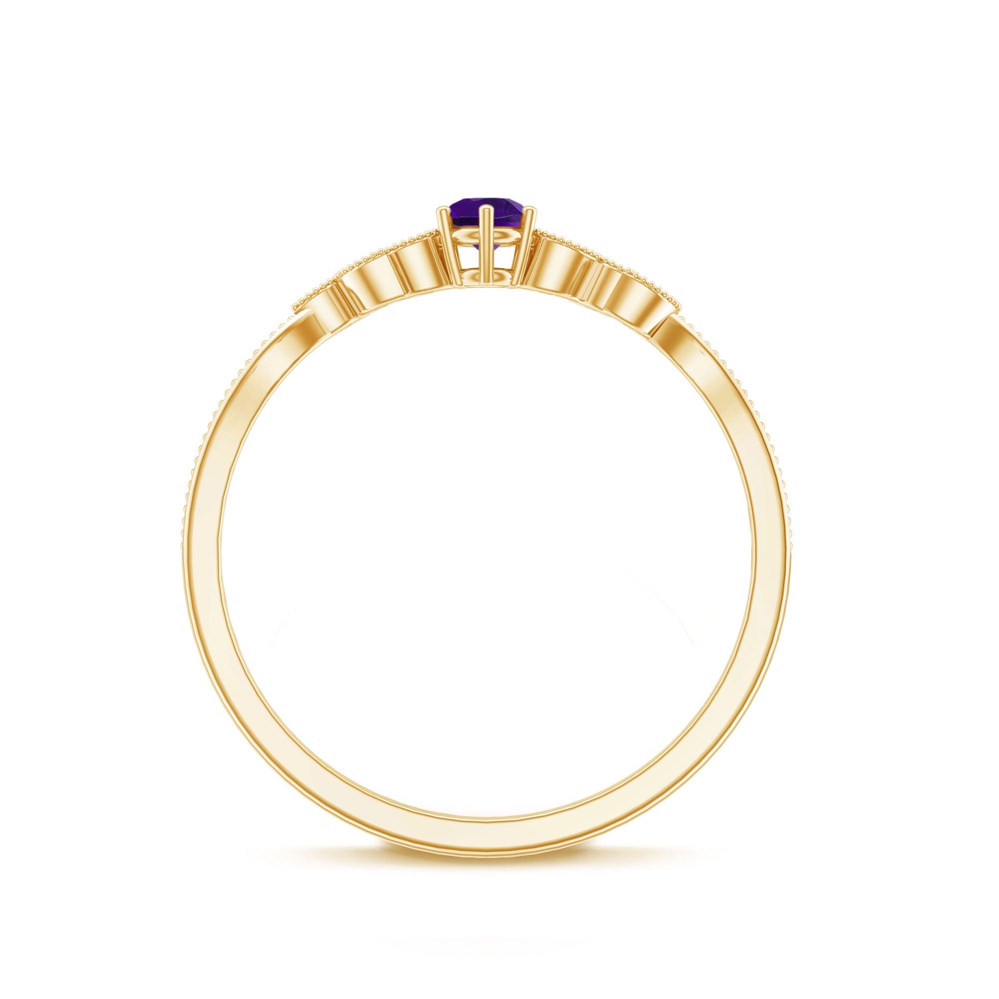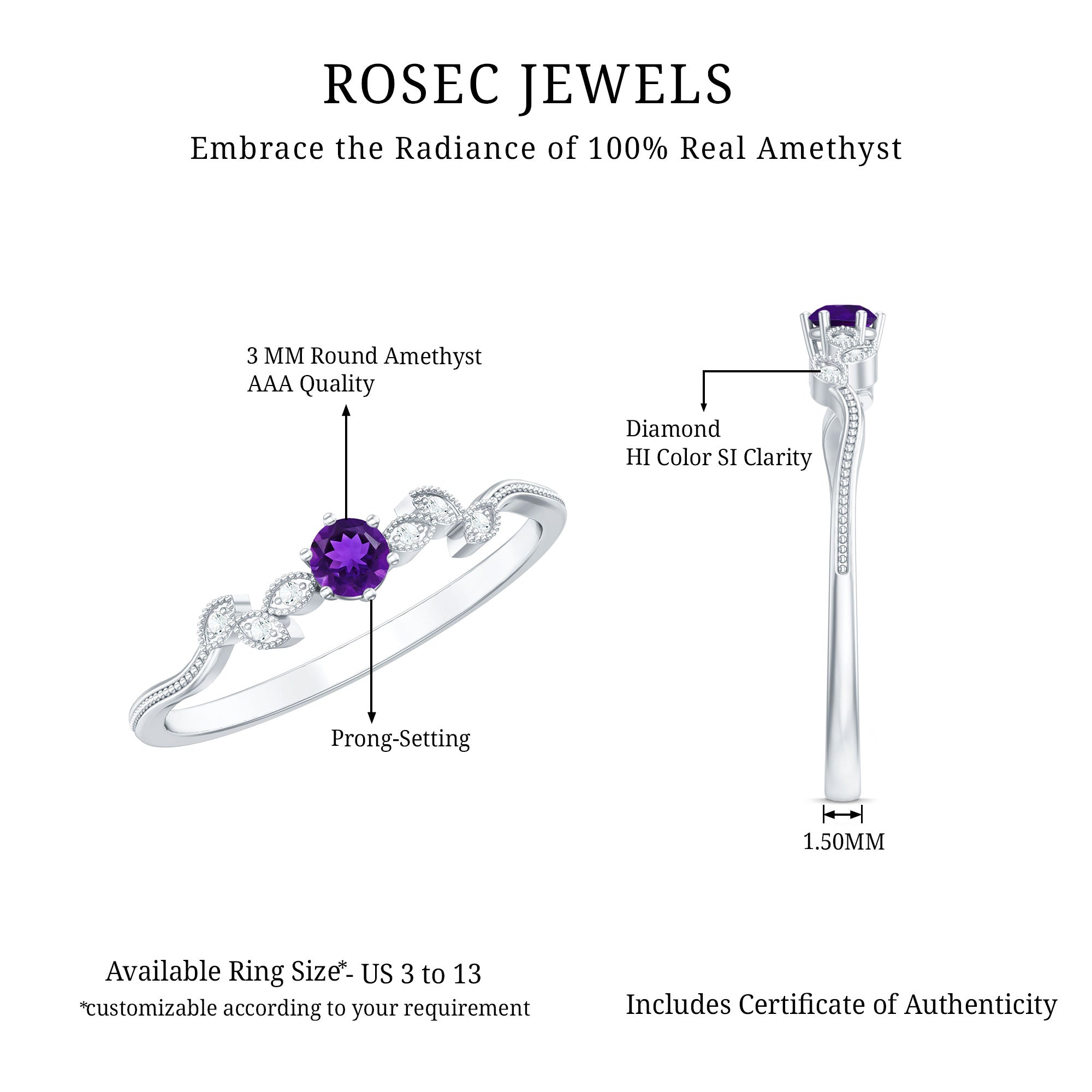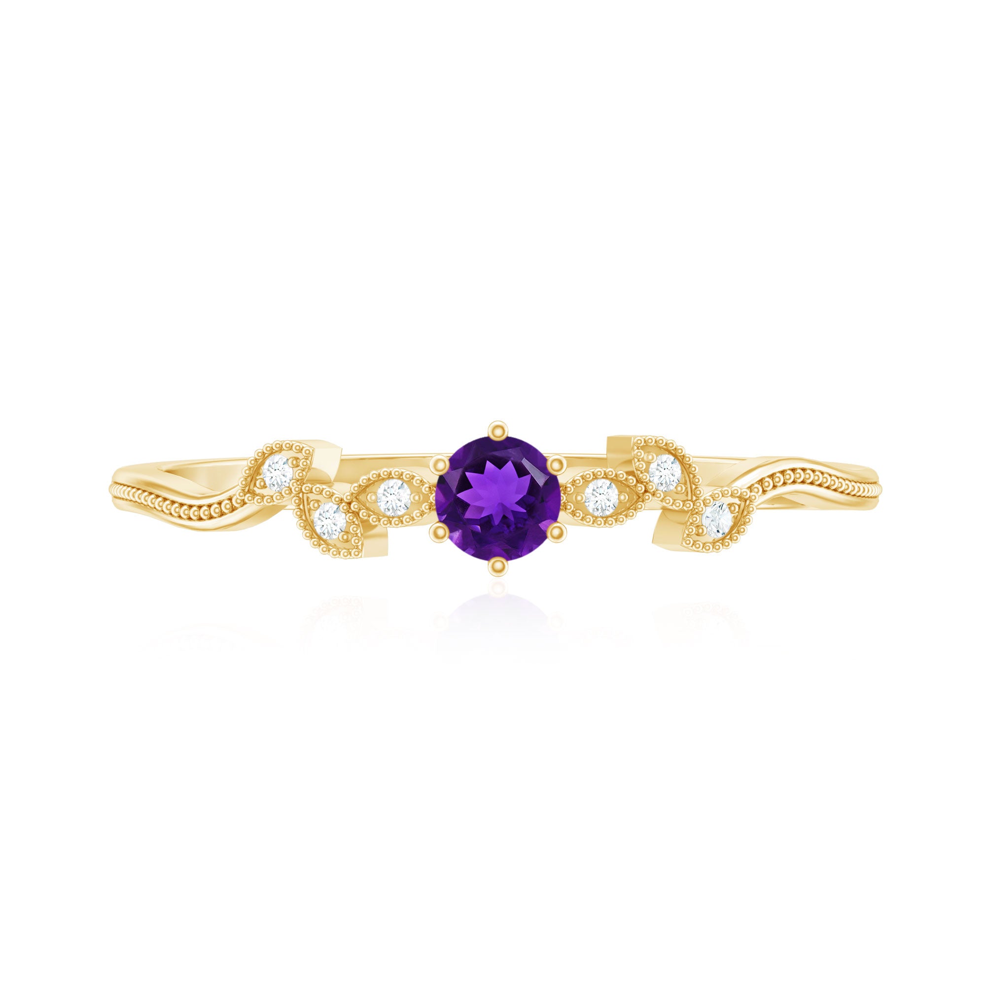 Amethyst as a center stone set in the filigree shank, cathedral, and miligrain shank is a vintage-inspired amethyst ring. Vintage style rings mix classic designs with modern technology, making them ideal for engagement and promises.