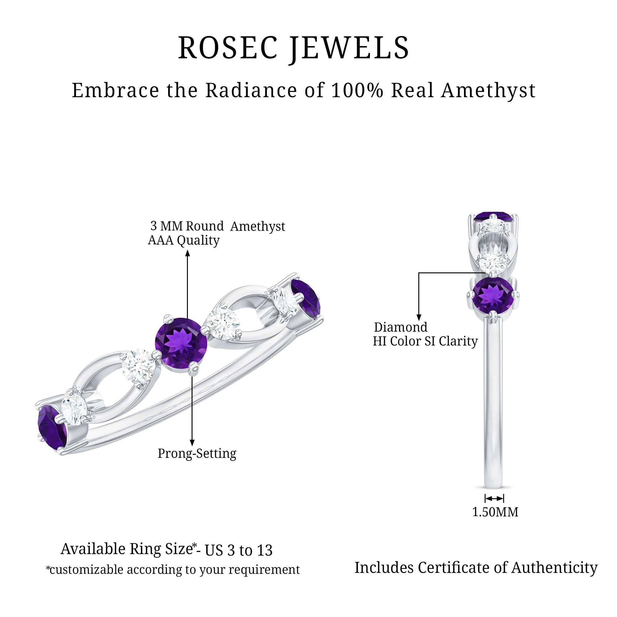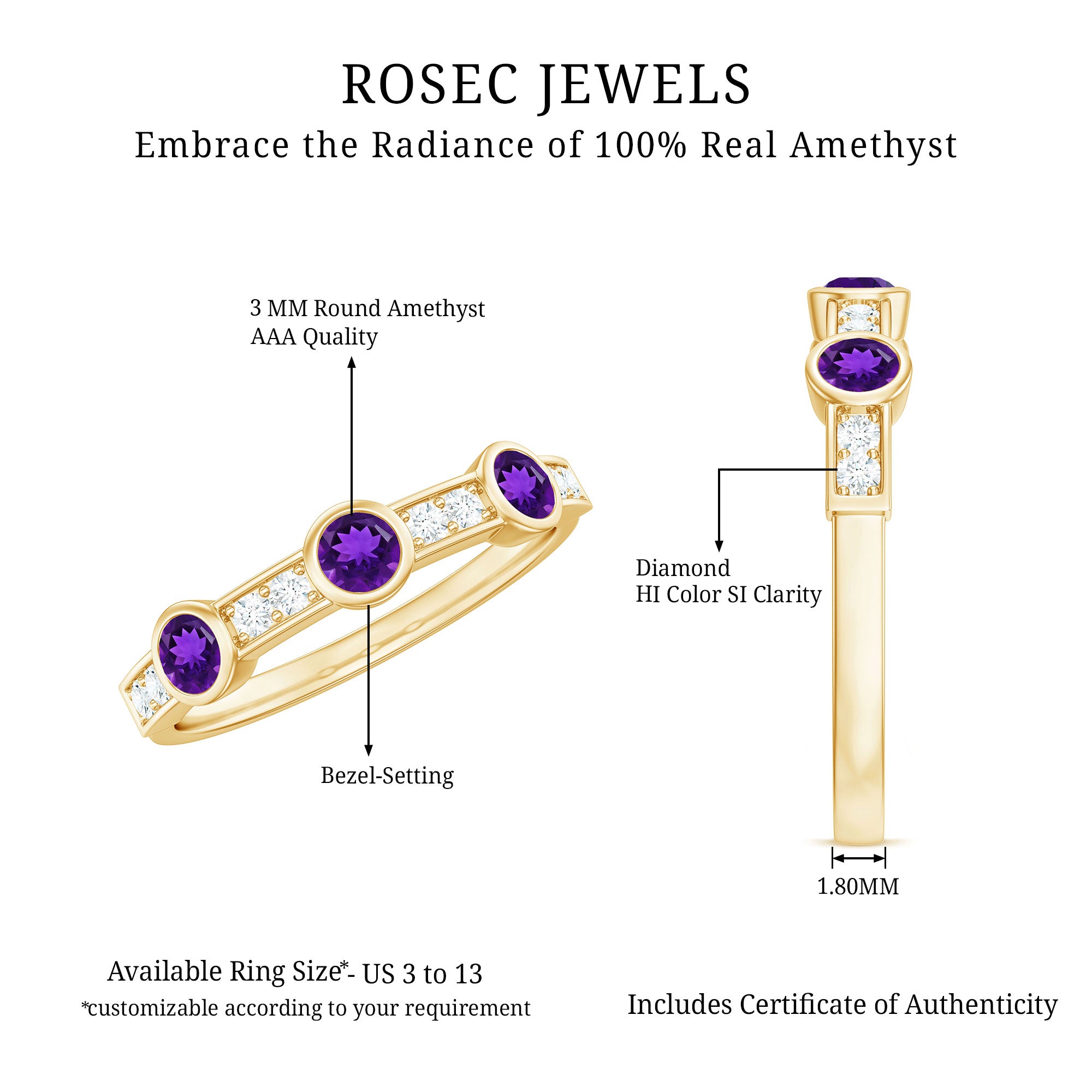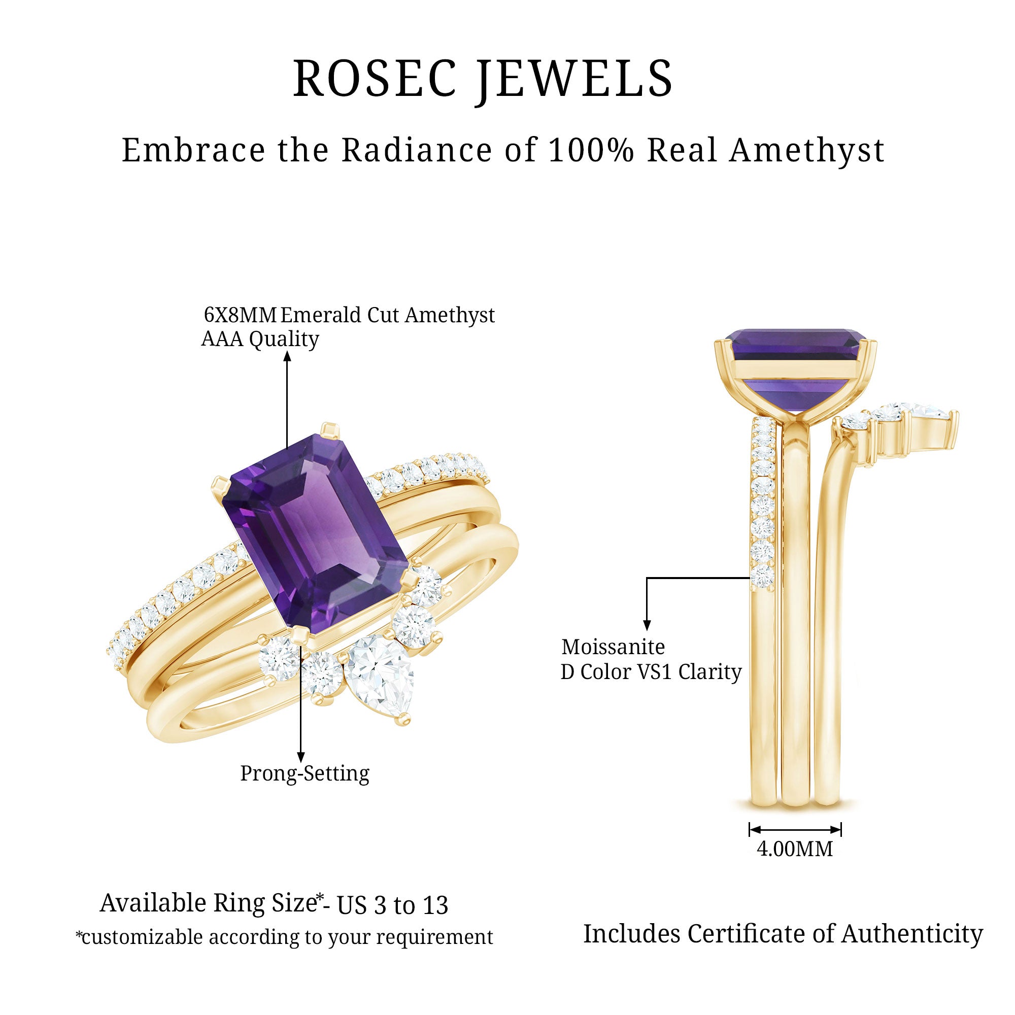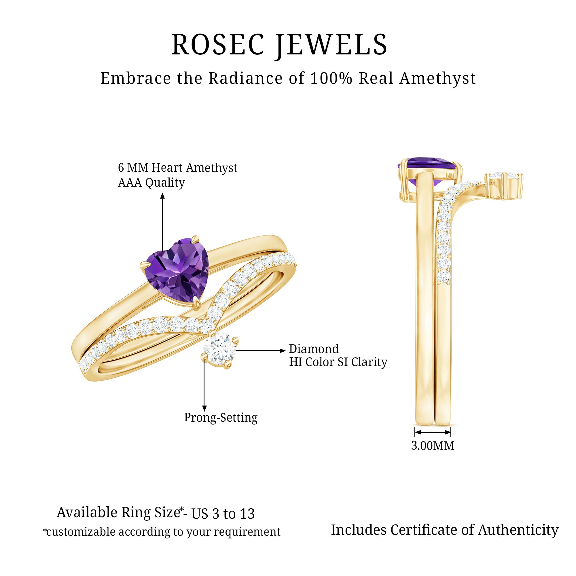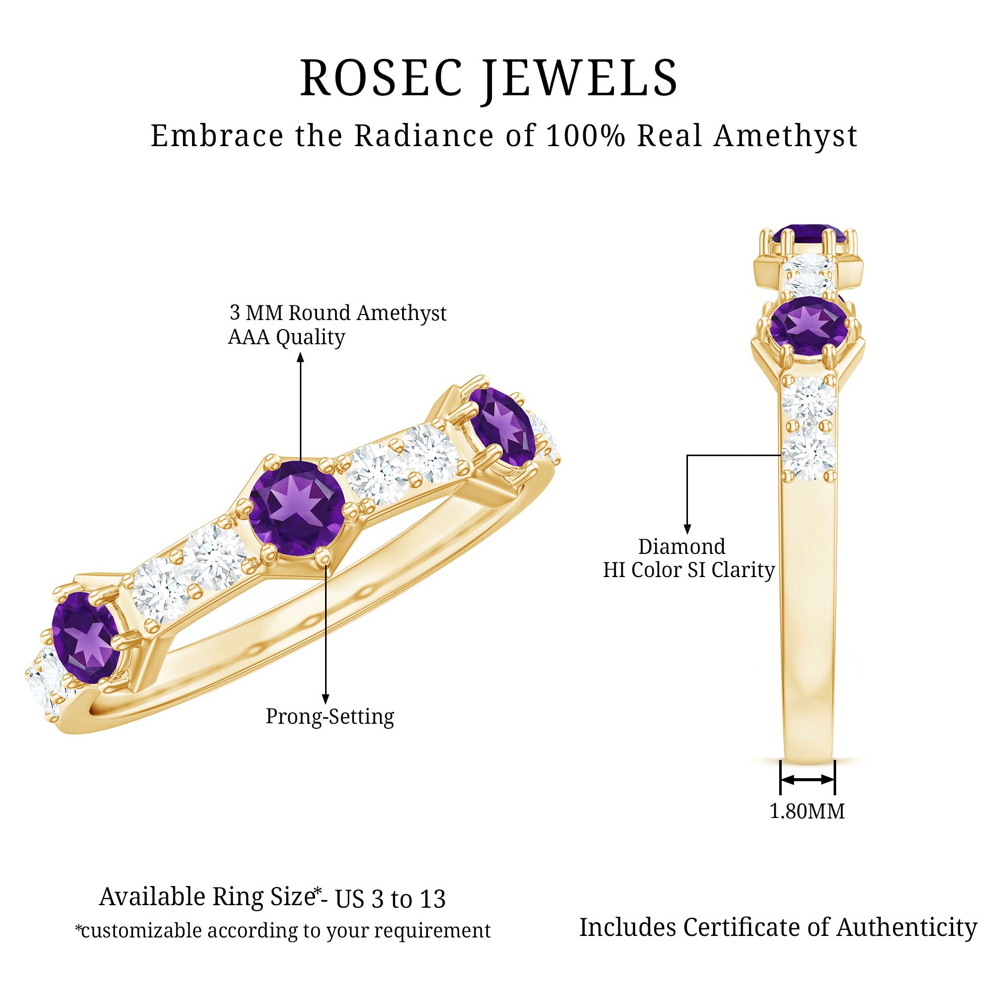 Rosec Jewels’ experienced team of gemologists and artisans are the backbone behind the fine artistic delicacies of our collection of wedding rings for women. After thorough examination of all the quality factors, an amethyst finds it way to wedding rings. An exotic range of amethyst rings for wedding by different combinations of gemstone shapes, gemstone settings and gold embellishments comes handy.