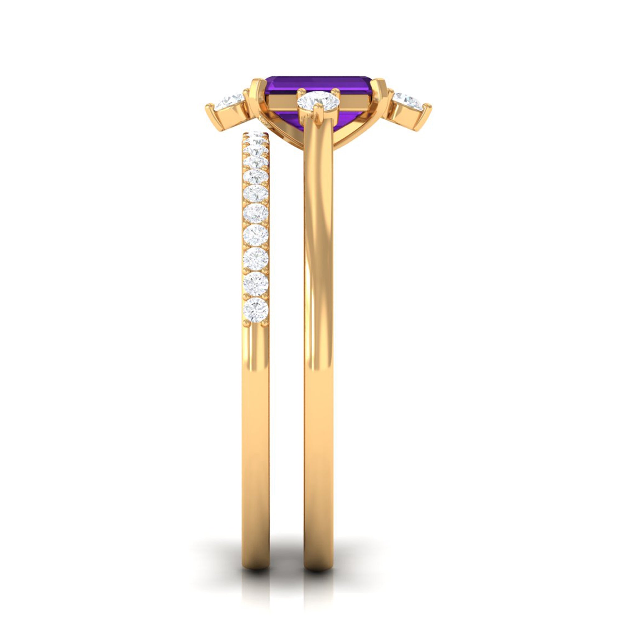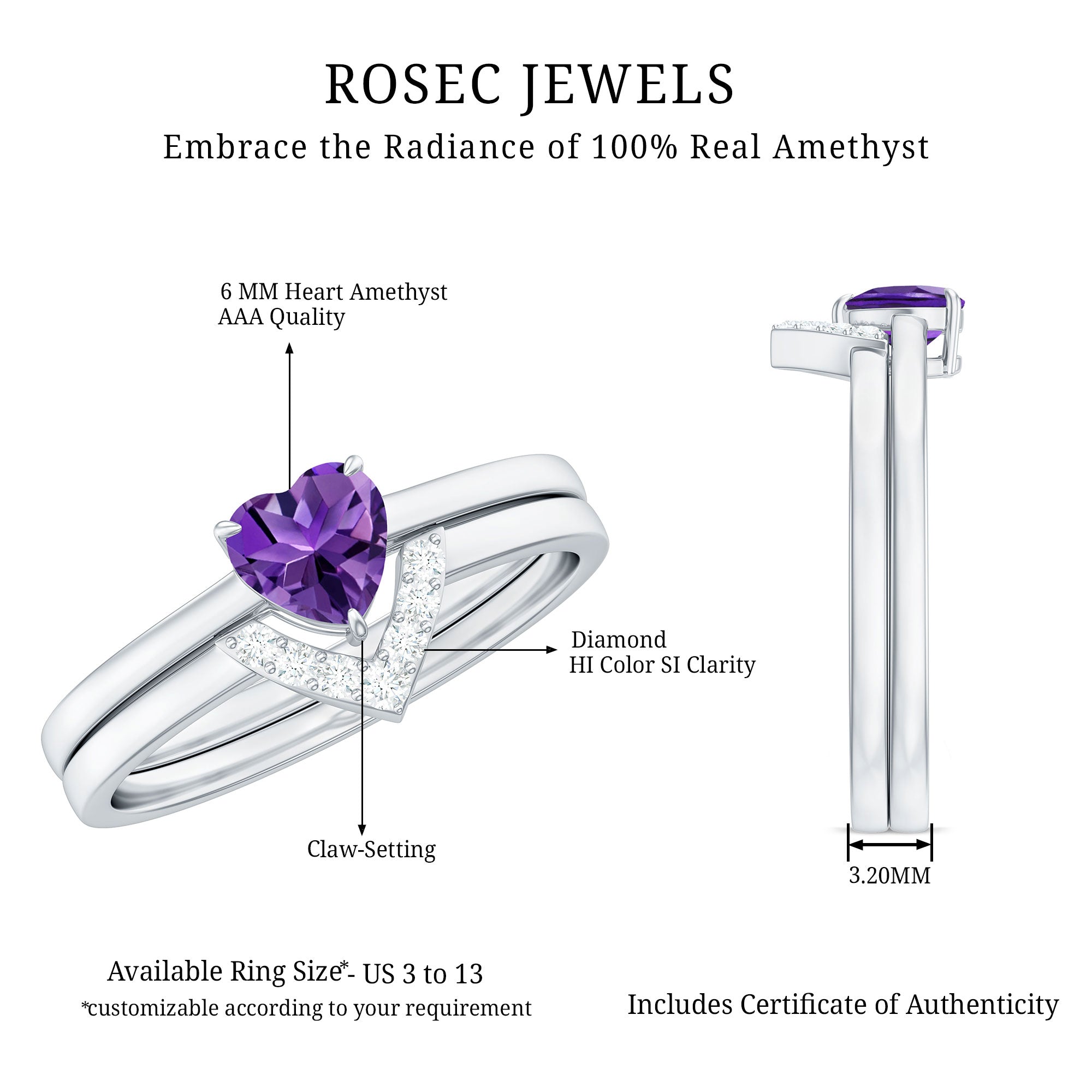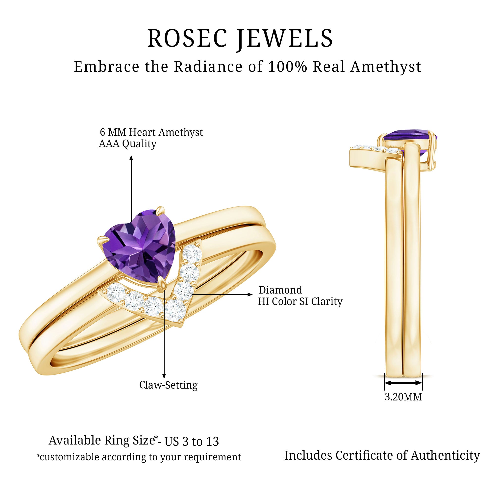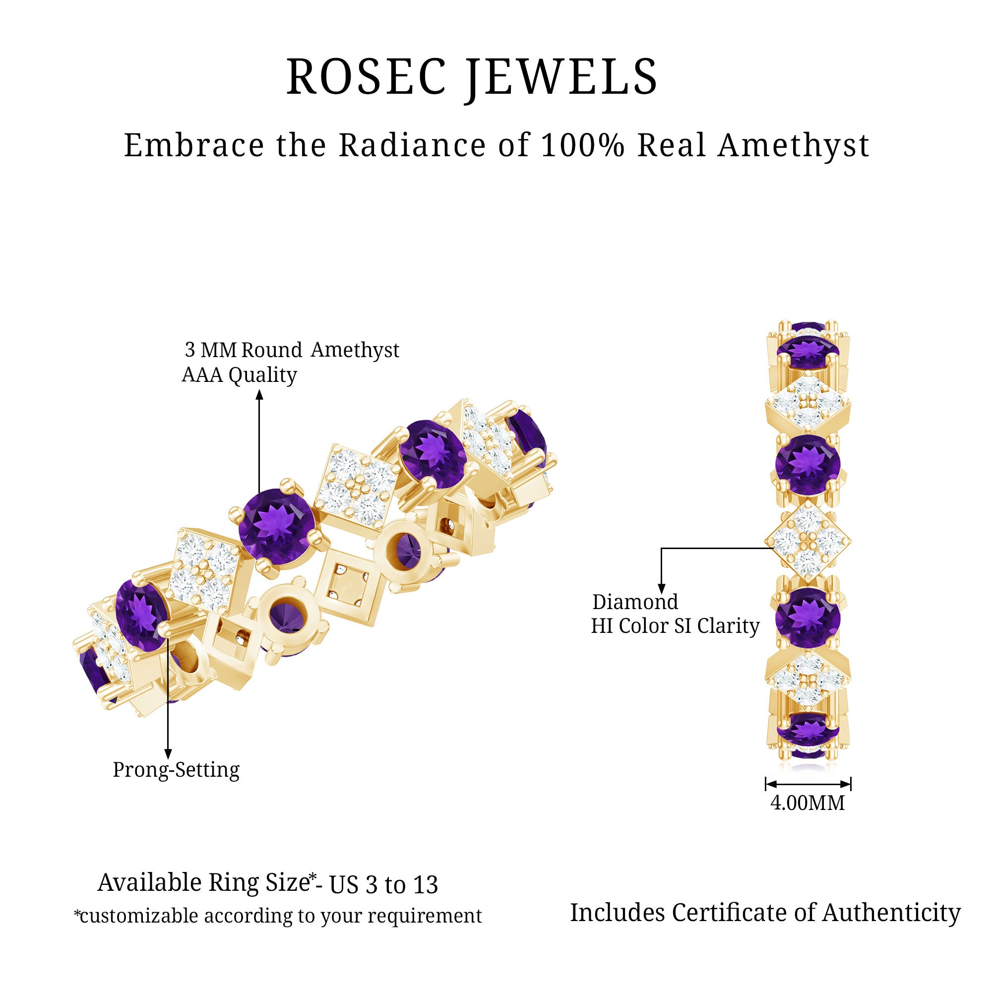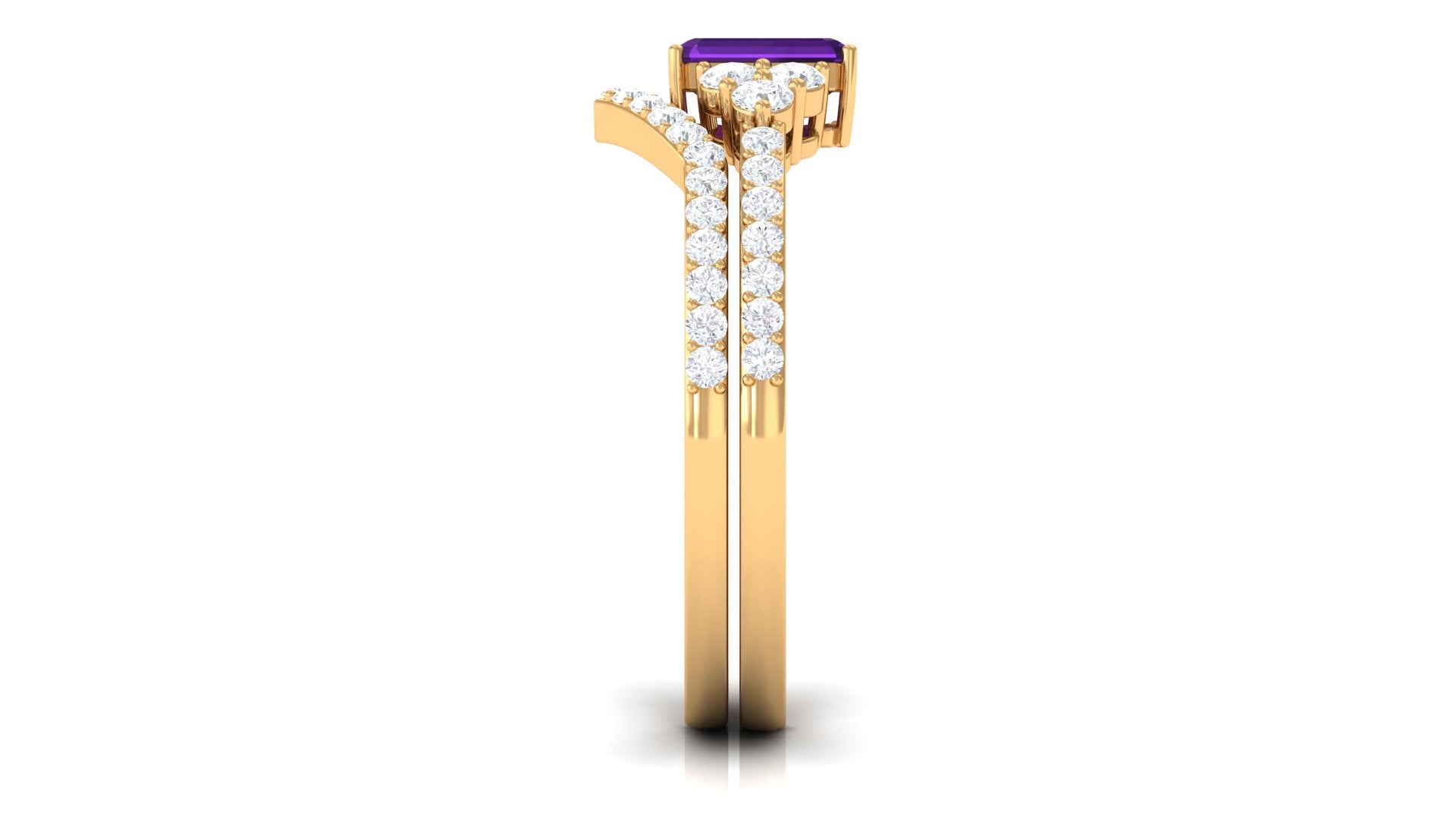 Rosec Jewels’ experienced team of gemologists and artisans are the backbone behind the fine artistic delicacies of our collection of wedding rings for women. After thorough examination of all the quality factors, an amethyst finds it way to wedding rings. An exotic range of amethyst rings for wedding by different combinations of gemstone shapes, gemstone settings and gold embellishments comes handy.
