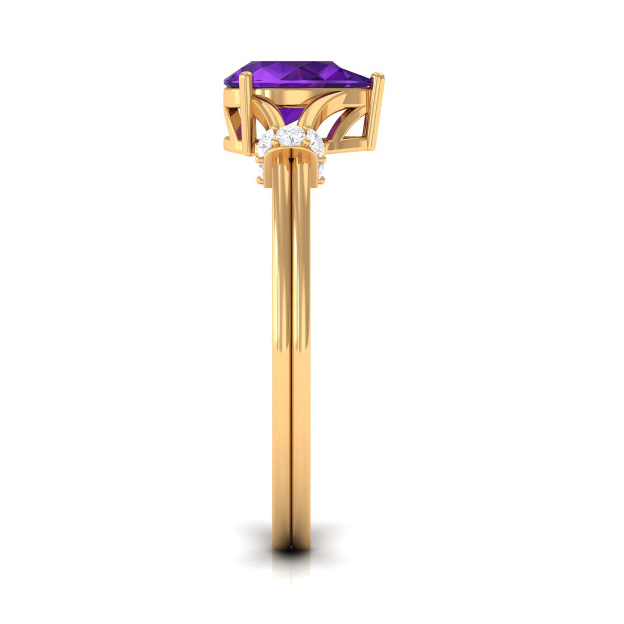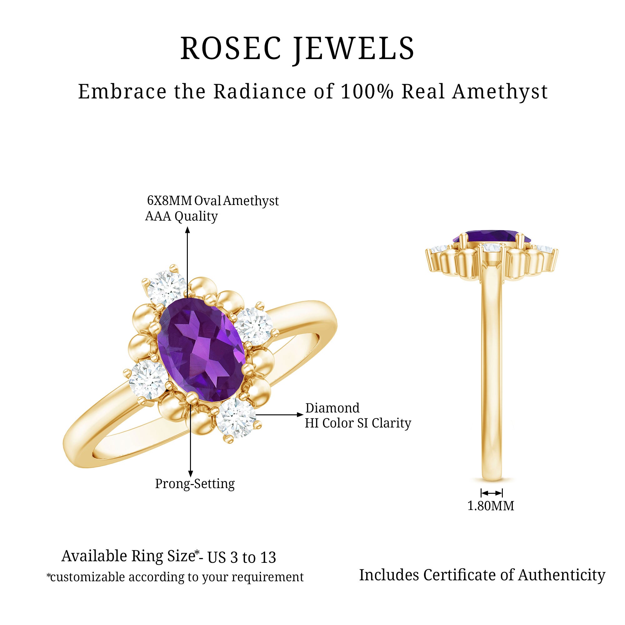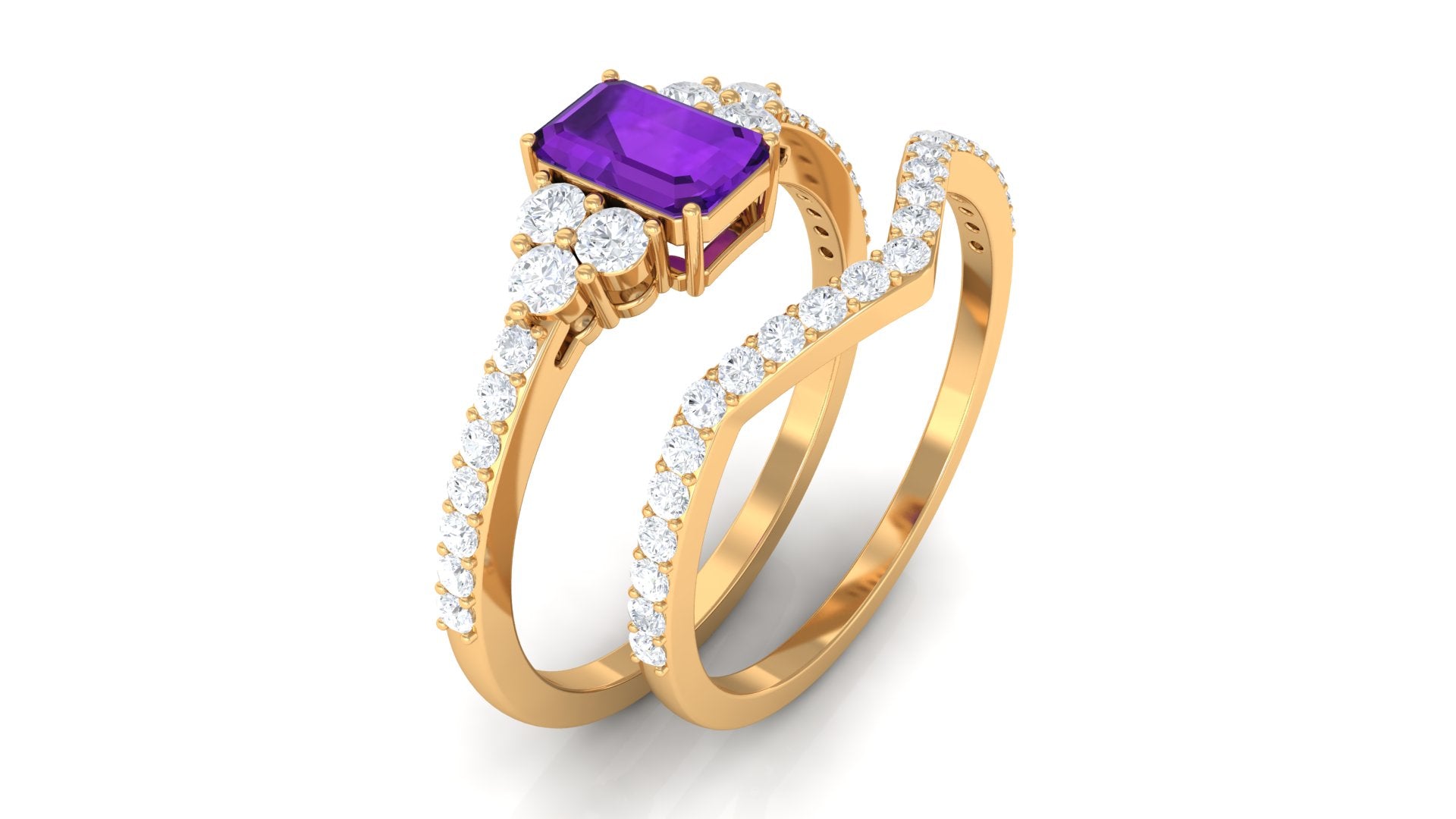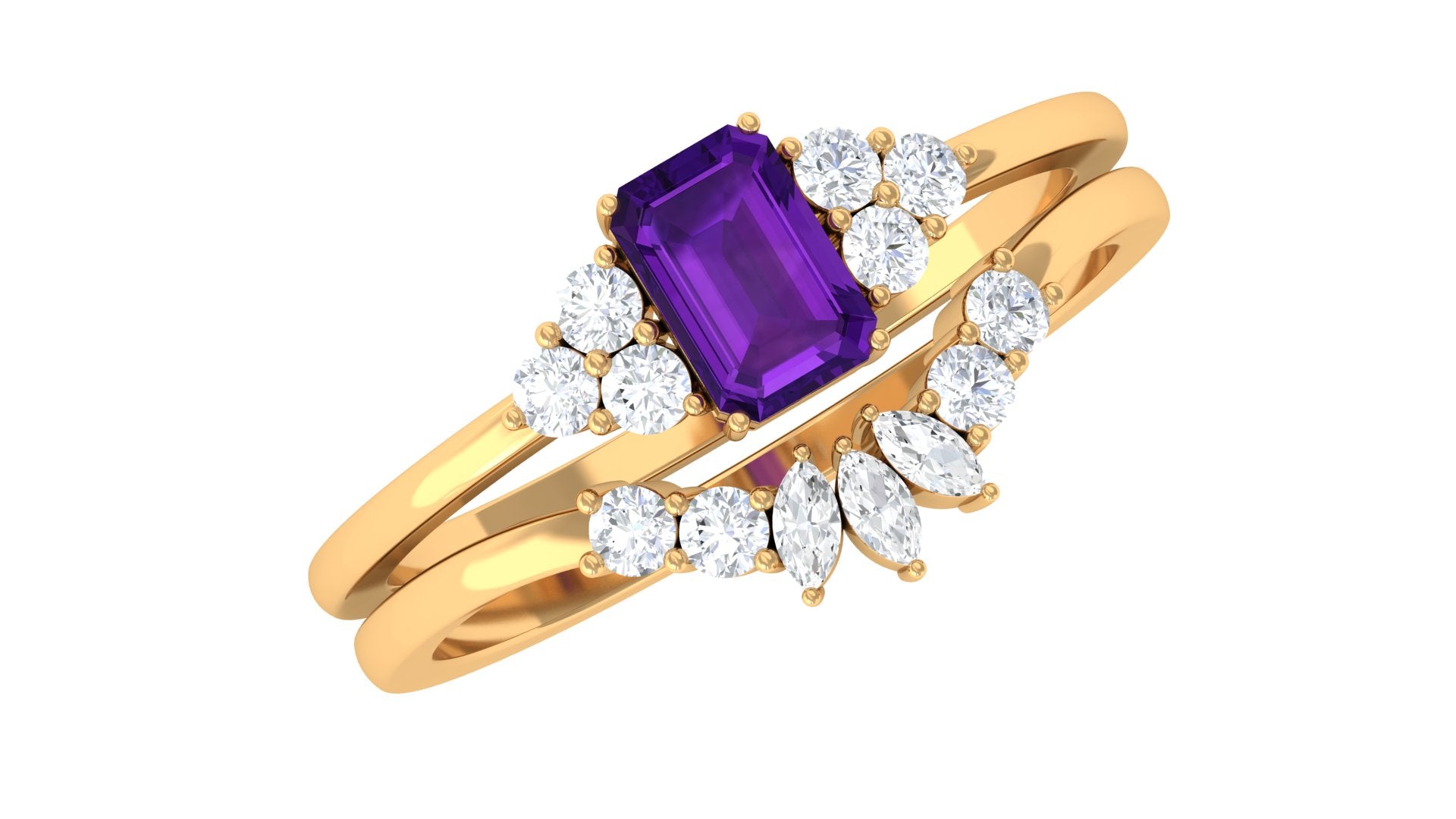 Rosec Jewels’ experienced team of gemologists and artisans are the backbone behind the fine artistic delicacies of our collection of wedding rings for women. After thorough examination of all the quality factors, an amethyst finds it way to wedding rings. An exotic range of amethyst rings for wedding by different combinations of gemstone shapes, gemstone settings and gold embellishments comes handy.