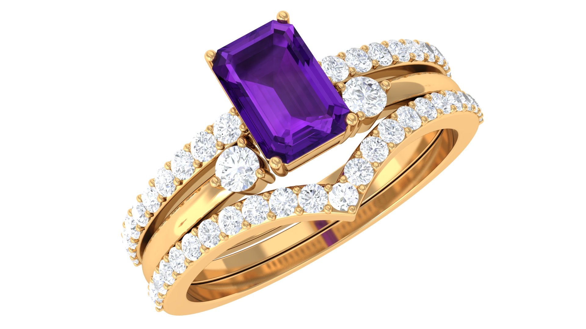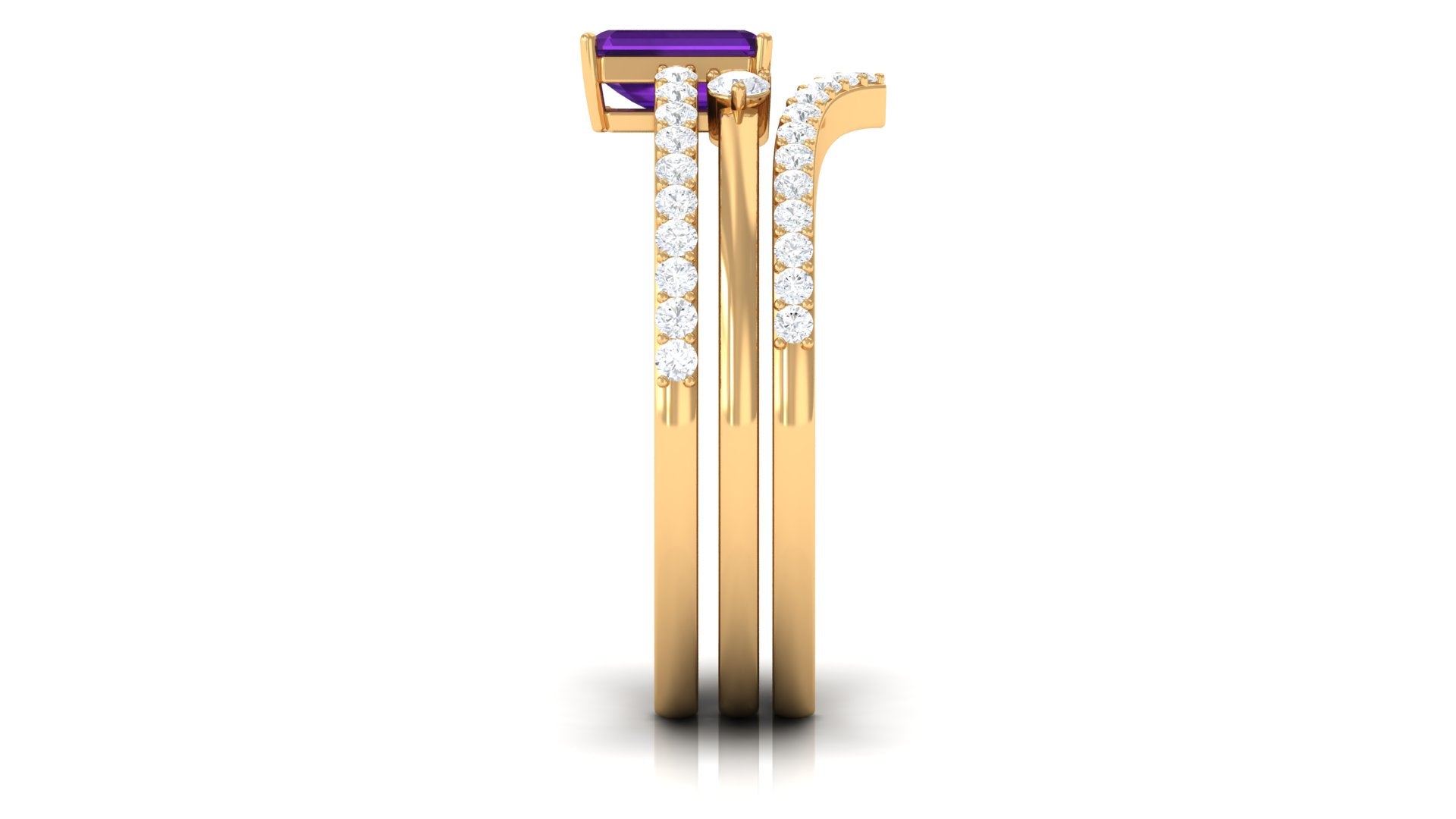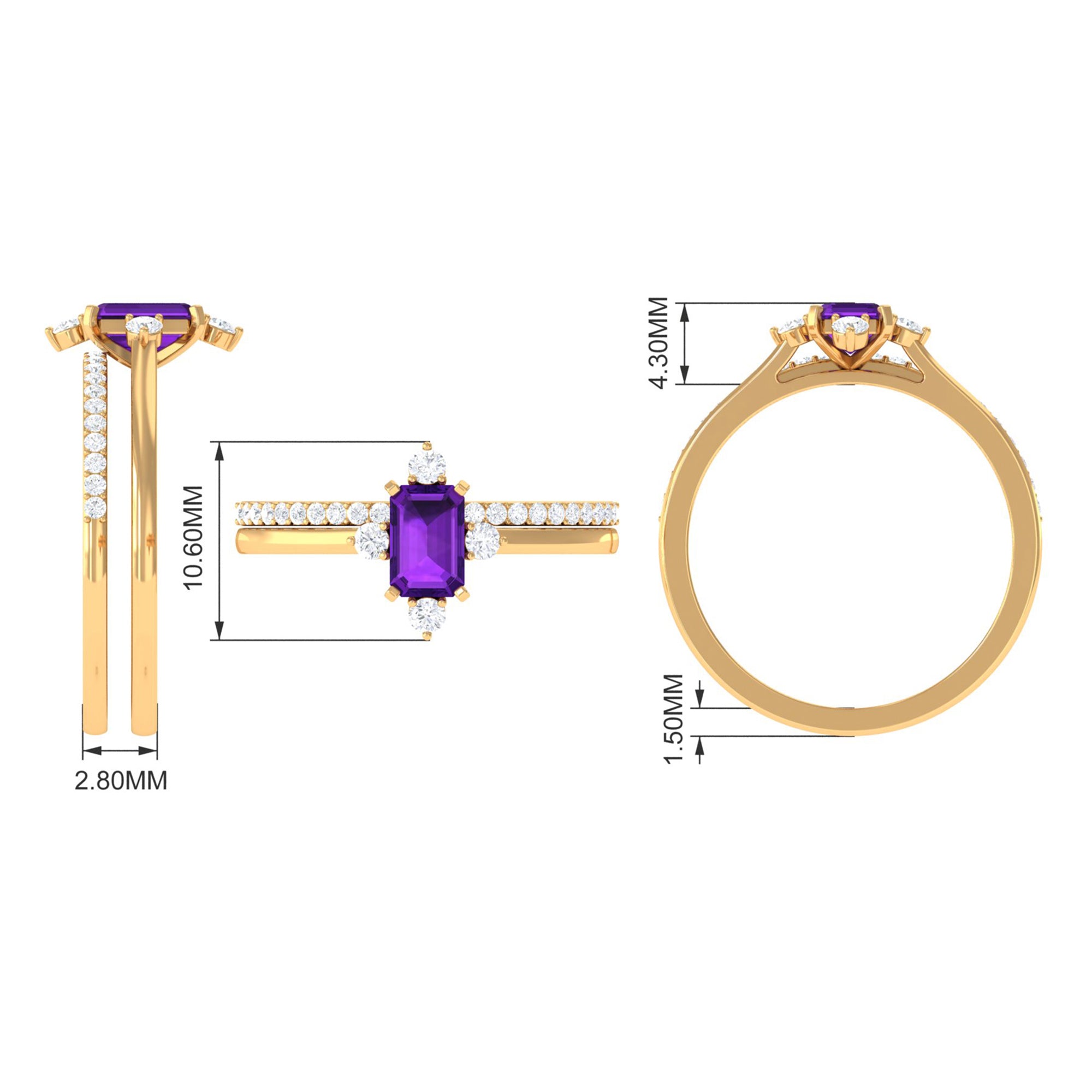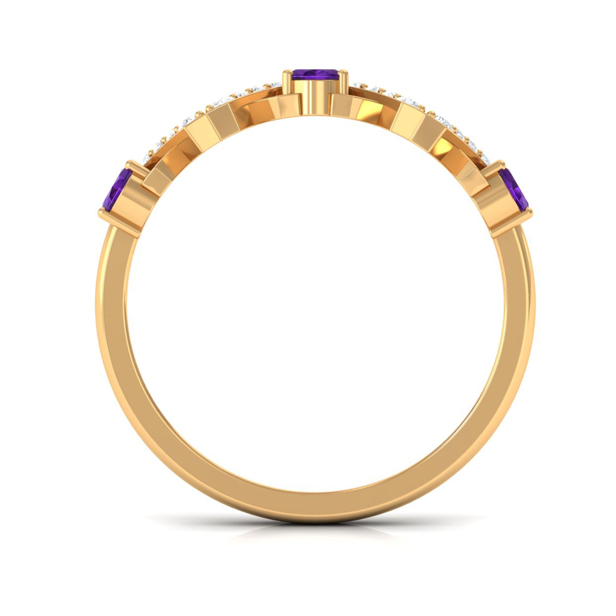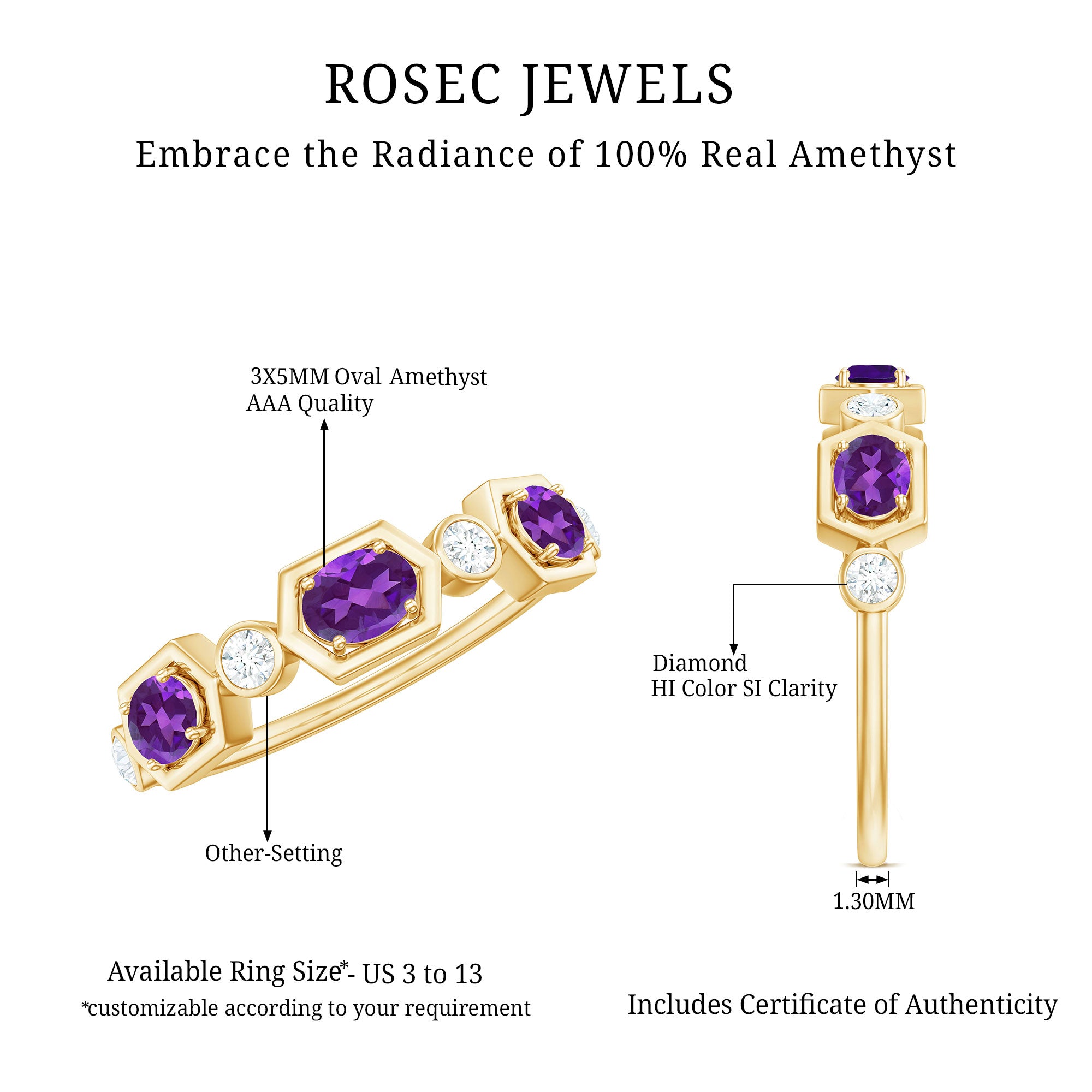 Rosec Jewels’ experienced team of gemologists and artisans are the backbone behind the fine artistic delicacies of our collection of wedding rings for women. After thorough examination of all the quality factors, an amethyst finds it way to wedding rings. An exotic range of amethyst rings for wedding by different combinations of gemstone shapes, gemstone settings and gold embellishments comes handy.