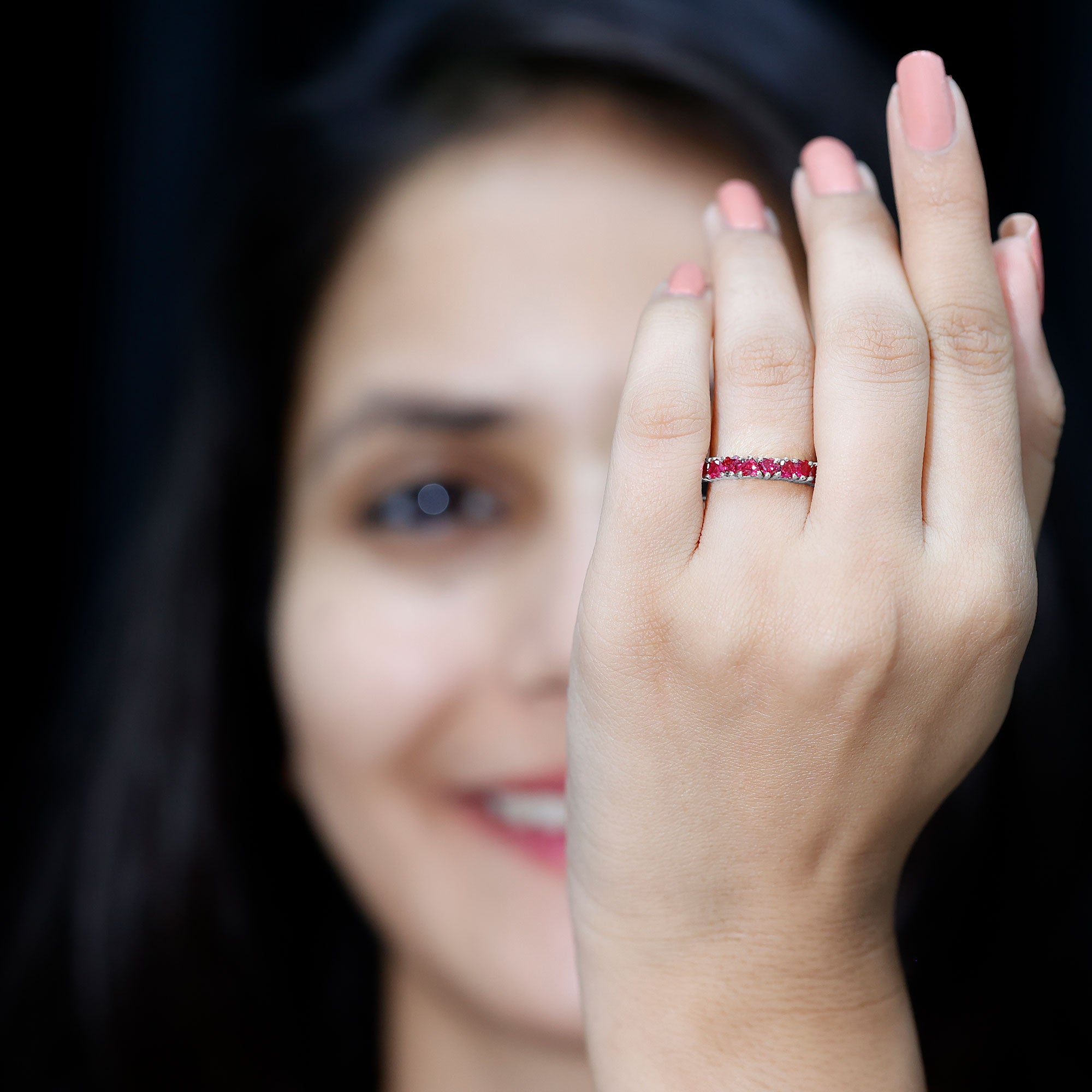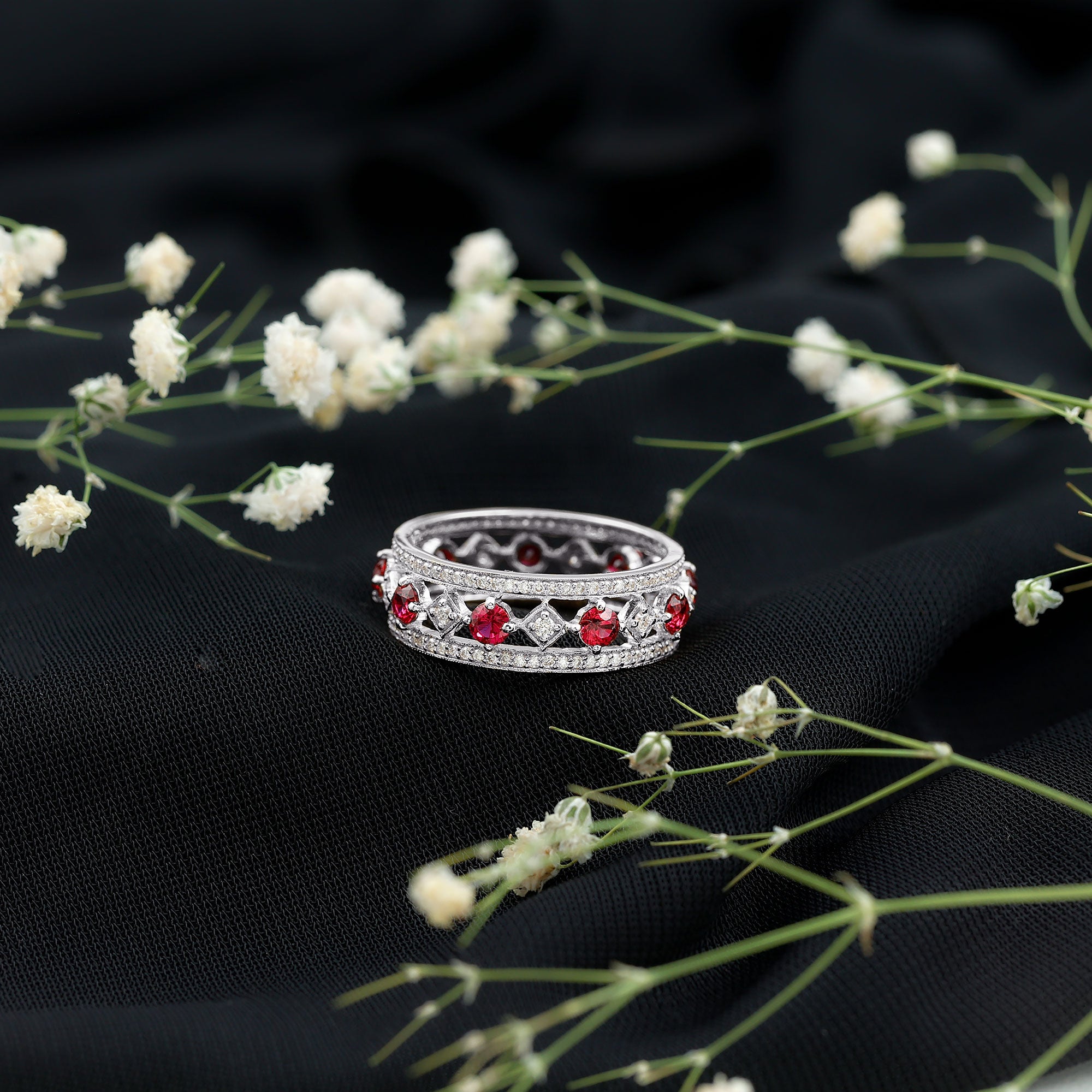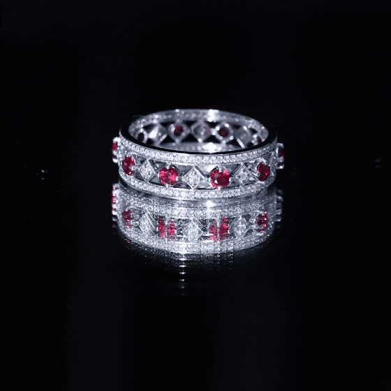 Almost all shining and colored gemstones, whether natural or lab-grown can be used in designing anniversary bands for her. Diamonds, moissanites, sapphires, rubies, emeralds, amethysts, pearls, garnets, topaz and more with different symbolic meanings are some of the popular choices for anniversary rings.