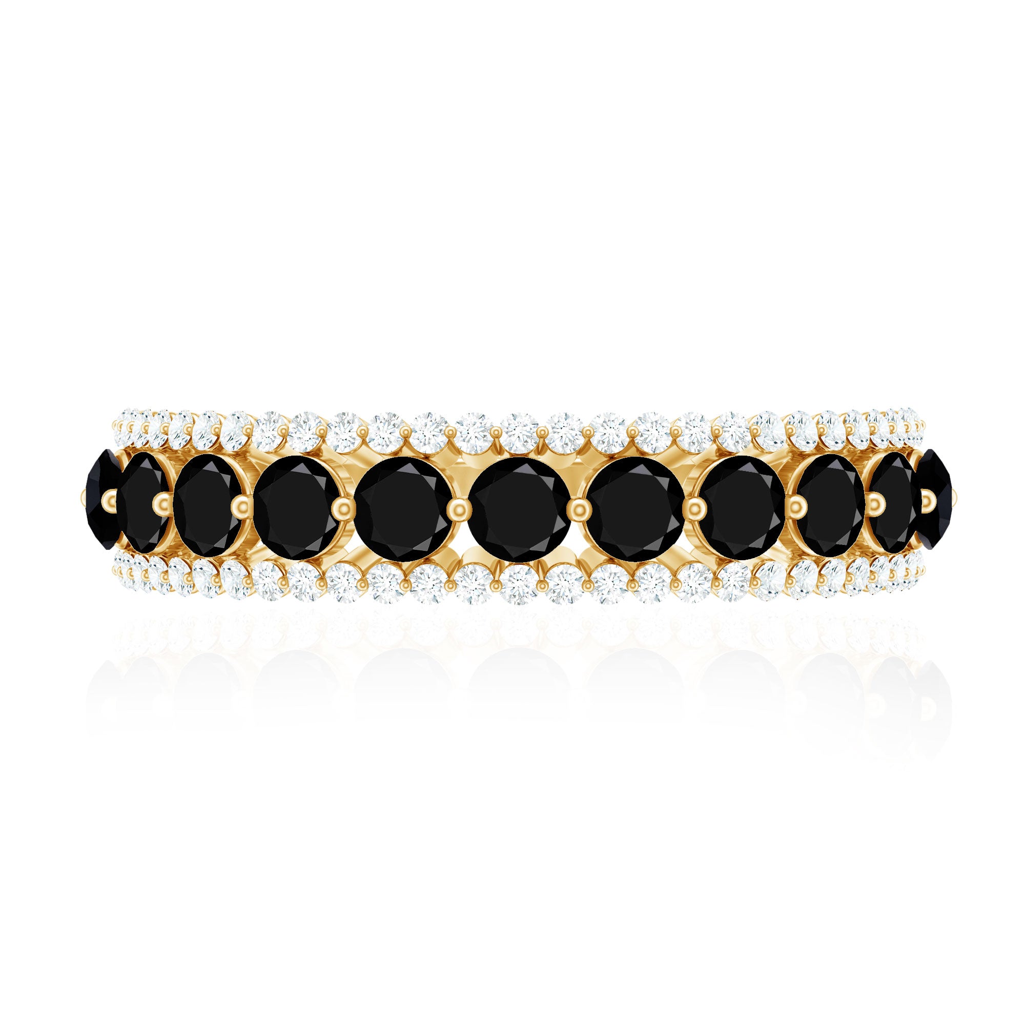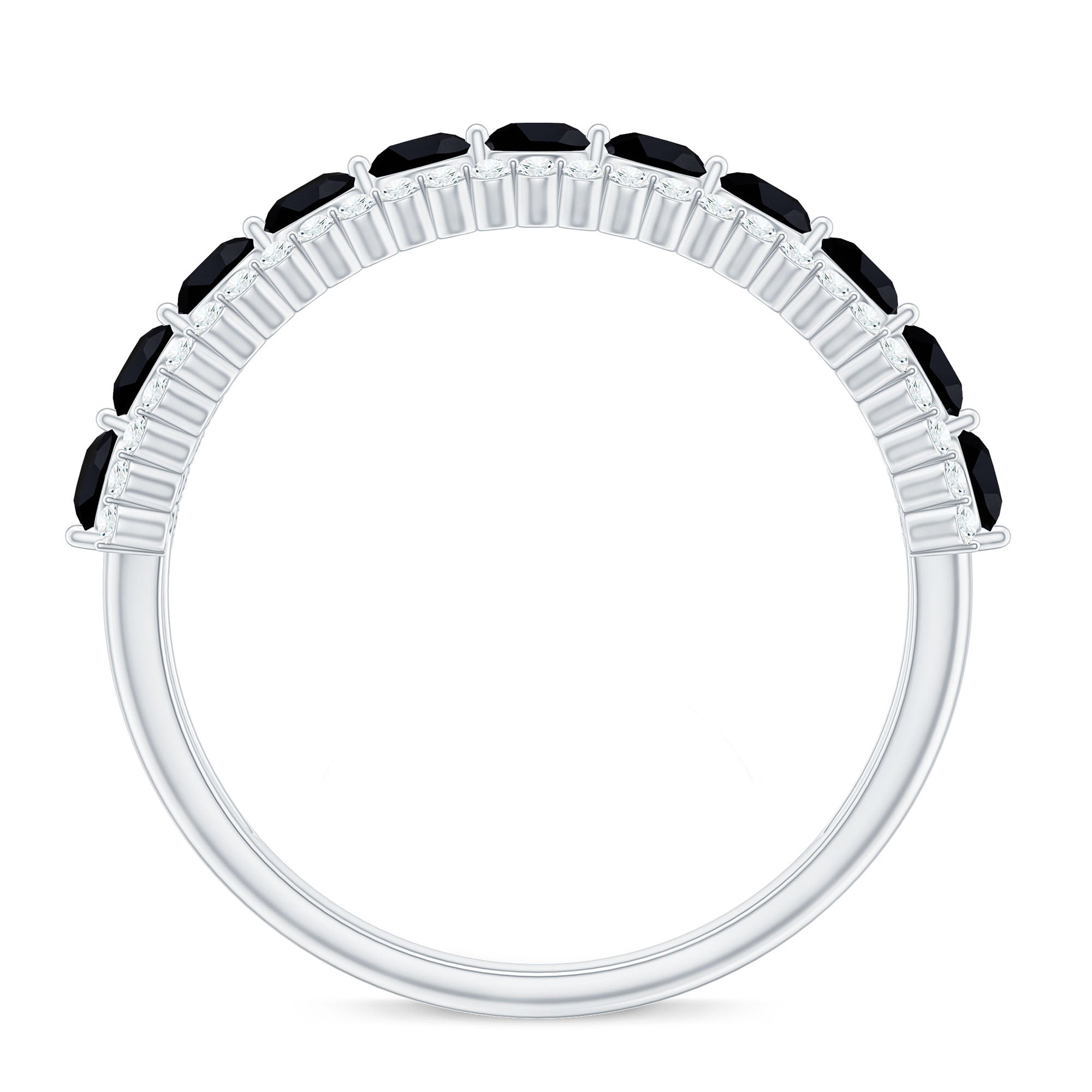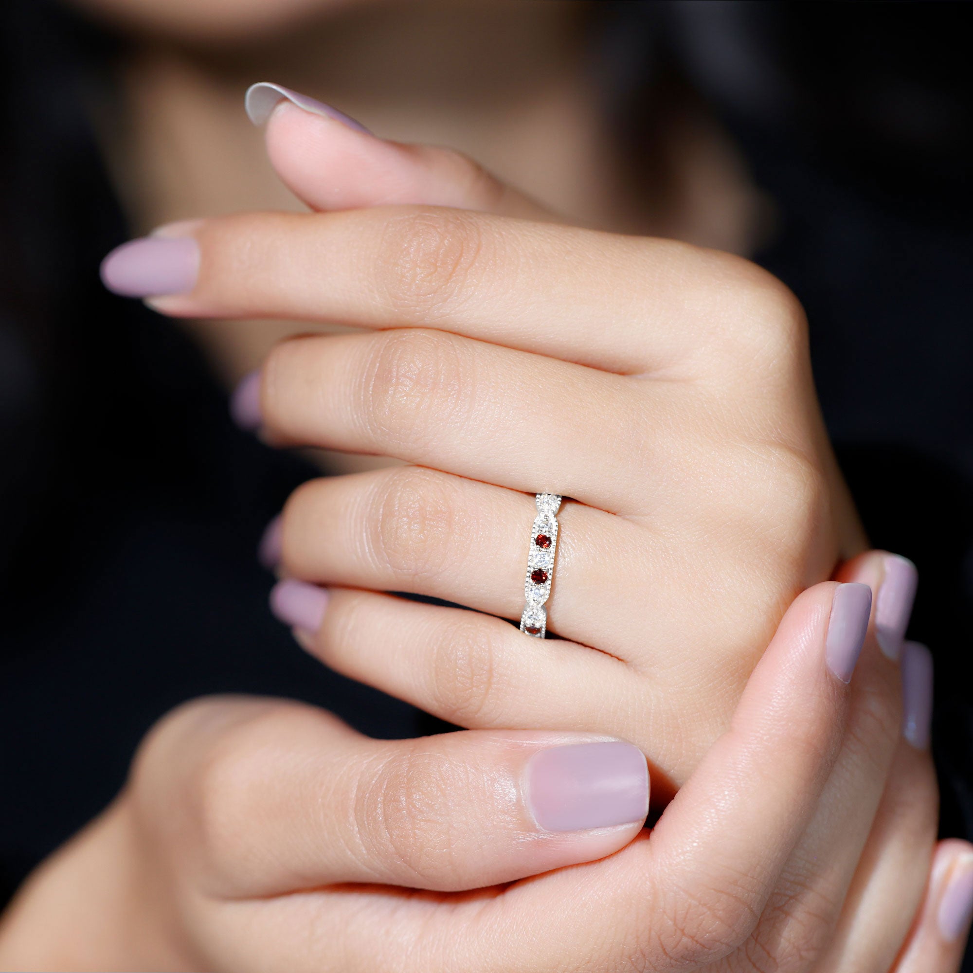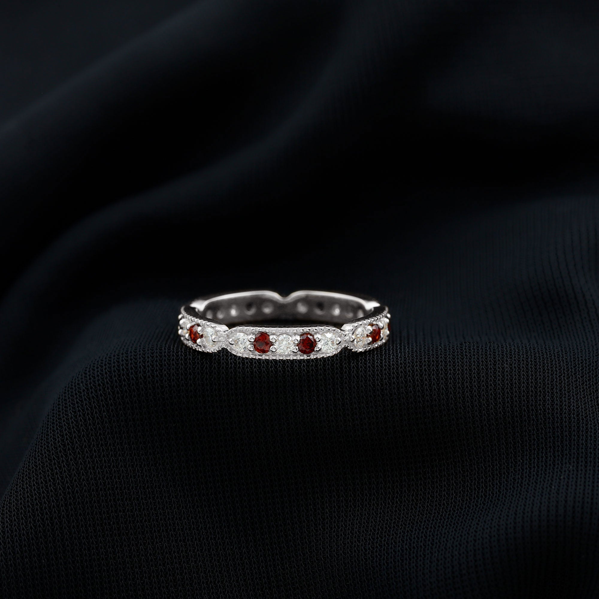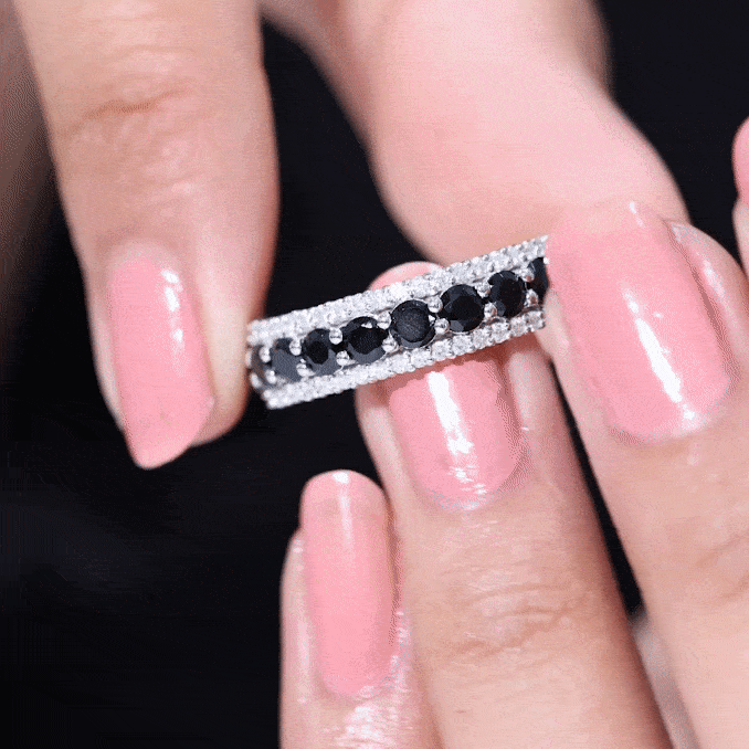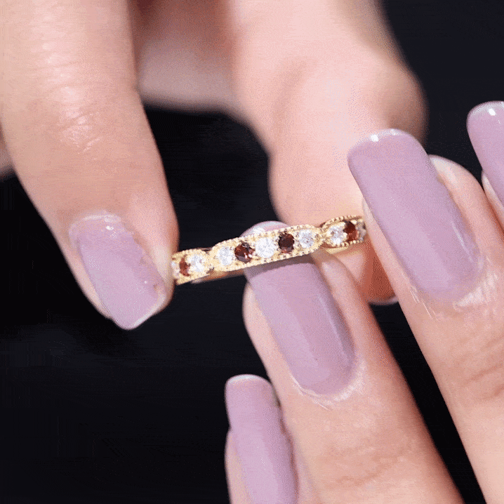 Almost all shining and colored gemstones, whether natural or lab-grown can be used in designing anniversary bands for her. Diamonds, moissanites, sapphires, rubies, emeralds, amethysts, pearls, garnets, topaz and more with different symbolic meanings are some of the popular choices for anniversary rings.