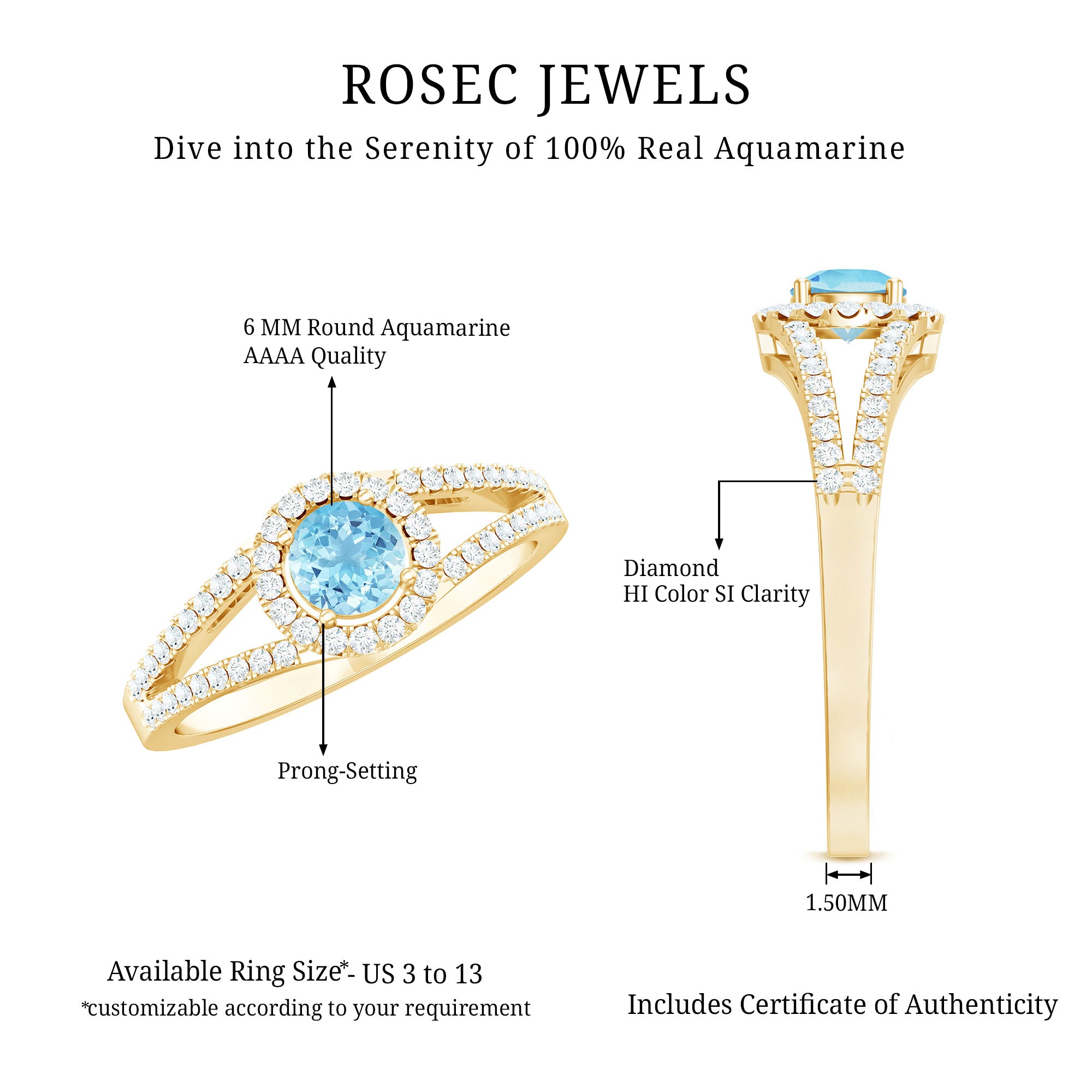 Aquamarine looks stunning in white gold for a crisp contrast, while yellow and rose gold add warmth and vintage charm. Protective settings such as halos, bezels, and secure prongs help safeguard the gemstone and enhance brilliance for daily wear.