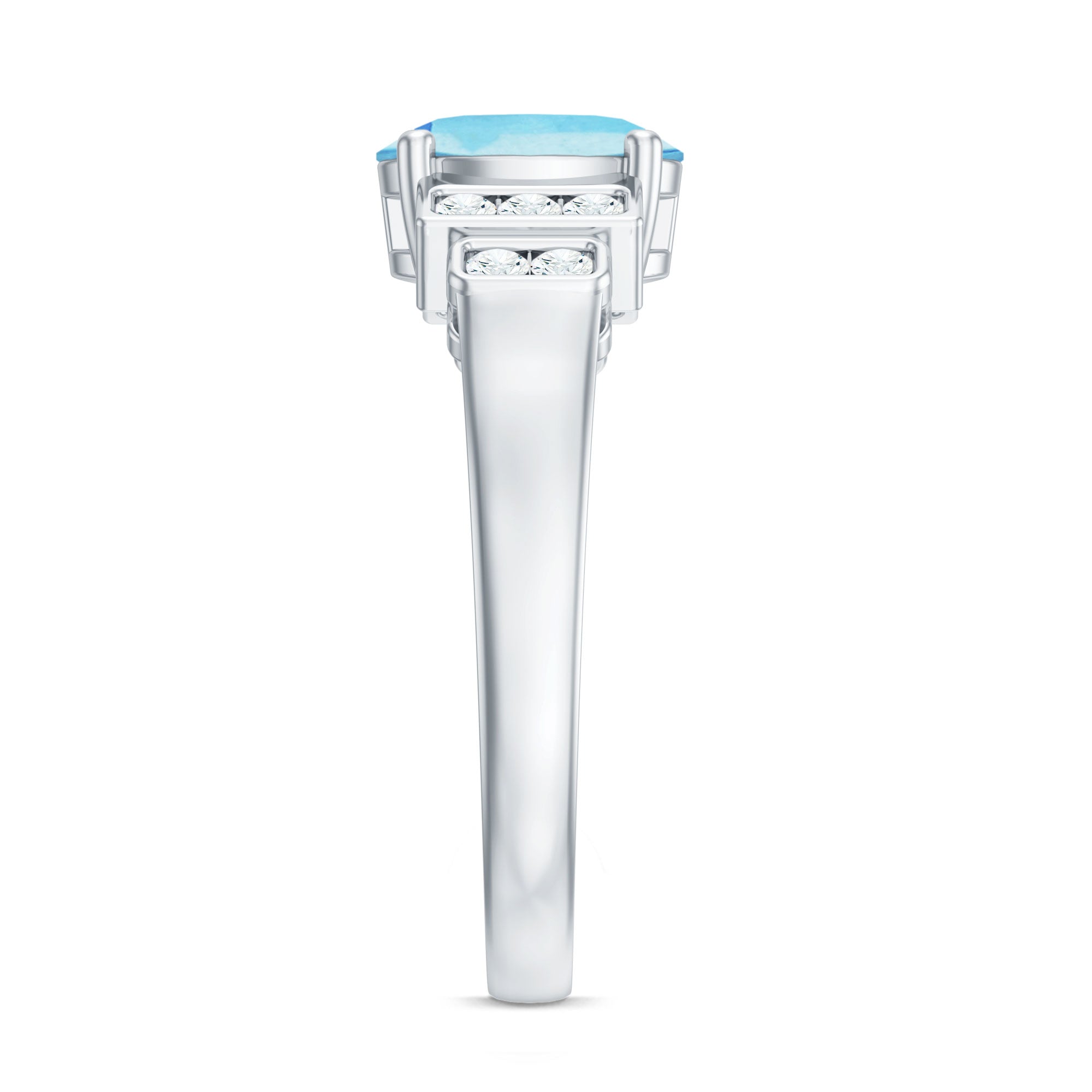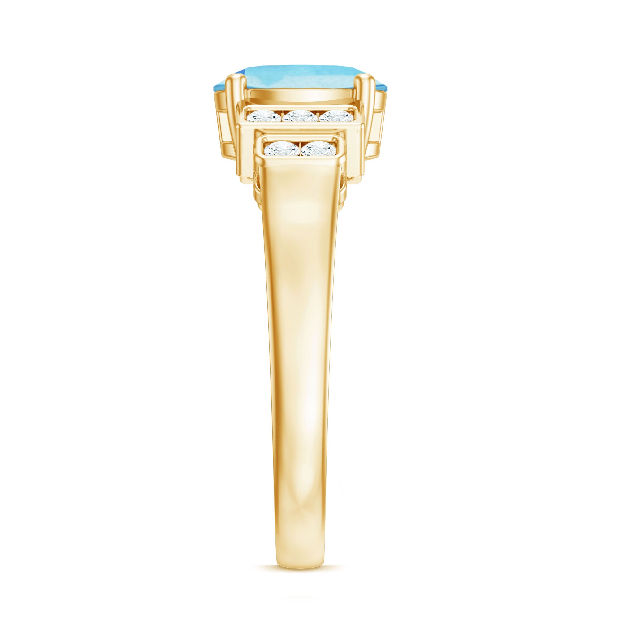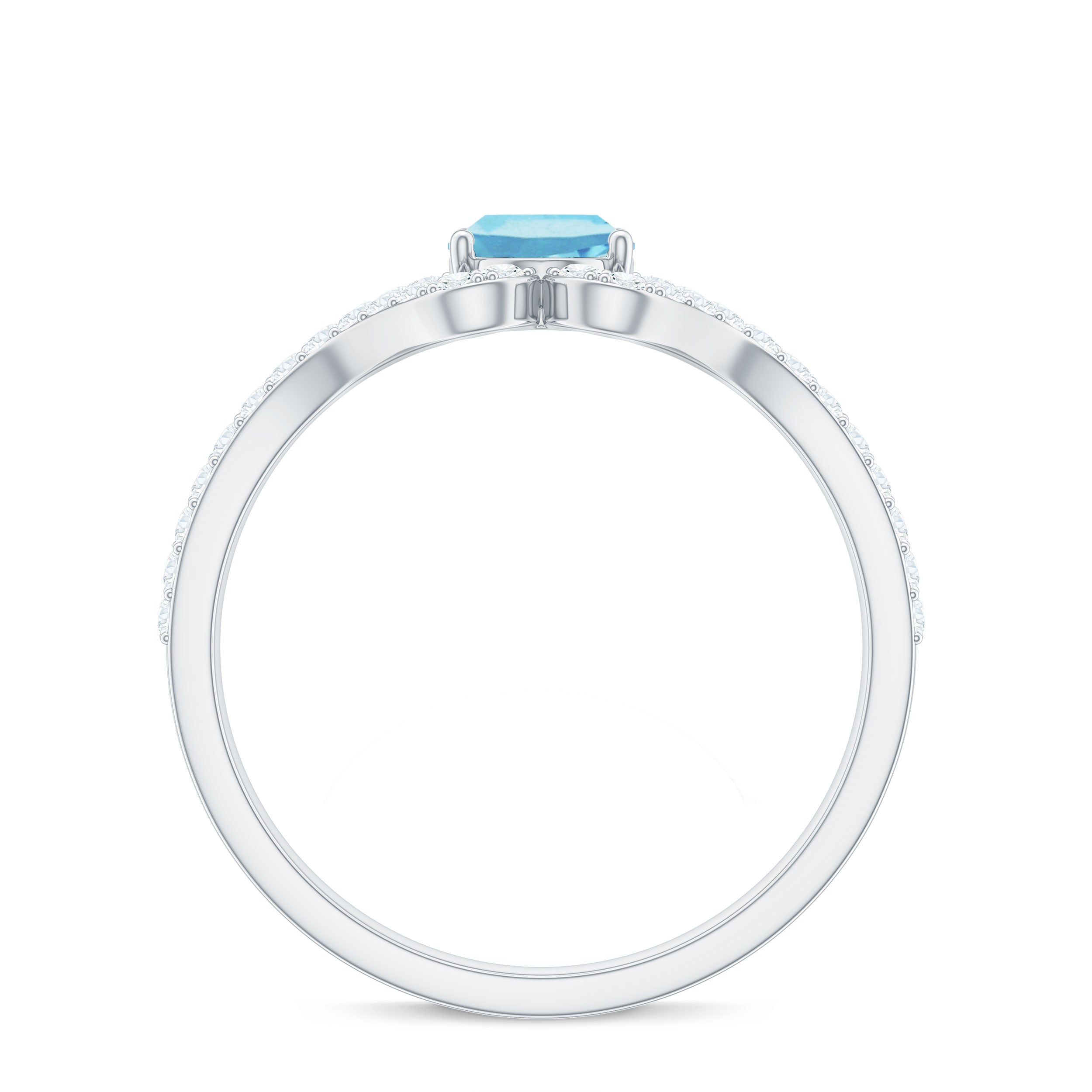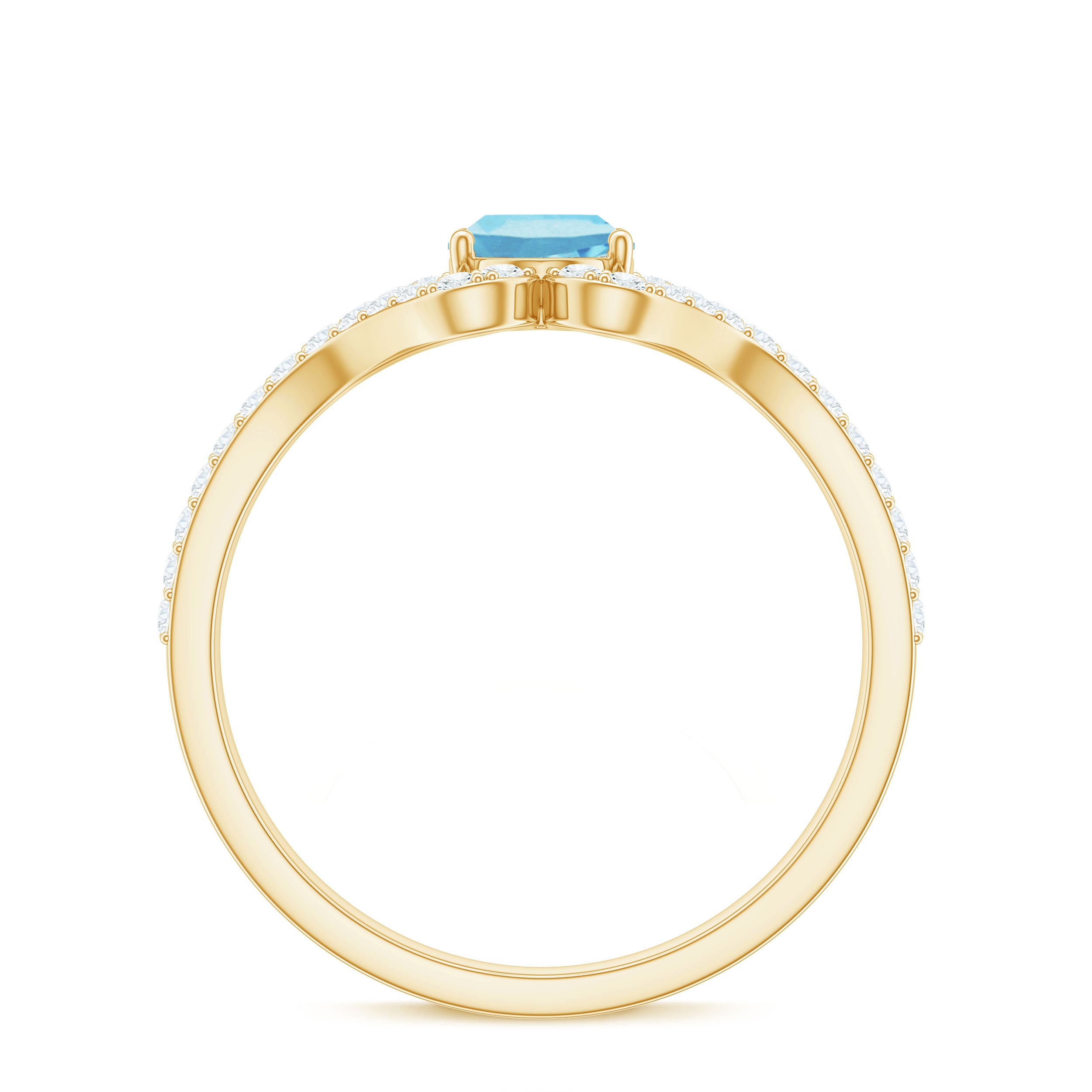 • Emerald Cut Aquamarine Engagement Rings: - An elongated rectangular shape that is crafted to accentuate its long, parallel step cuts, often accompanied by trimmed corners, resulting in an elegant octagon-like silhouette. This cut radiates the clarity as well as transparency of aquamarine.