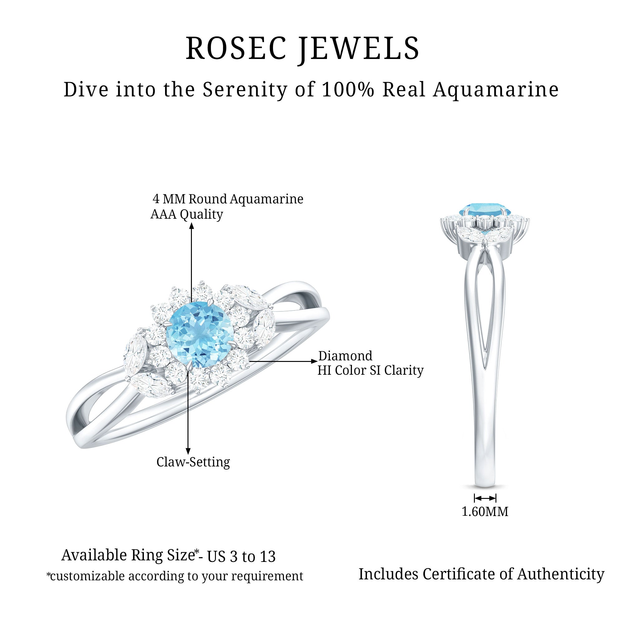 • Round Aquamarine Engagement Rings: - A popular pick, the round cut accentuates the beauty and sparkle of the aquamarine gem, and may create a stylish and classic look. The round shape also has the benefit of not chipping off over time.