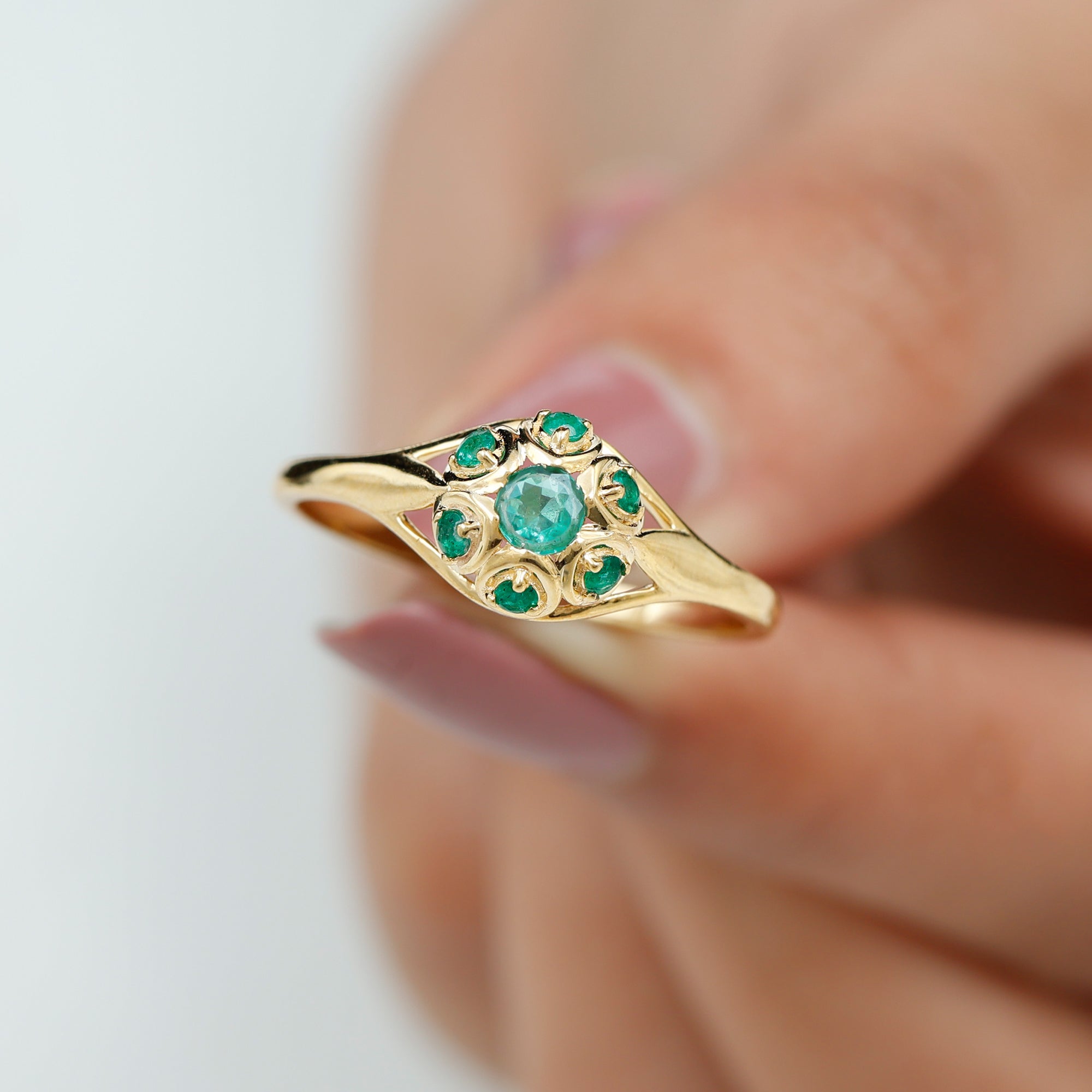 The Art Deco emerald engagement rings are symbolic of love, peace, hope, and luck. The gorgeous emeralds in an Art Deco ring will represent a blessed marital bond. Besides, the bright greenish hue of emerald art deco rings signifies new beginnings in love and life. The hardness of emerald art deco rings protects them from the ravages of time.