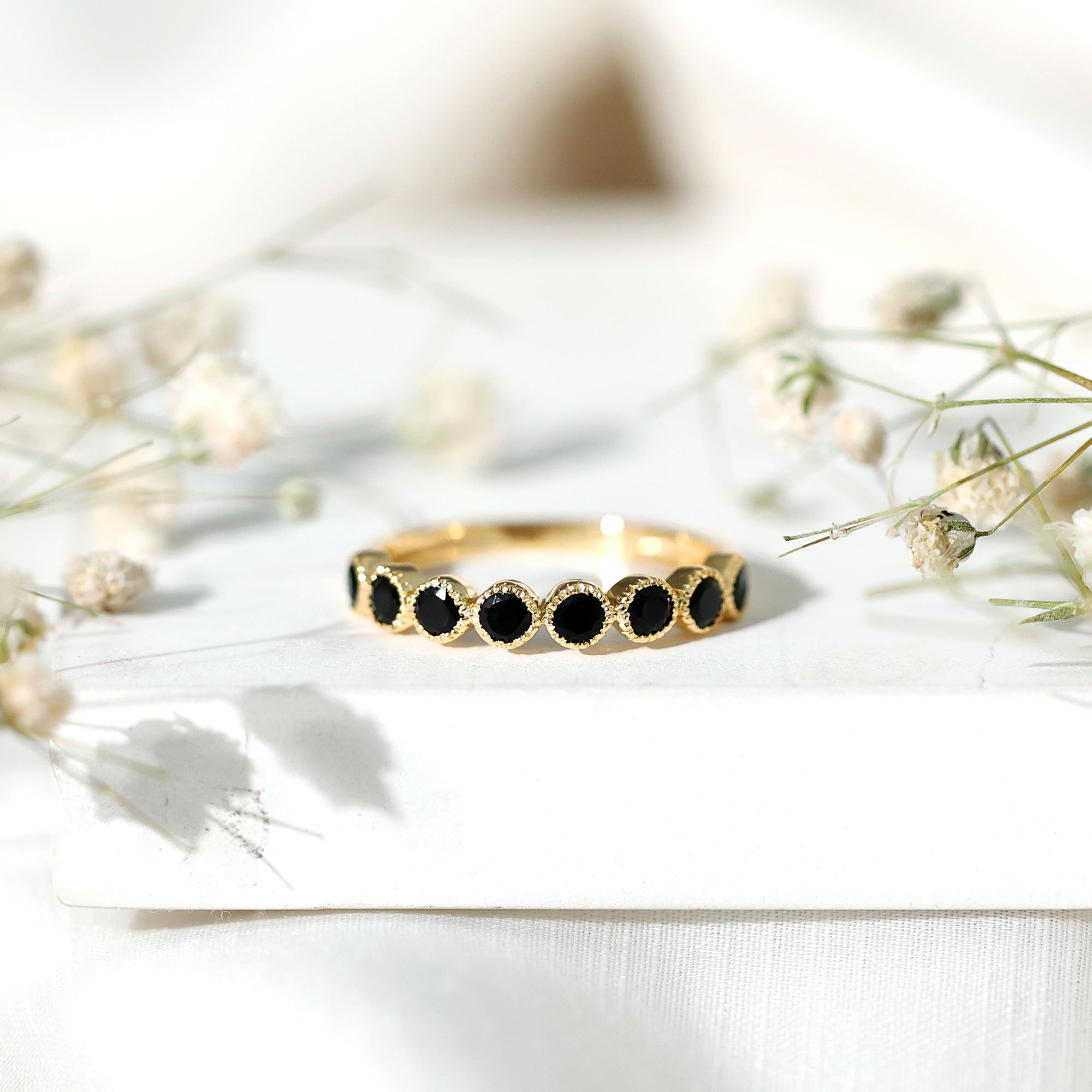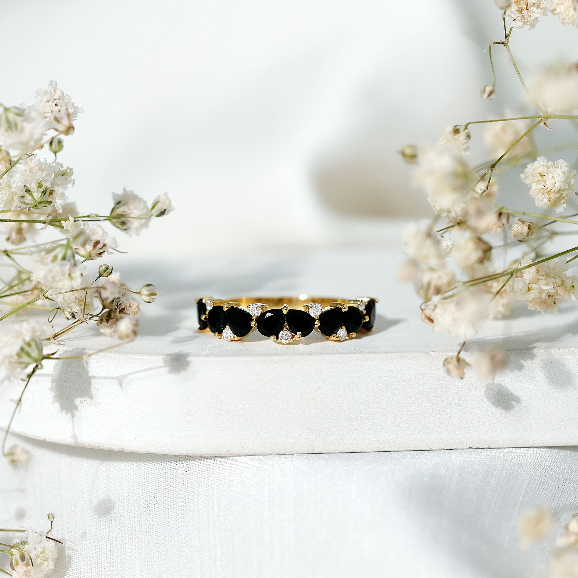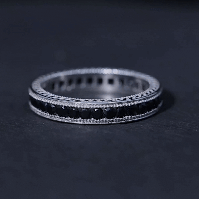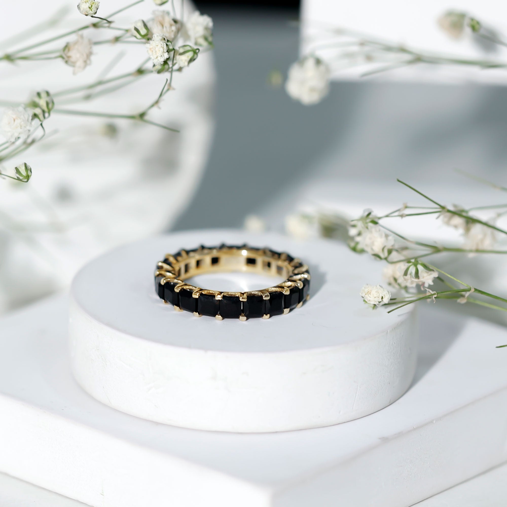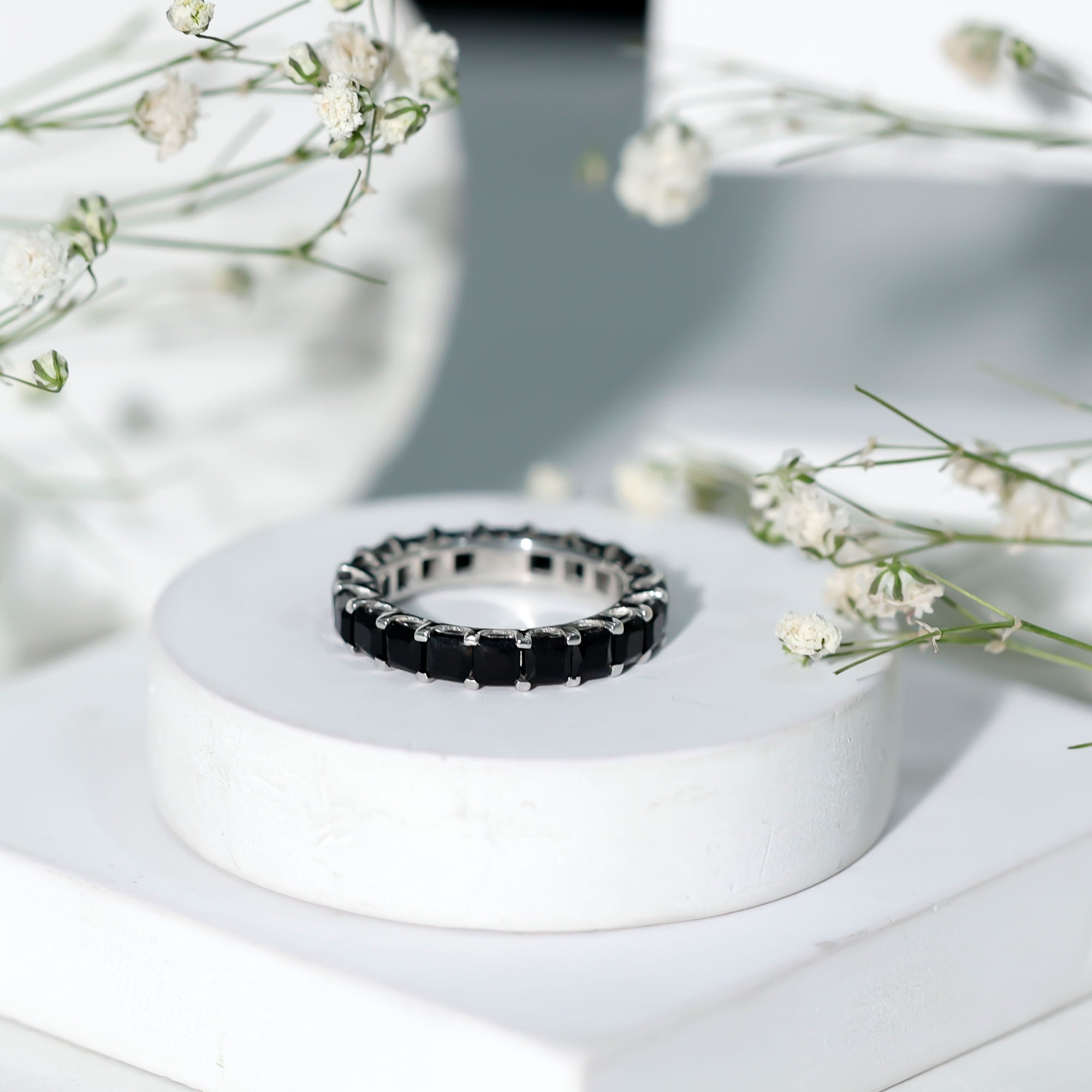 A Modern Classic, this Eternity Ring is paraded by a row of Black Onyx that are typically uniform in size. You’ll find no better style to flaunt your Black Onyx. But don’t take it to mean that it is all aesthetics. This style has been crafted in a way that carries an equally beautiful meaning behind it. The eternity pattern of stones commemorates the kind of love that lasts till the end of time (eternally). That’s why it also makes for an iconic Black Onyx Wedding Ring.