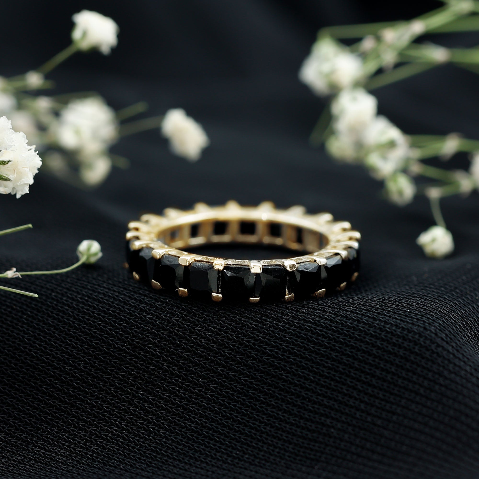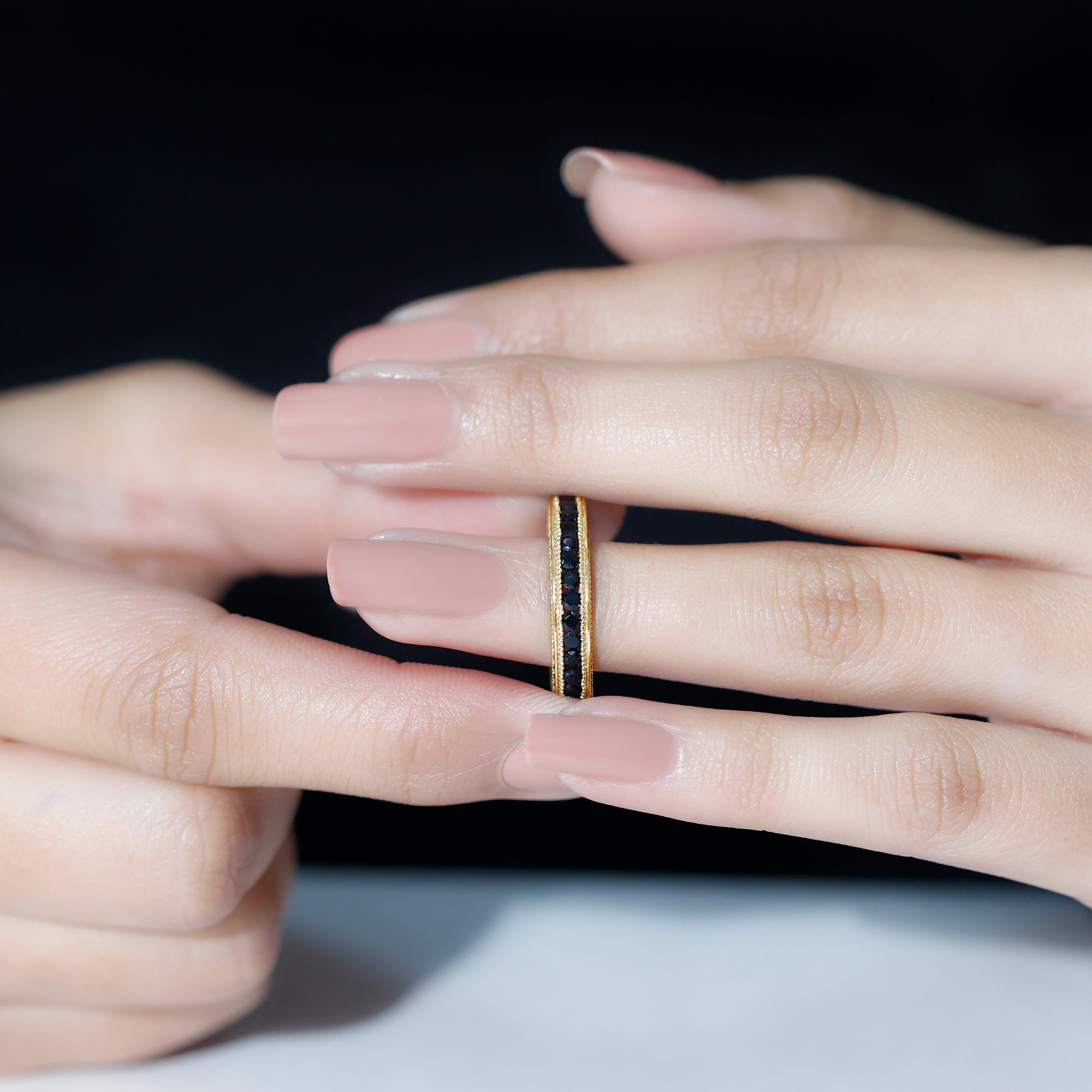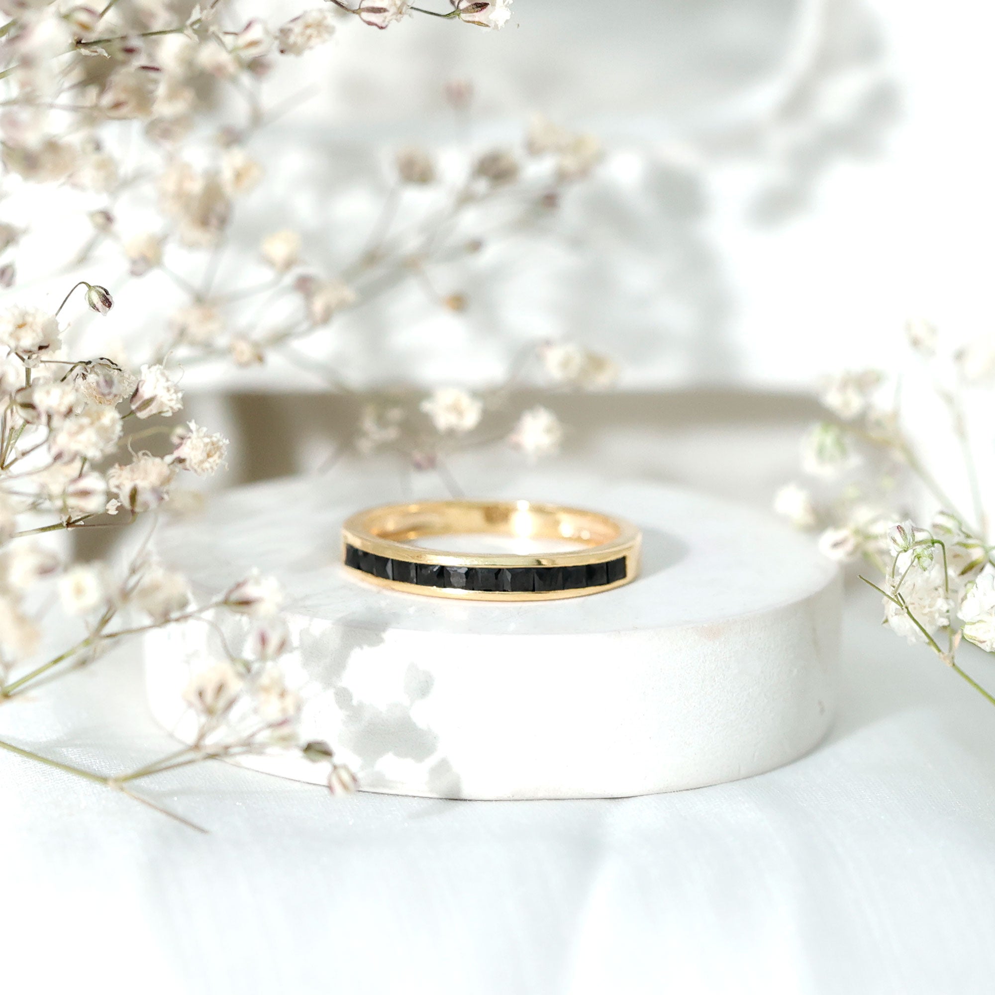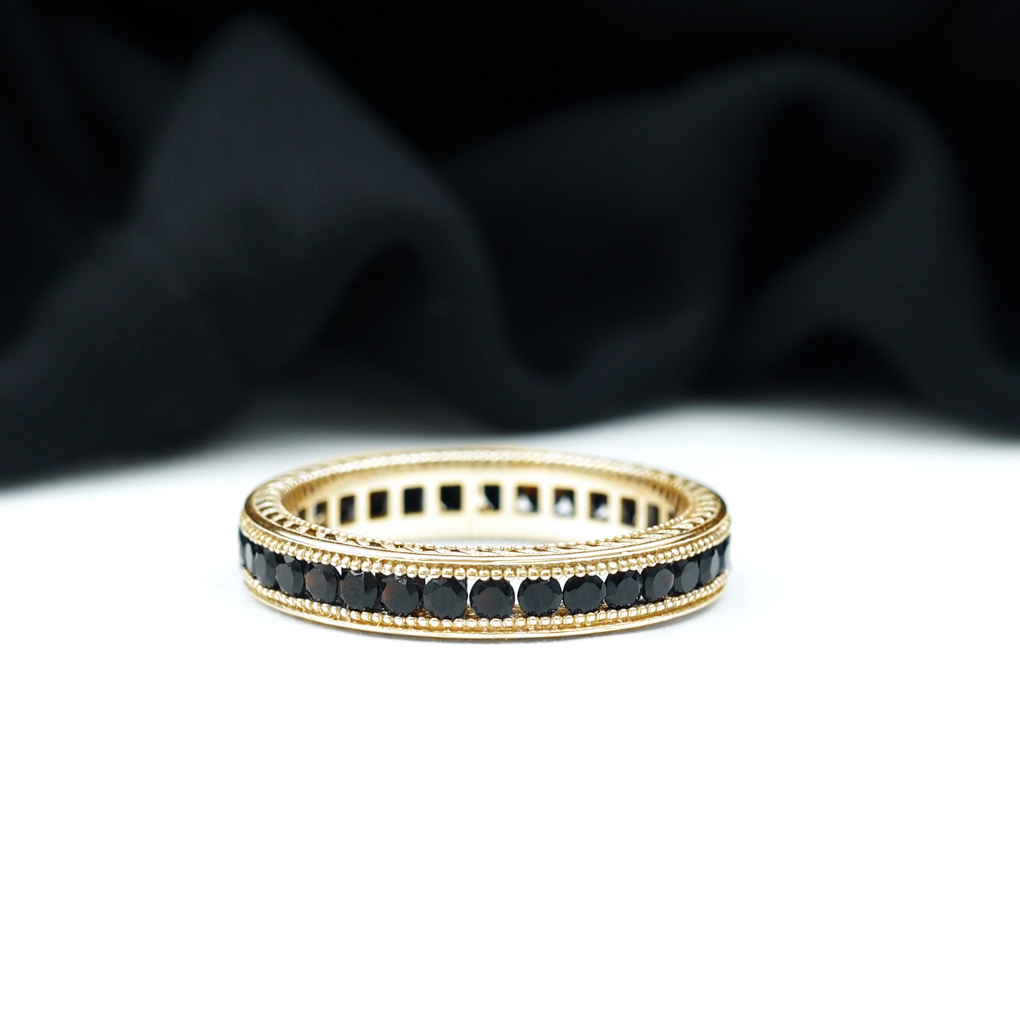 A Modern Classic, this Eternity Ring is paraded by a row of Black Onyx that are typically uniform in size. You’ll find no better style to flaunt your Black Onyx. But don’t take it to mean that it is all aesthetics. This style has been crafted in a way that carries an equally beautiful meaning behind it. The eternity pattern of stones commemorates the kind of love that lasts till the end of time (eternally). That’s why it also makes for an iconic Black Onyx Wedding Ring.