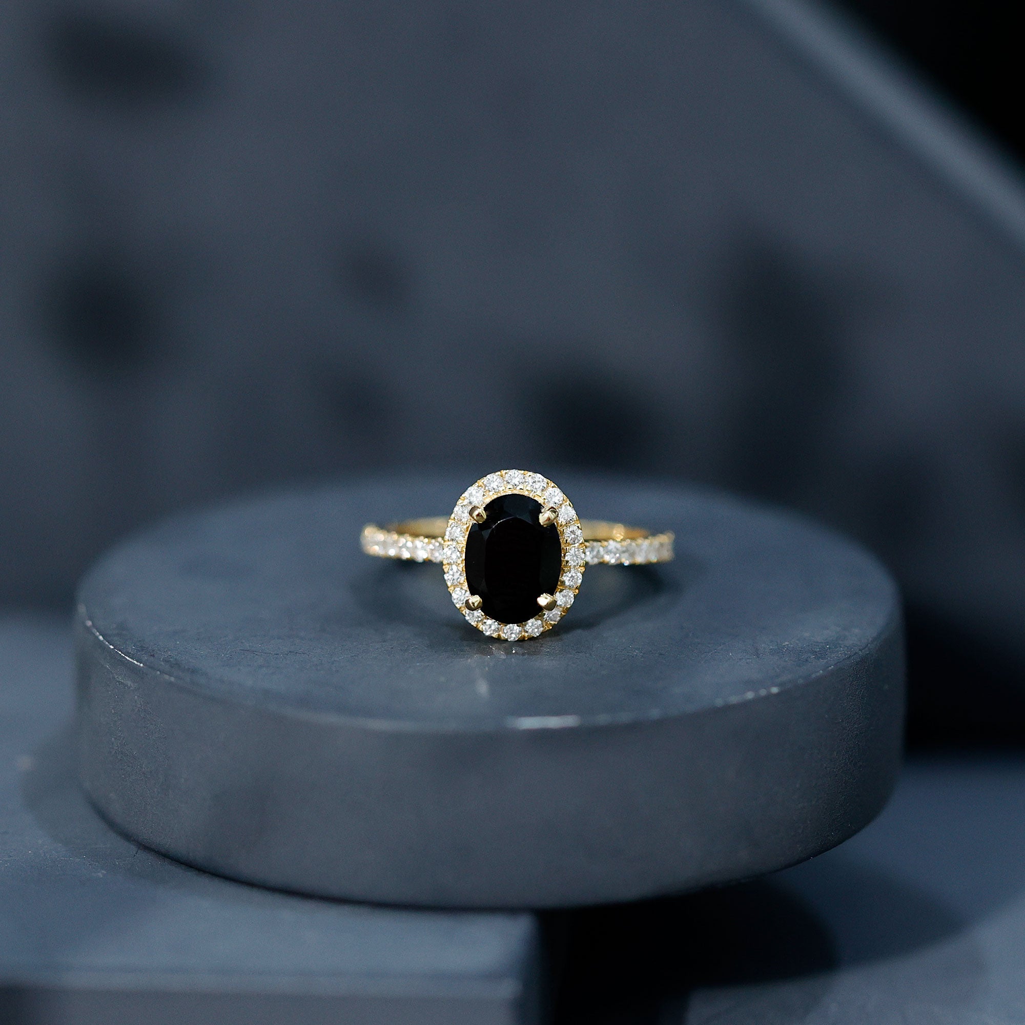 A Halo style encircles the Centerpiece of Black Onyx with a row of Diamonds/Moissanite, offering you a layer full of sparkles. With that, it also brings the monochromatic combination of Black and White to life. A Black Onyx Ring with Diamond Halo is made for the ones who like more character and definition in their ring. Moreover, it makes your Onyx look bigger (while saving you the extra bucks, of course).