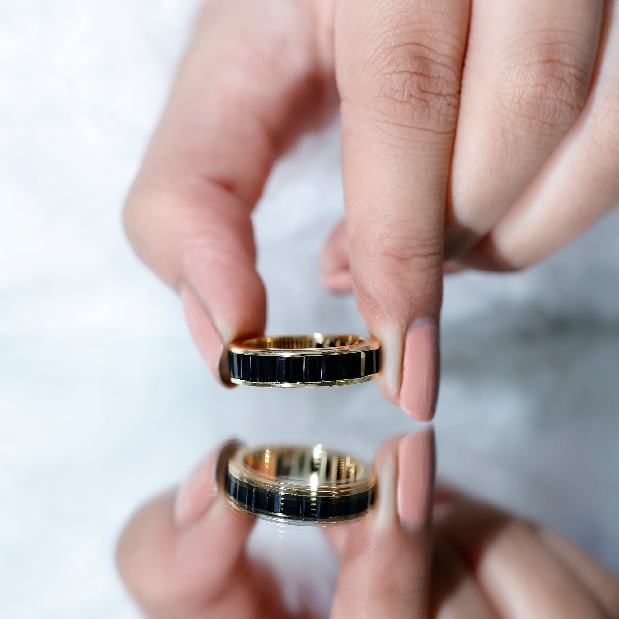 You’ll typically witness Black Onyx Rings that are (comparatively) large. So for aesthetic purposes, it’s advisable to slip it over the index or middle finger. (since you can fully flaunt this gold ring with black stone that way). Apart from that, everything ultimately boils down to your choice of preference and sense of style.