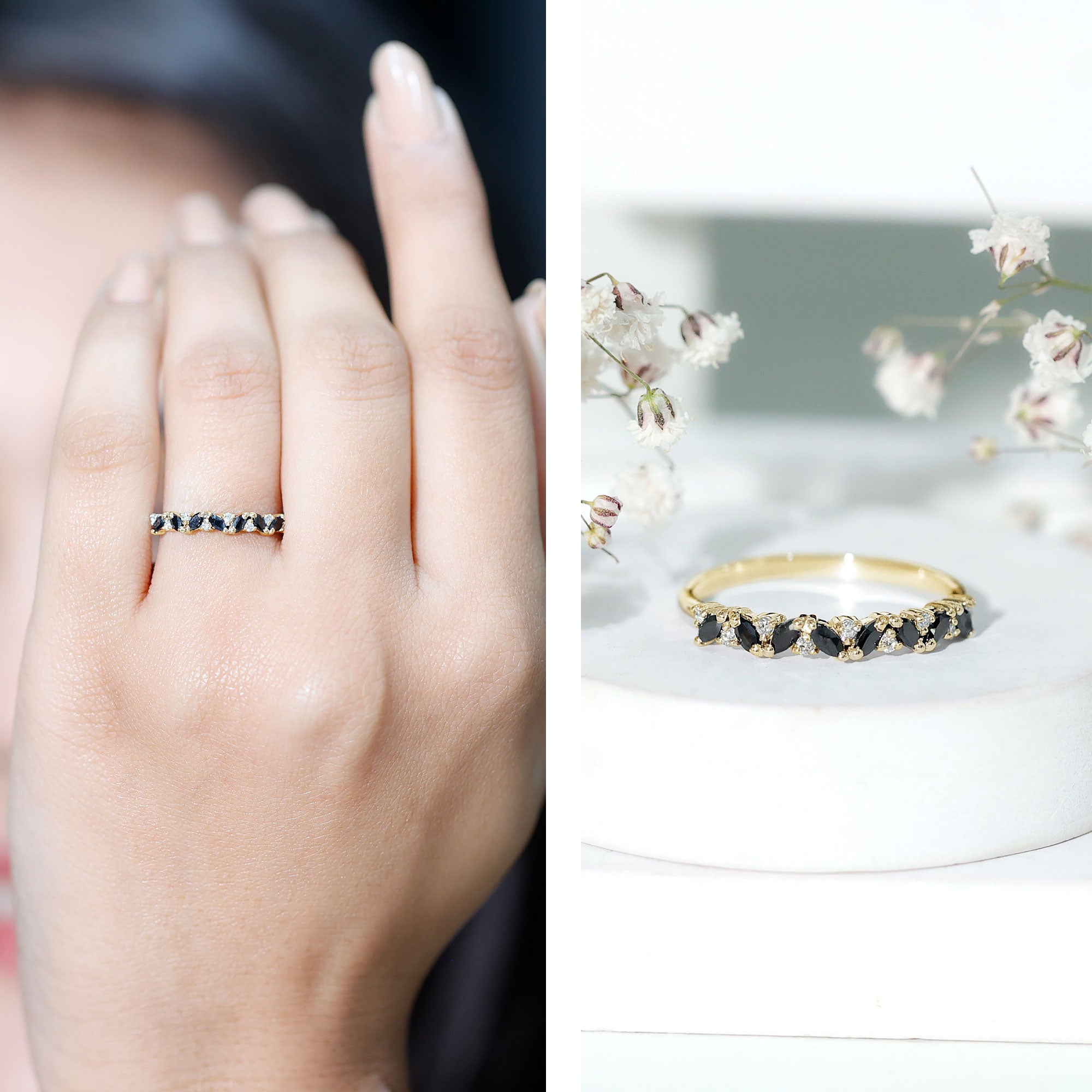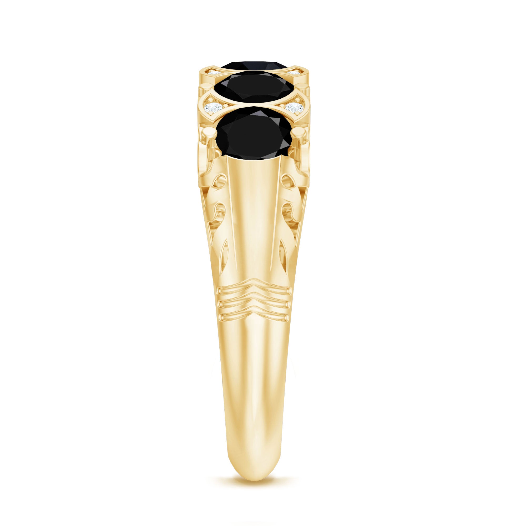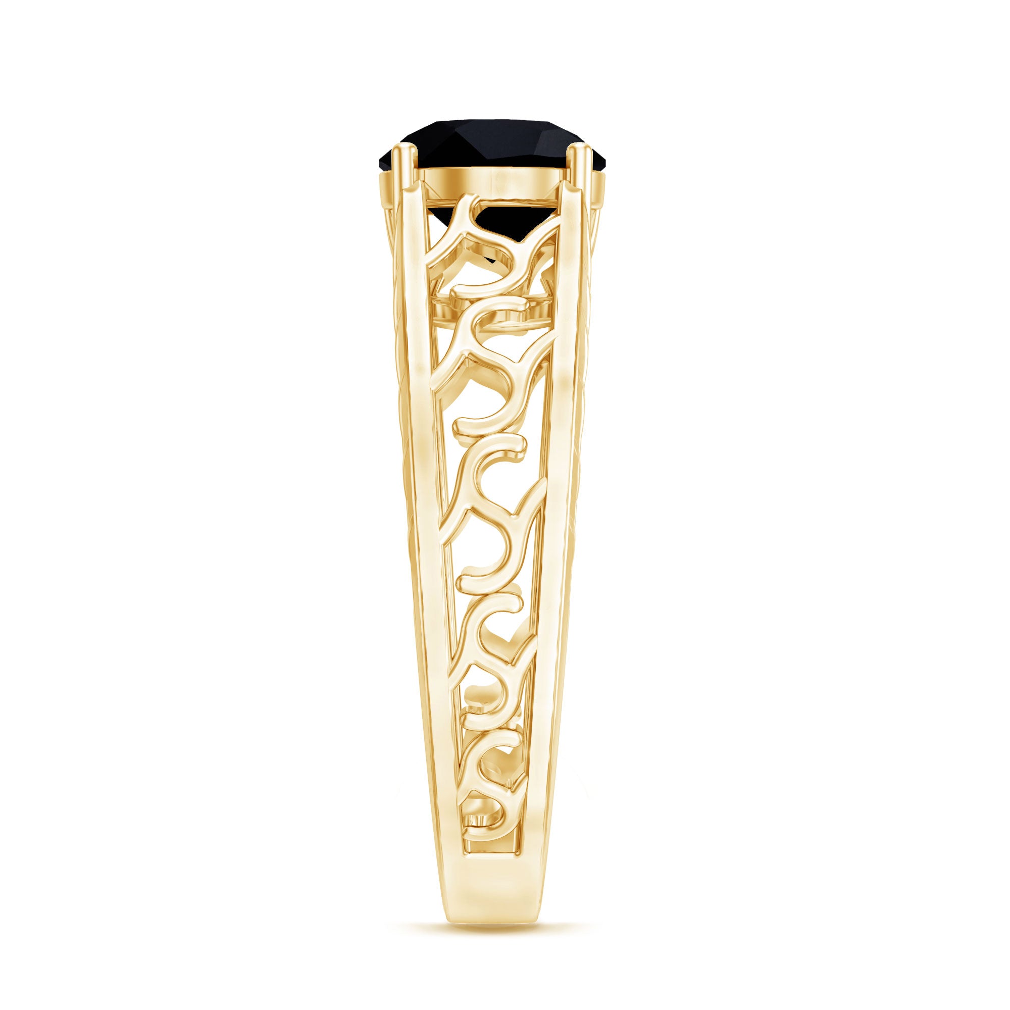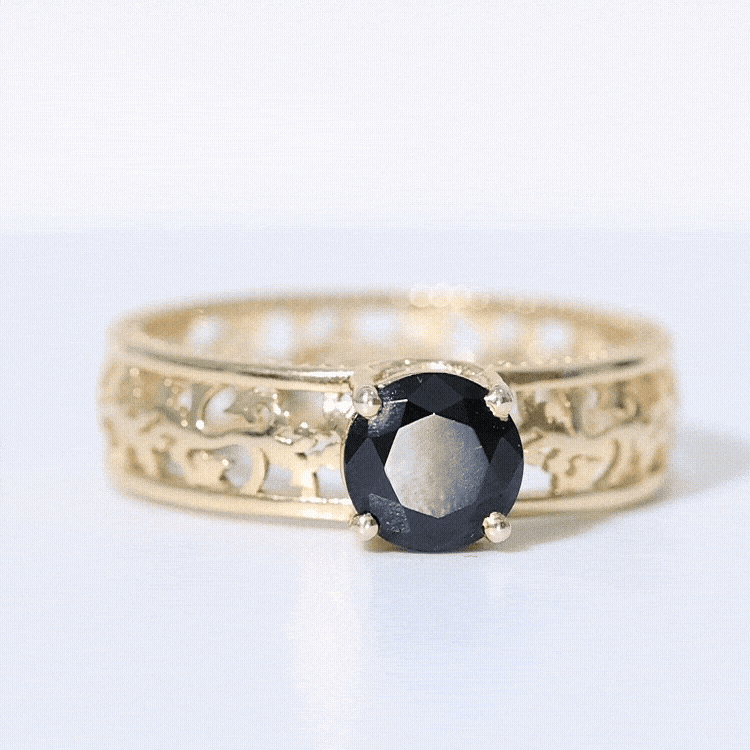 A Promise Ring highlights the Centerpiece of Black Onyx while staying understated. That’s because the size of Black Onyx here is a lot smaller (typically, around 4 mm or less). This ring style could incorporate elegant floral motifs, minimalist nature-inspired details, or accents of Diamond/Moissanite (without overdoing it). When presented, these Black Stone Rings insinuate a promise of togetherness and an intent to take the relationship to the next level.