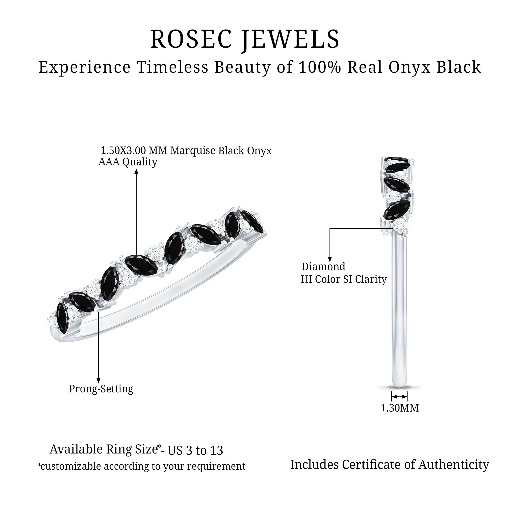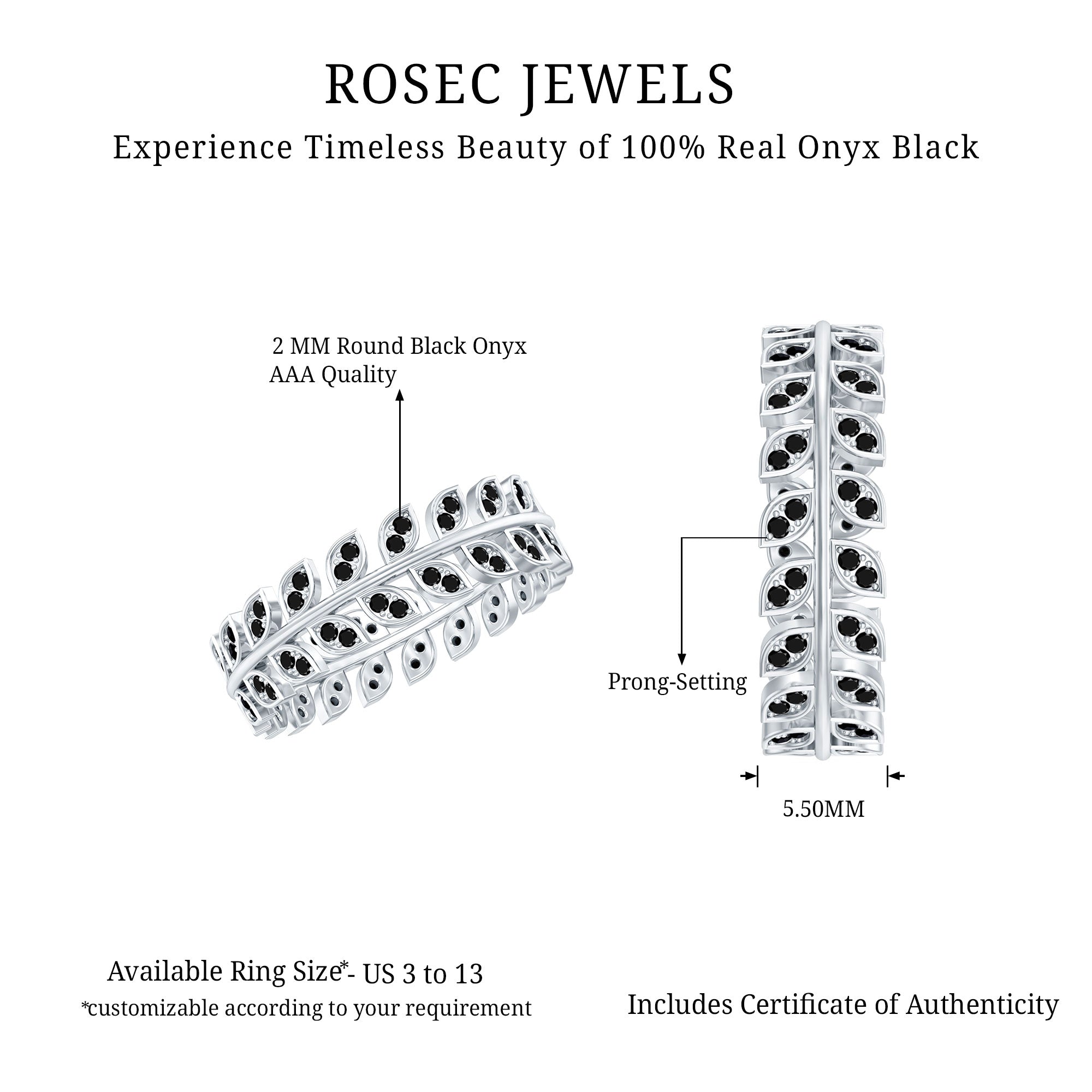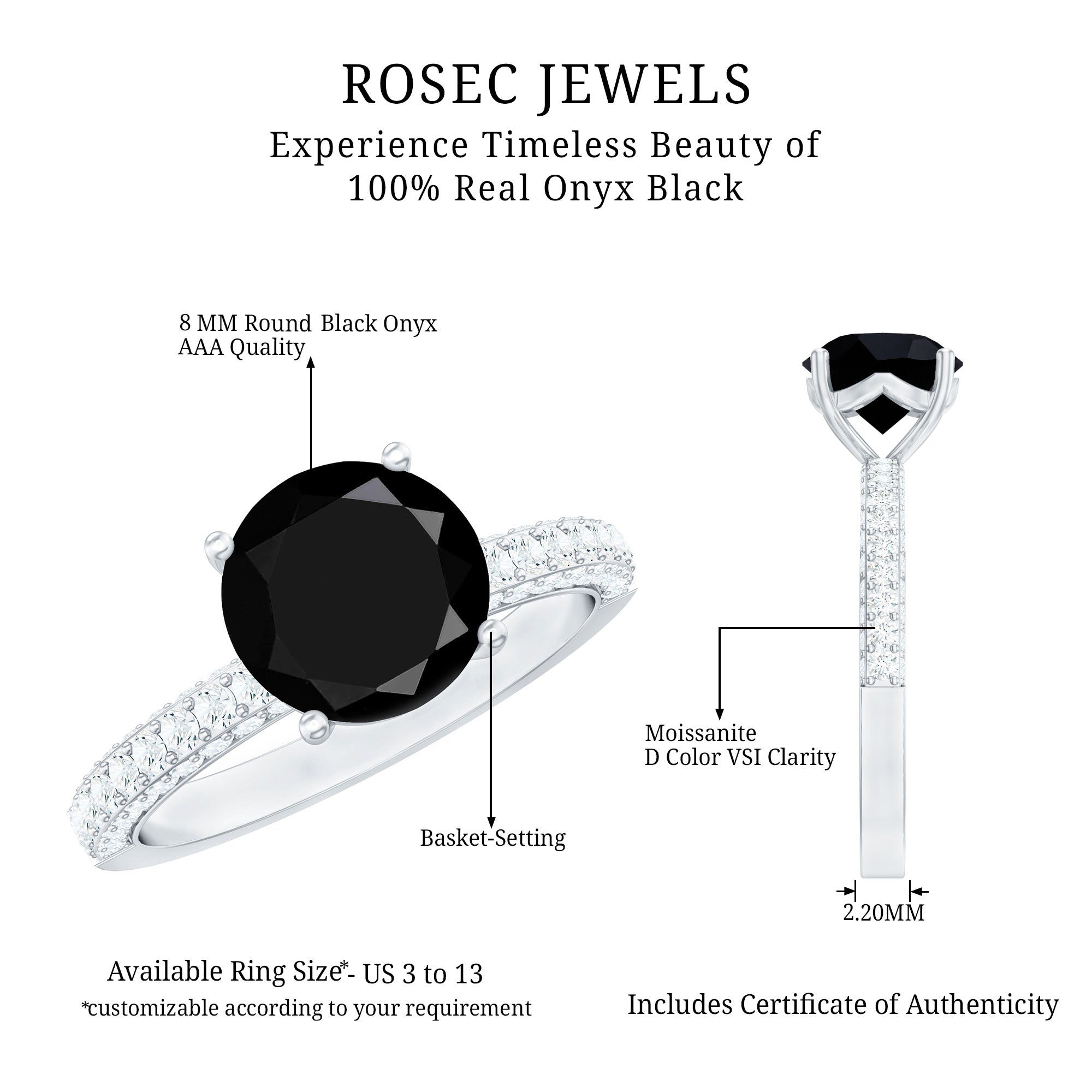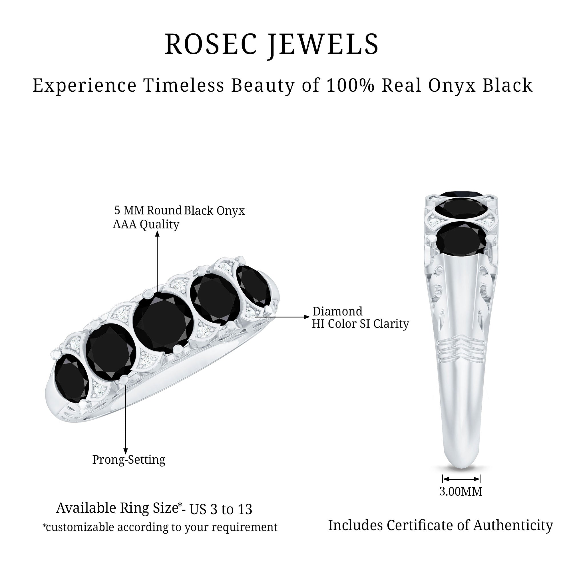 A Promise Ring highlights the Centerpiece of Black Onyx while staying understated. That’s because the size of Black Onyx here is a lot smaller (typically, around 4 mm or less). This ring style could incorporate elegant floral motifs, minimalist nature-inspired details, or accents of Diamond/Moissanite (without overdoing it). When presented, these Black Stone Rings insinuate a promise of togetherness and an intent to take the relationship to the next level.
