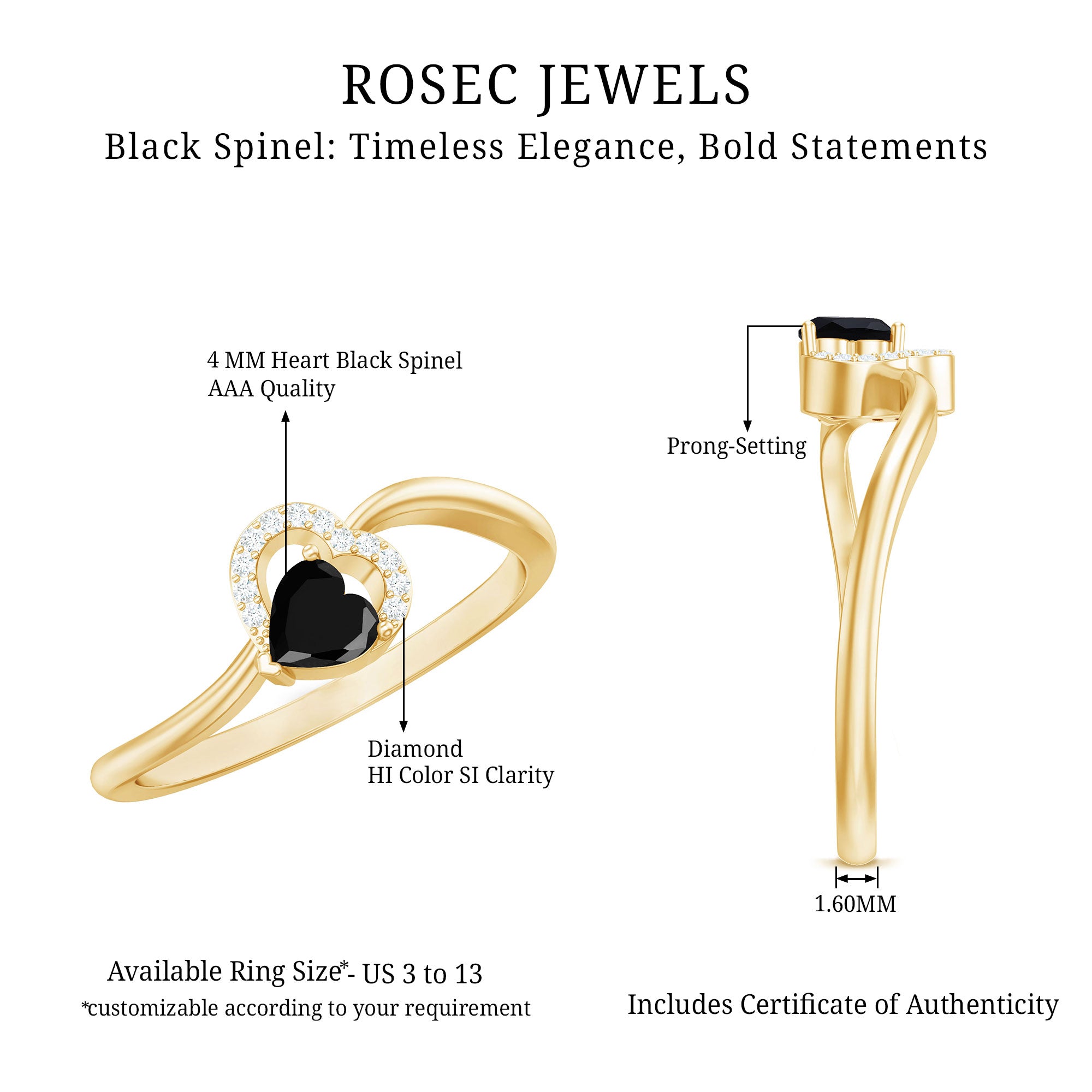 A Black Spinel Promise Ring might insinuate a specific meaning but it isn’t confined to a specific style. It can range from a Simple Solitaire Ring that exudes an understated aesthetic with a size of 4 MM or even less. Or for an exquisite visual appeal, be ornately detailed with nature-inspired designs, flower, and infinity motifs, or sparkling accents of Diamond/Moissanite. Behind that, it reflects upon the promise of eternal commitment (that usually precedes an engagement).