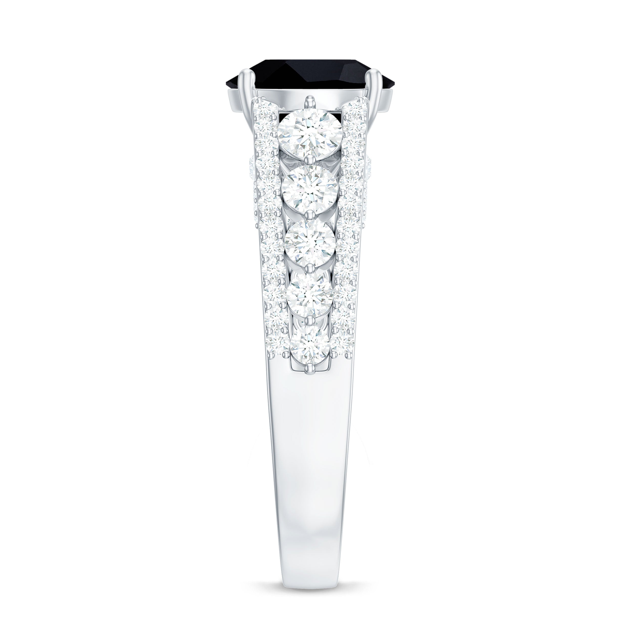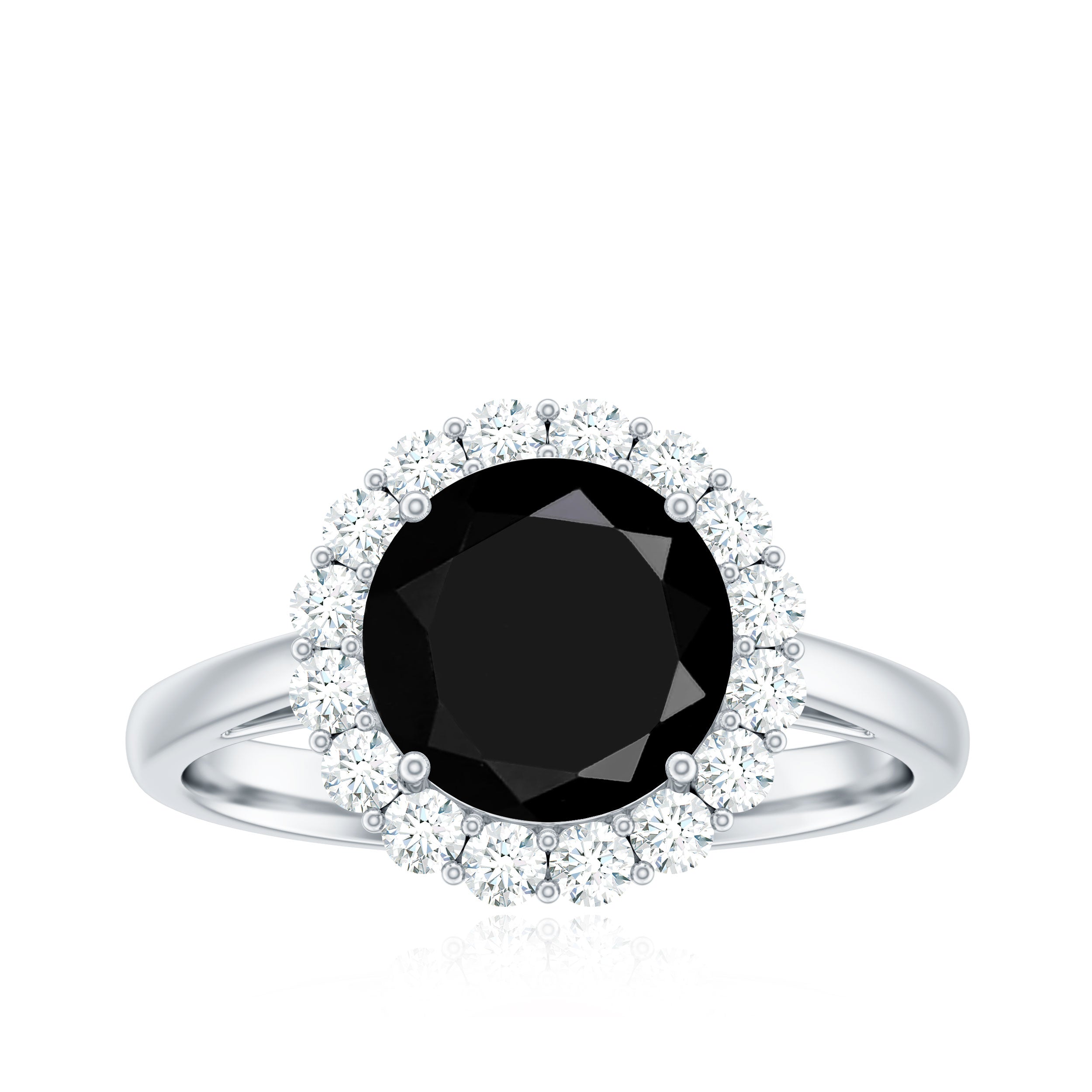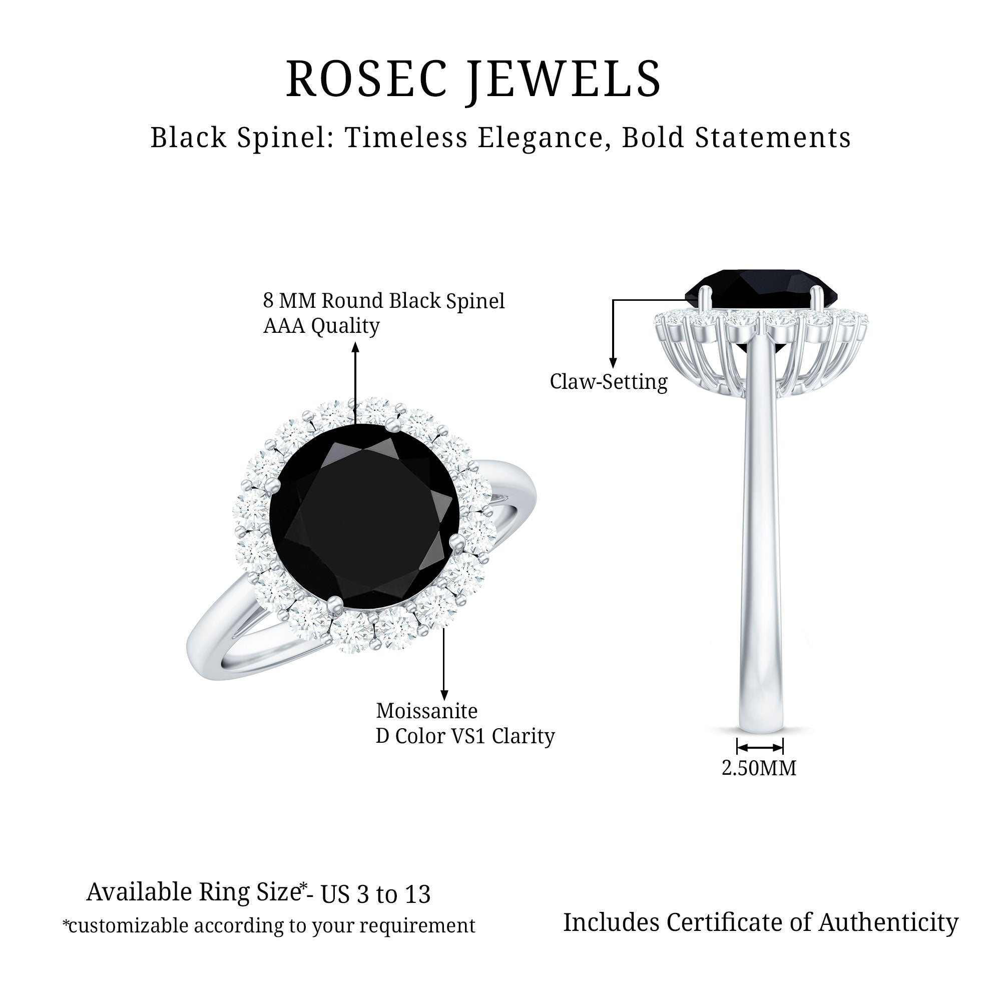 Lending an interesting visual appeal to the Black Spinel Solitaire Ring, a Halo encircles the Black Spinel with a parade of diamond/moissanite. The best part about a Halo is that it rewards more personality as well as an illusion of a larger-looking size to your Black Spinel. So, it is a unique blend of classic and flashy. That makes it another popular choice of the Black Spinel Engagement Ring.