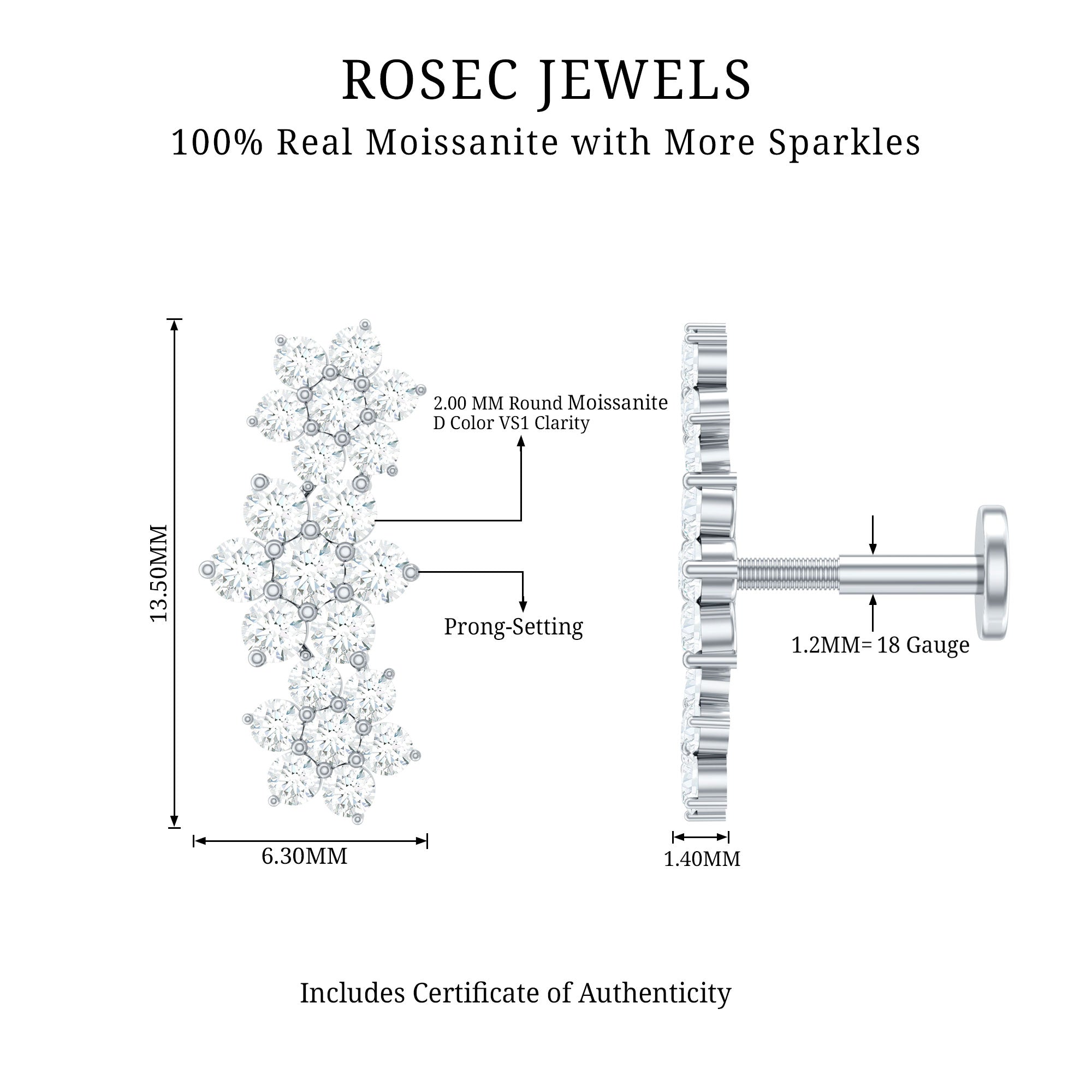 Cartilage piercings earrings adorned by beautiful, perfectly cut H color SI clarity diamonds. Diamonds are forever, you must have heard this. Genuine diamonds last for a lifetime when properly taken care of. At Rosec Jewels, we offer ethically sourced diamonds that shine brilliantly like a star. So, add some serious sparkle upgrade with our diamond piercing jewelry and let your ear stack do all the talking!