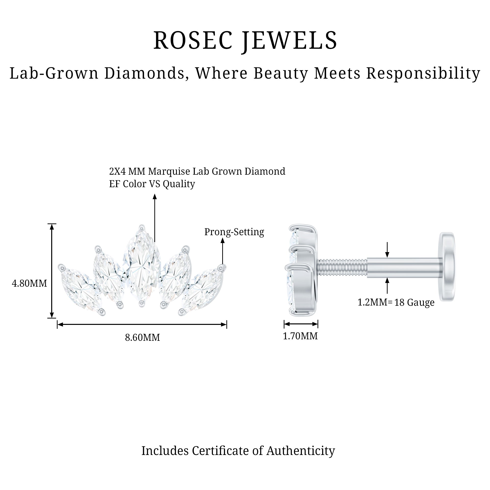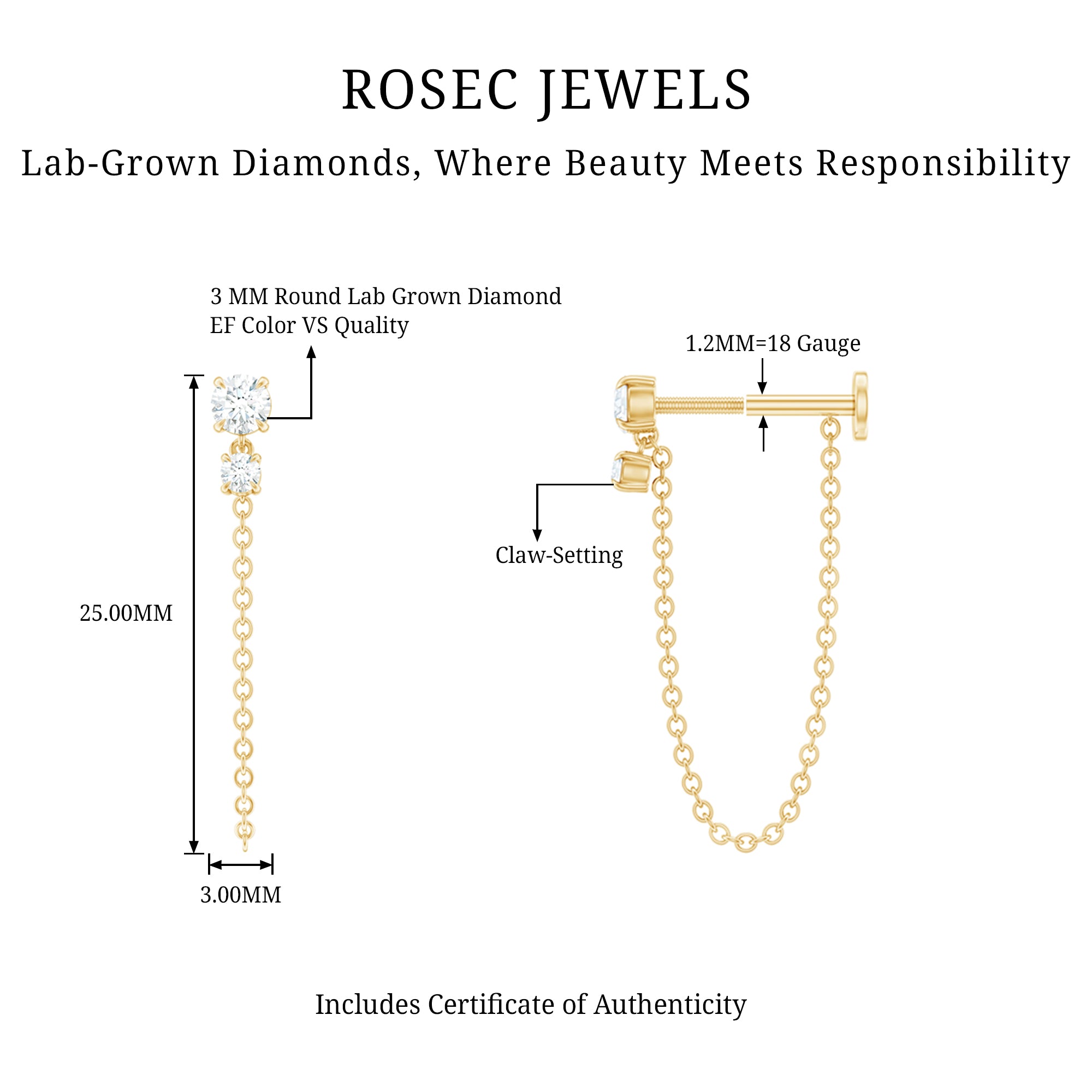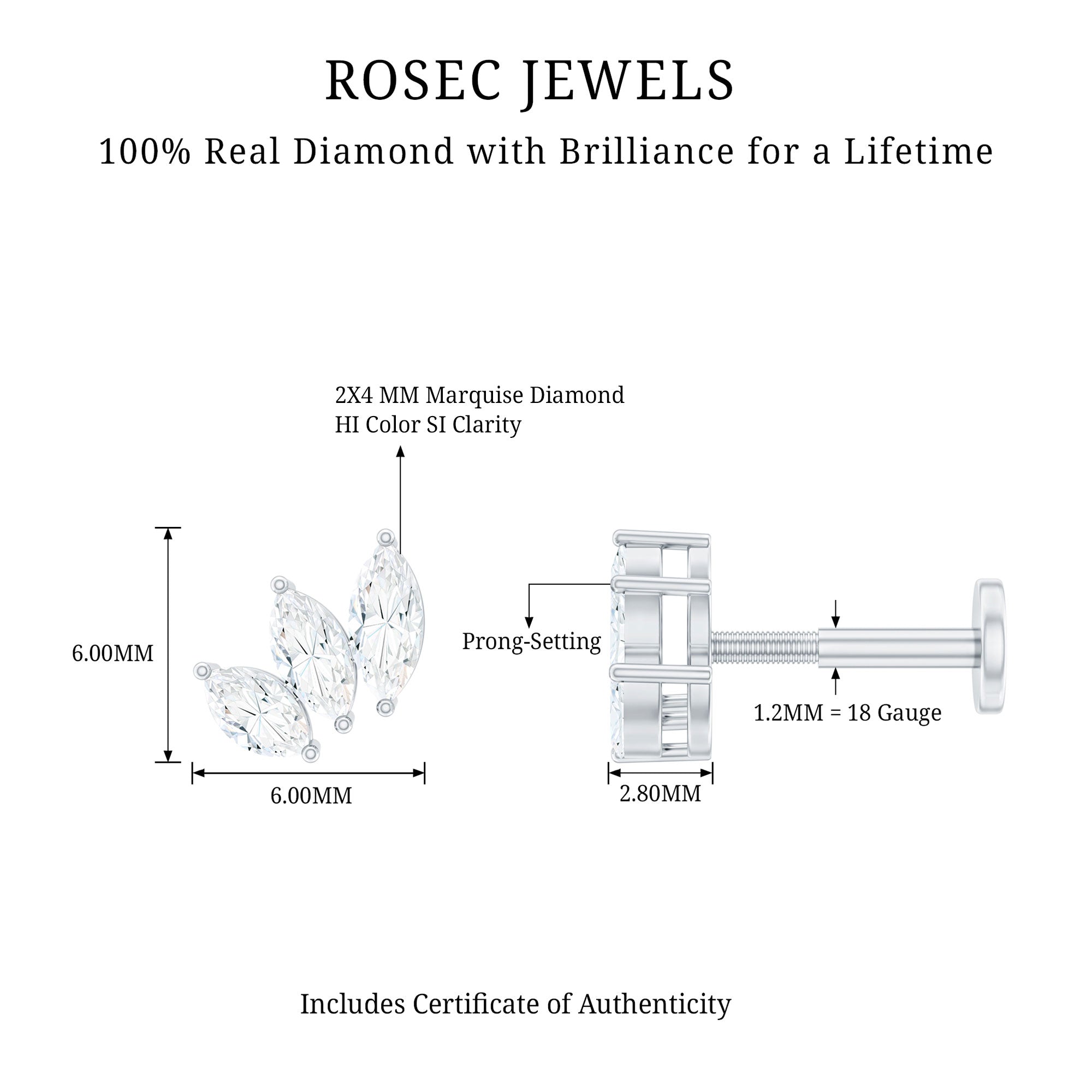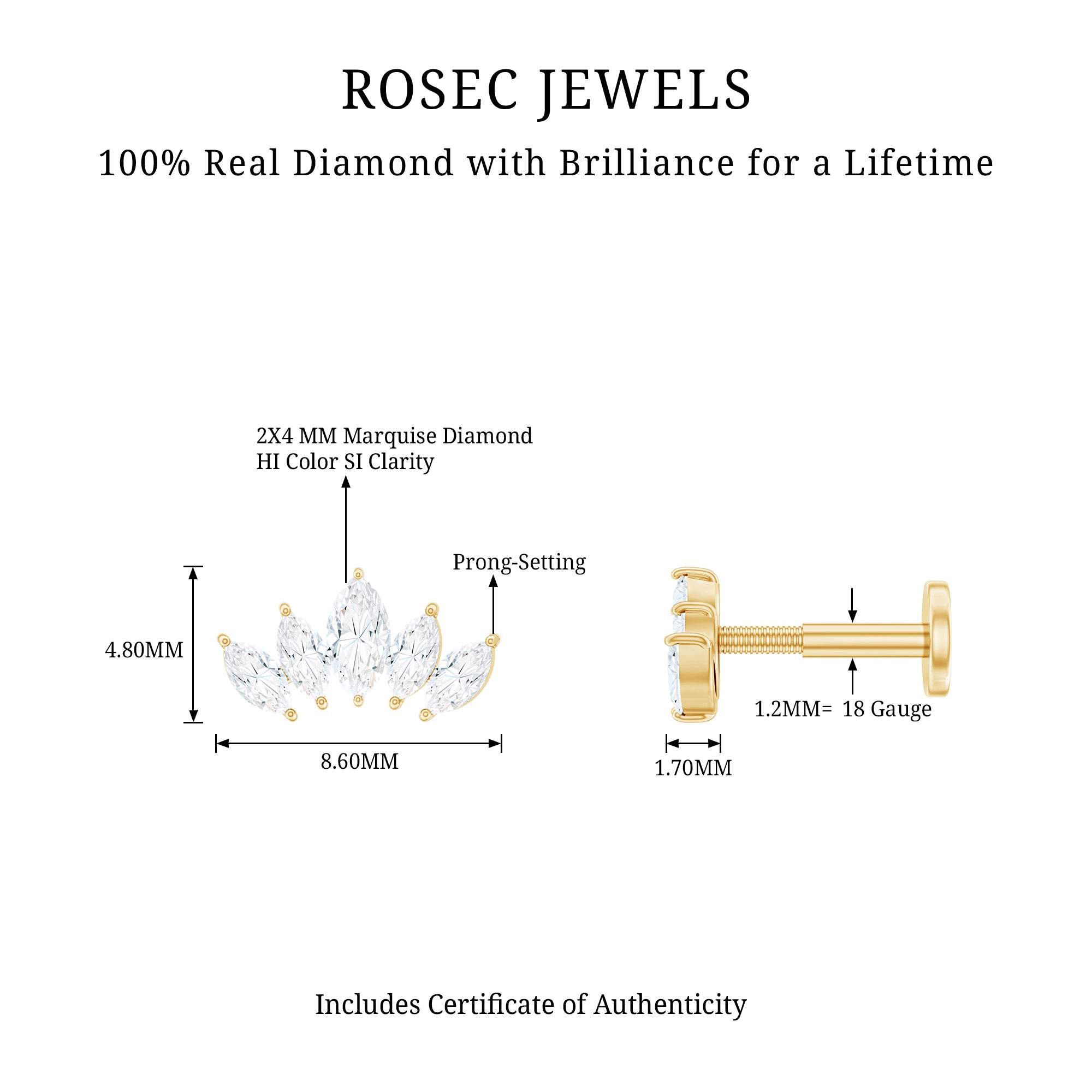 Cartilage piercings earrings adorned by beautiful, perfectly cut H color SI clarity diamonds. Diamonds are forever, you must have heard this. Genuine diamonds last for a lifetime when properly taken care of. At Rosec Jewels, we offer ethically sourced diamonds that shine brilliantly like a star. So, add some serious sparkle upgrade with our diamond piercing jewelry and let your ear stack do all the talking!