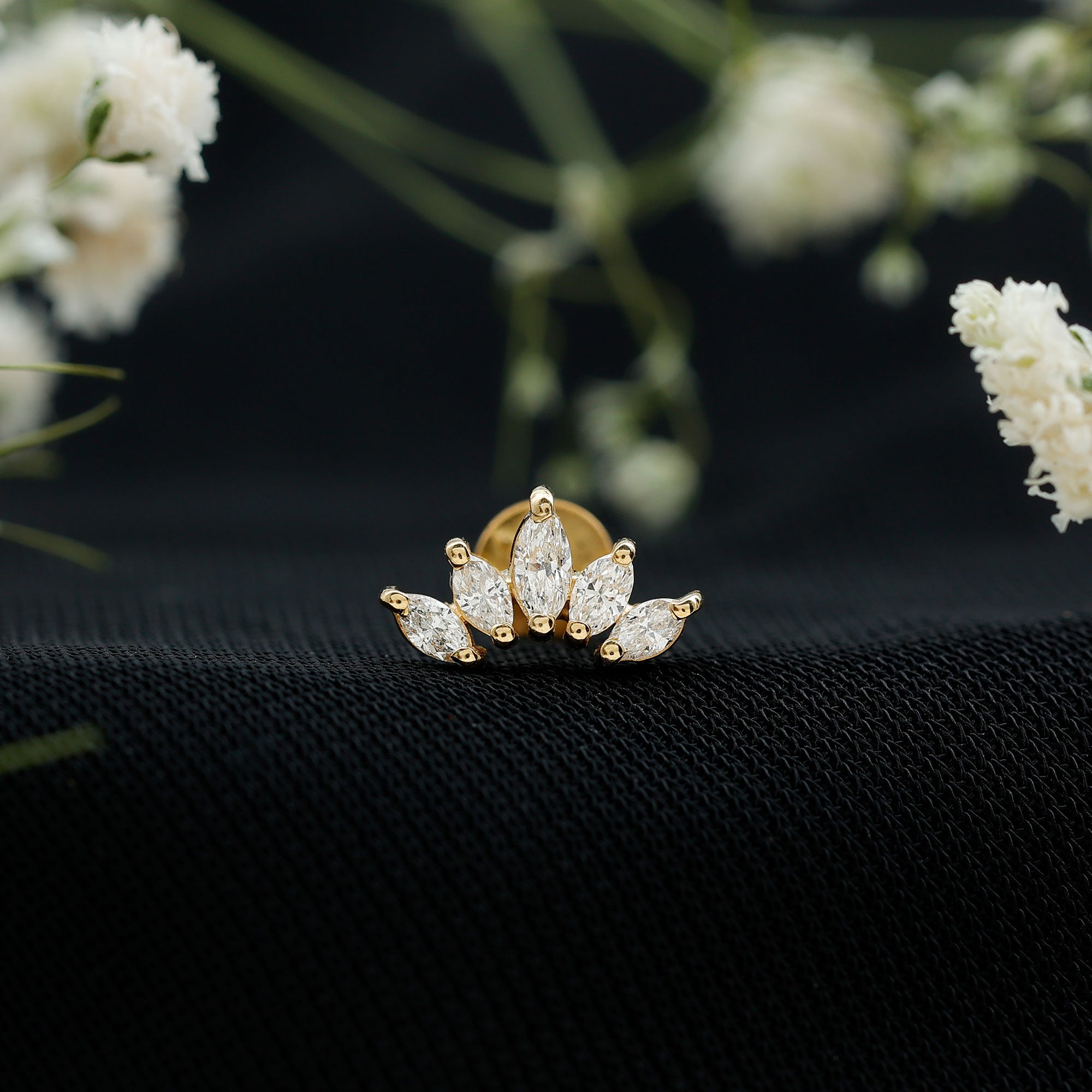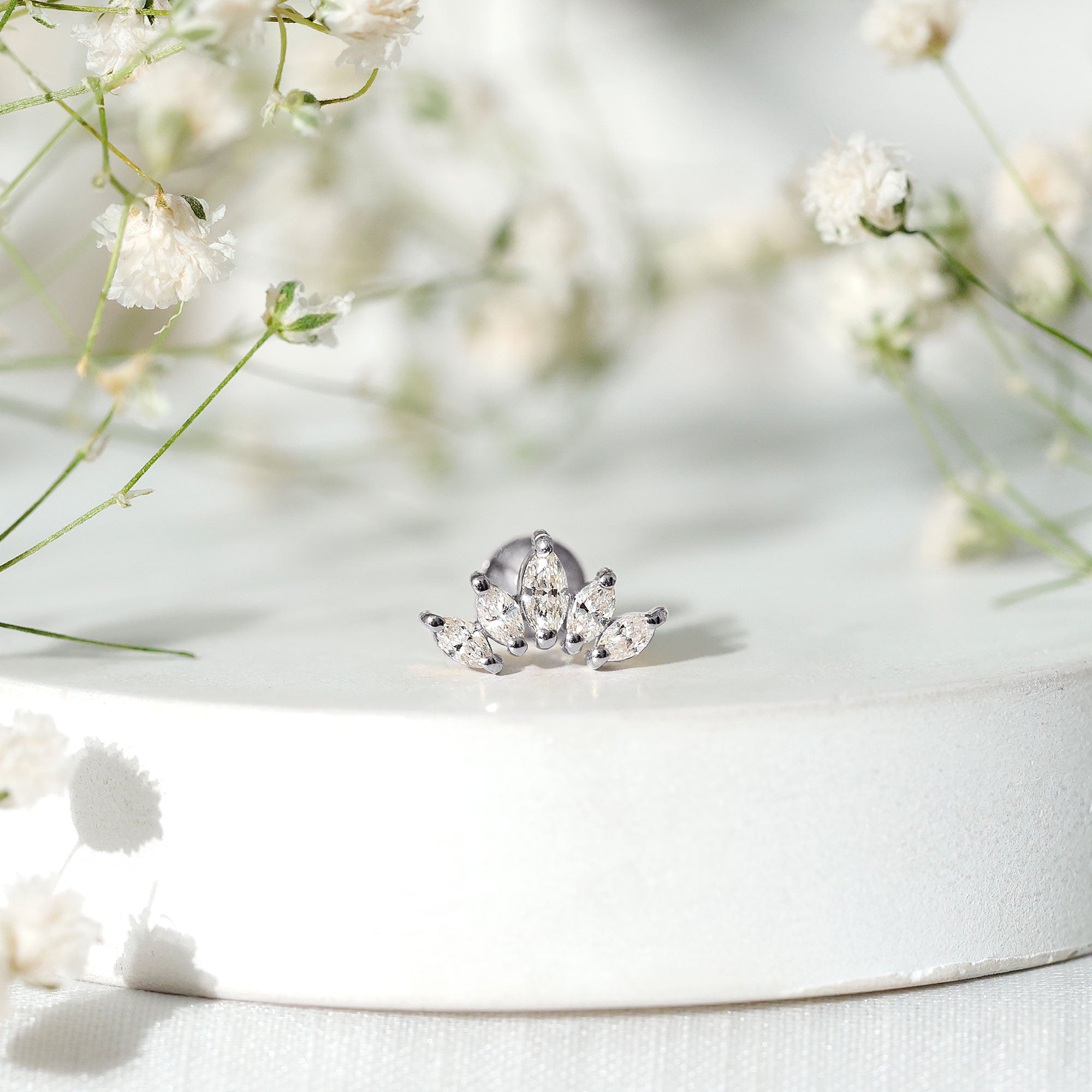 White gold is extra shiny and makes the piercing earring look more elegant and graceful. White gold is best to be paired with diamond accents, it enhances the reflectivity of white diamonds.