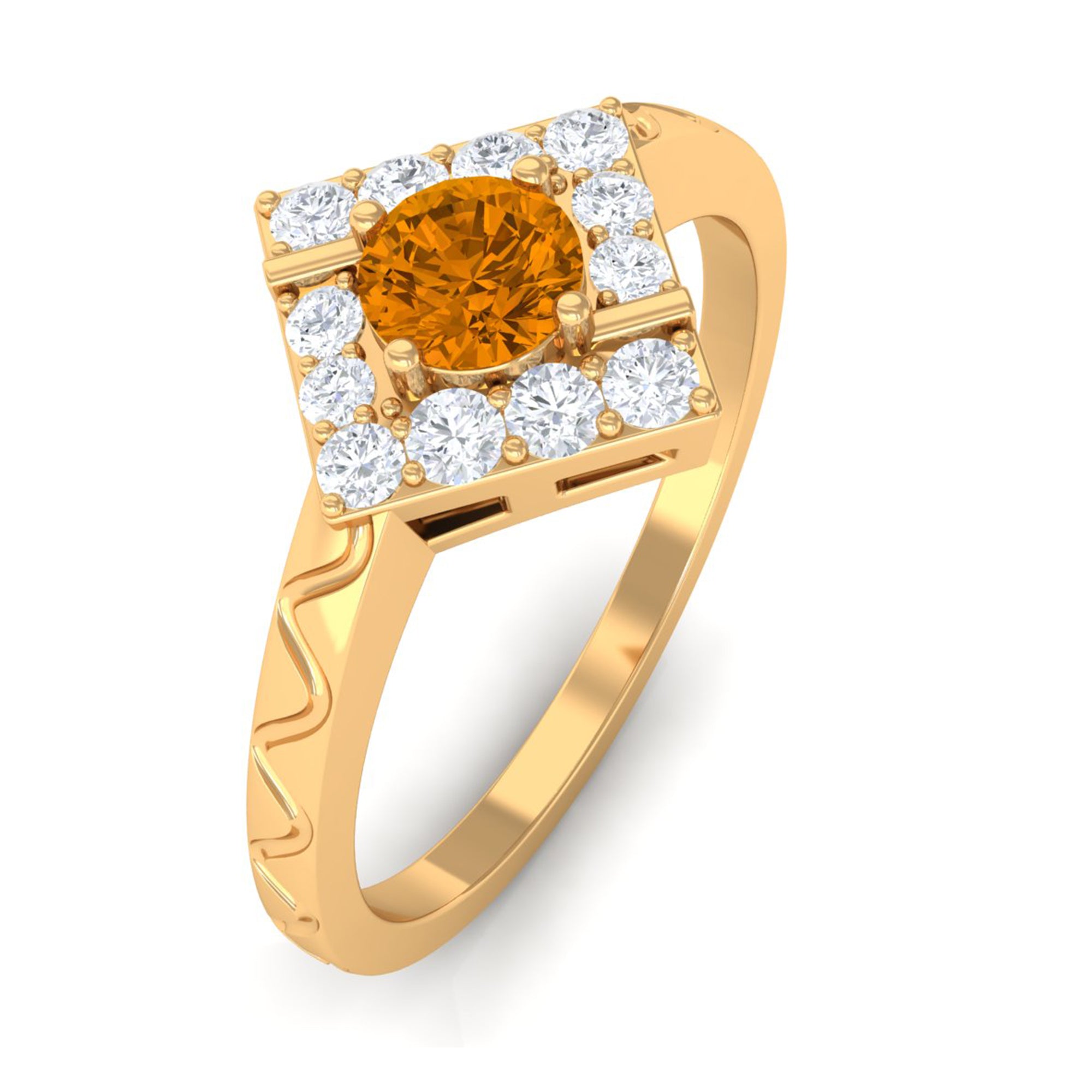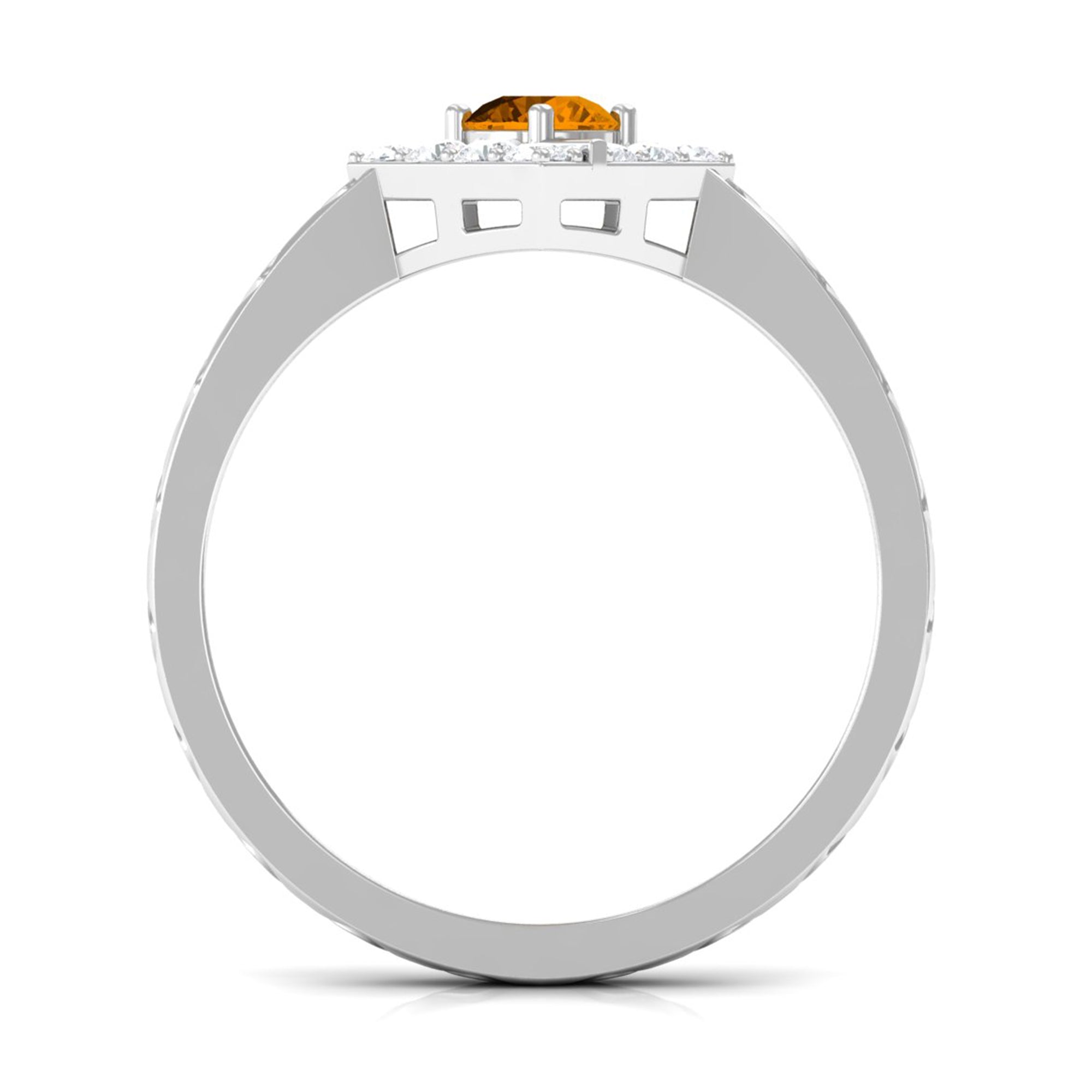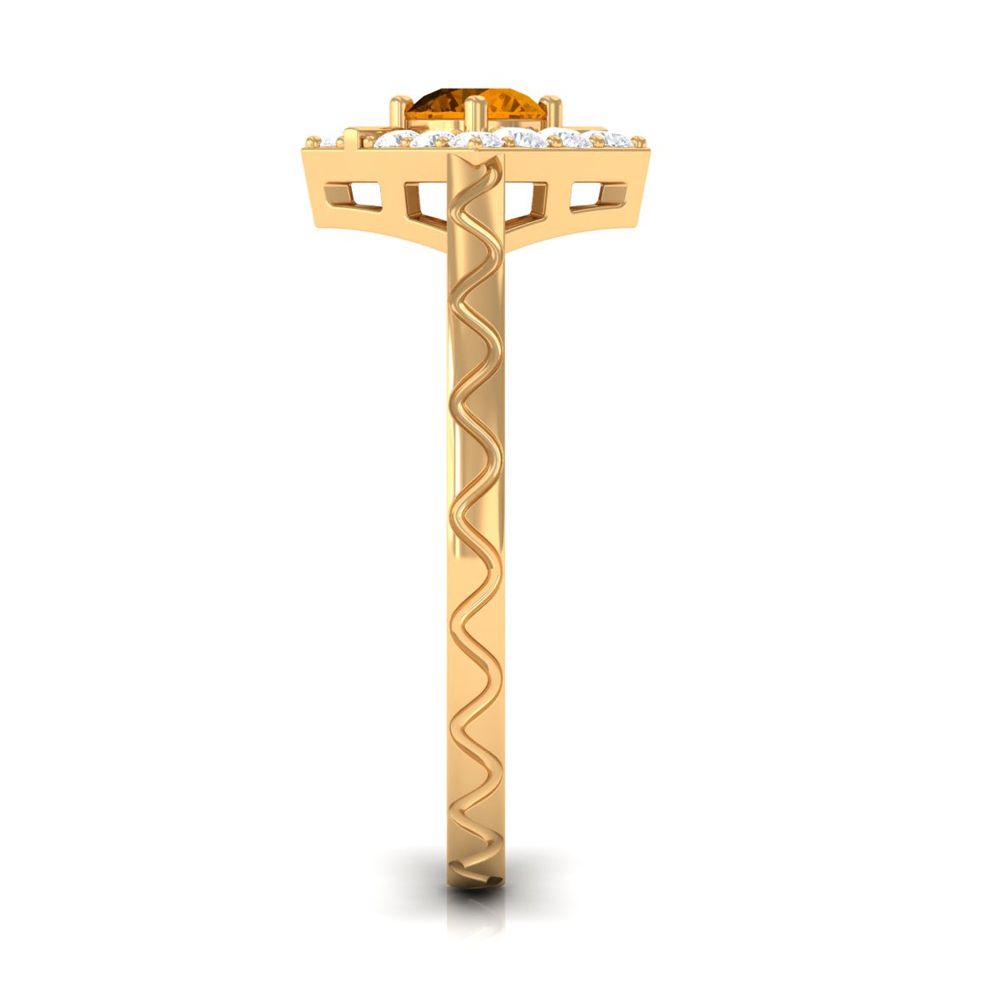 Features a citrine stone, that is a focal point, and small shimmery diamonds add an extra layer of shine & sparkle to the citrine centerpiece. The halo accent enhances the beauty and brilliance of the gem.