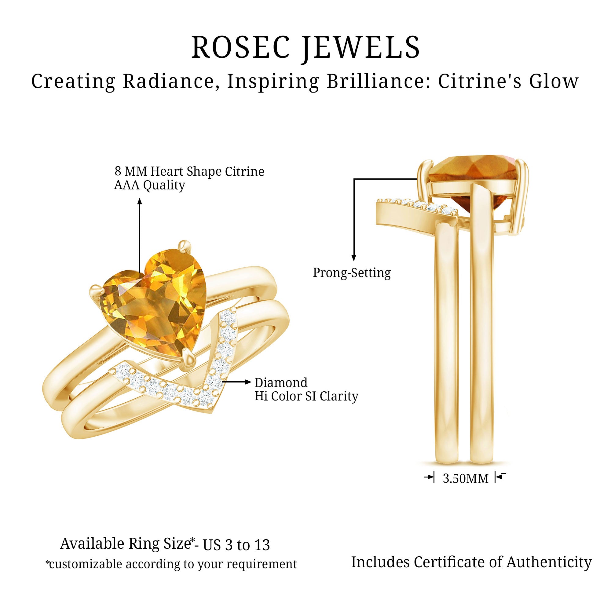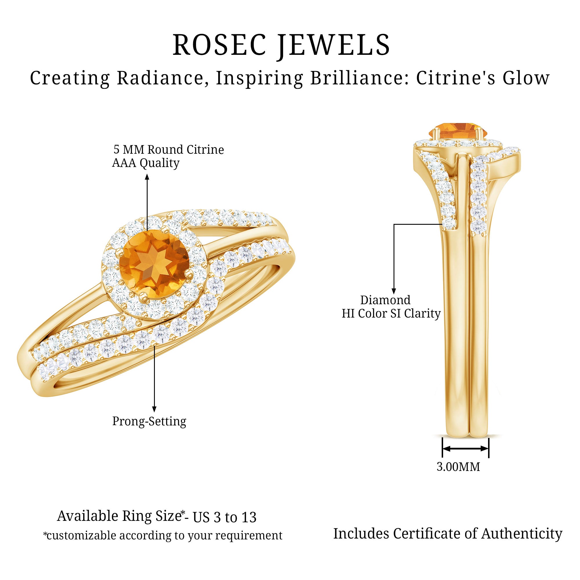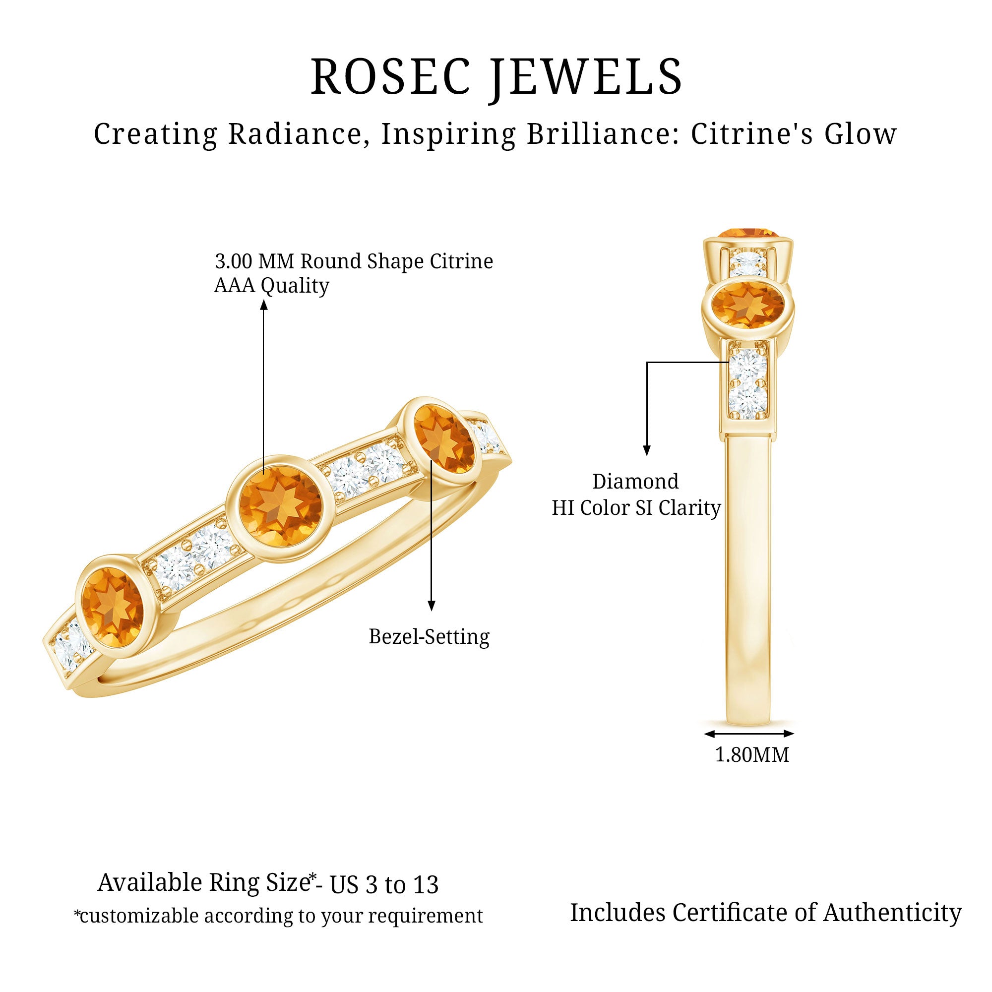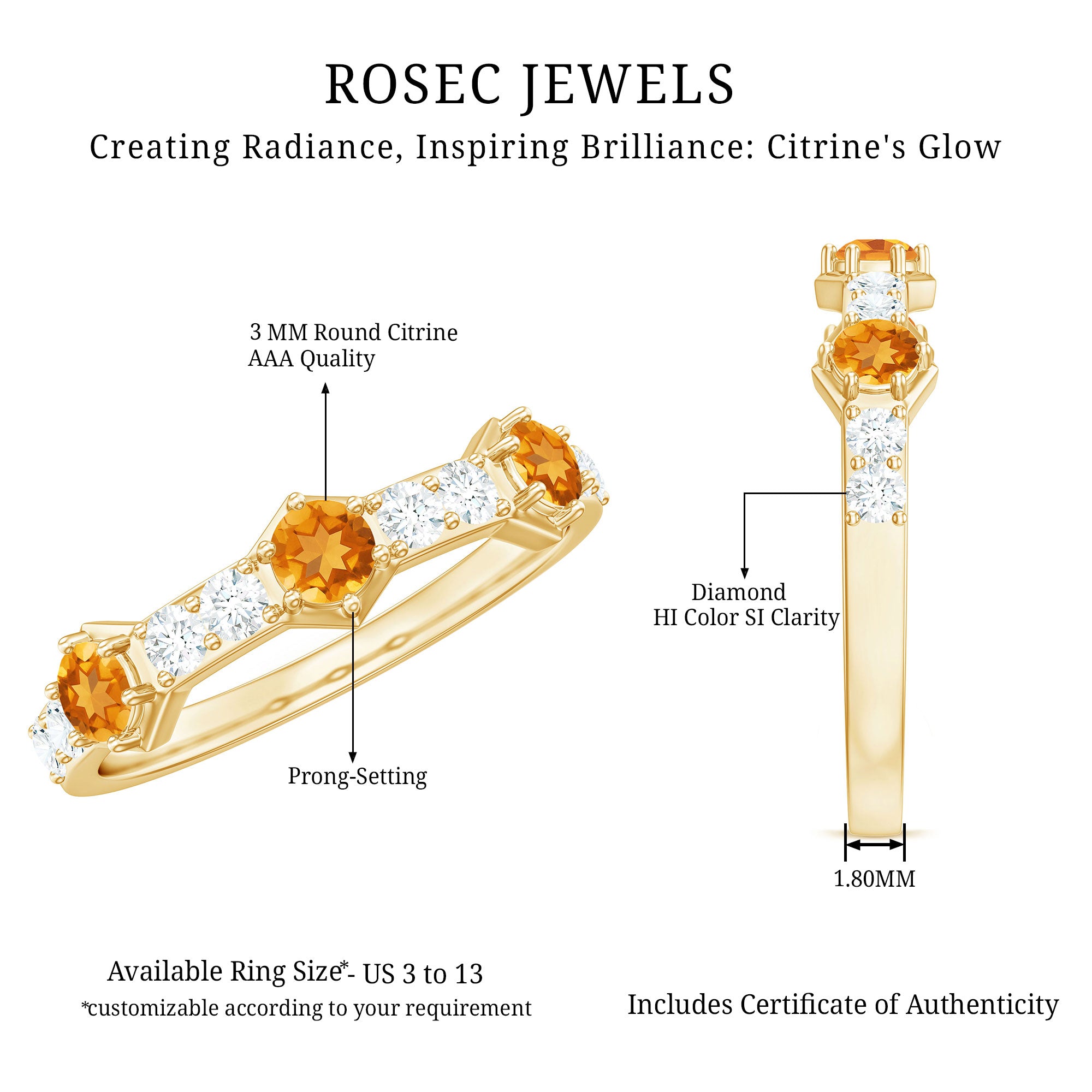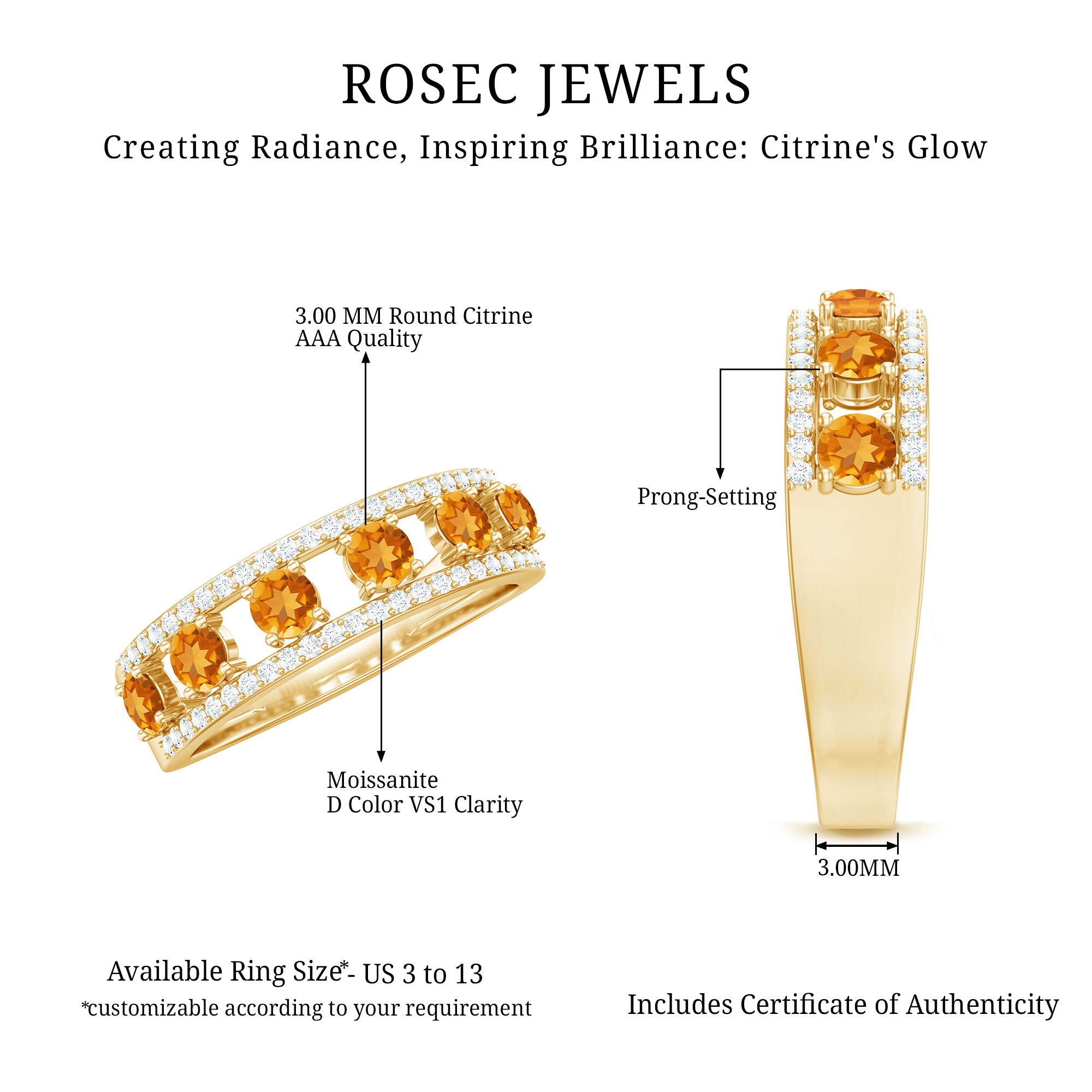 Rosec Jewels’ citrine wedding rings for women are the fruits of fine and excellent craftsmanship of our jewelry experts. In an attempt to create metamorphosis in jewelry for women, we aim towards blending traditions with latest trends to curate citrine rings that will appeal to the women of all class. A further diversification in our wedding ring styles is achieved by experimenting with different colors of citrine gold ring.