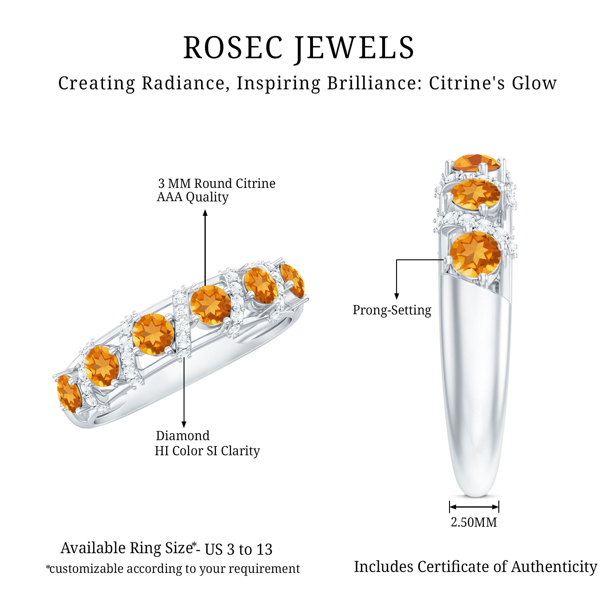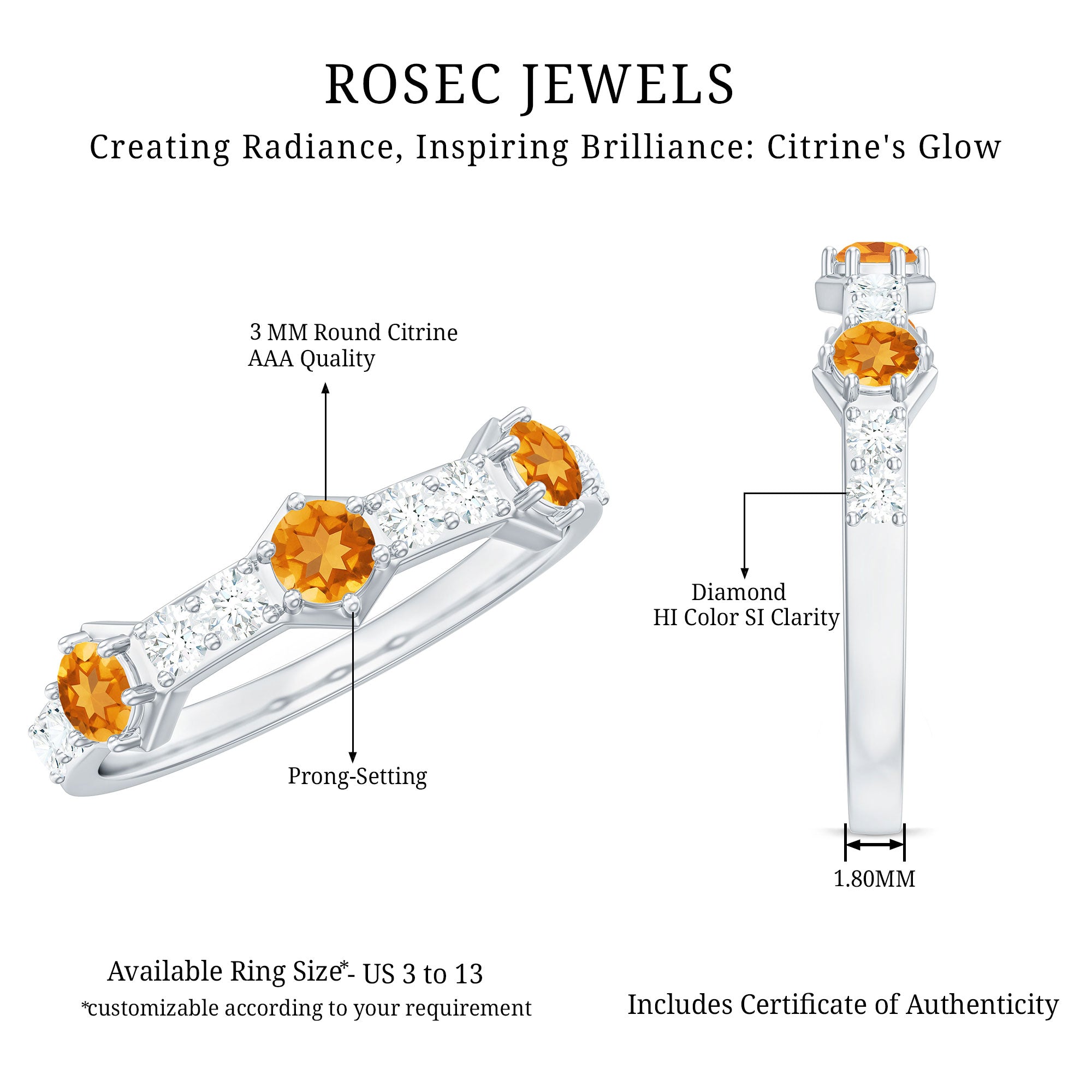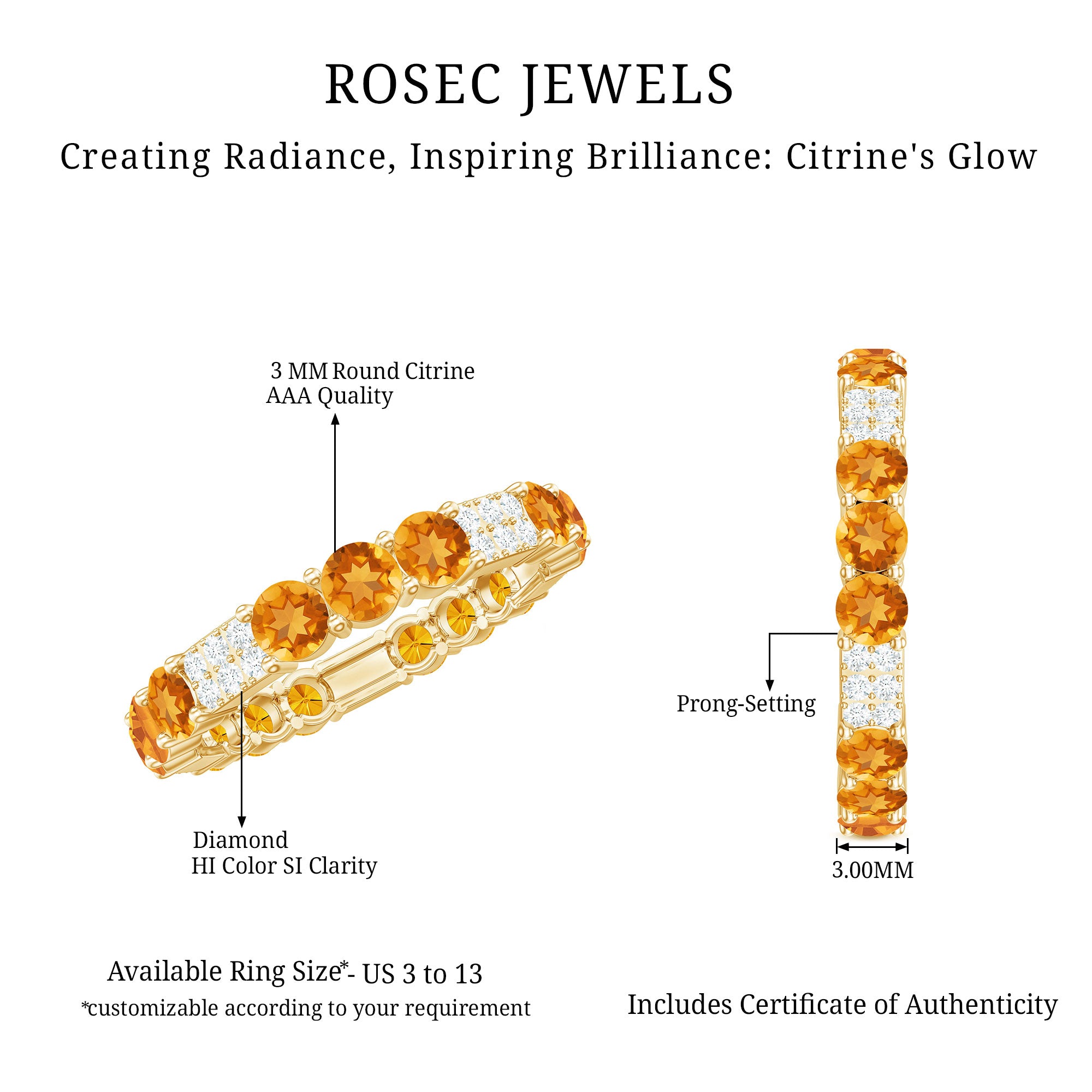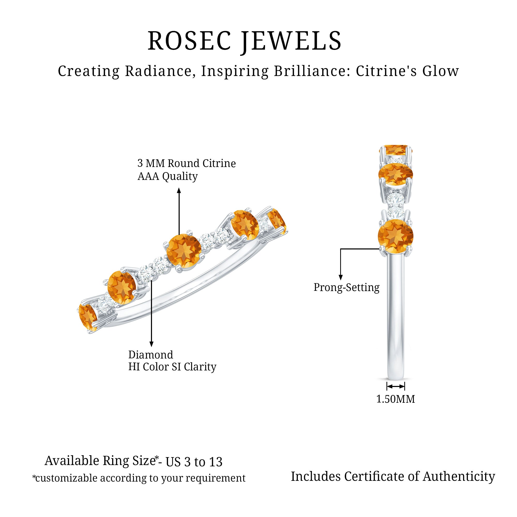 Rosec Jewels’ citrine wedding rings for women are the fruits of fine and excellent craftsmanship of our jewelry experts. In an attempt to create metamorphosis in jewelry for women, we aim towards blending traditions with latest trends to curate citrine rings that will appeal to the women of all class. A further diversification in our wedding ring styles is achieved by experimenting with different colors of citrine gold ring.