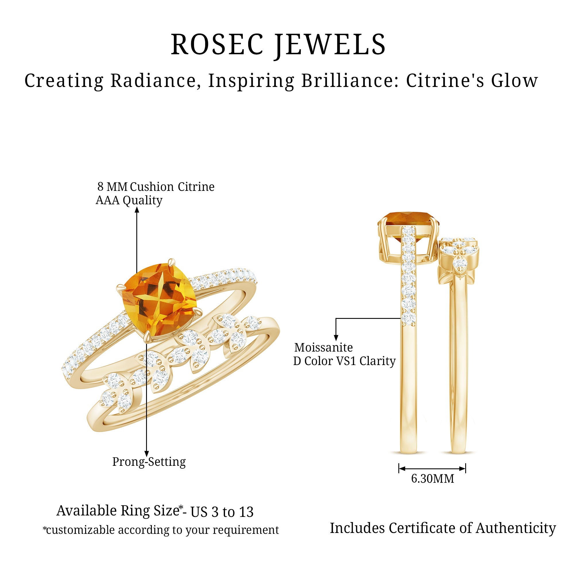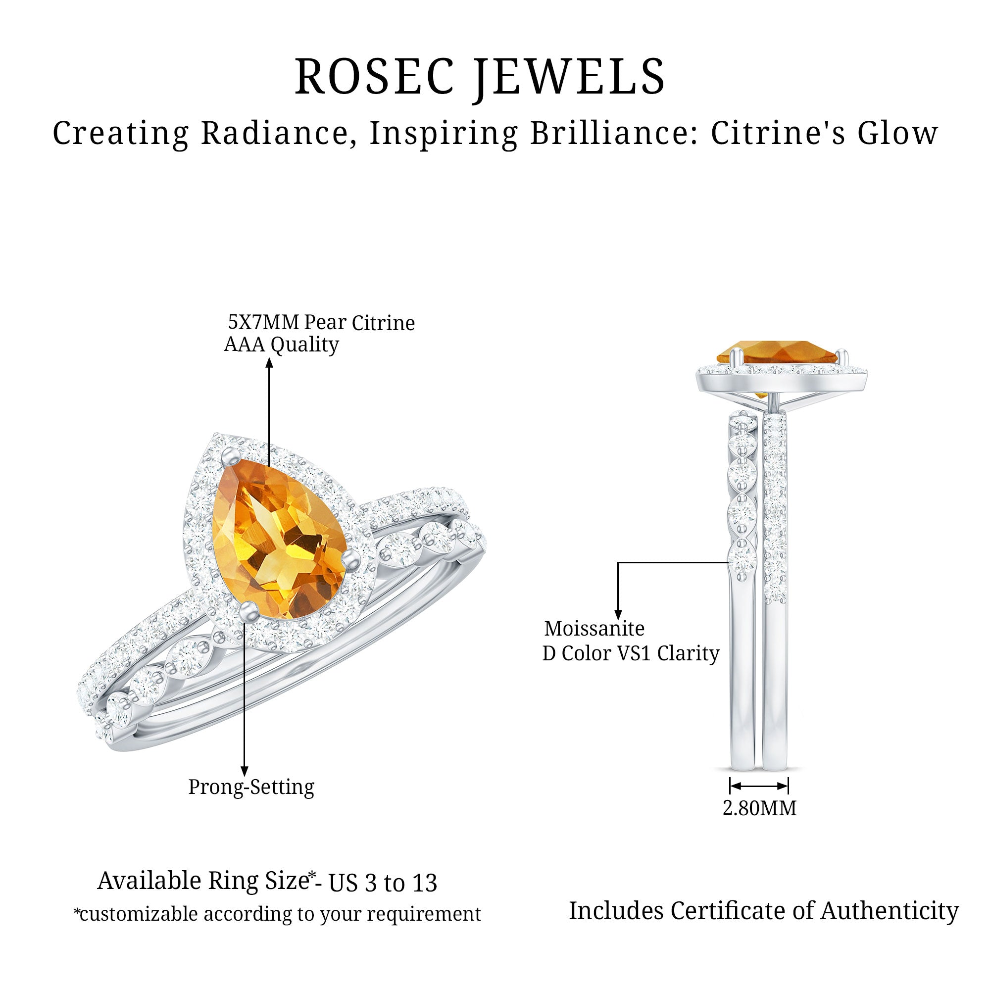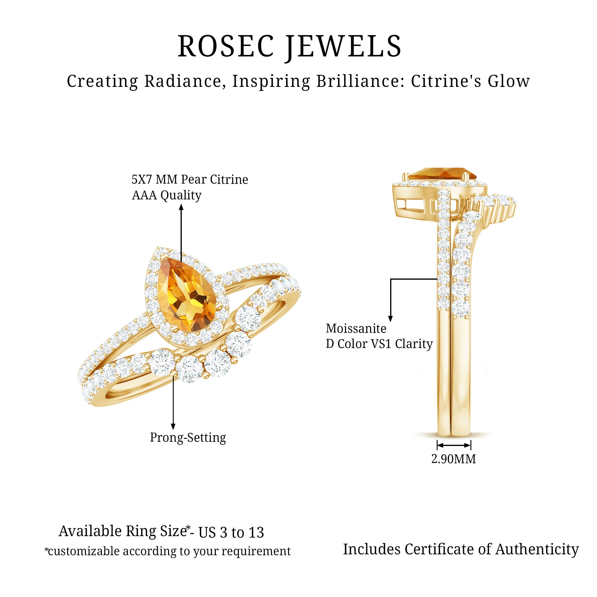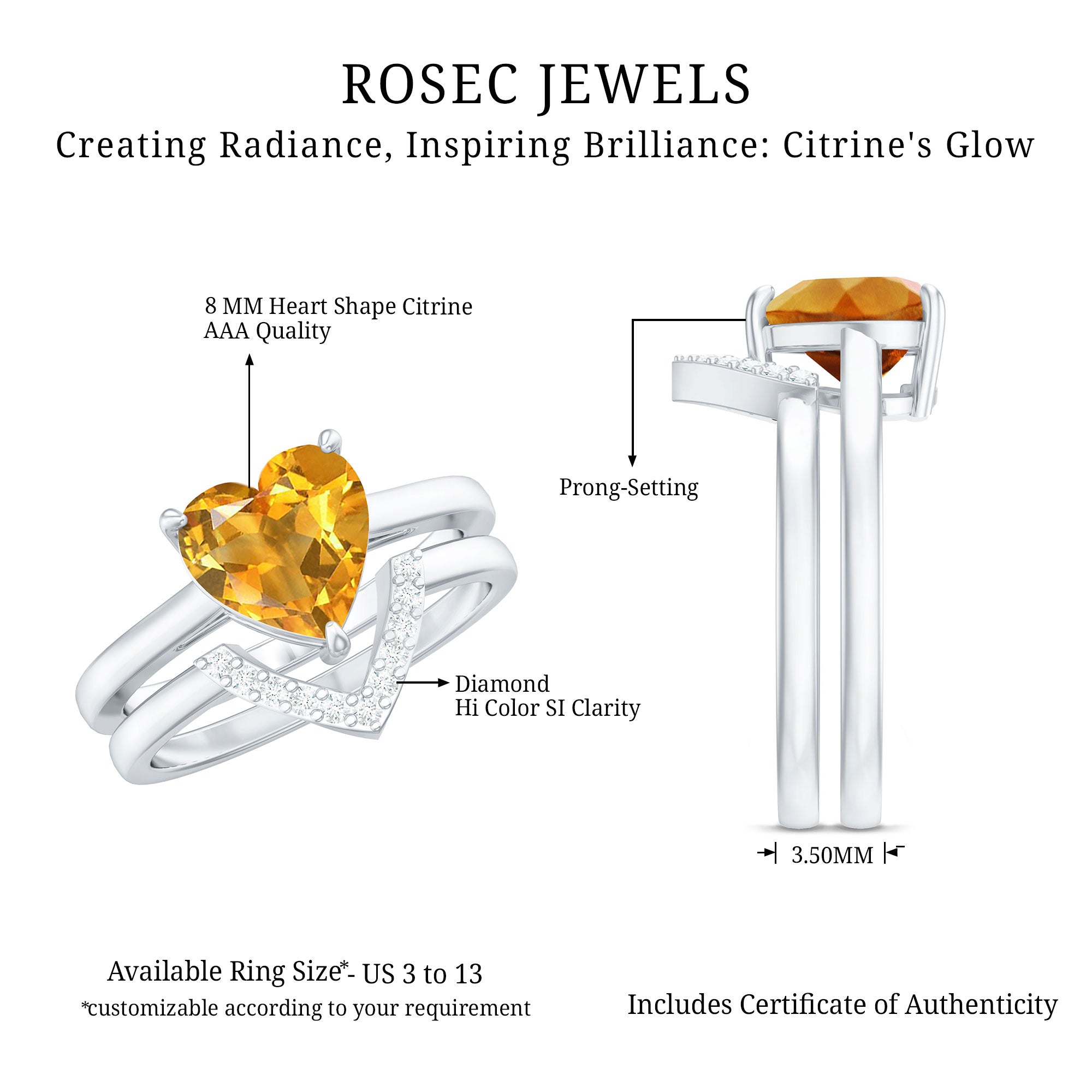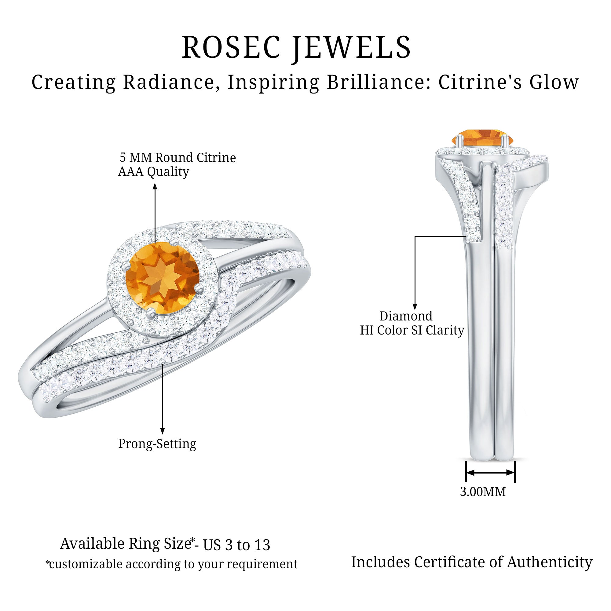 Rosec Jewels’ citrine wedding rings for women are the fruits of fine and excellent craftsmanship of our jewelry experts. In an attempt to create metamorphosis in jewelry for women, we aim towards blending traditions with latest trends to curate citrine rings that will appeal to the women of all class. A further diversification in our wedding ring styles is achieved by experimenting with different colors of citrine gold ring.