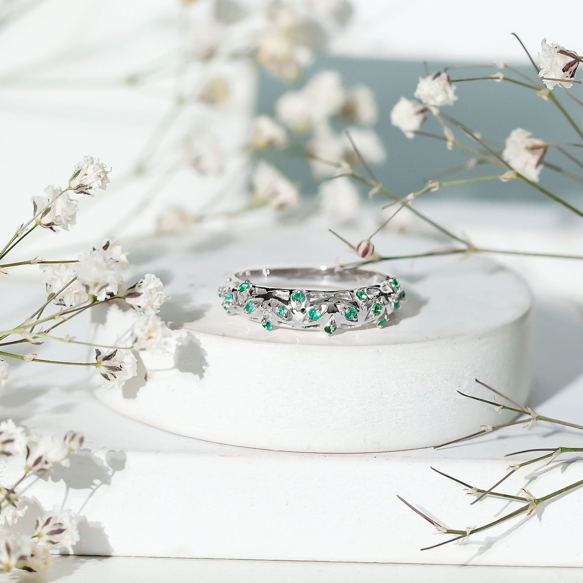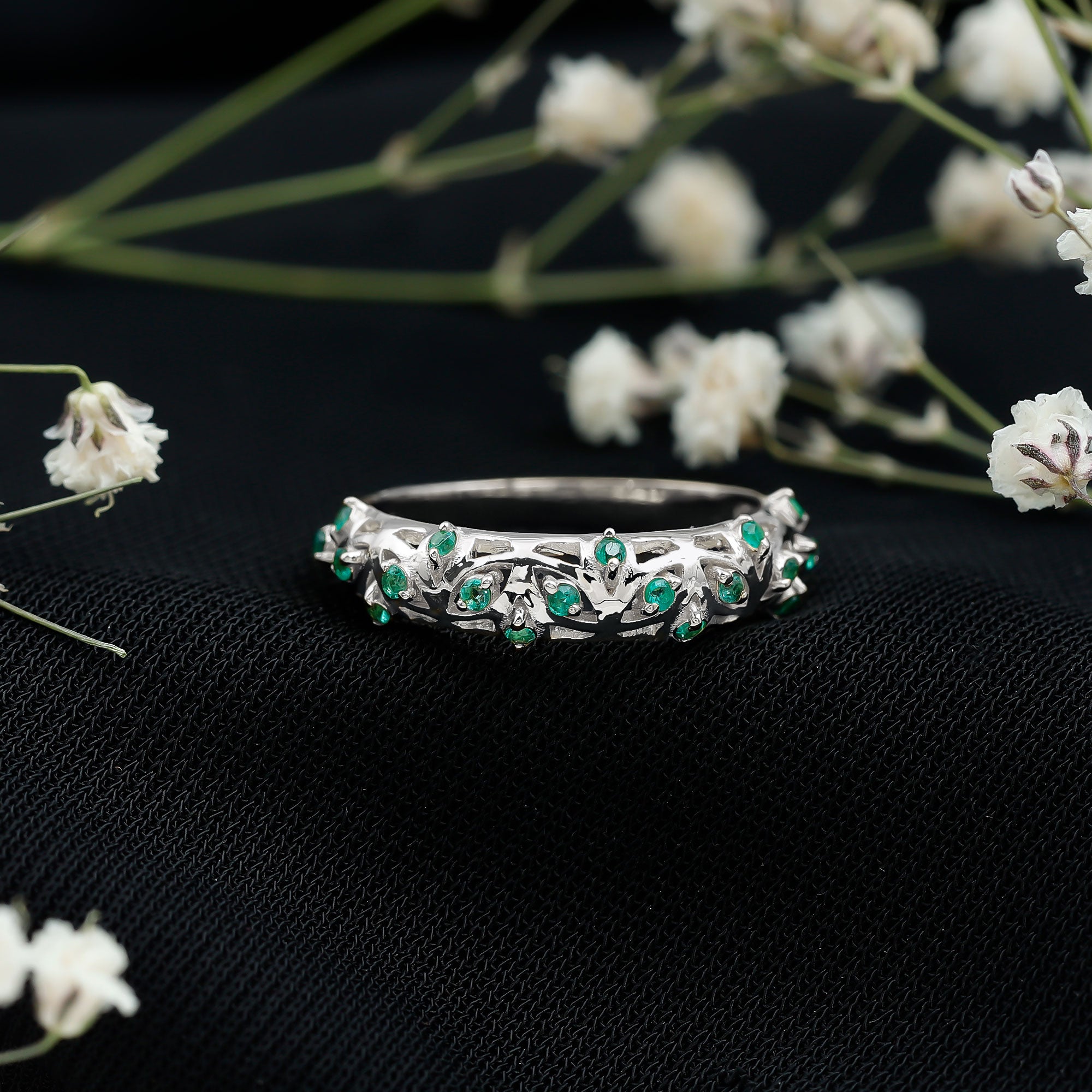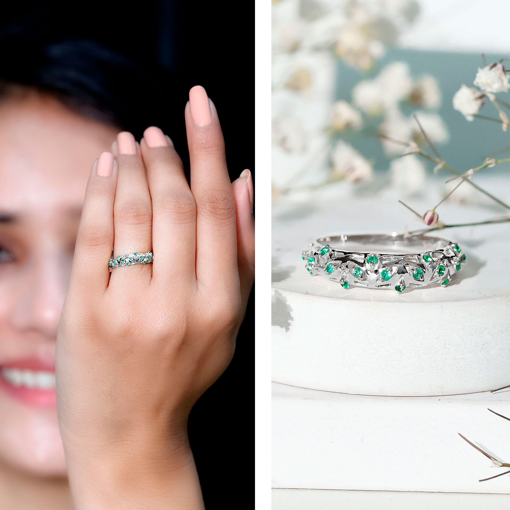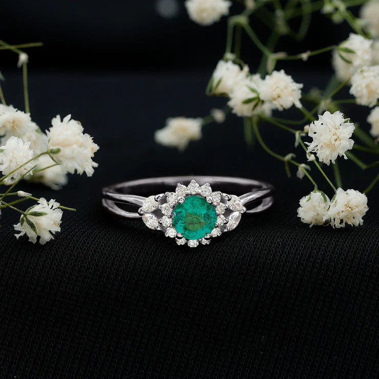 Emerald Nature Inspired Rings: - Commonly feature designs inspired by the natural world, showcasing evocative flowers and leaves. The sleek design of a flower emerald ring features a green emerald that reflects the rich colors found in earth's nature. A symbol of renewal, growth, and harmony, our exquisite nature-inspired rings ensure beauty and timeless allure. The nature-themed emerald leaf ring is a fashionable option for nature and jewelry lovers.