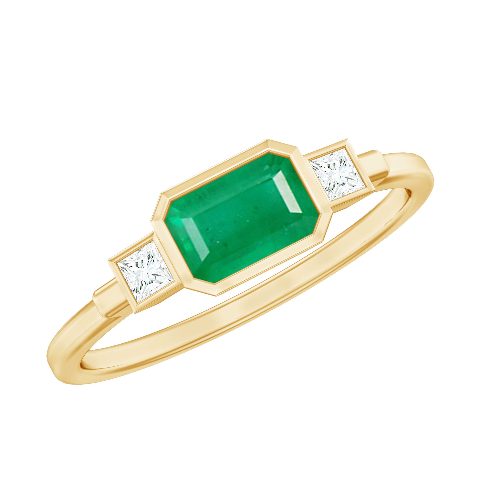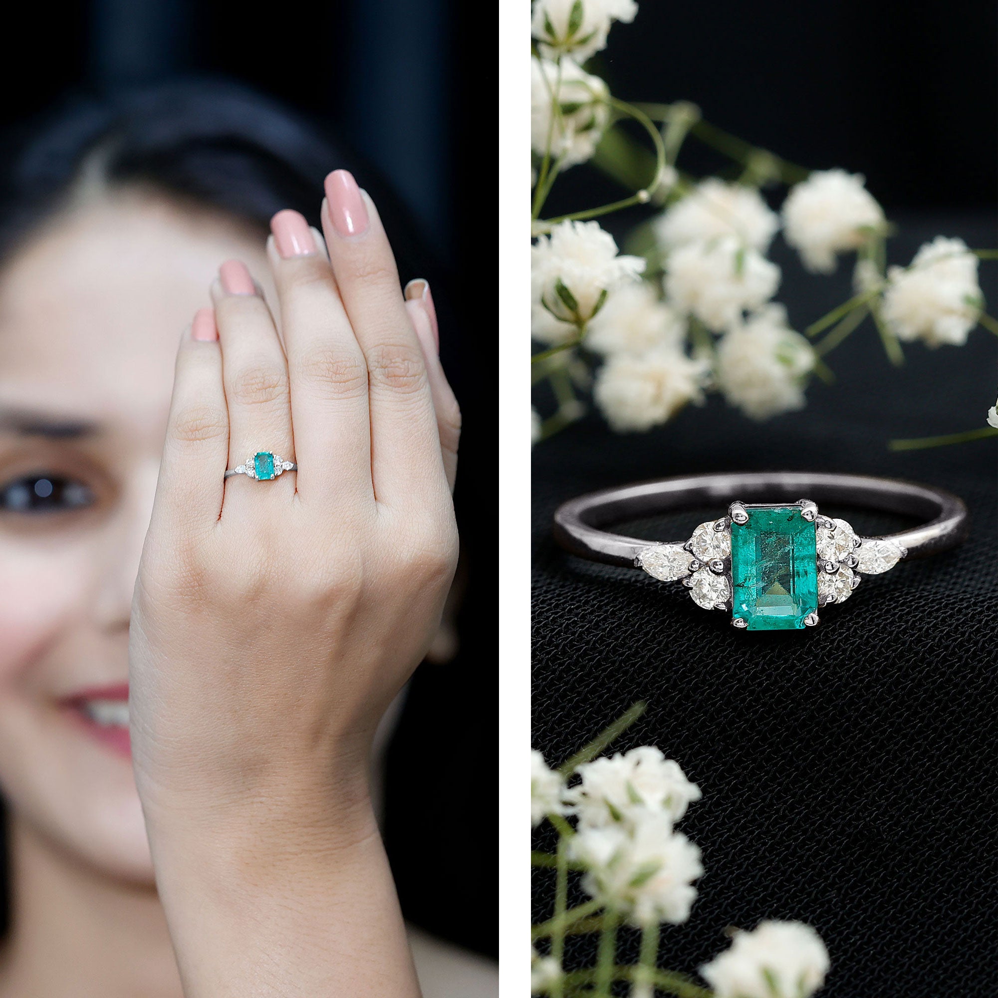Emerald promise rings: - Symbolize love, loyalty, and commitment. They are beautiful and represent lasting love. Craft each piece with white gold or yellow gold metal and give it as a promising token to your partners. The emerald ring's intense and vibrant color adds elegance and significant meaning to the heartfelt gesture.