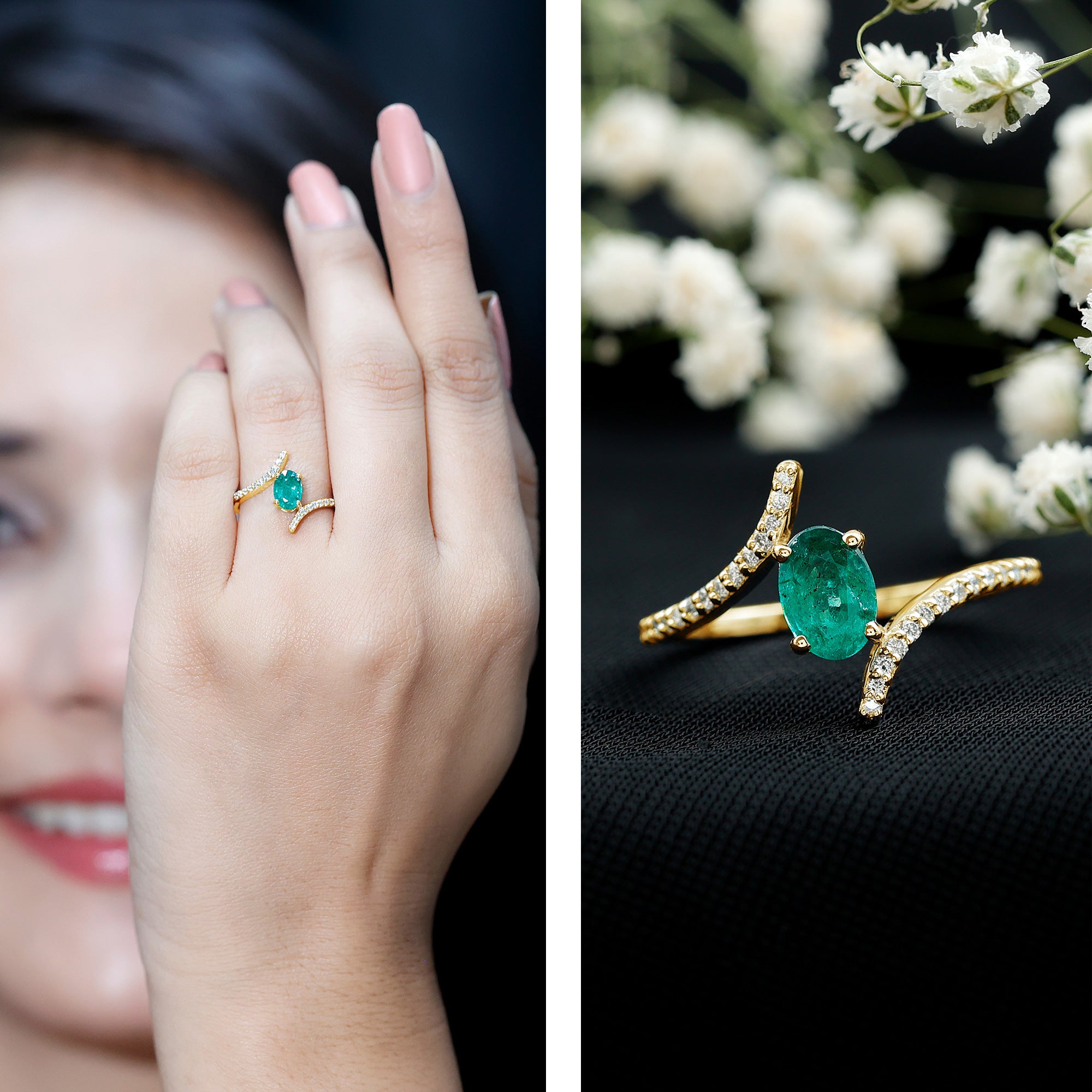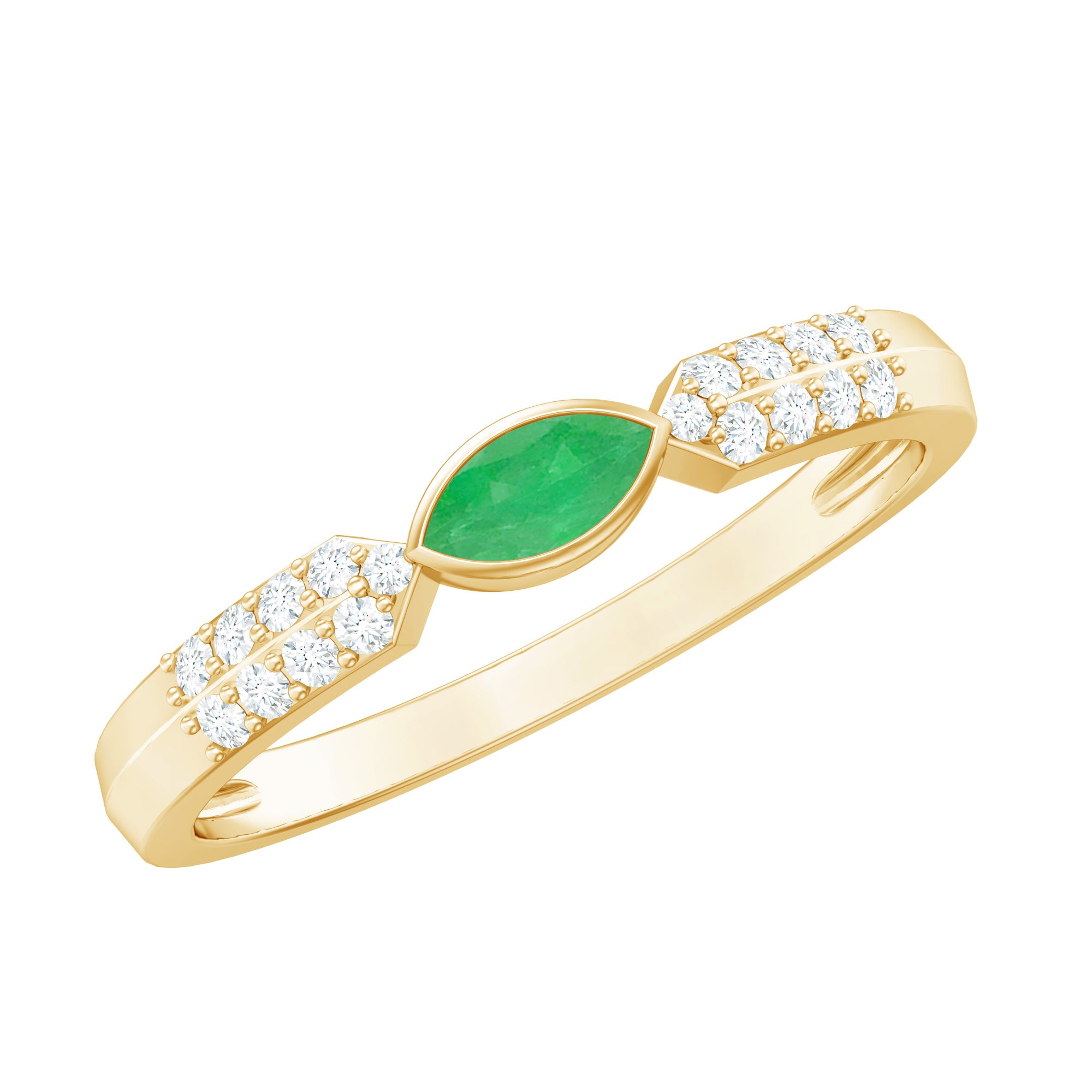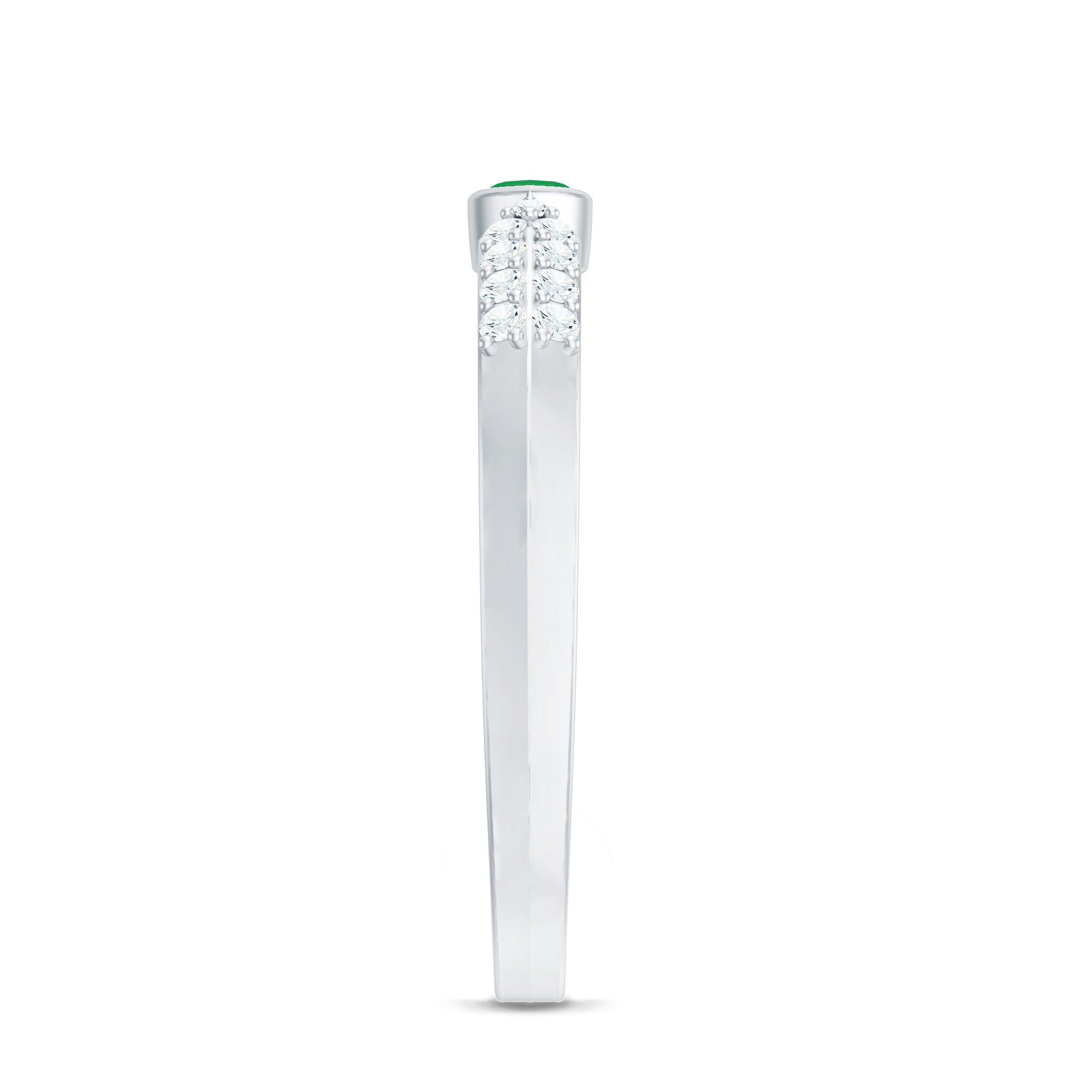 Emerald promise rings: - Symbolize love, loyalty, and commitment. They are beautiful and represent lasting love. Craft each piece with white gold or yellow gold metal and give it as a promising token to your partners. The emerald ring's intense and vibrant color adds elegance and significant meaning to the heartfelt gesture.