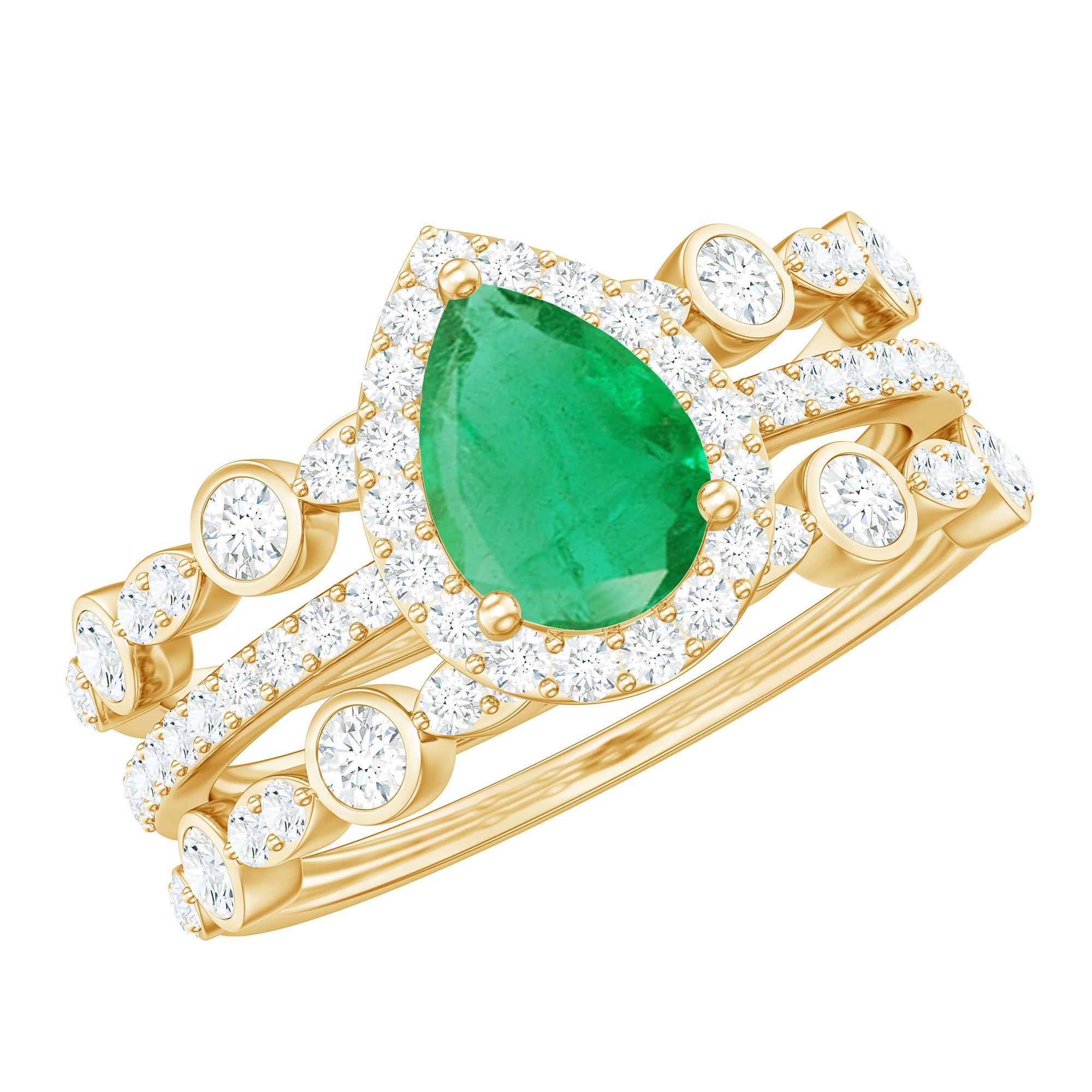 Lastly, think of colored gemstones studded with unique patterned, geometric designs, and one-of-a-kind designs. These rings are typically called modern emerald wedding rings.
