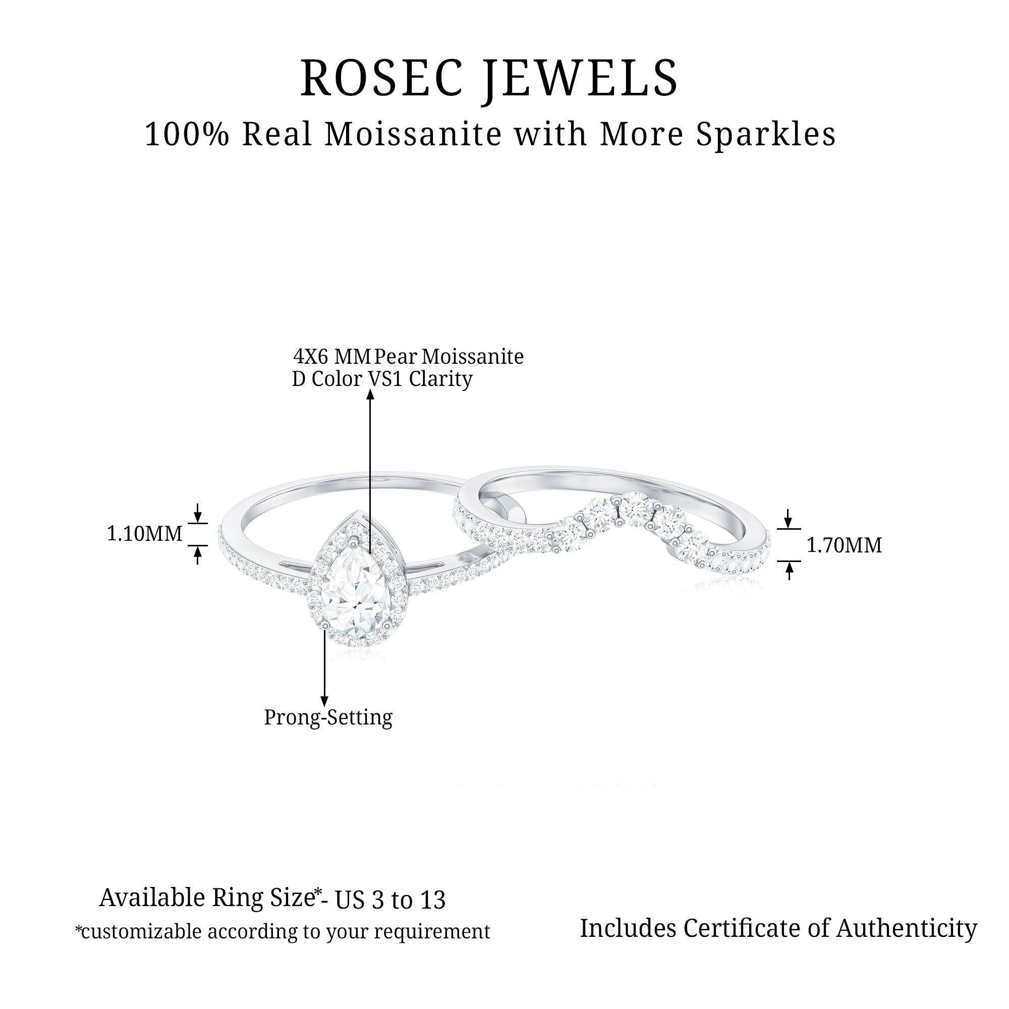 Pear Shaped Engagement Rings: Pear rings or teardrop rings feature gemstone which is a mix of round and marquise shape. This shape with a pointed end looks elongated and looks great with stacked diamond or moissanite bands.