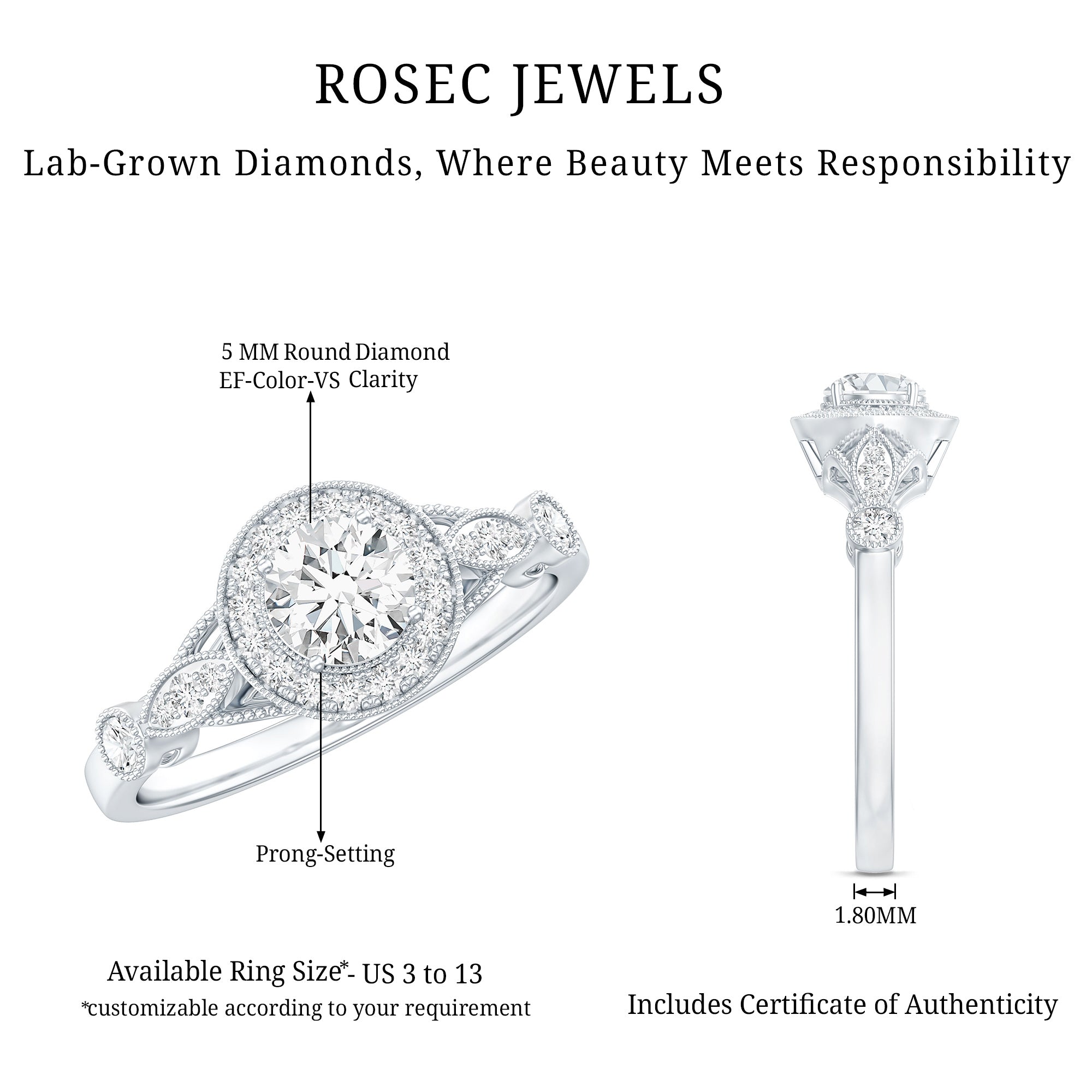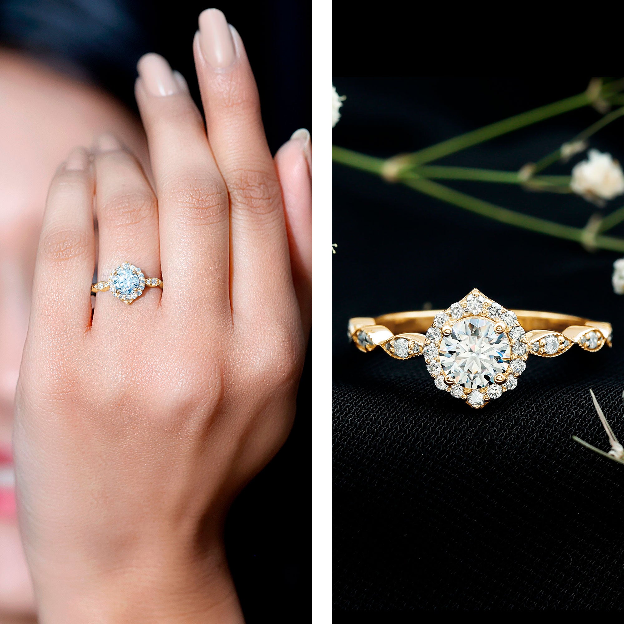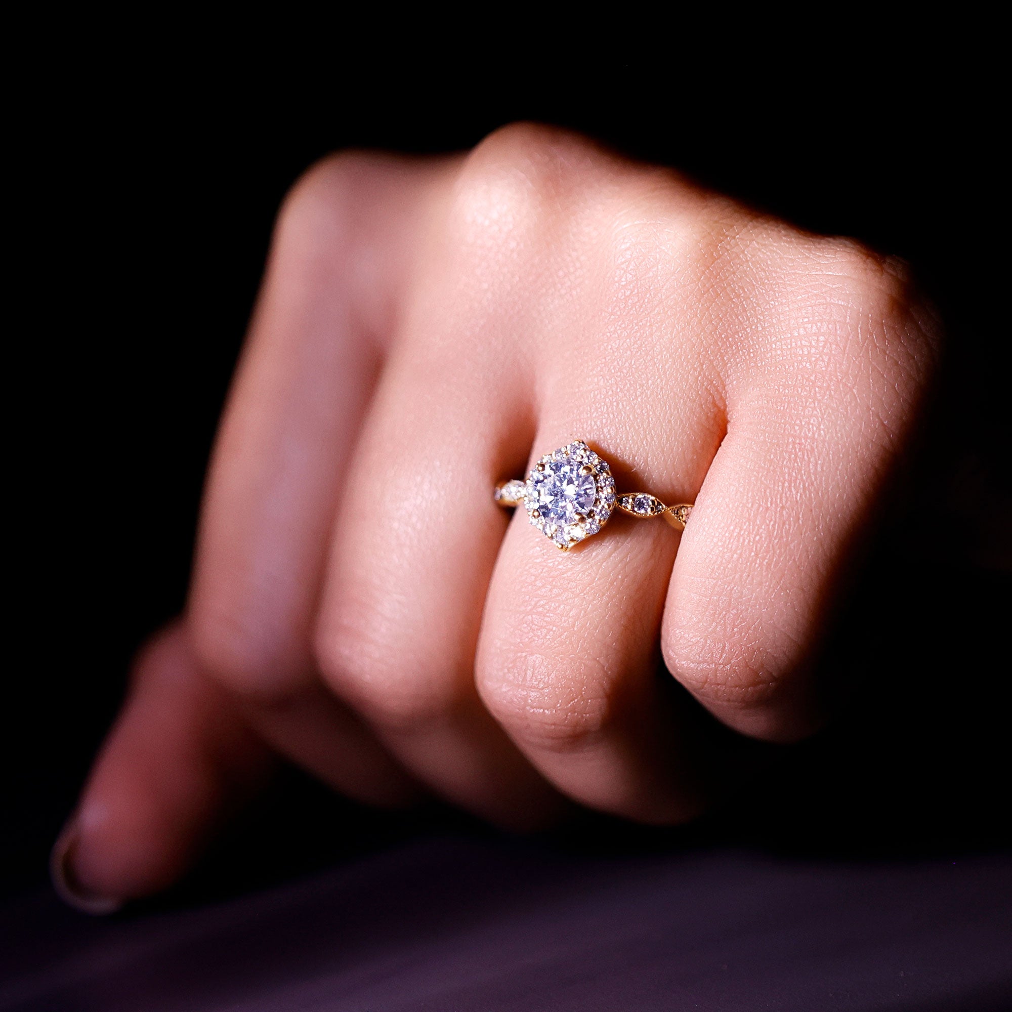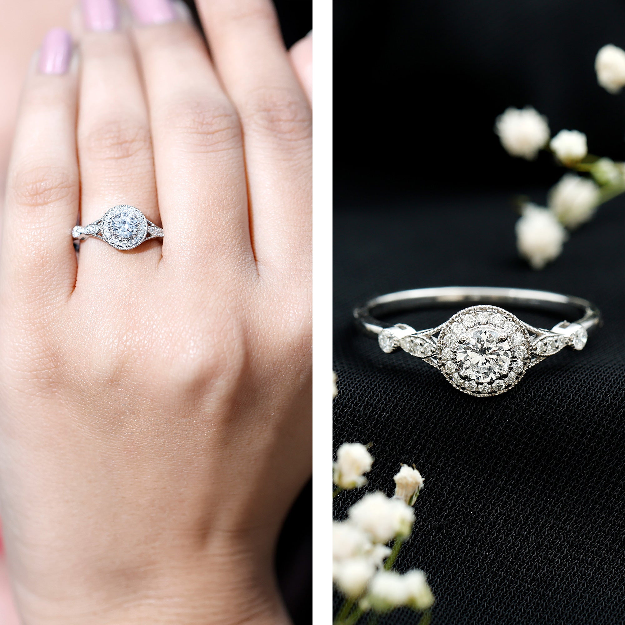 - Setting: Solitaire highlights the center stone, while halo adds visual size and brilliance.