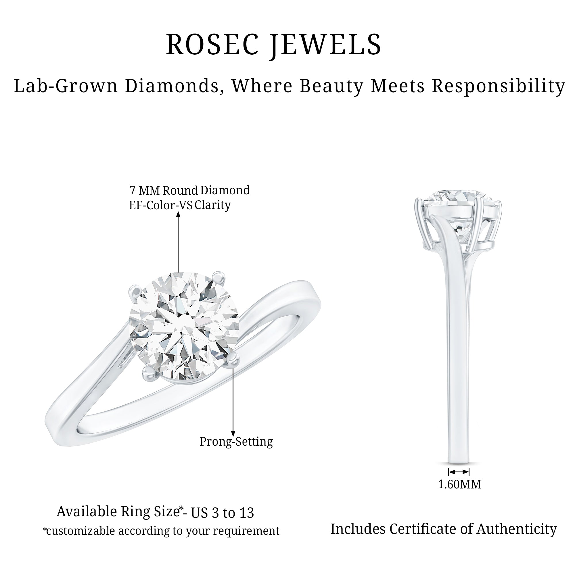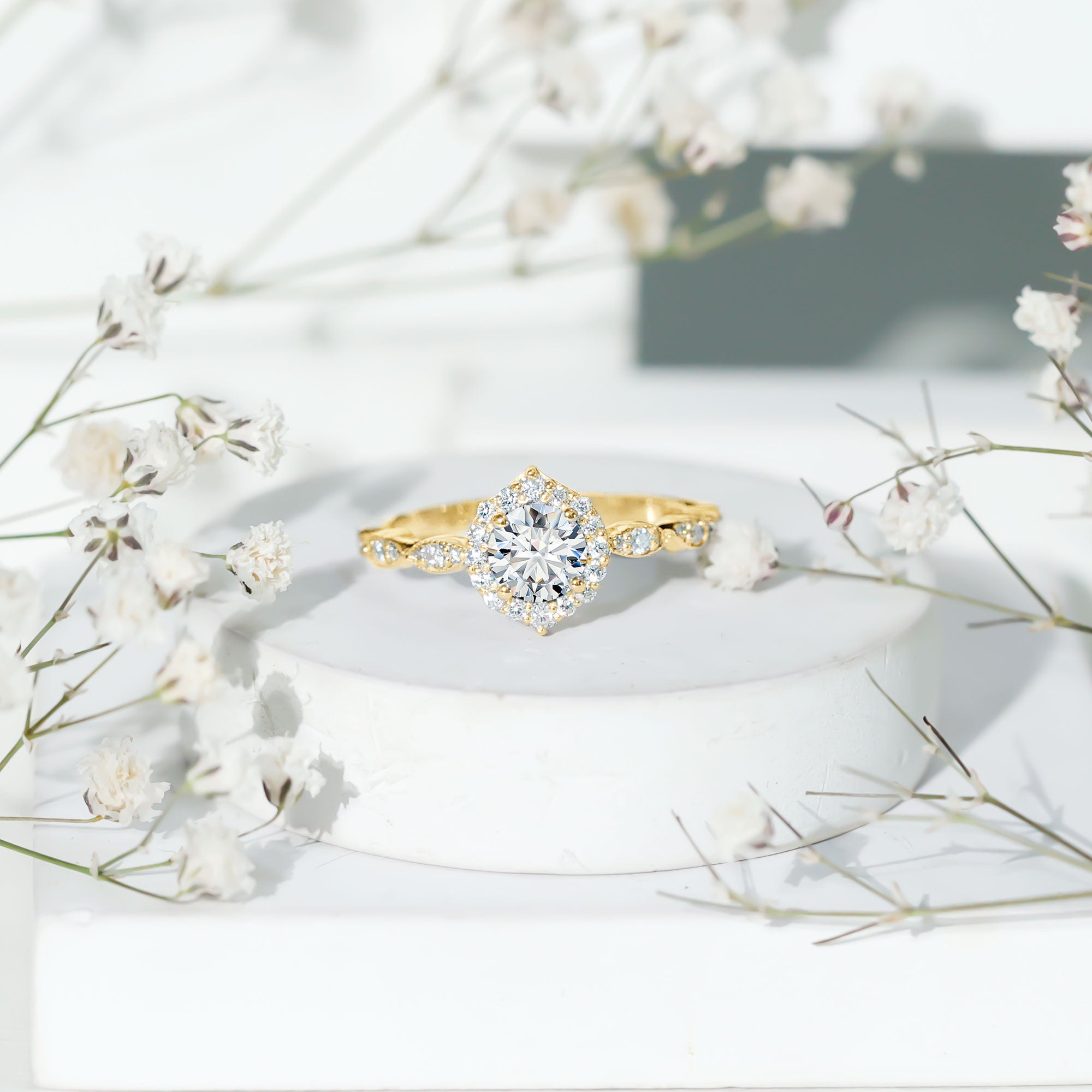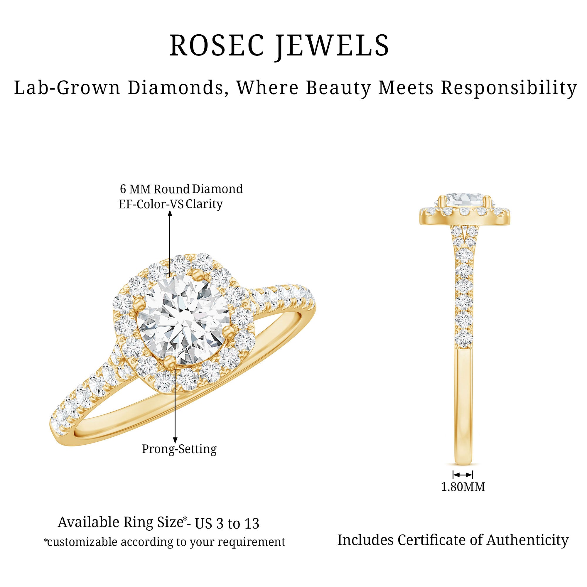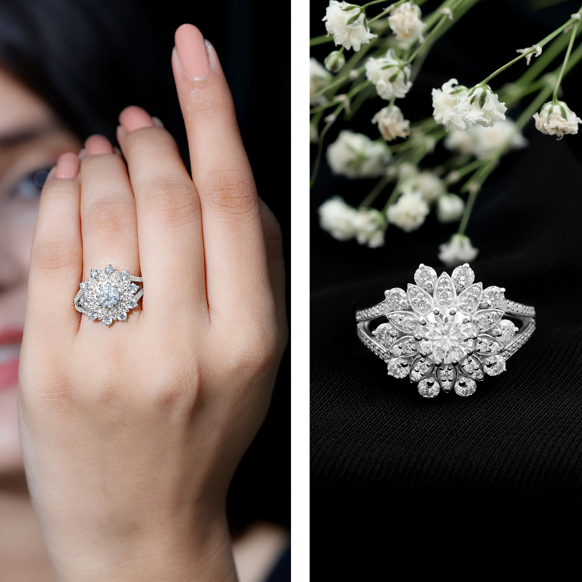 - Setting: Solitaire highlights the center stone, while halo adds visual size and brilliance.