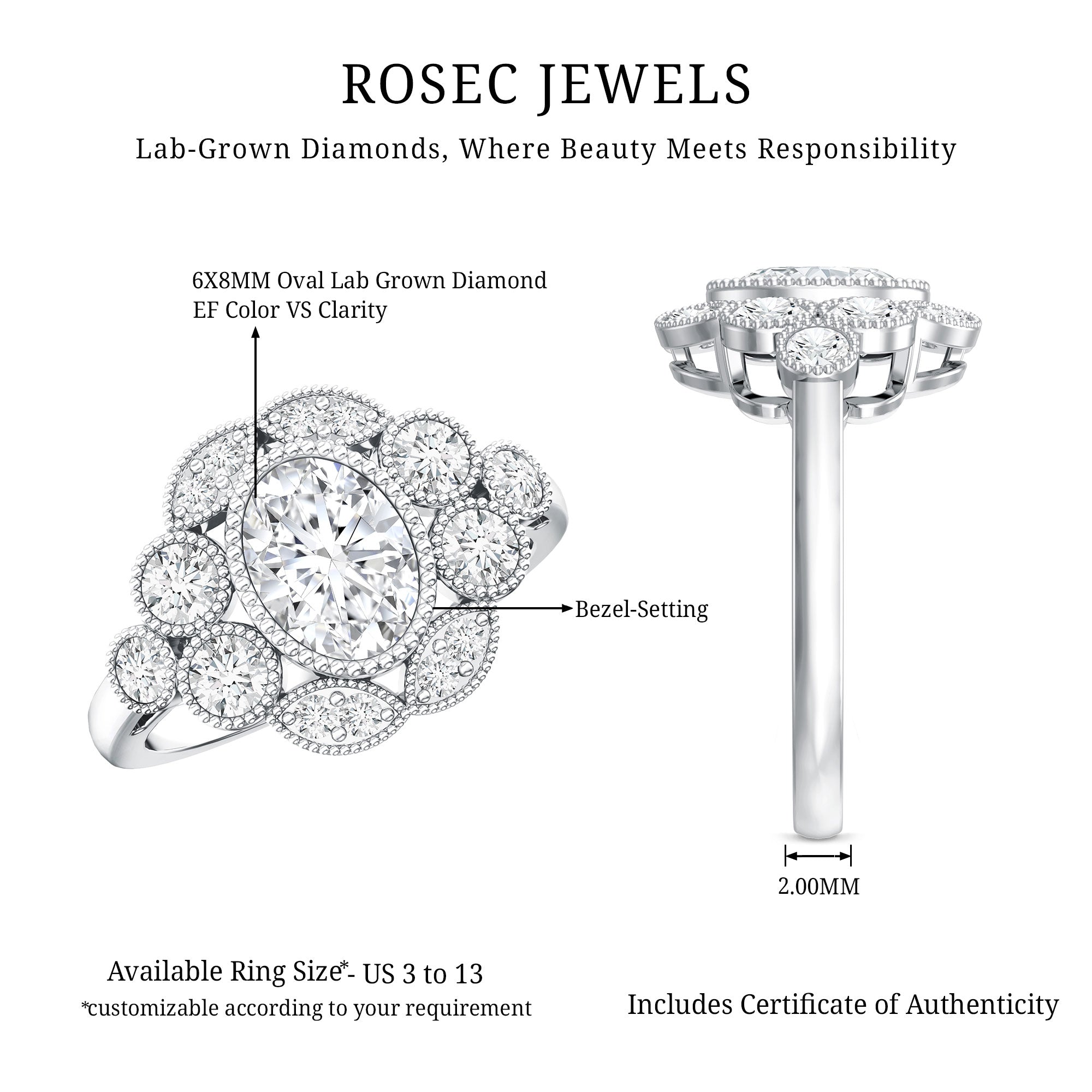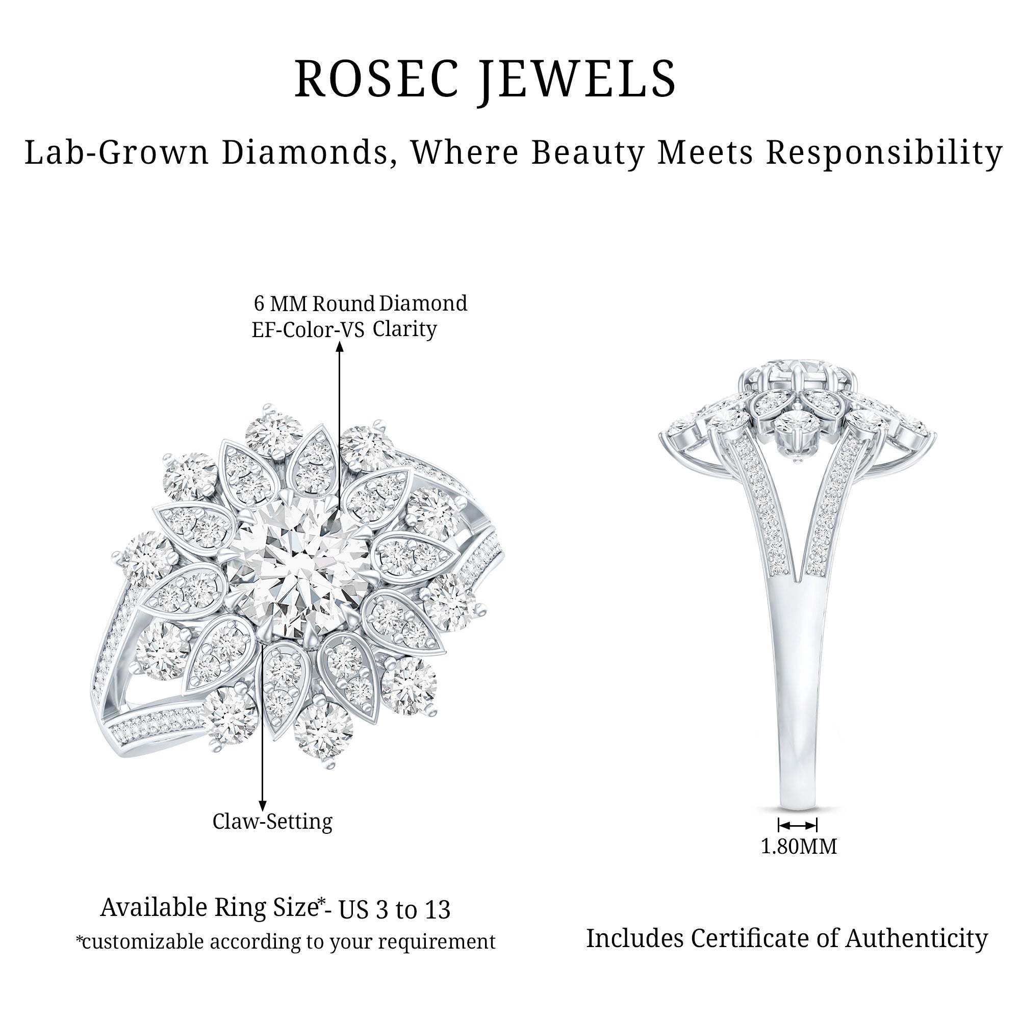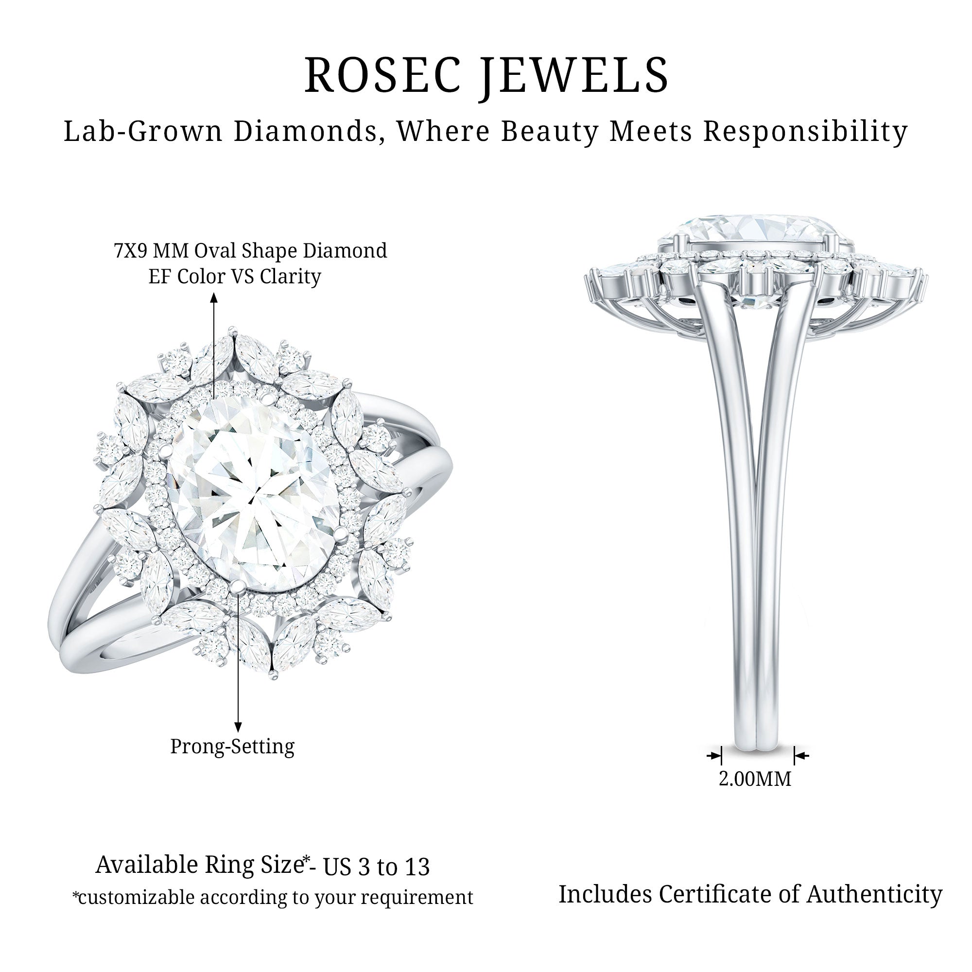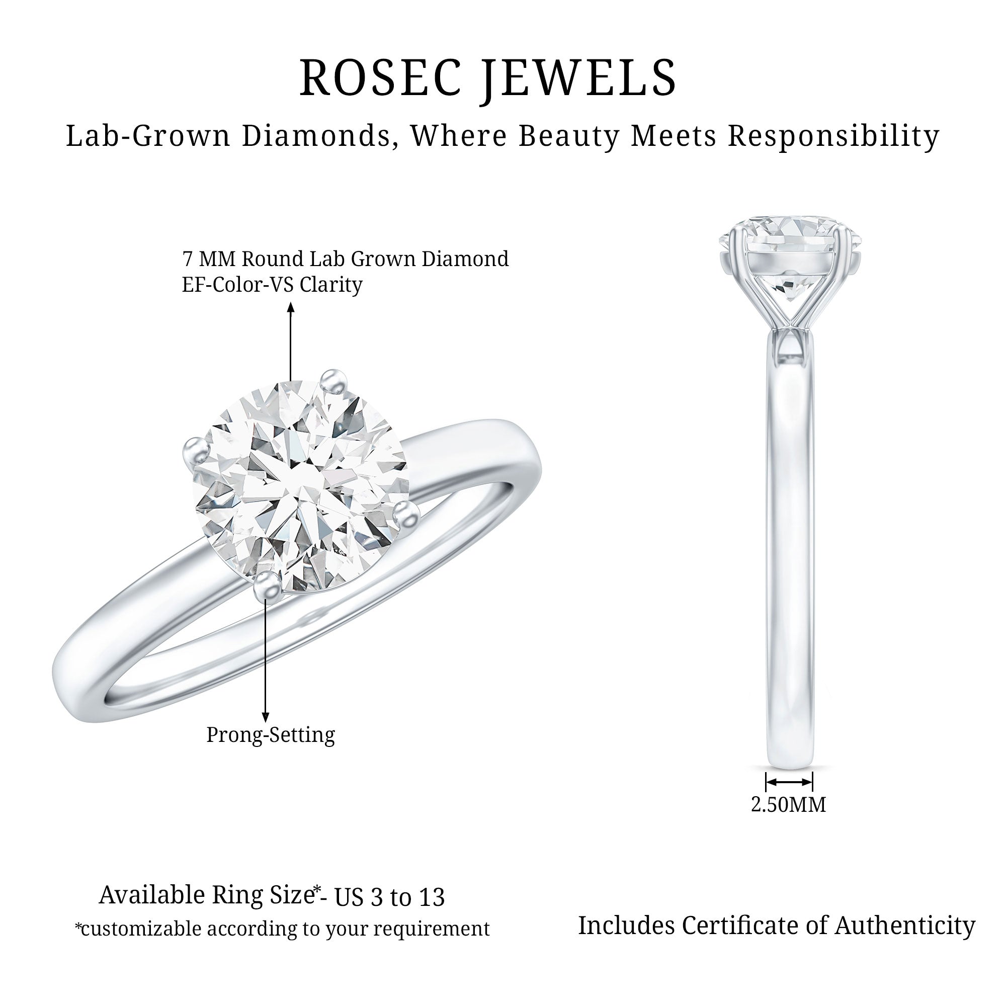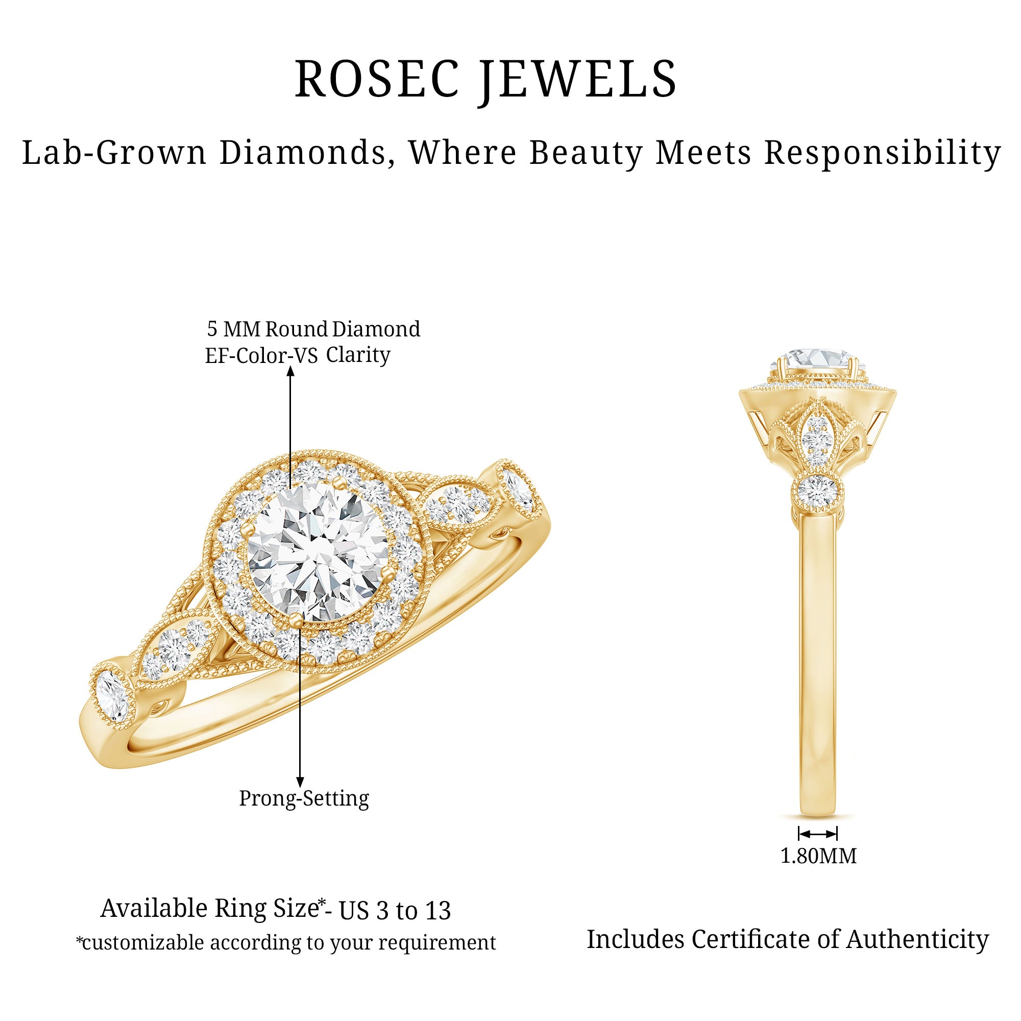- Setting: Solitaire highlights the center stone, while halo adds visual size and brilliance.