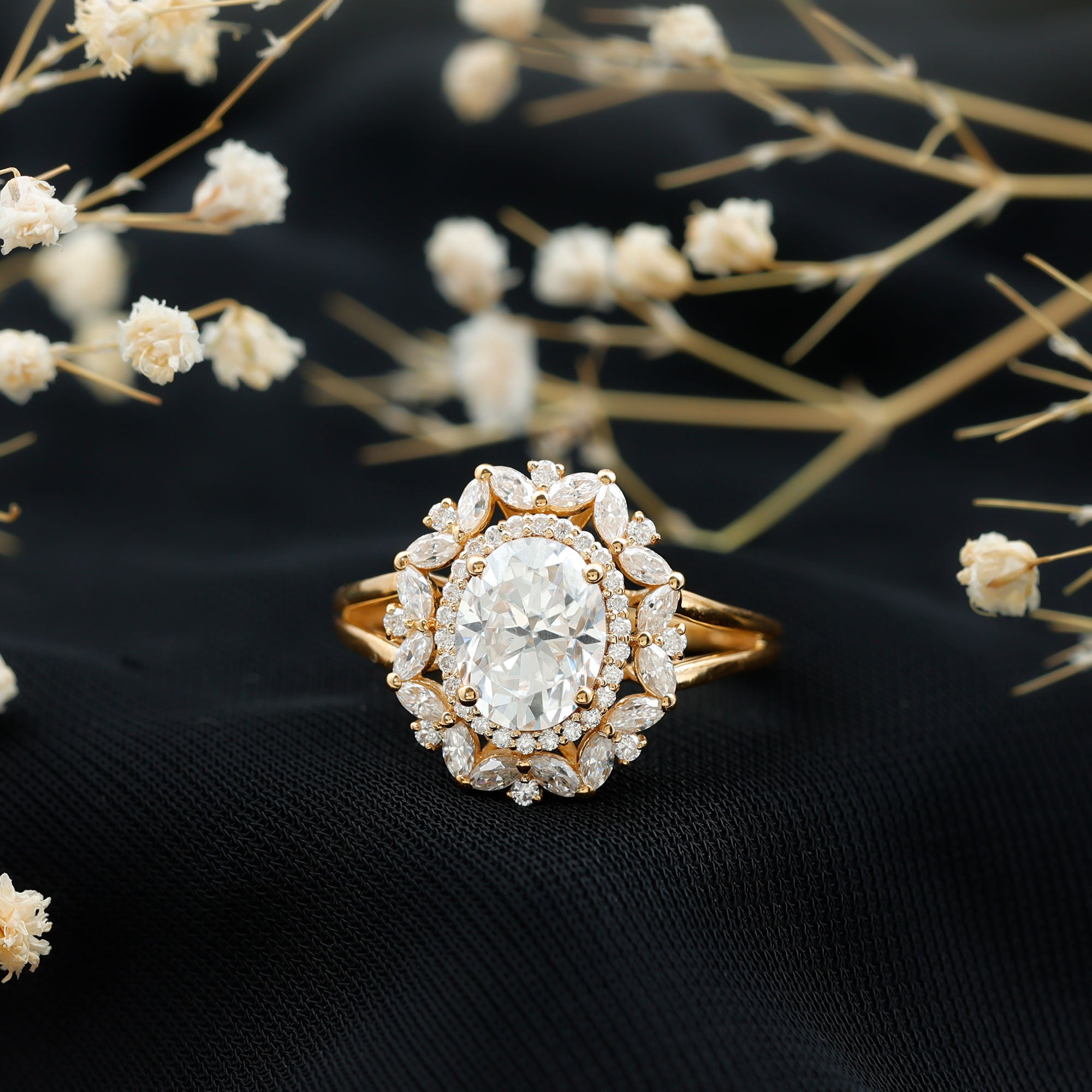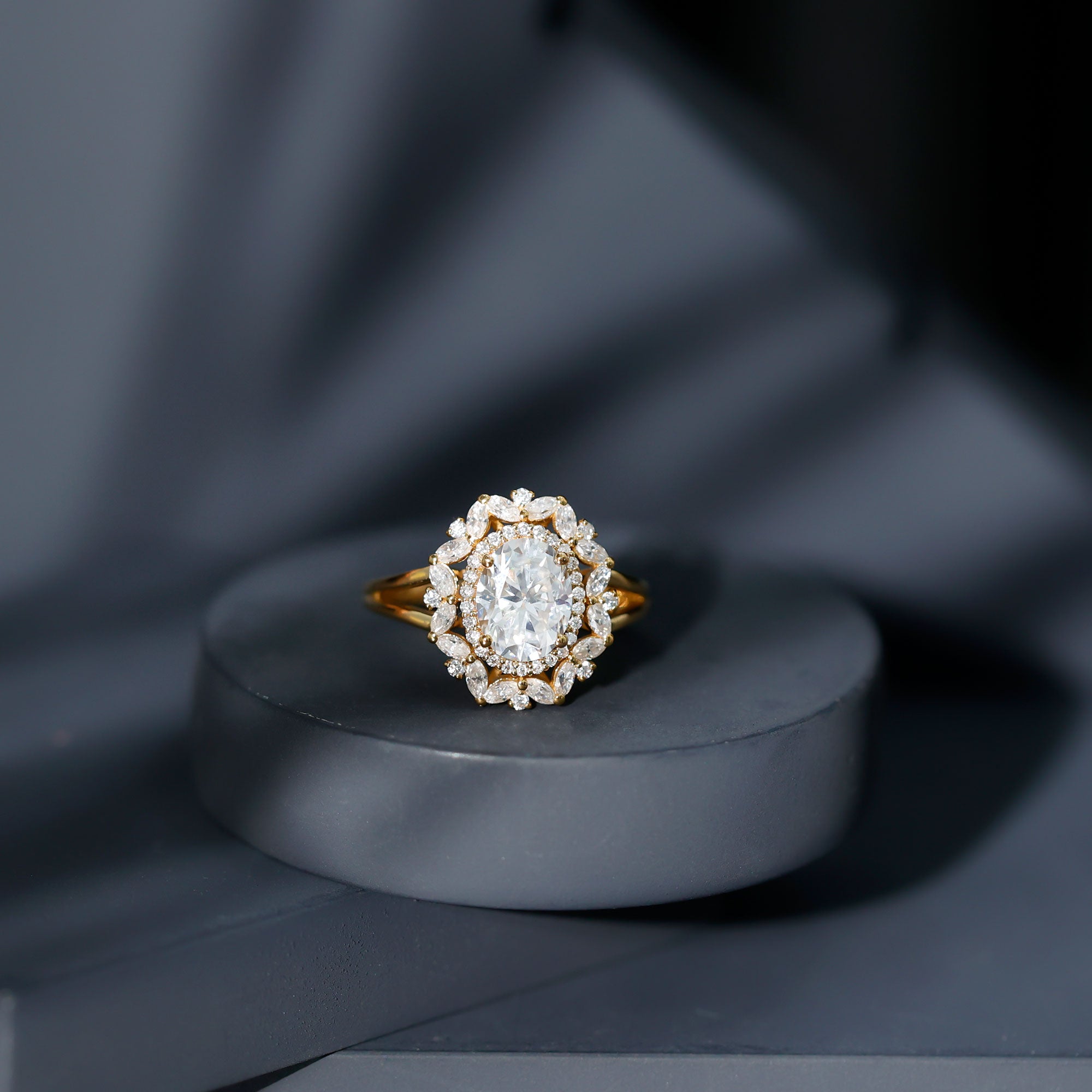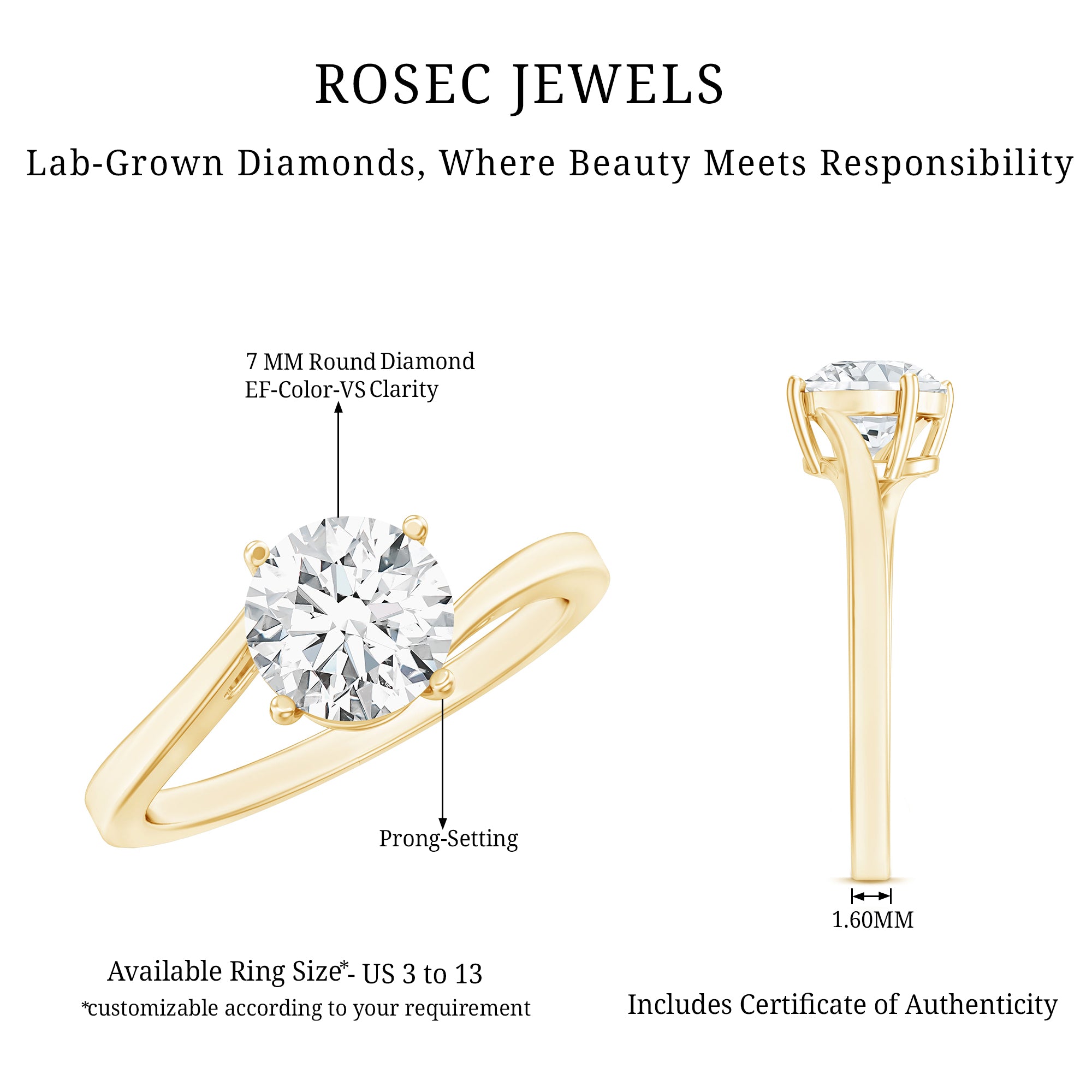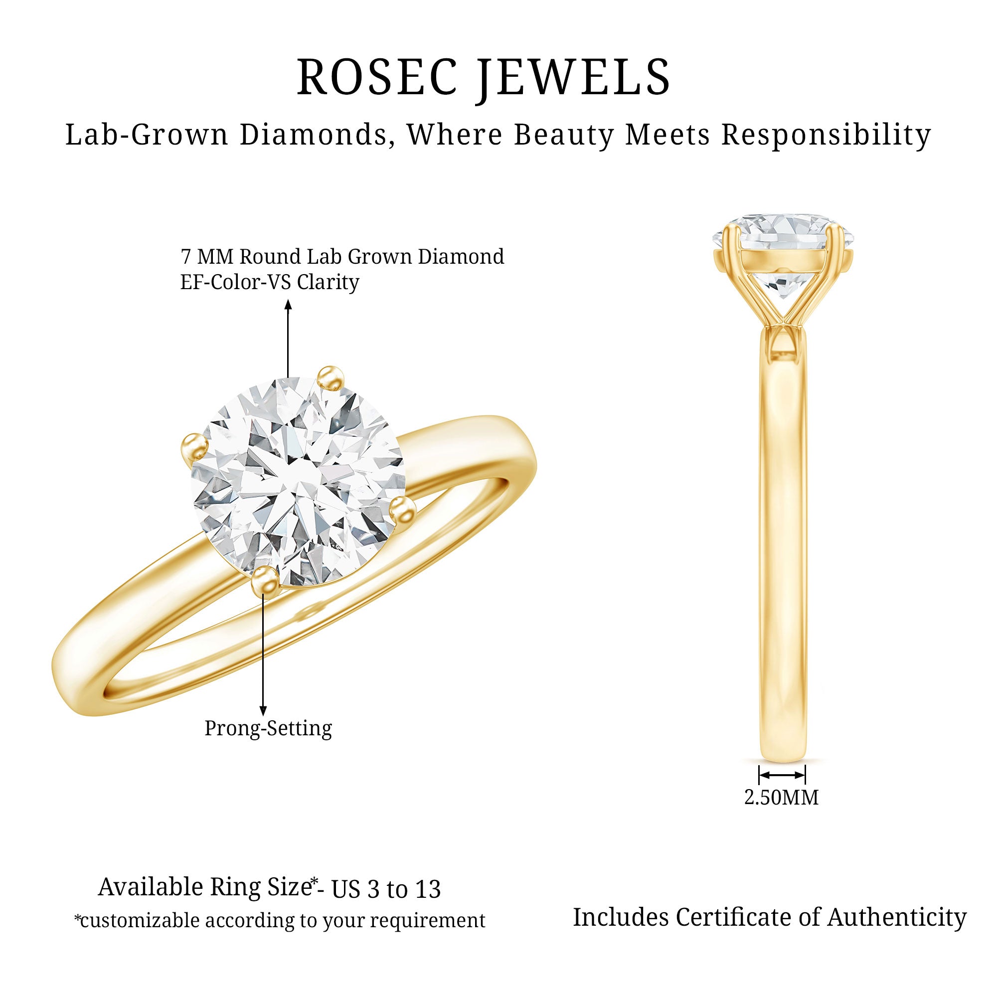 - Setting: Solitaire highlights the center stone, while halo adds visual size and brilliance.