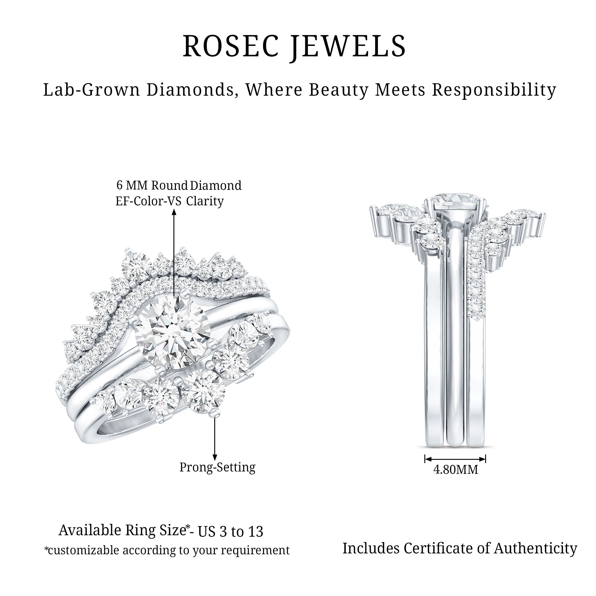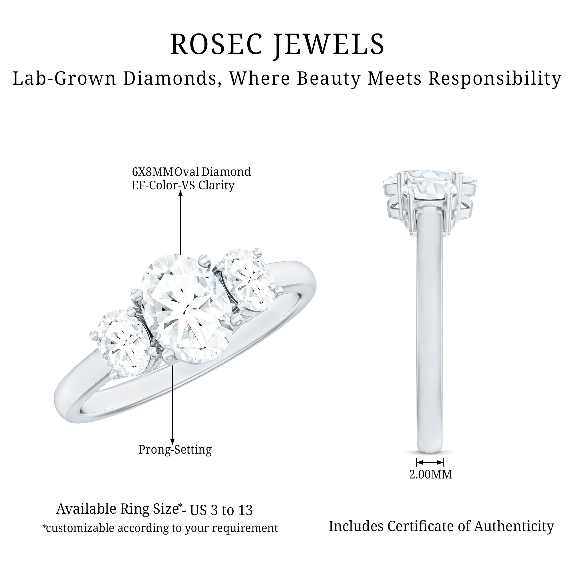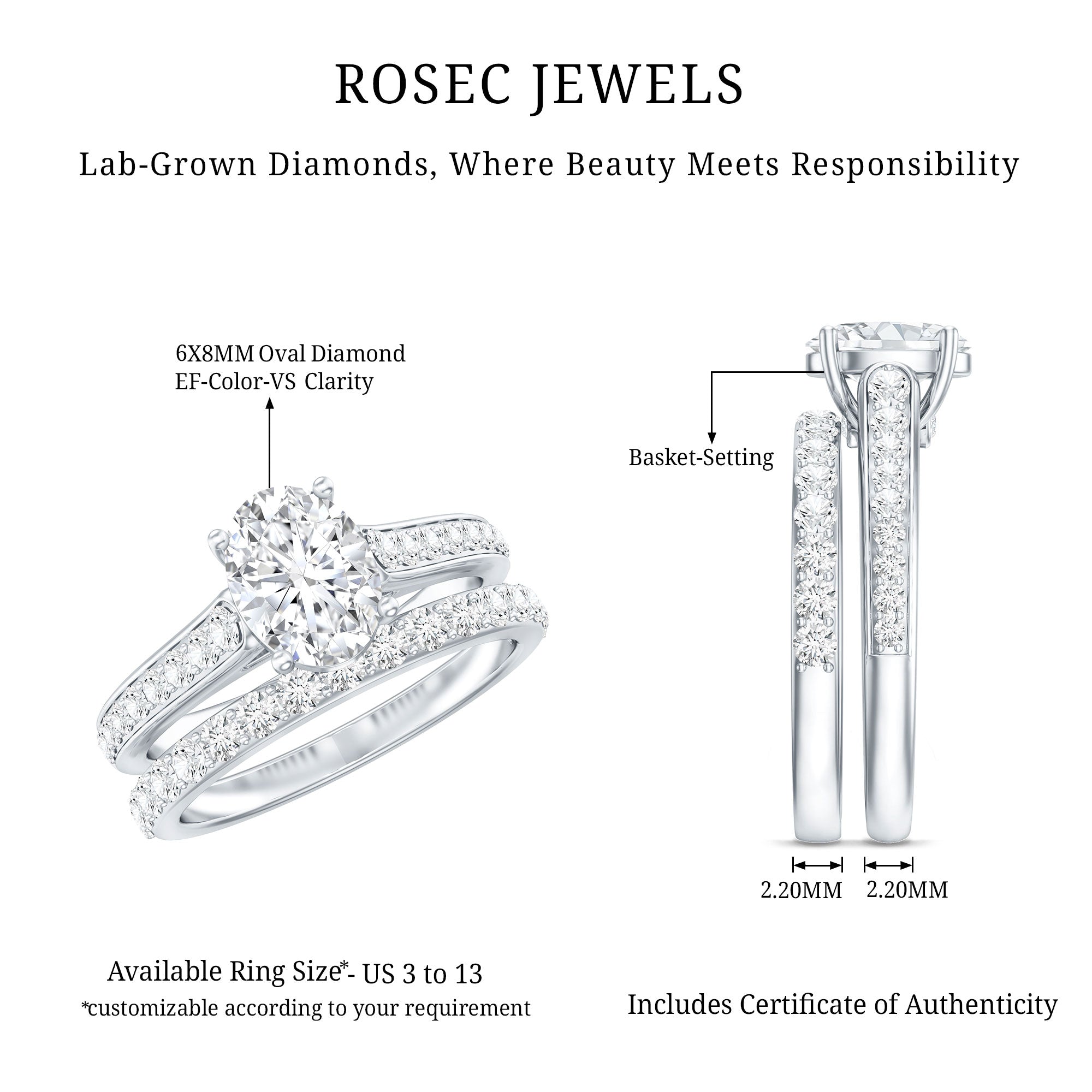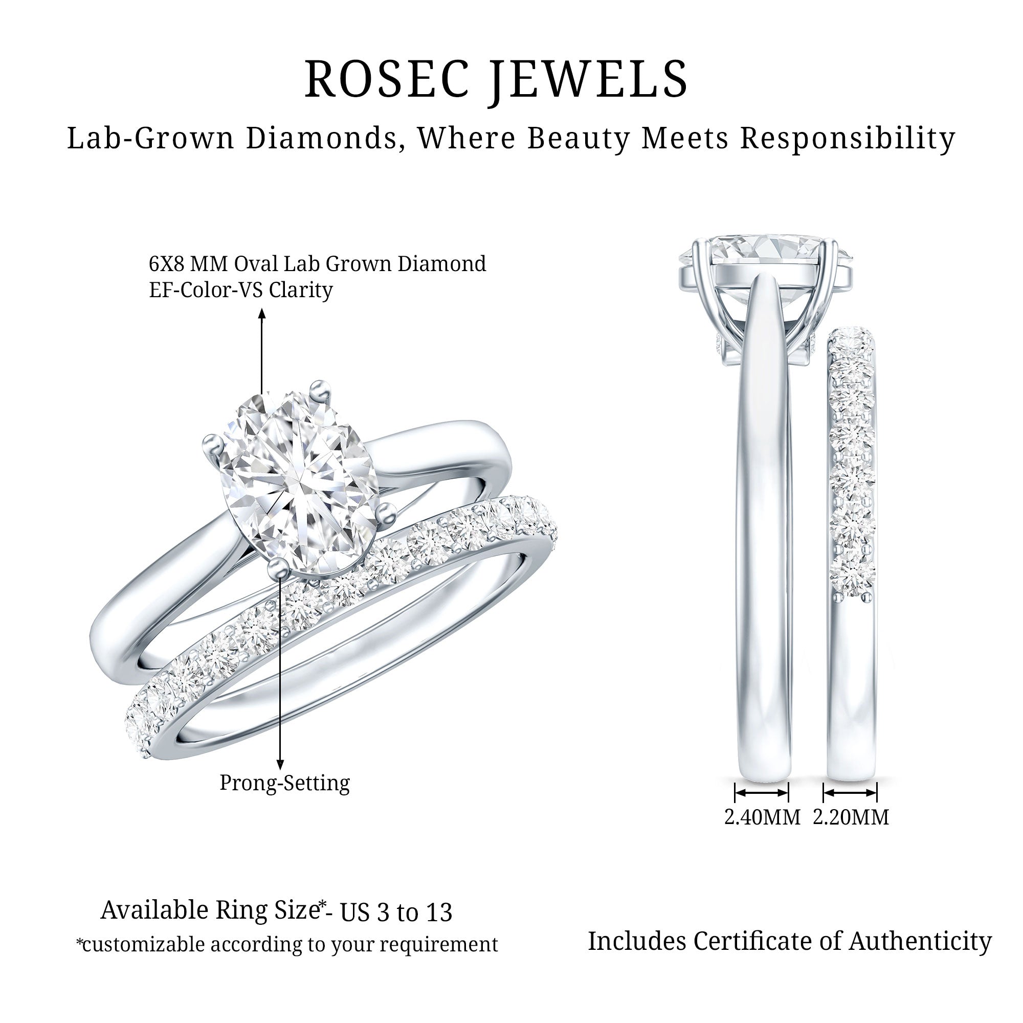 - Stone type: Lab grown diamonds offer a classic diamond look; moissanite delivers exceptional sparkle and value.