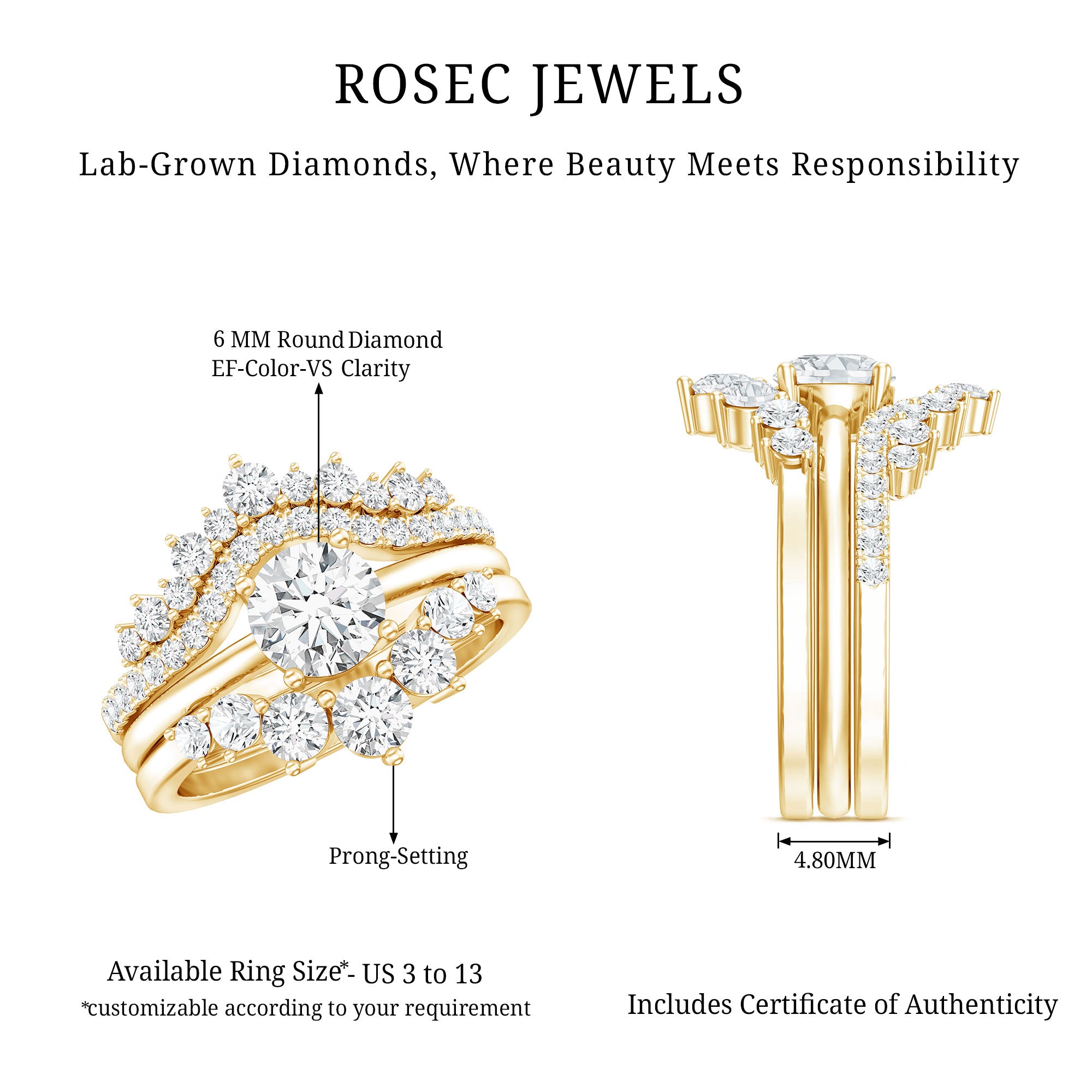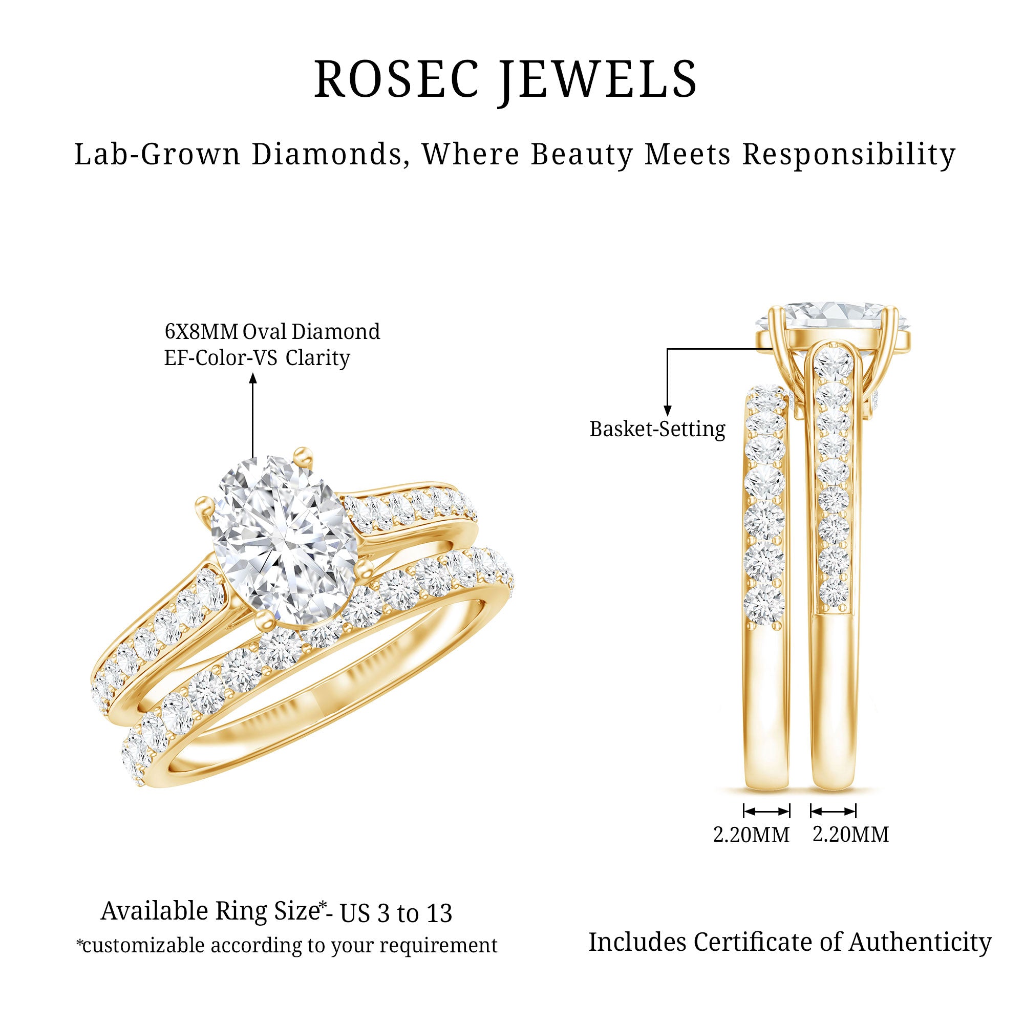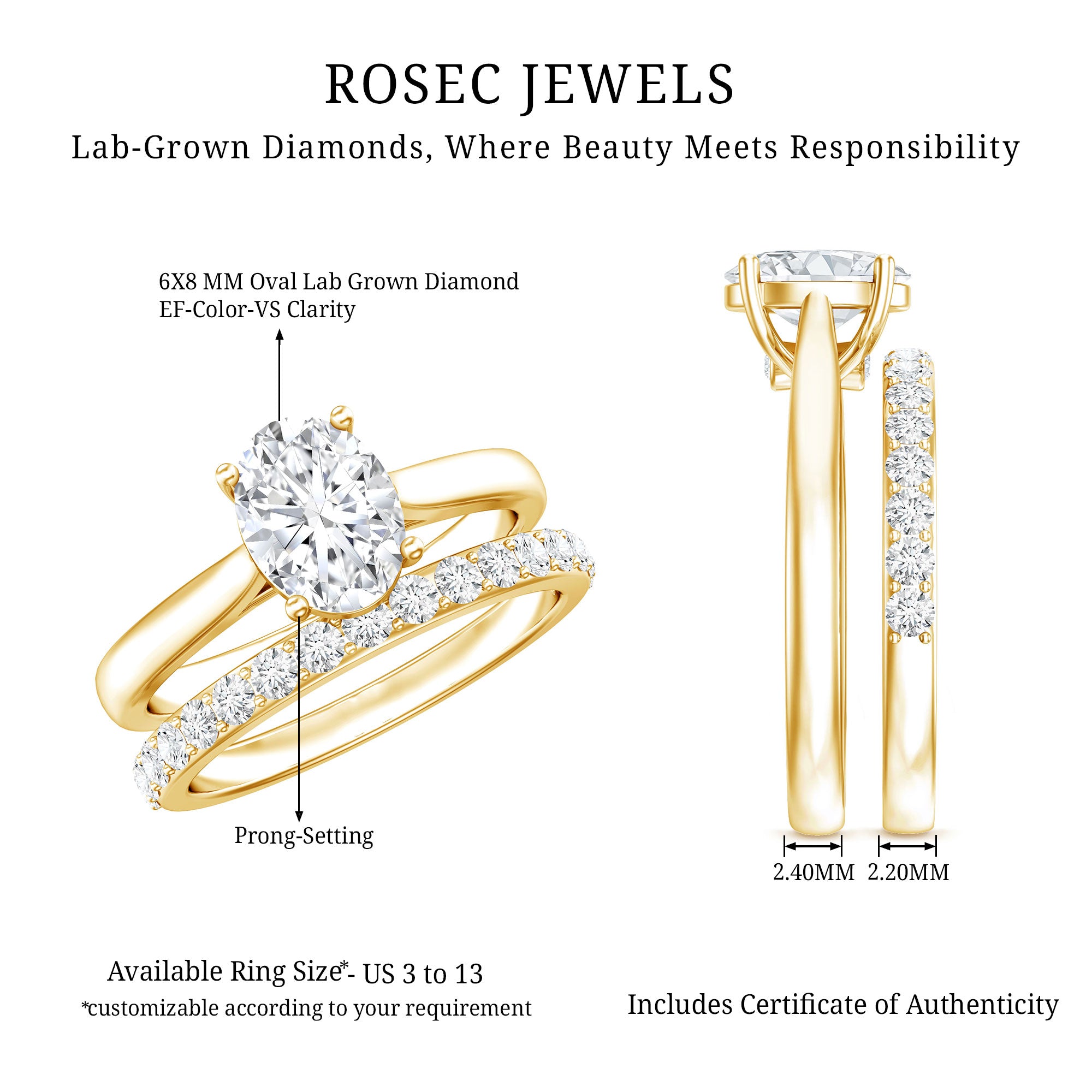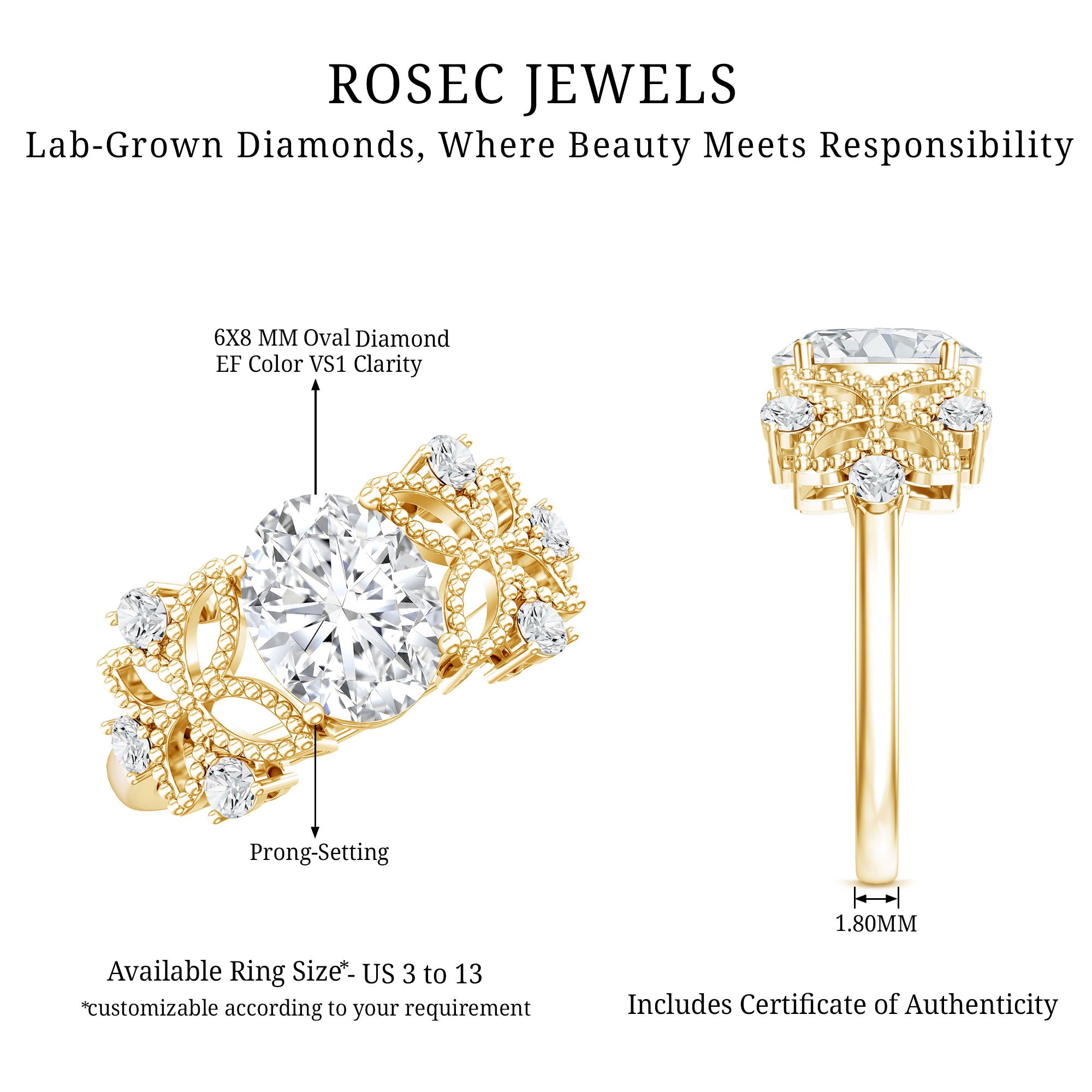 - Stone type: Lab grown diamonds offer a classic diamond look; moissanite delivers exceptional sparkle and value.